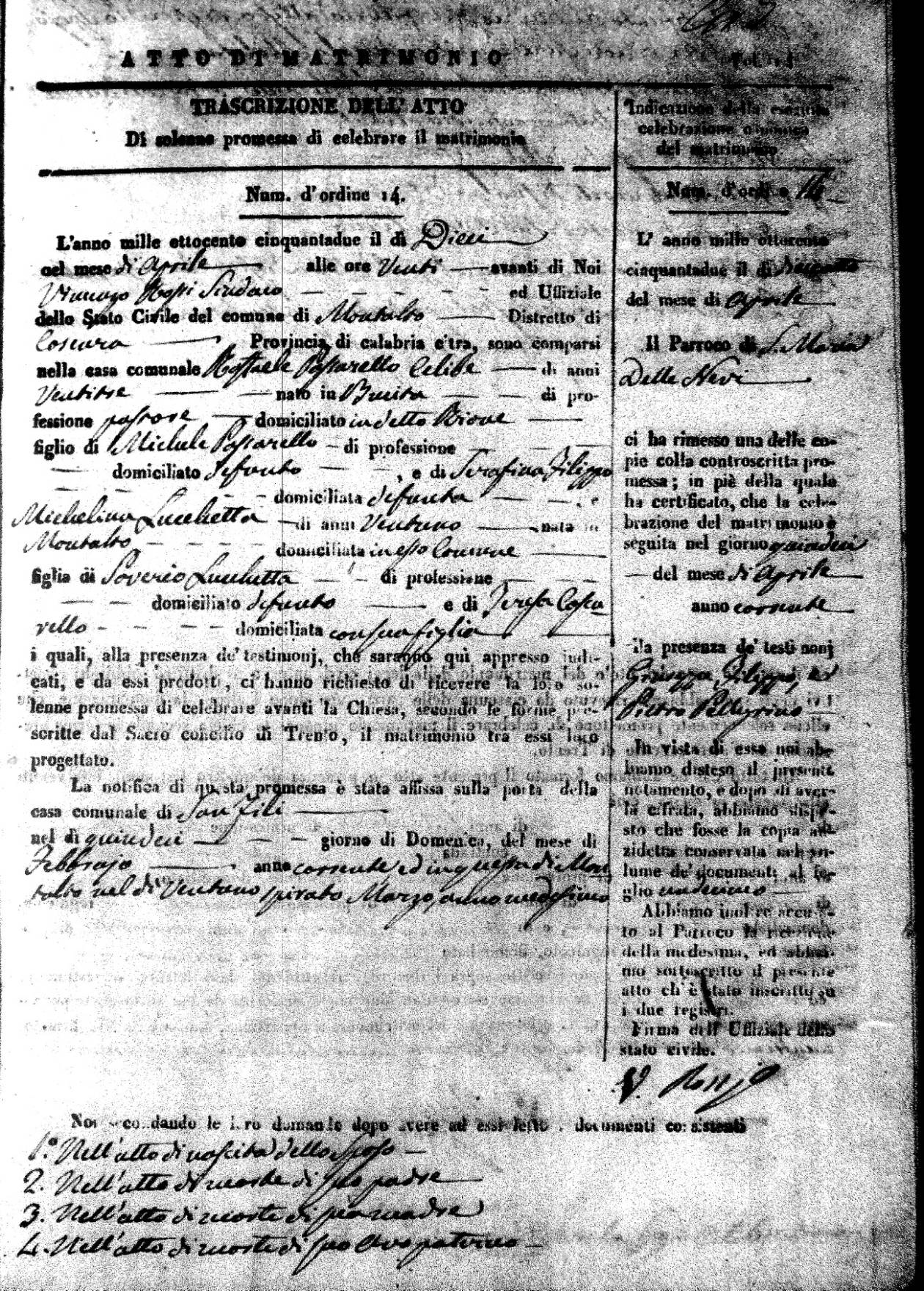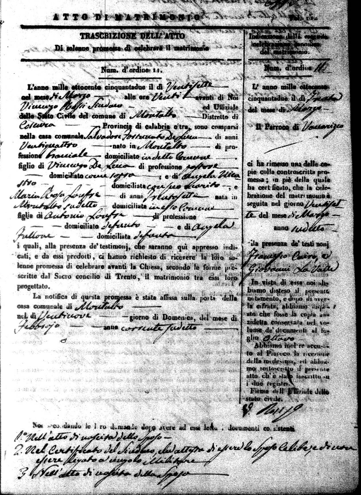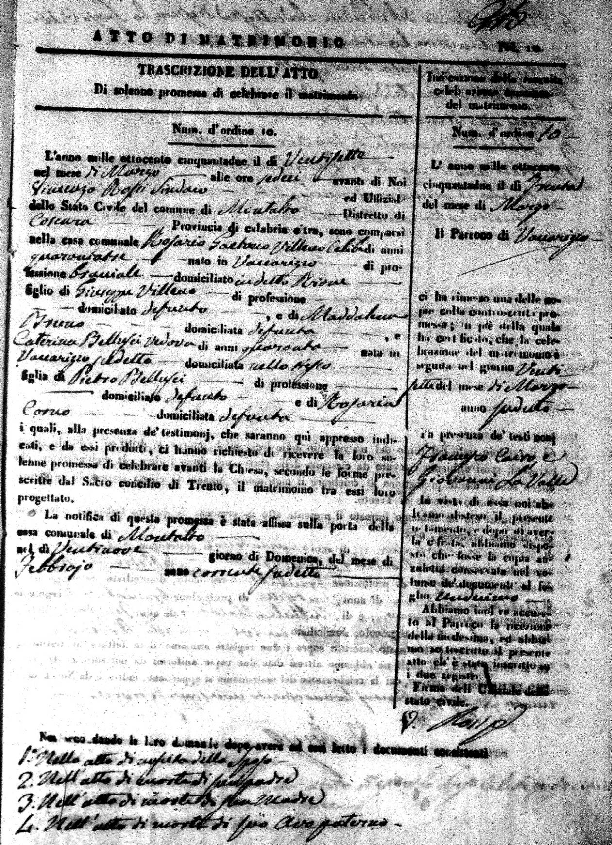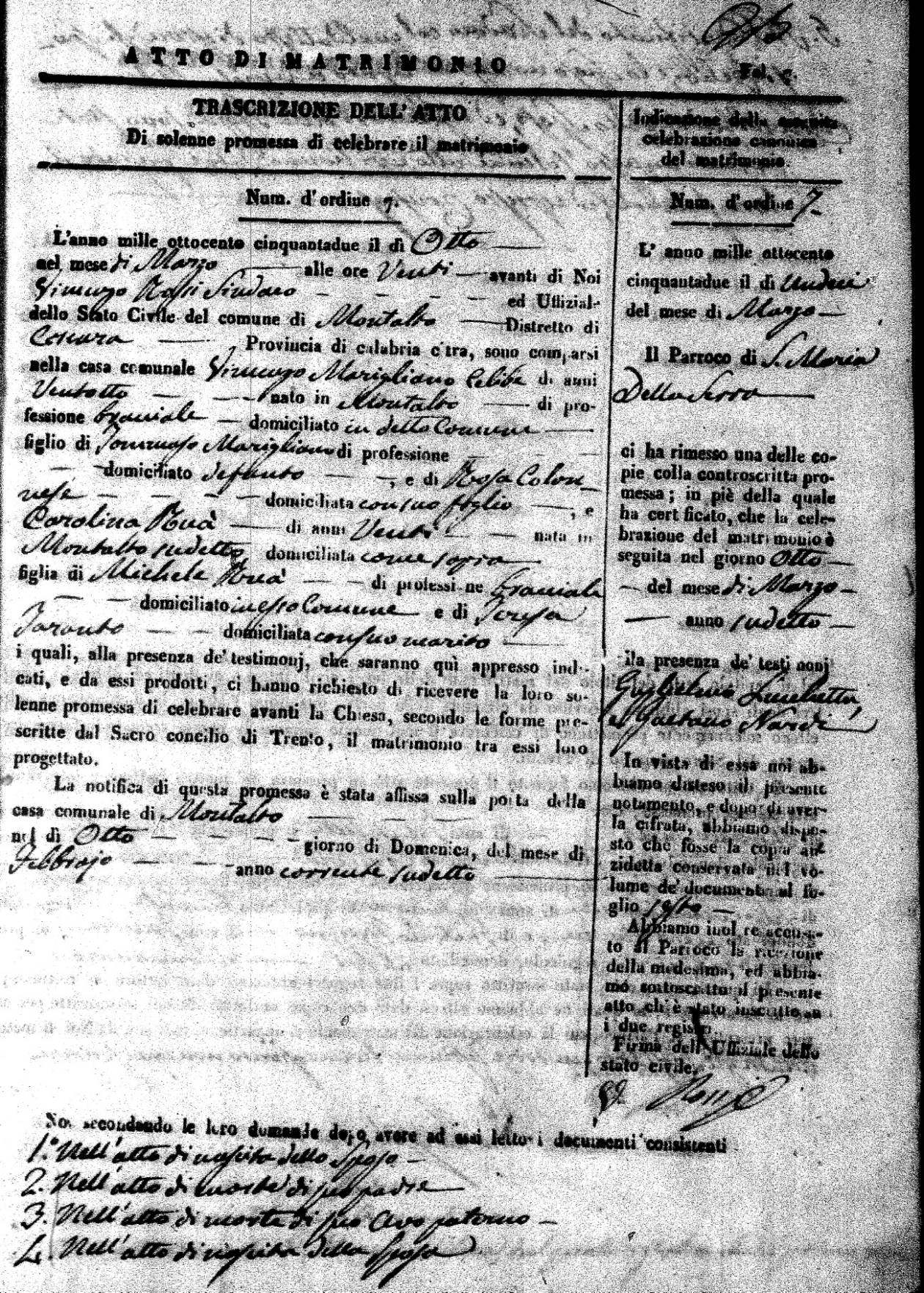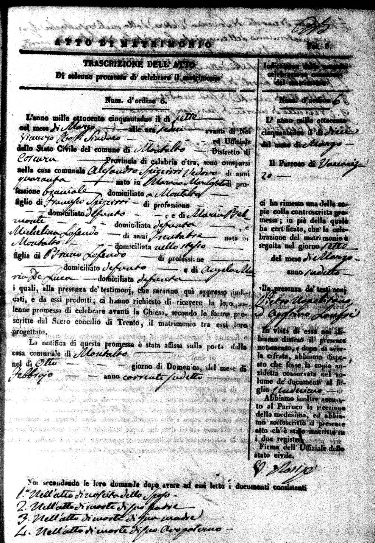 | 7 Mar | Spizirri | Alessandro | Francesco (fu) | Belmonte | Maria (fu) | LoFeudo | Michelina | Bruno (fu) | DeLuca | Angela Maria (fu) |