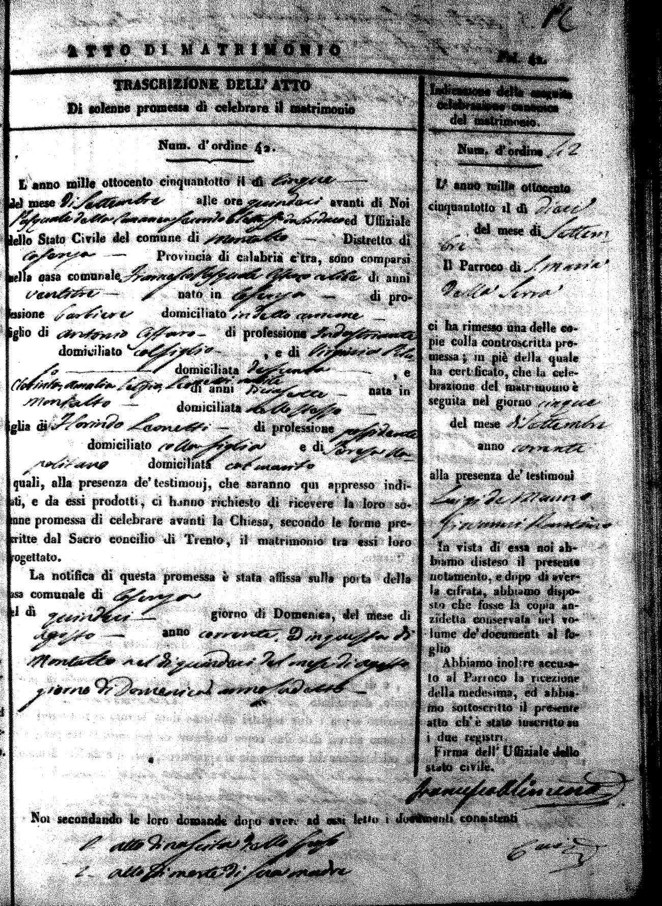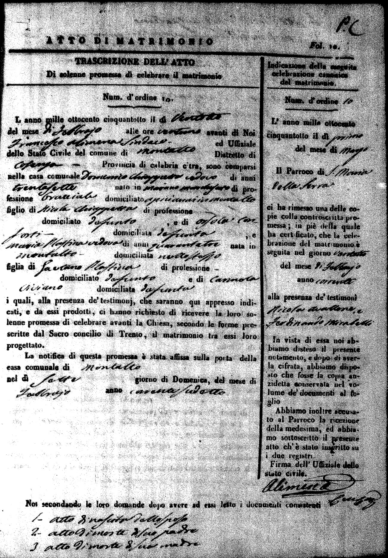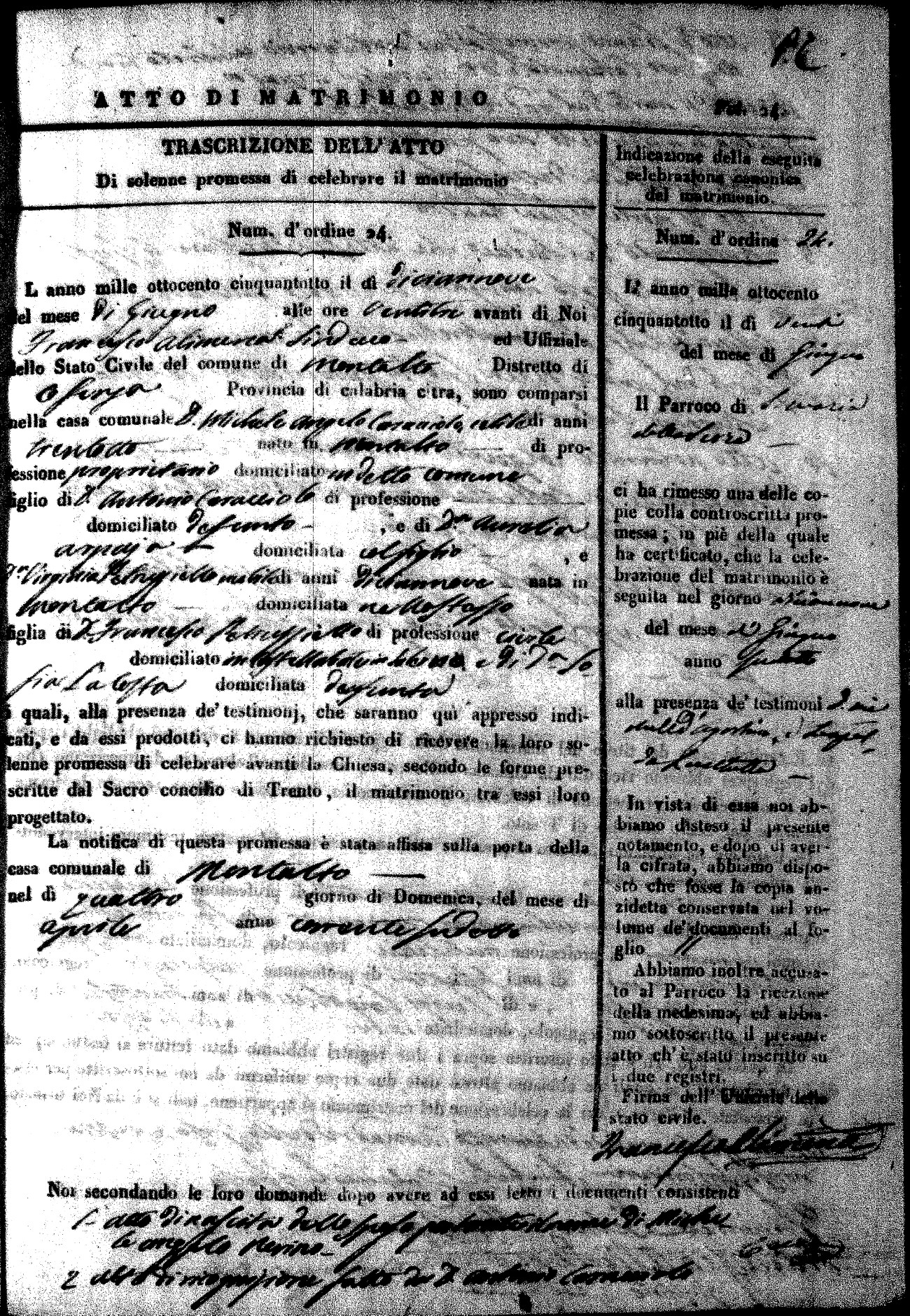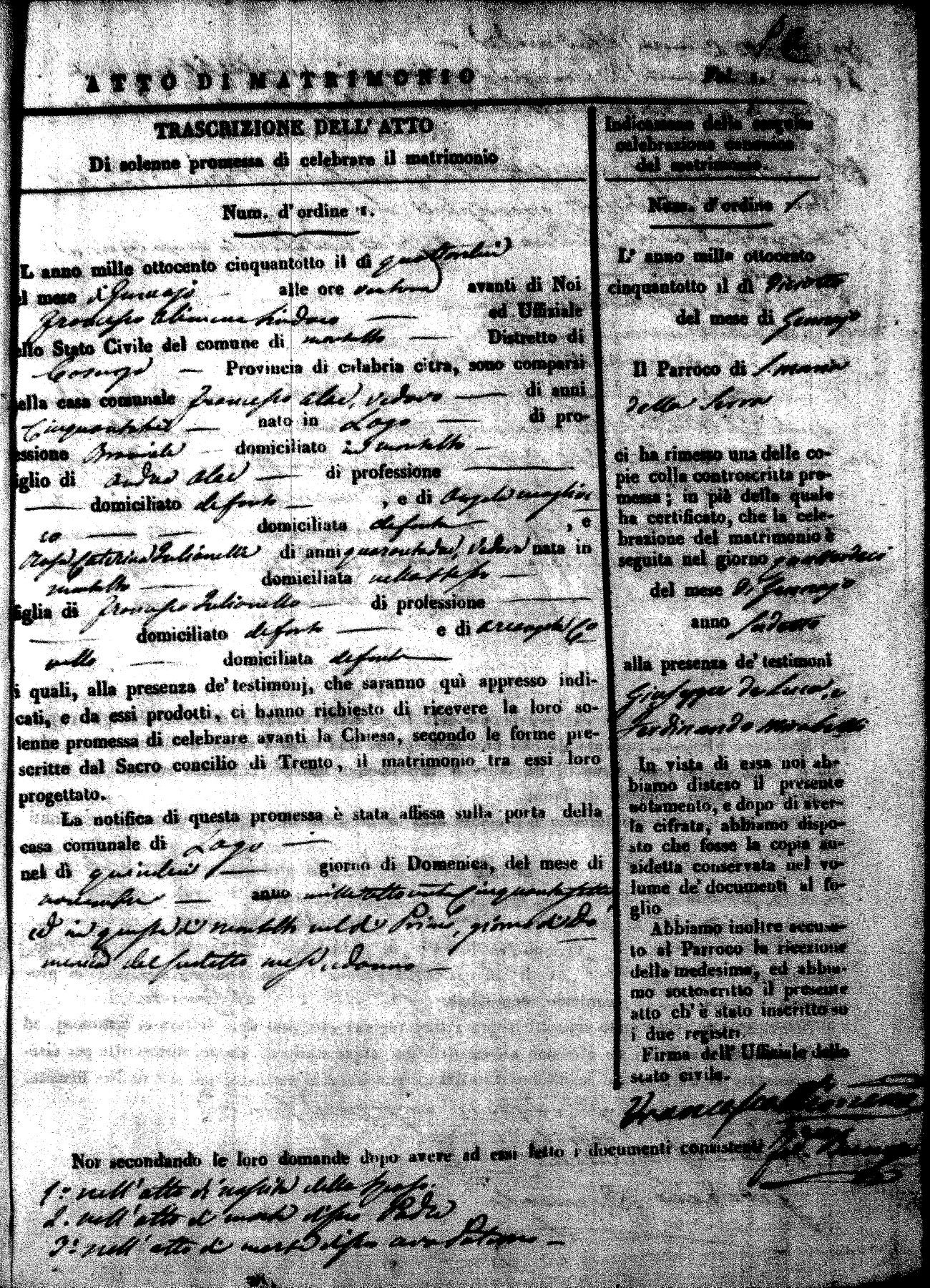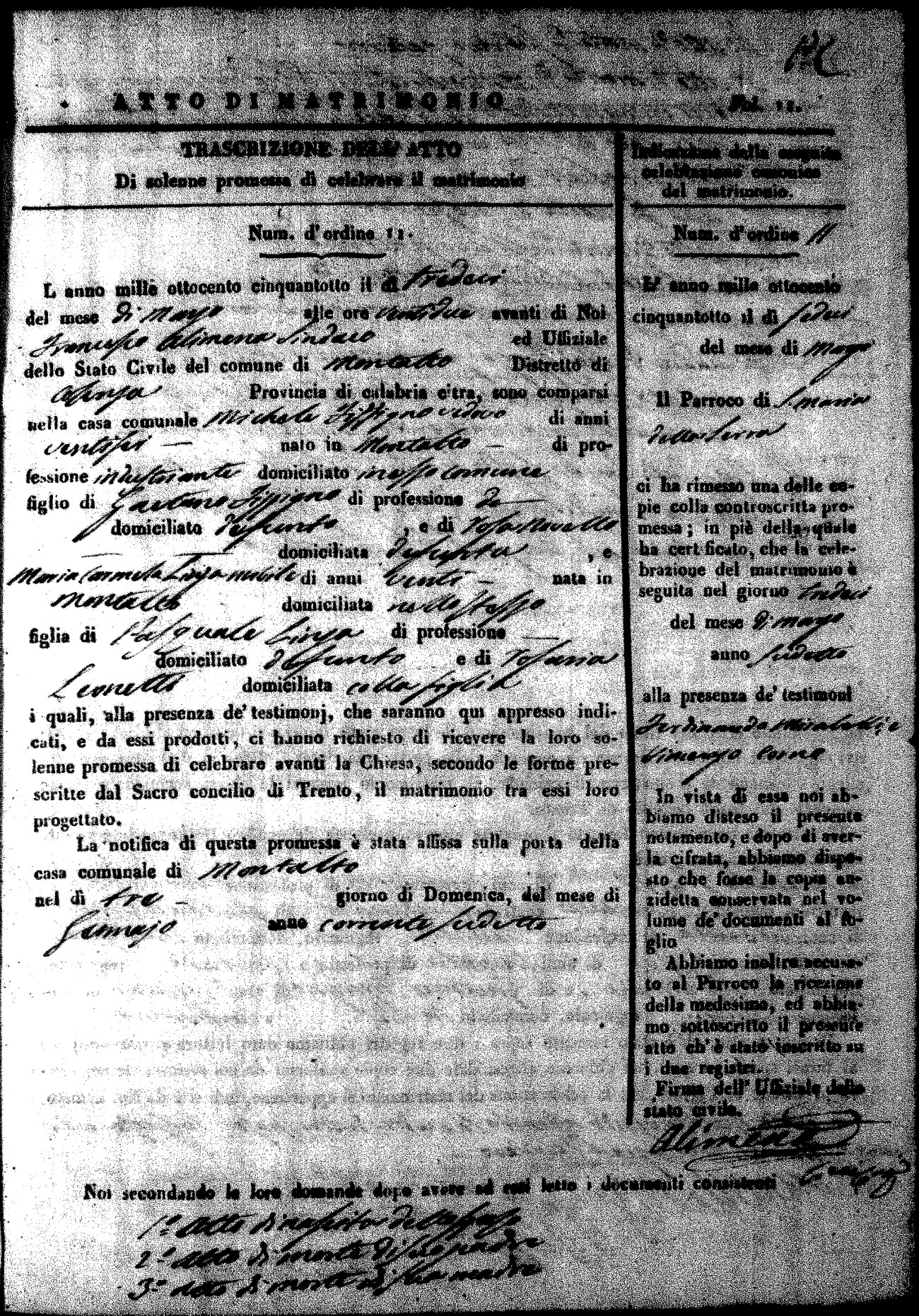 Here are the extractions for the marriage acts in 1858 for Montalto Uffugo. To save time we have only transcribed the names of the groom and bride. For more information, click on the groom's surname to view page 1 of the copy of the original document and his first name to view page 2. Please note this year is not complete yet.