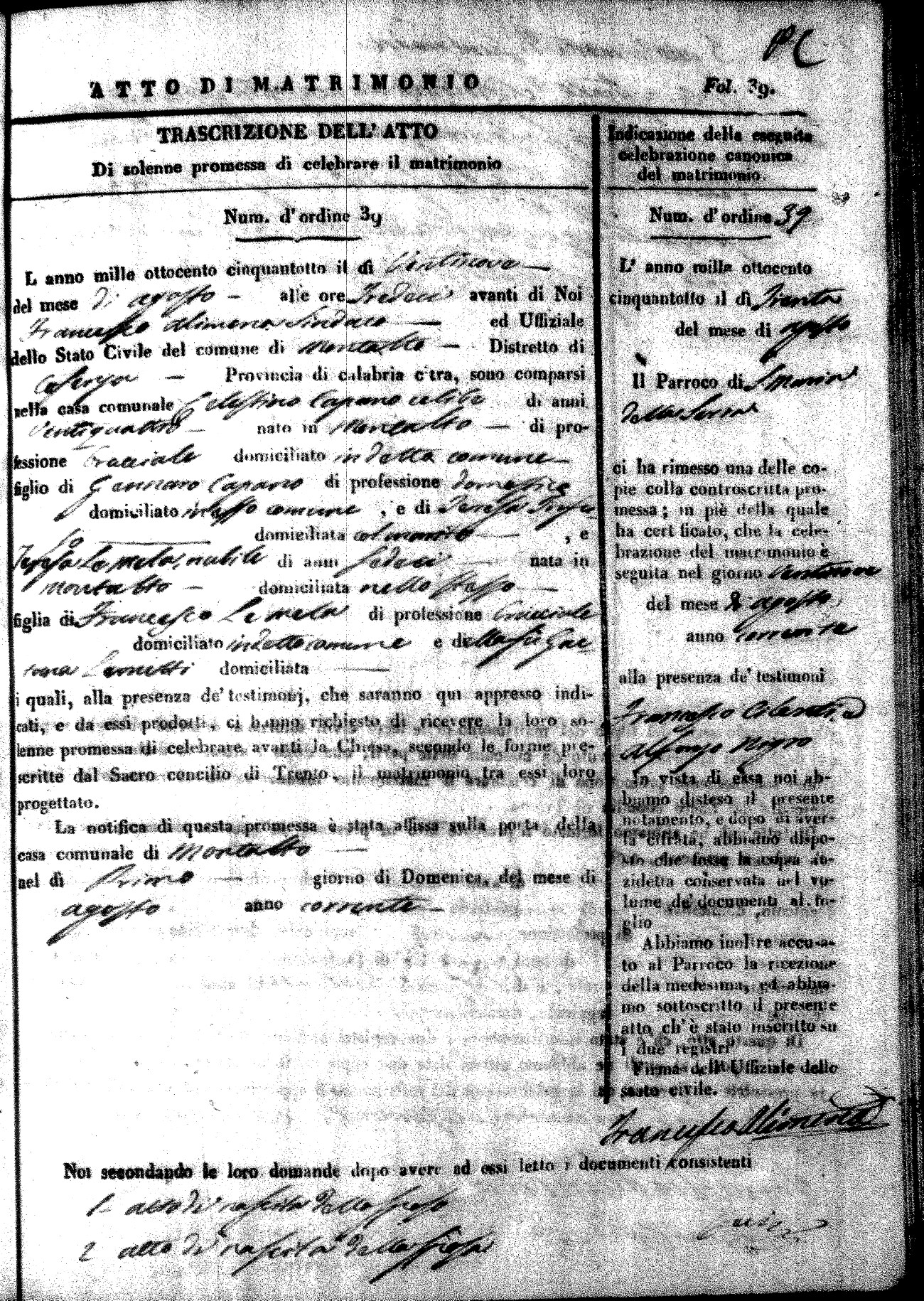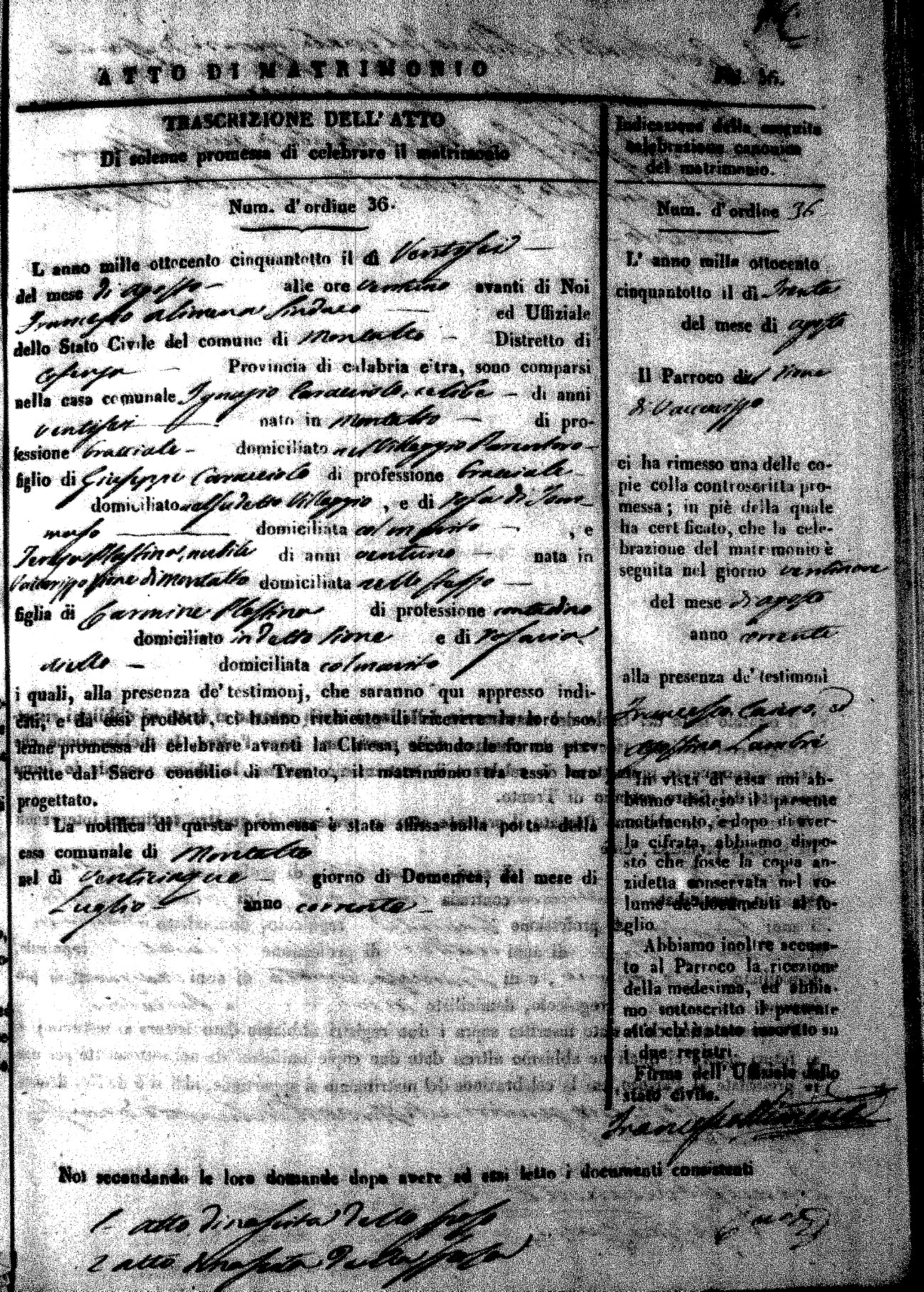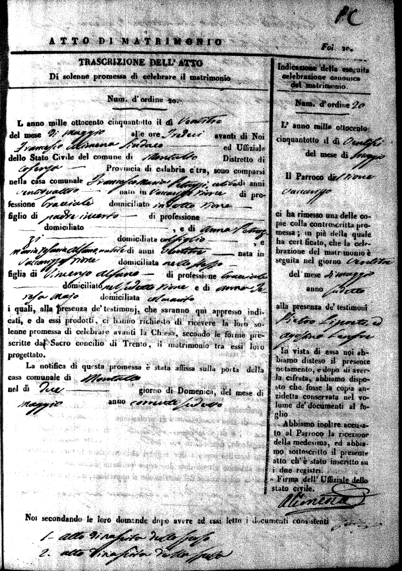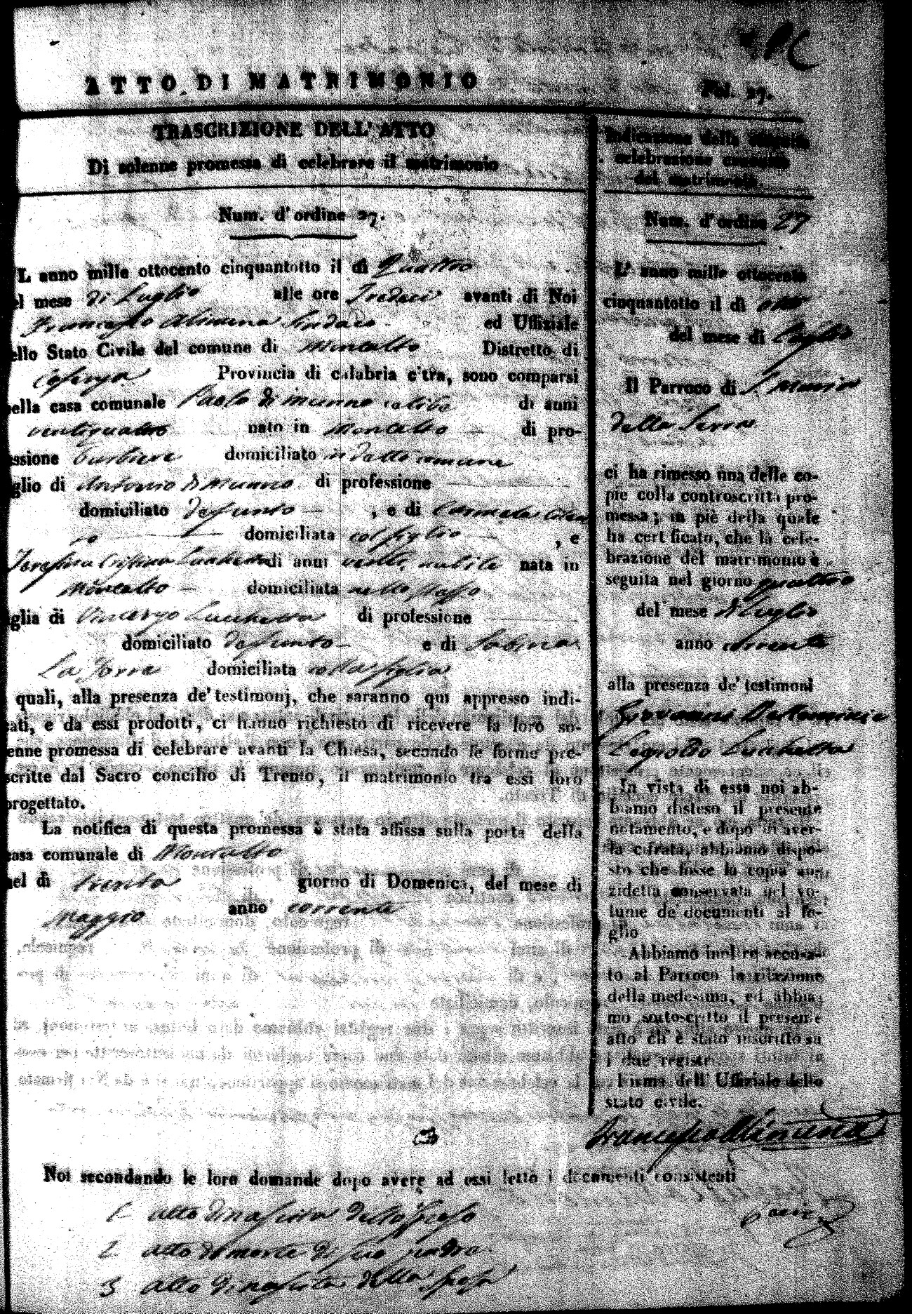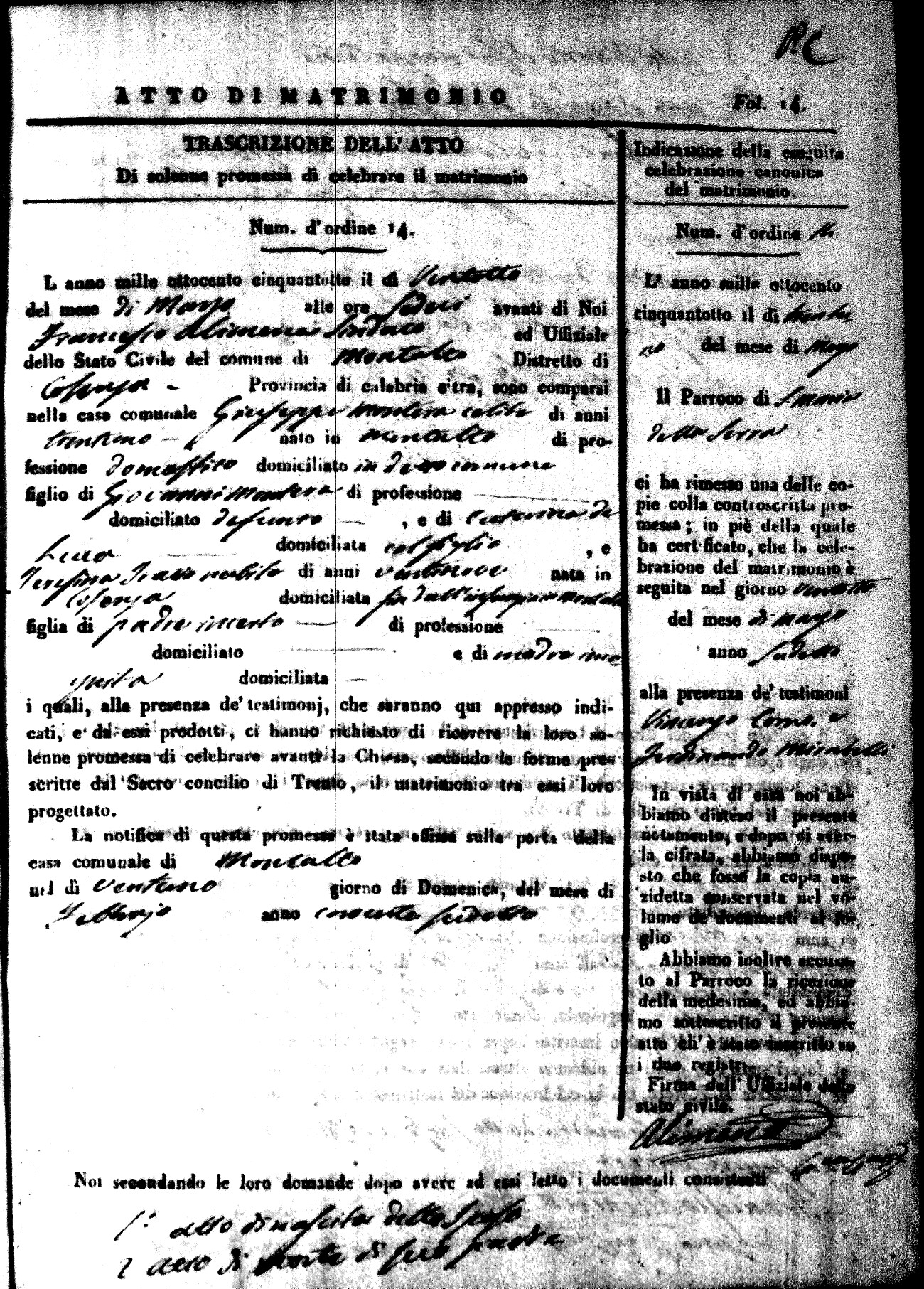 Here are the extractions for the marriage acts in 1858 for Montalto Uffugo. To save time we have only transcribed the names of the groom and bride. For more information, click on the groom's surname to view page 1 of the copy of the original document and his first name to view page 2. Please note this year is not complete yet.
