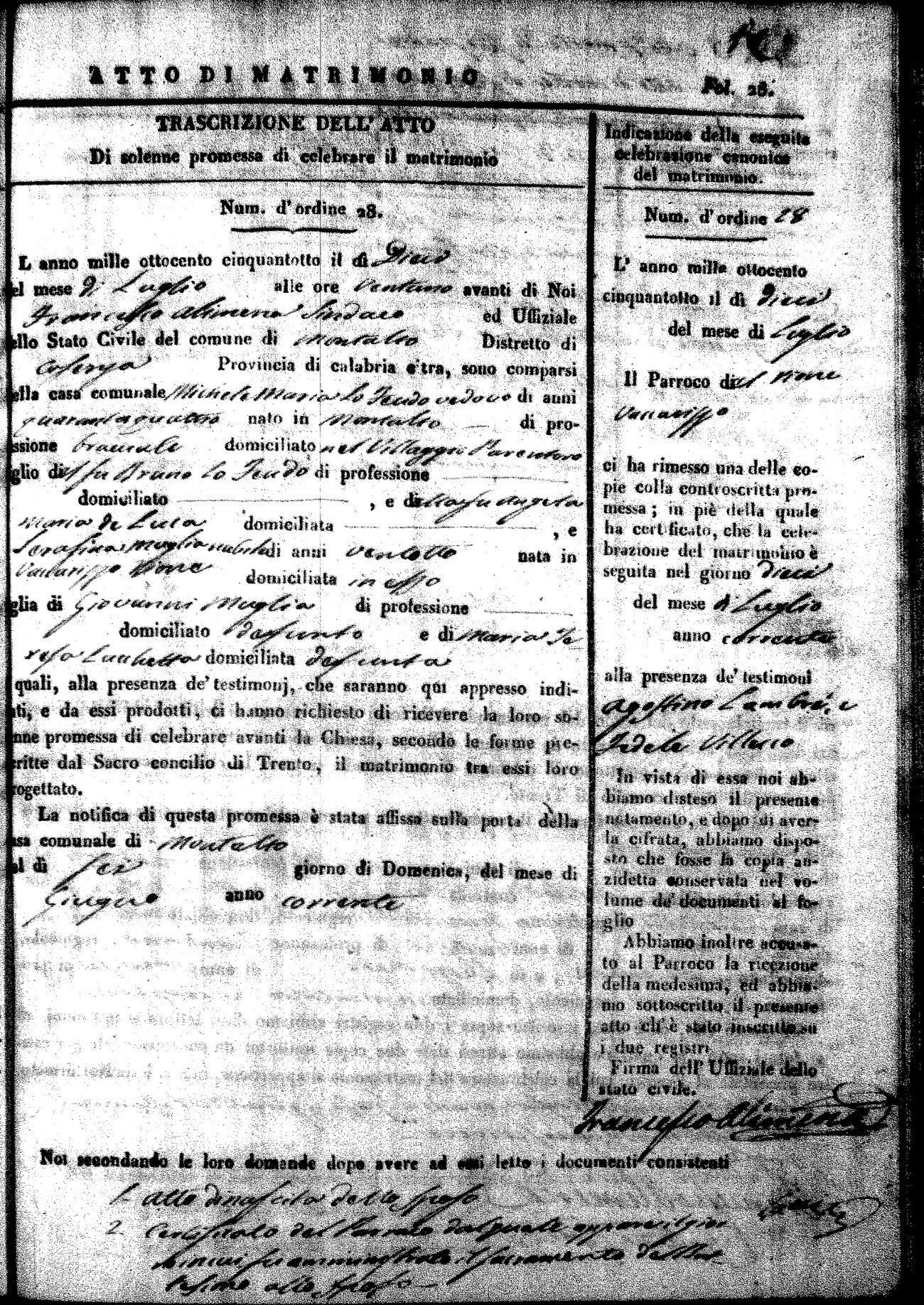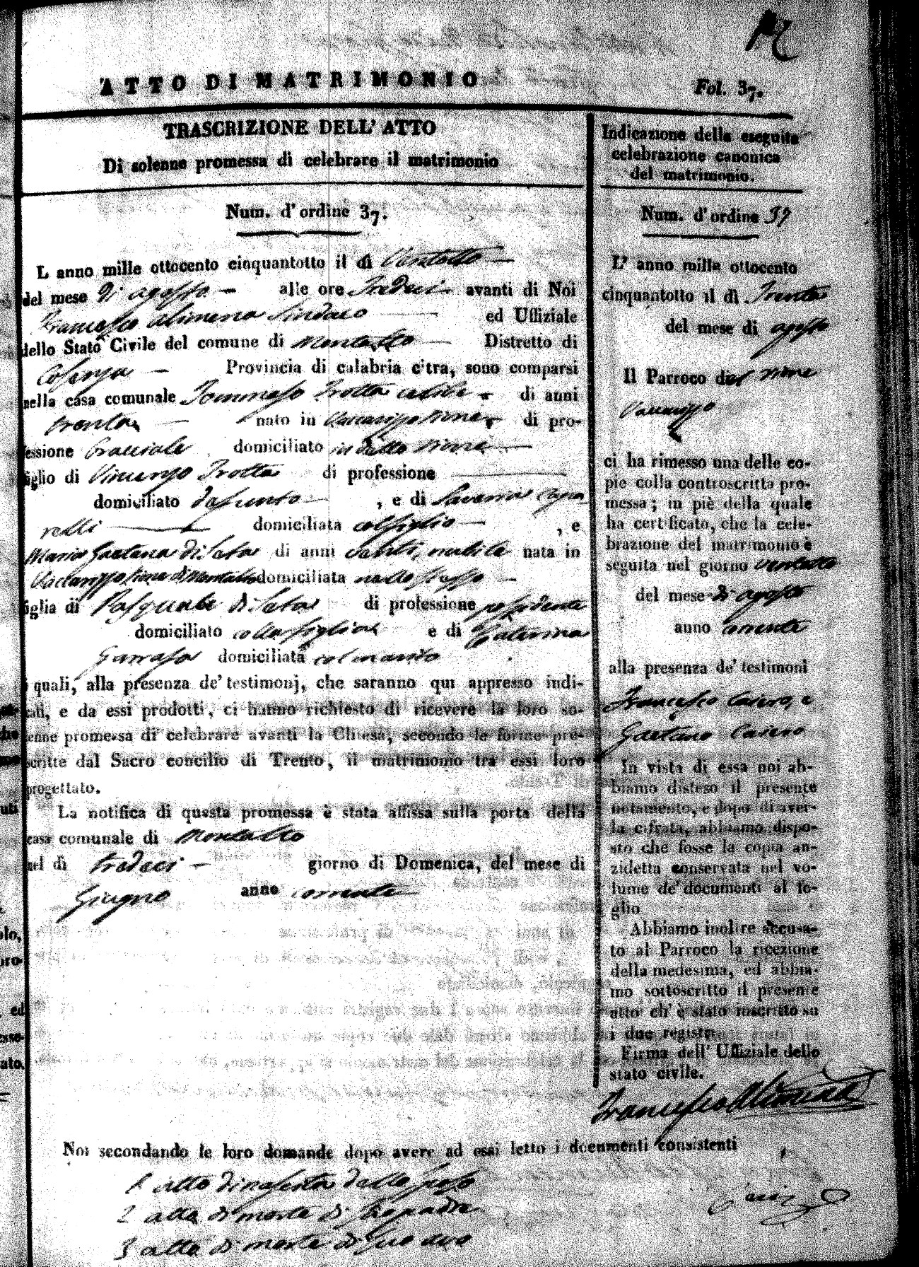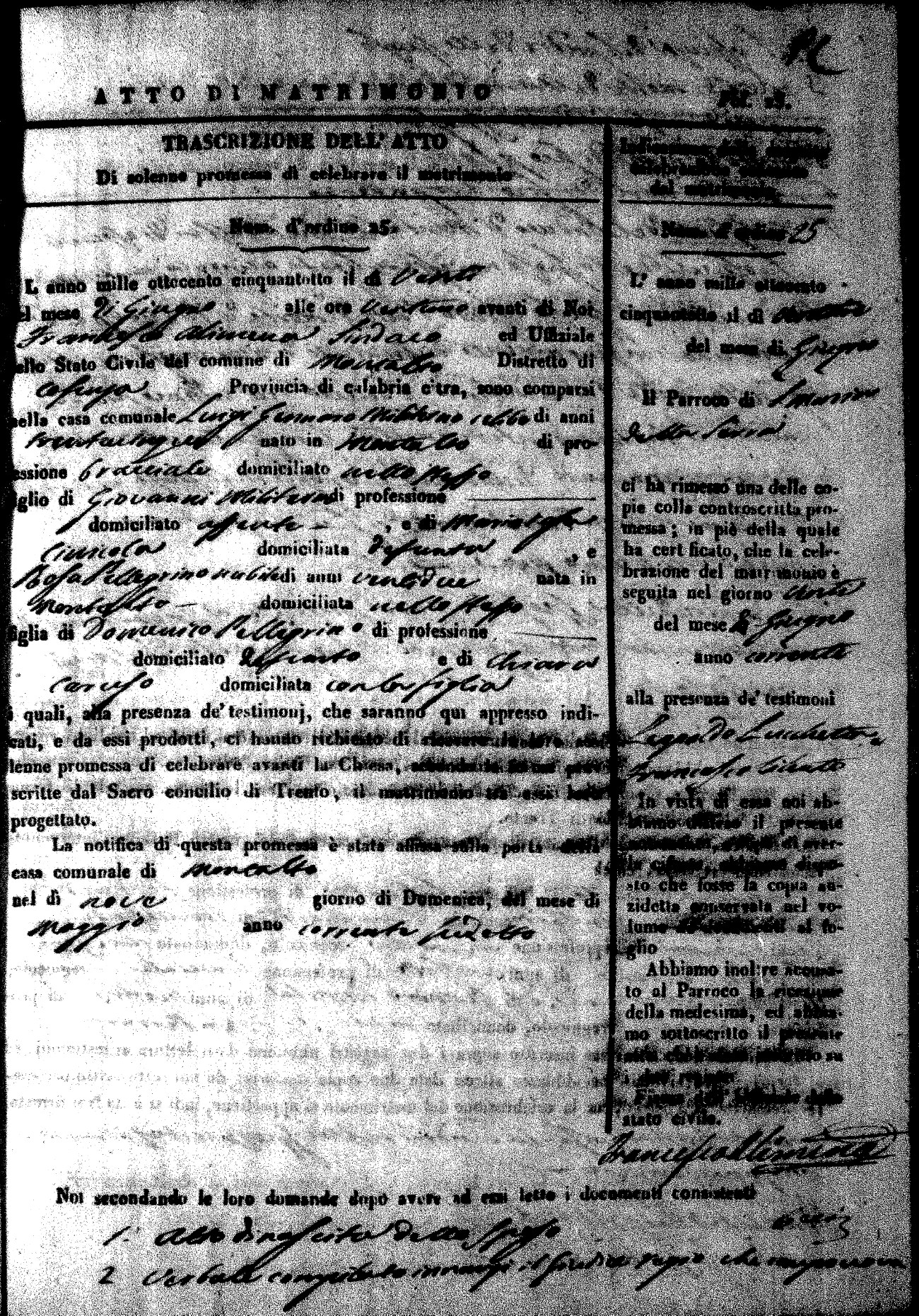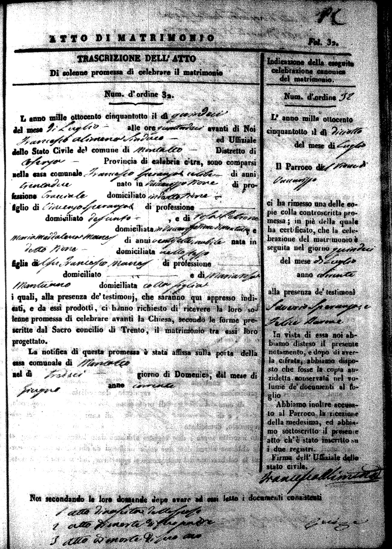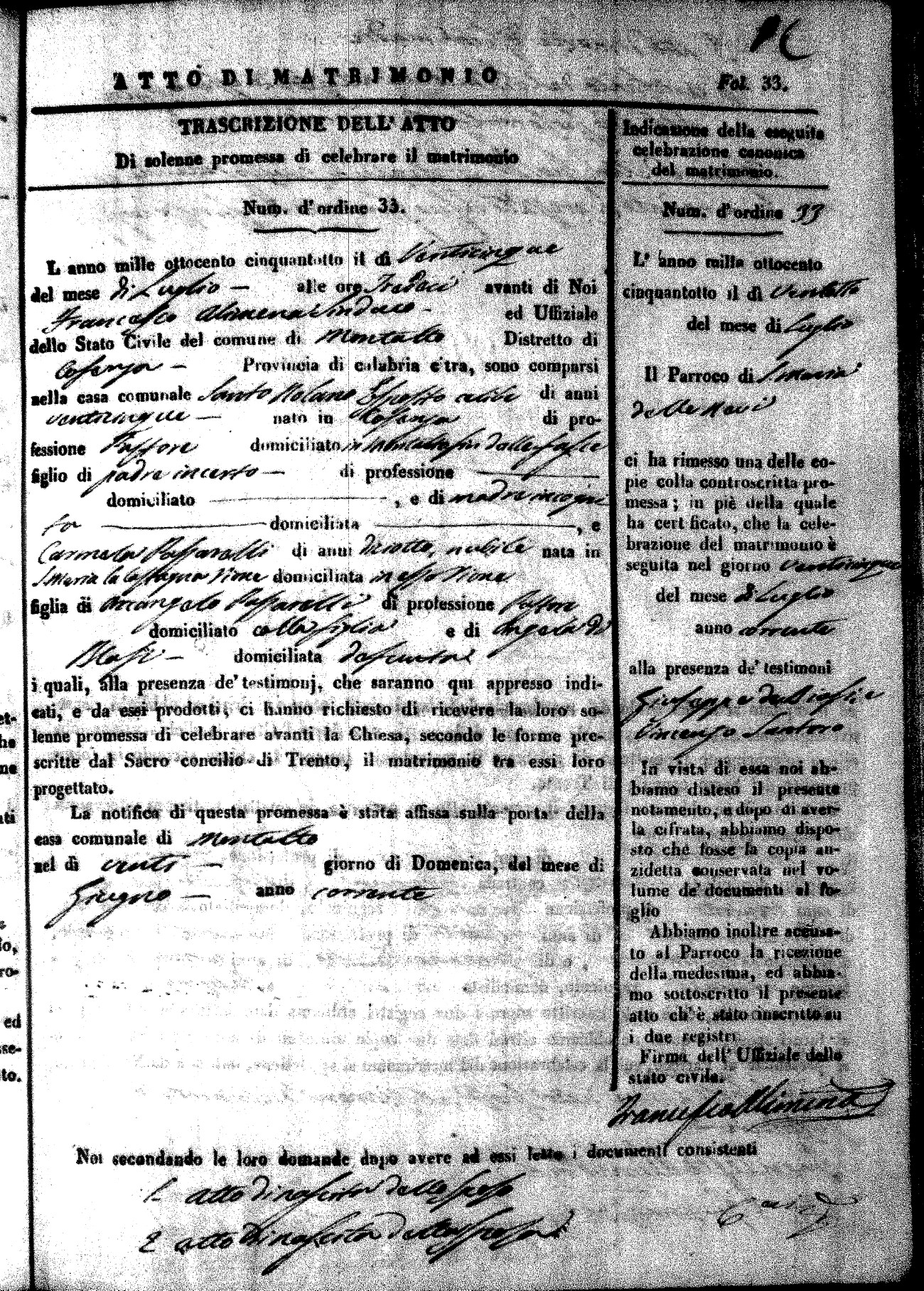 Here are the extractions for the marriage acts in 1858 for Montalto Uffugo. To save time we have only transcribed the names of the groom and bride. For more information, click on the groom's surname to view page 1 of the copy of the original document and his first name to view page 2. Please note this year is not complete yet.