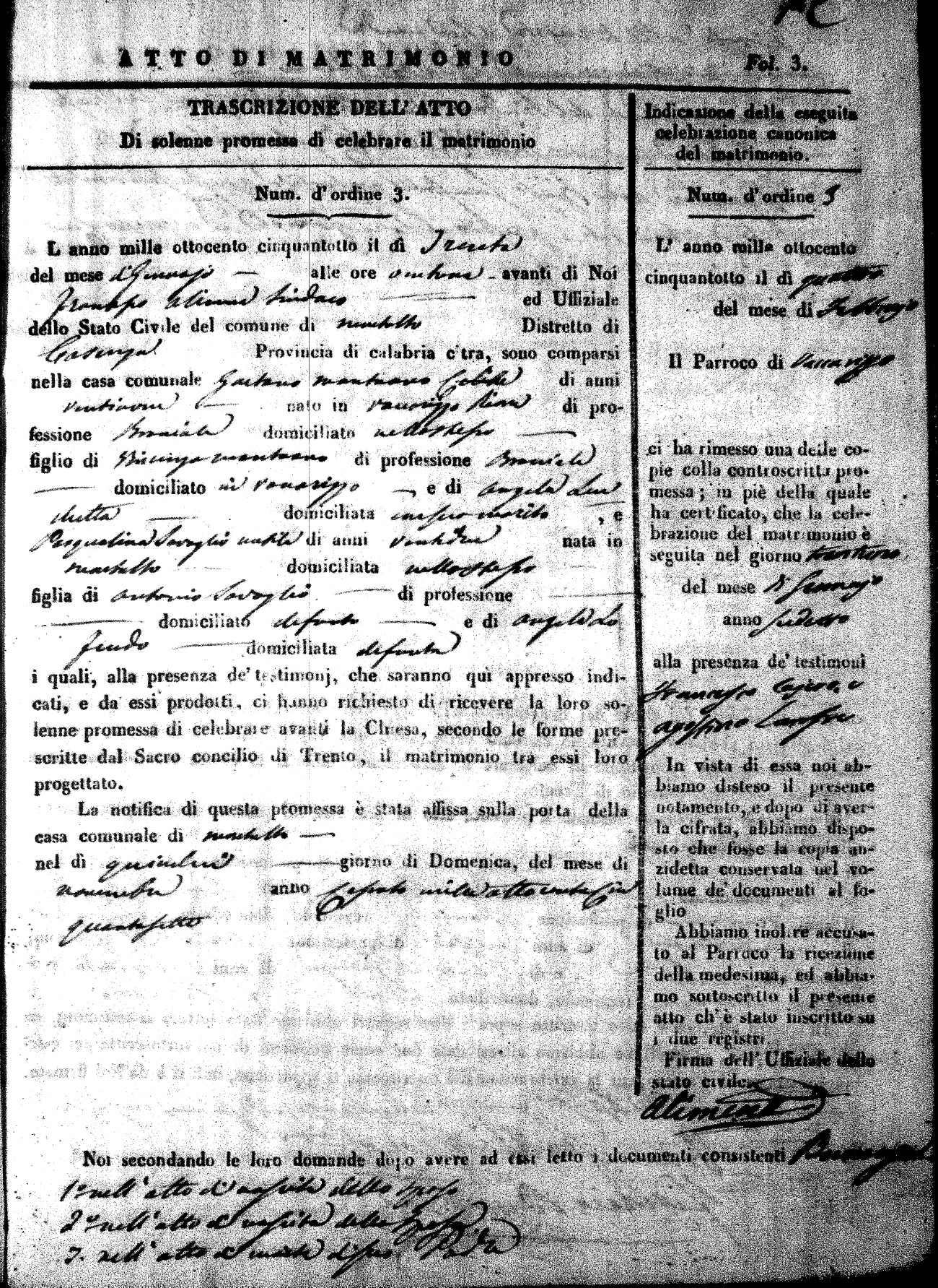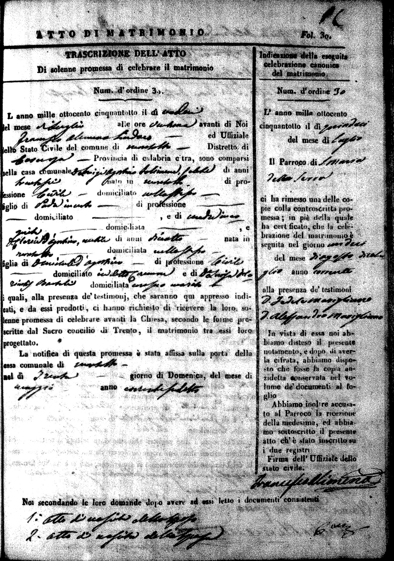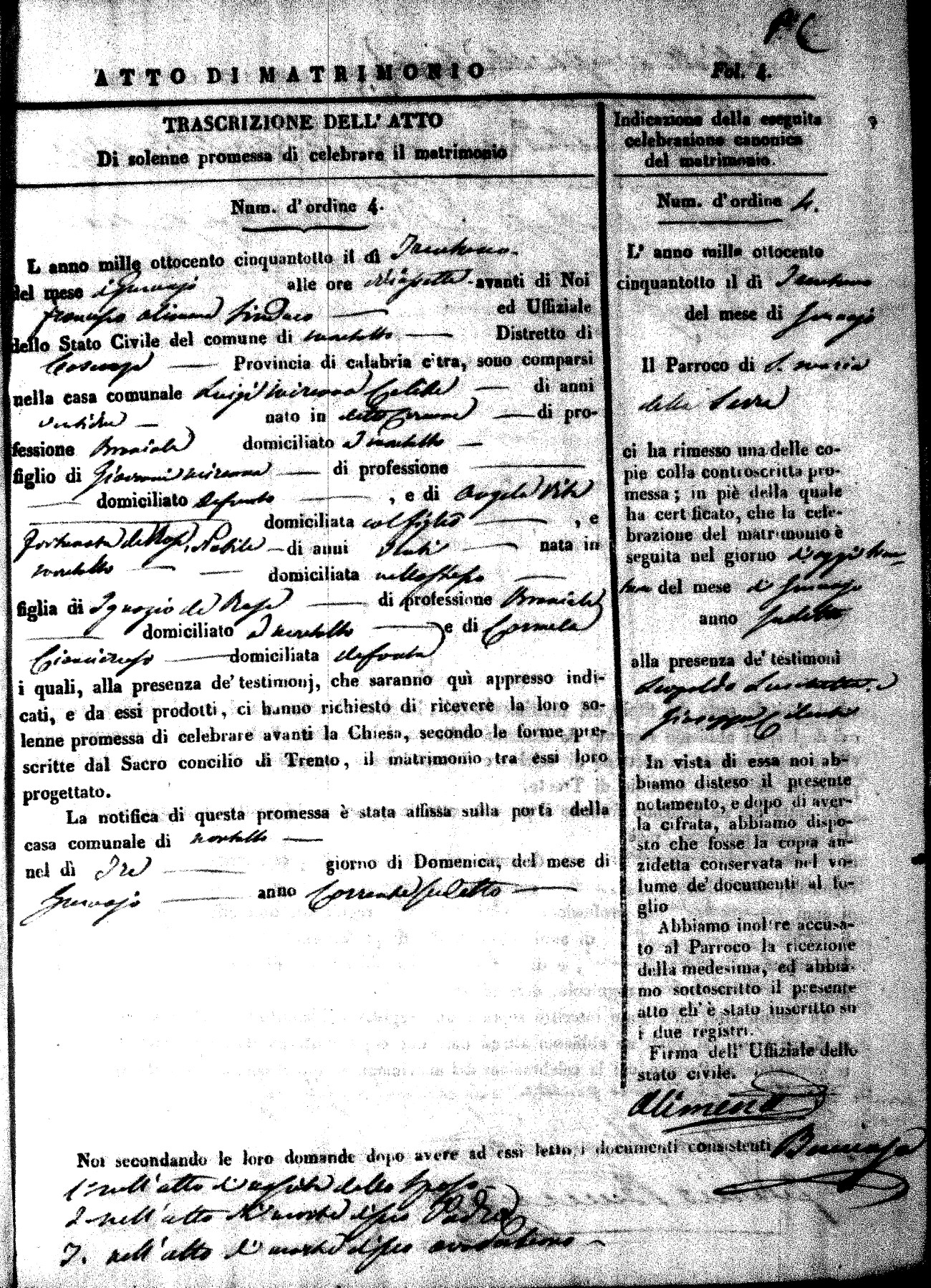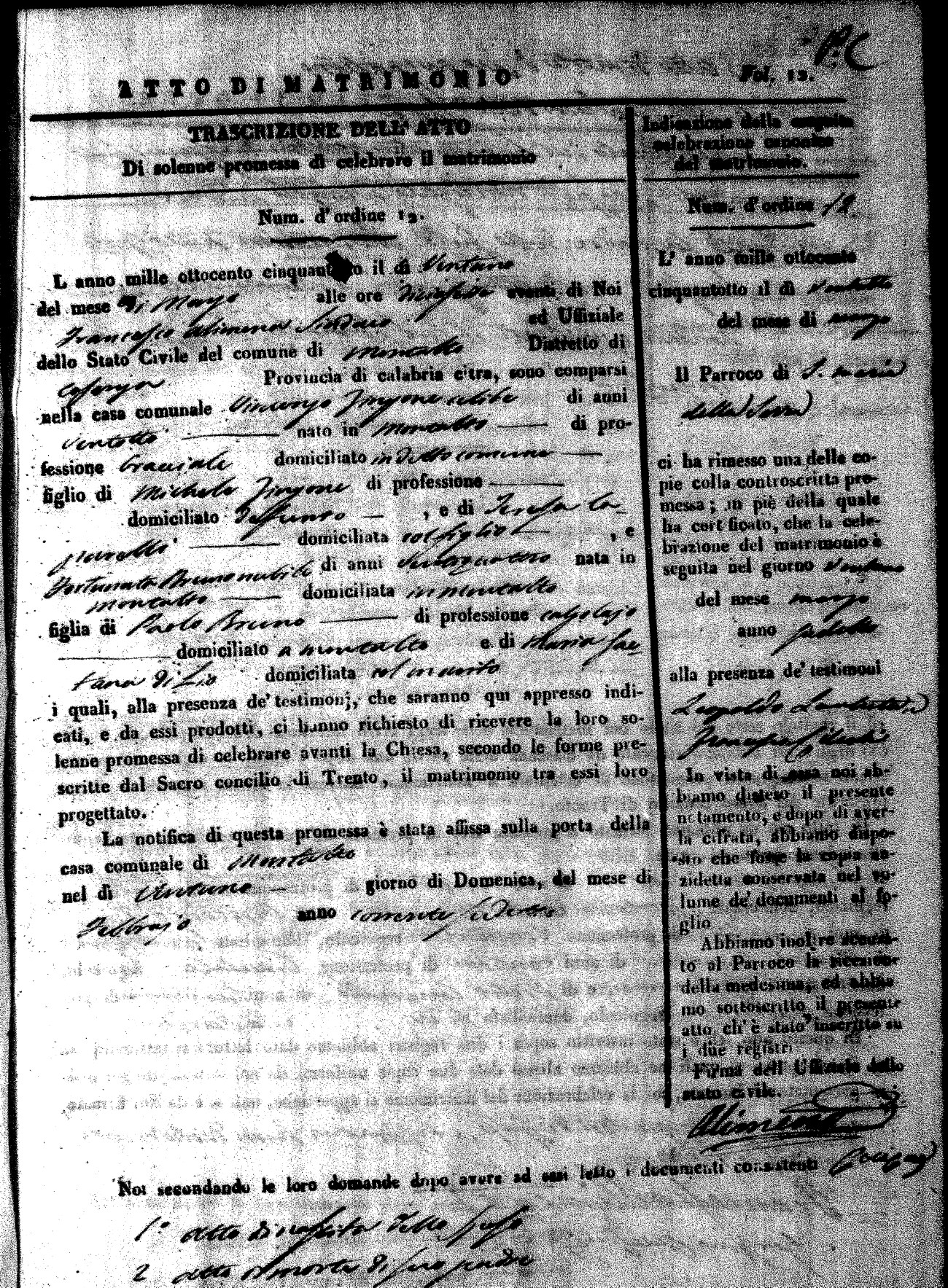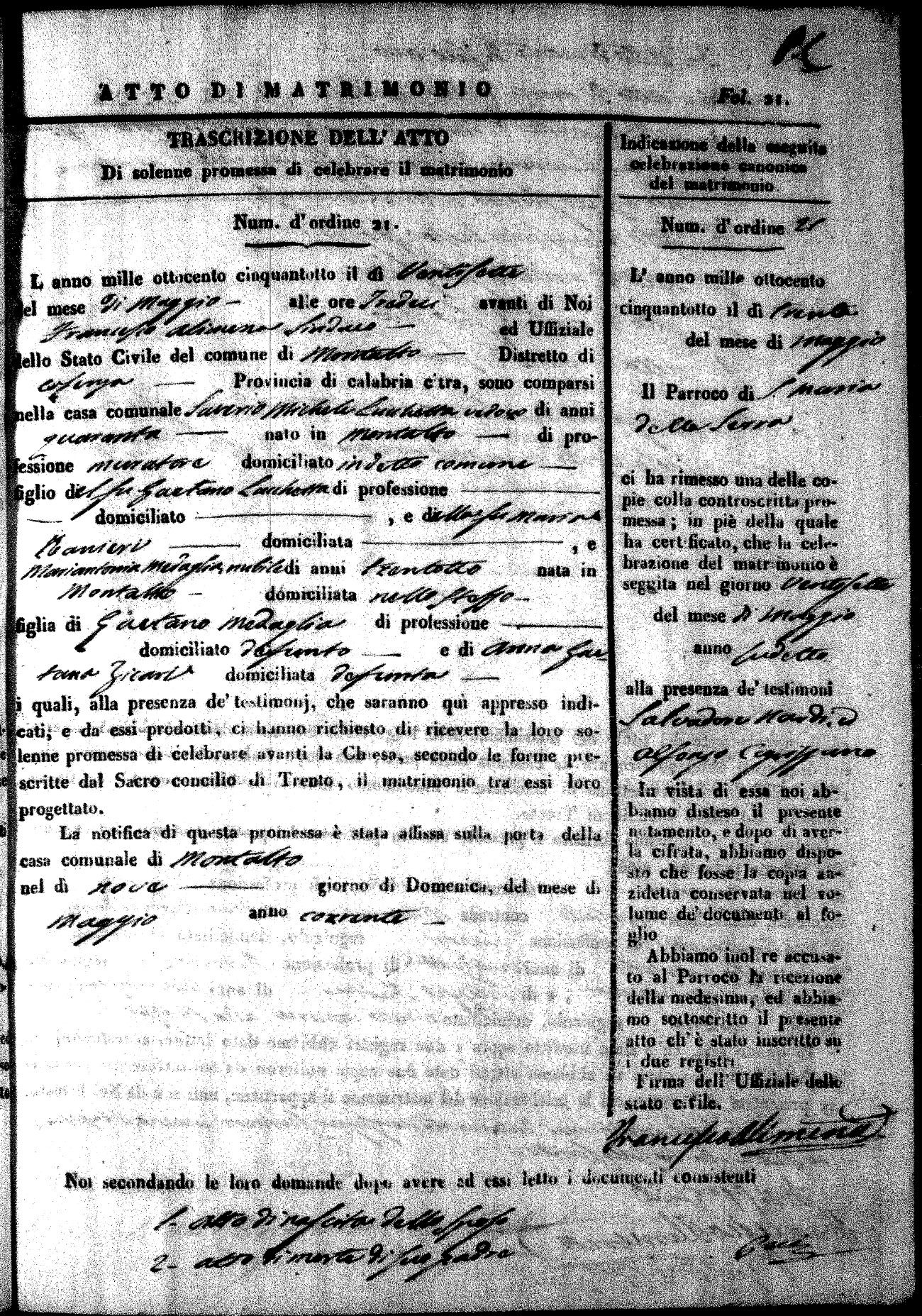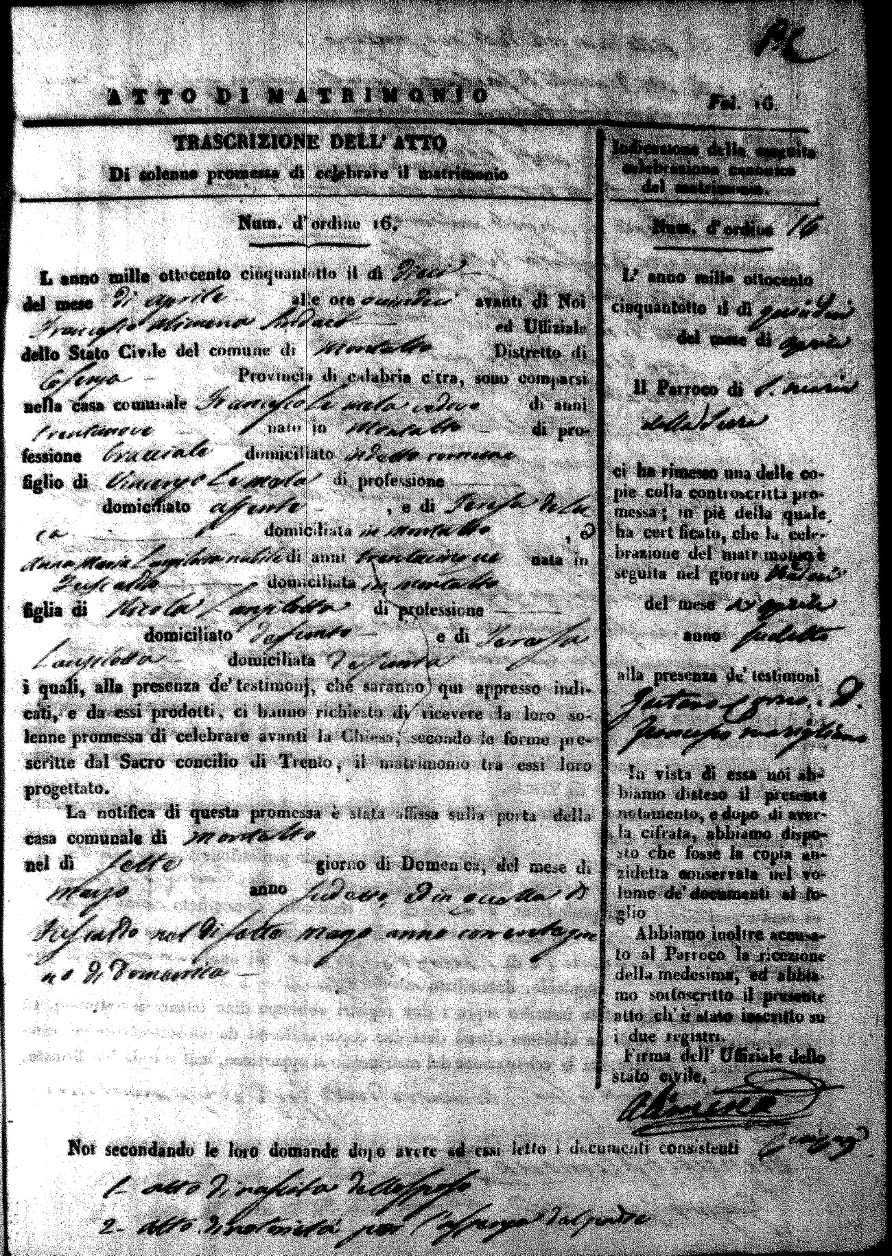 Here are the extractions for the marriage acts in 1858 for Montalto Uffugo. To save time we have only transcribed the names of the groom and bride. For more information, click on the groom's surname to view page 1 of the copy of the original document and his first name to view page 2. Please note this year is not complete yet.