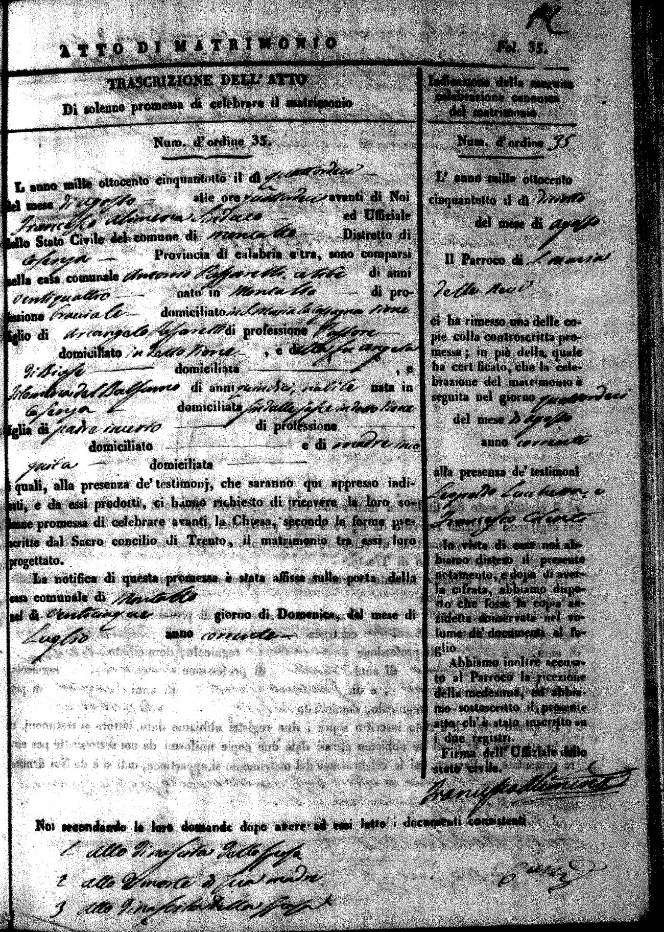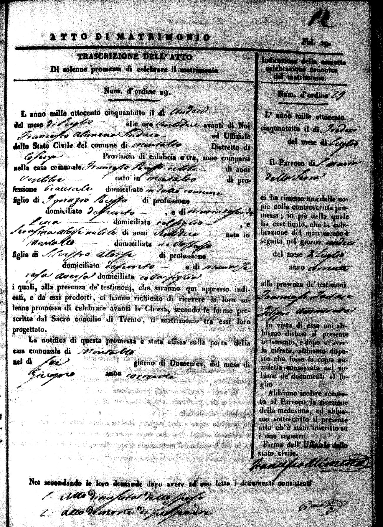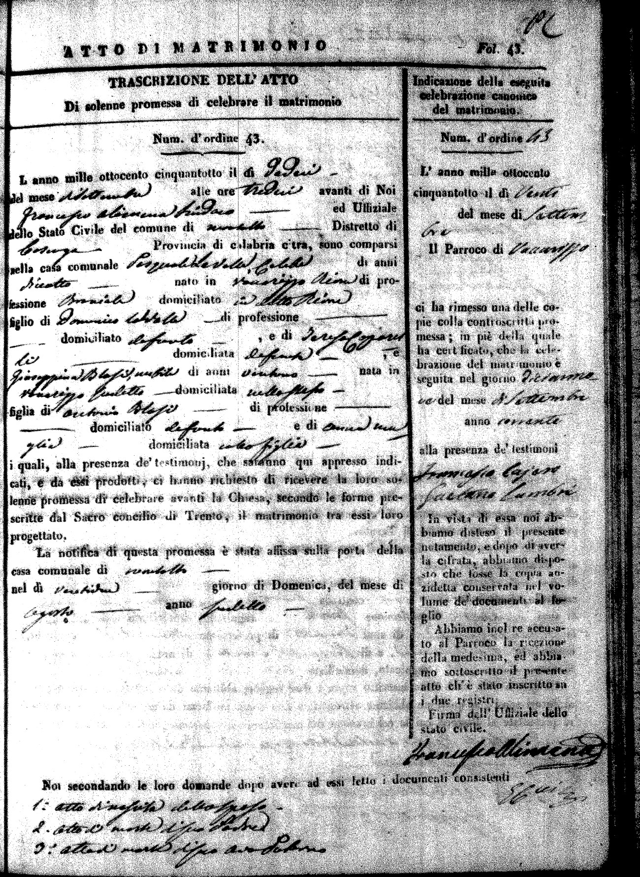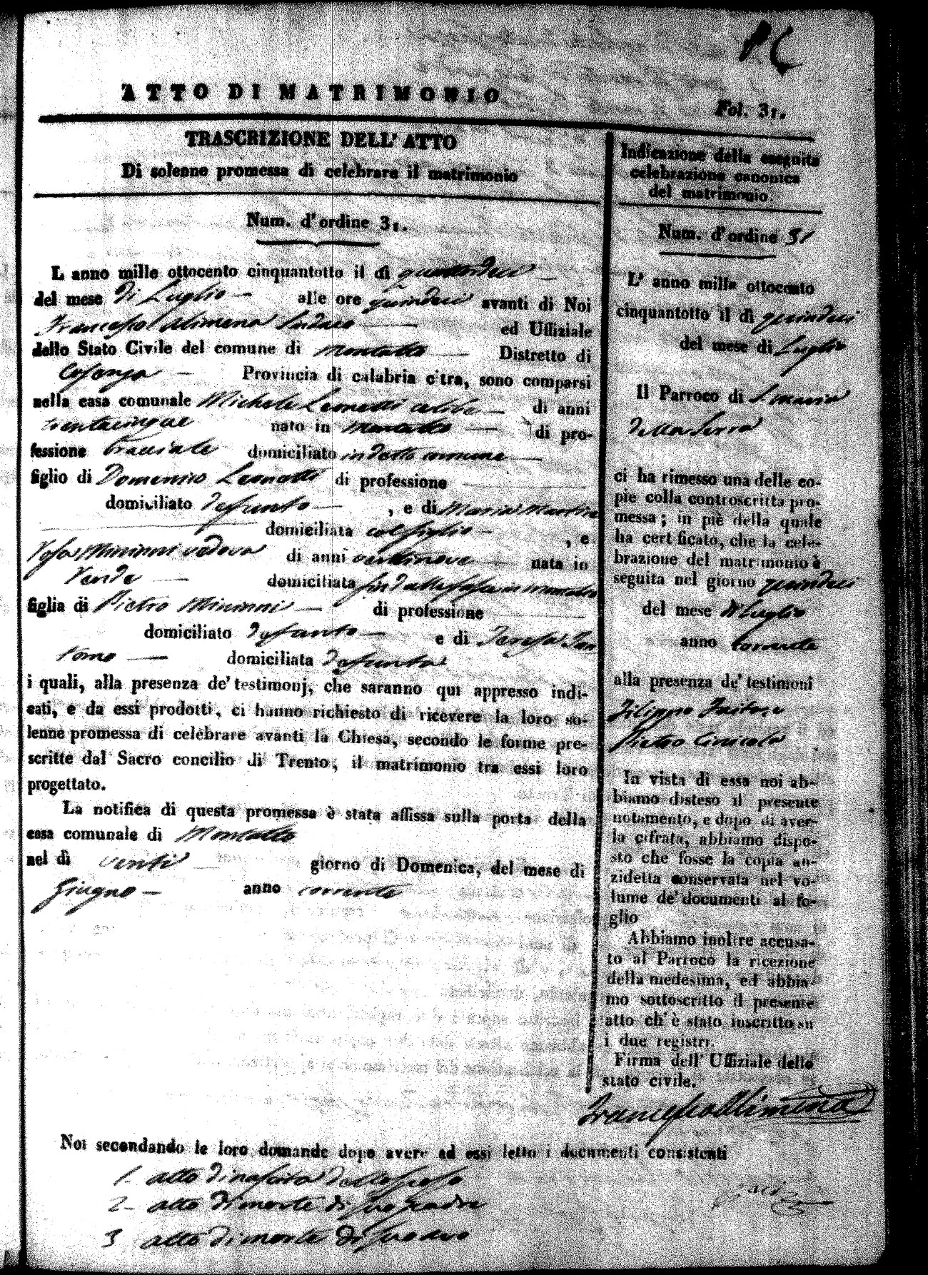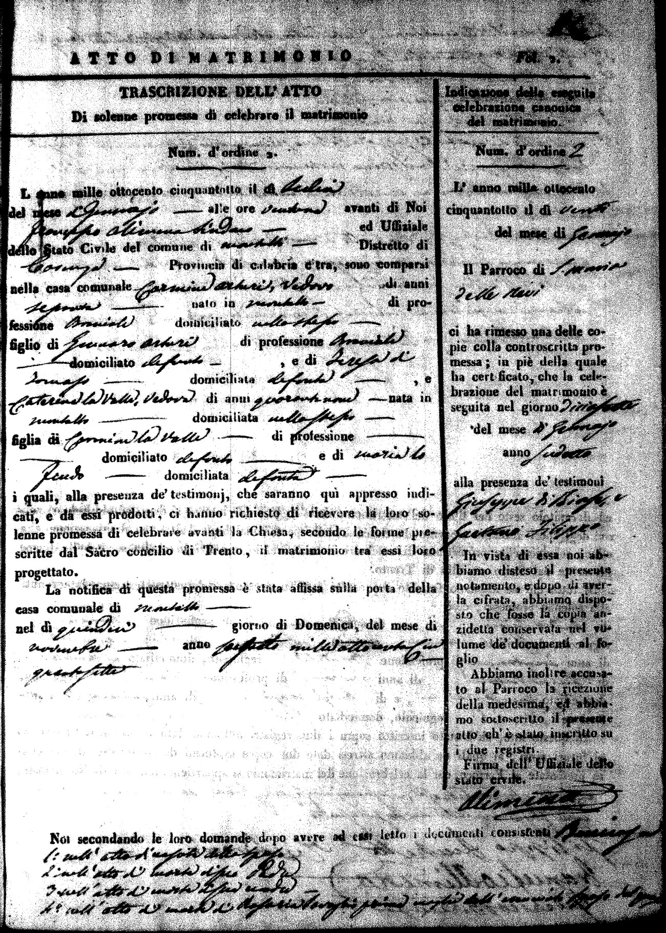 Here are the extractions for the marriage acts in 1858 for Montalto Uffugo. To save time we have only transcribed the names of the groom and bride. For more information, click on the groom's surname to view page 1 of the copy of the original document and his first name to view page 2. Please note this year is not complete yet.