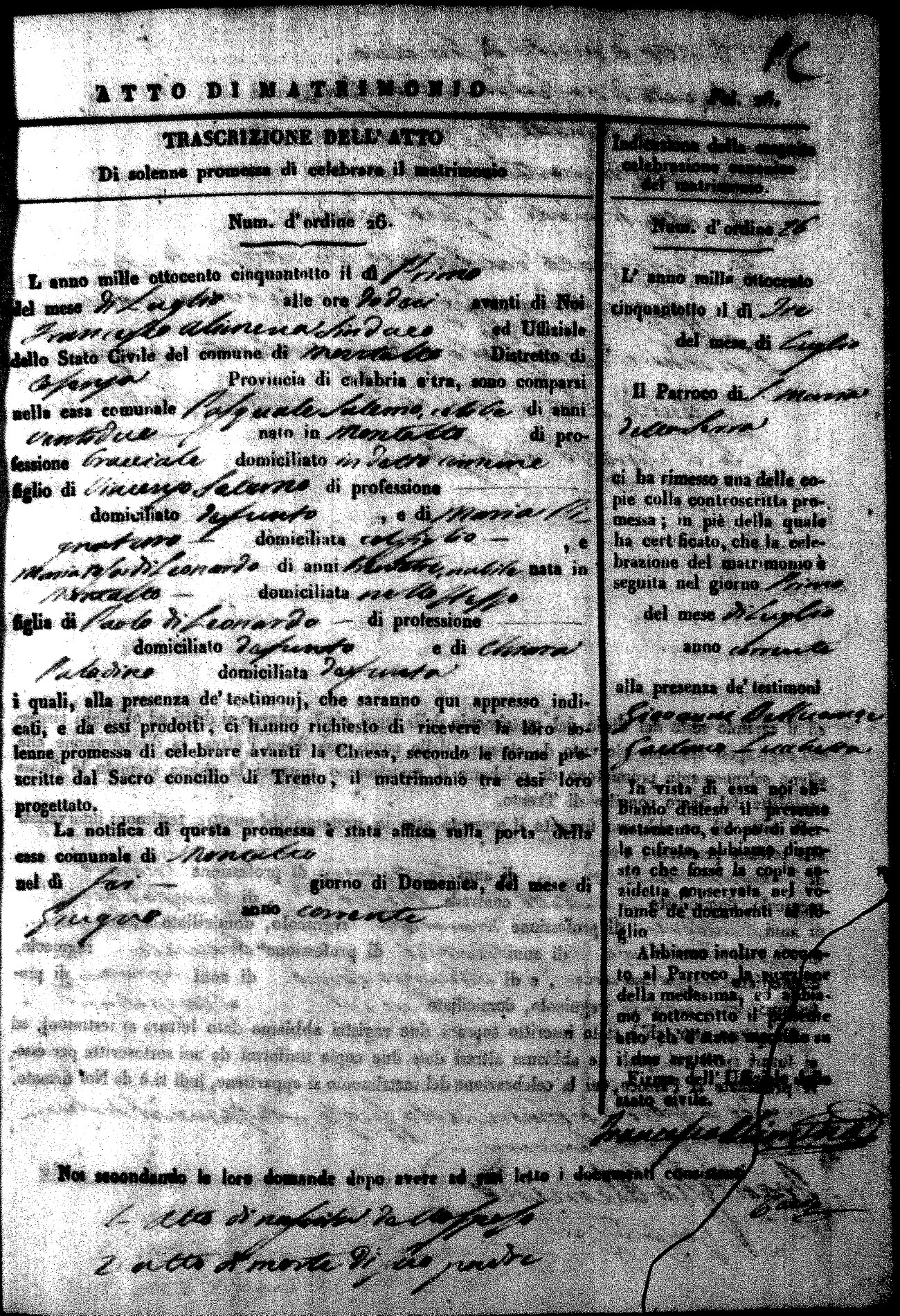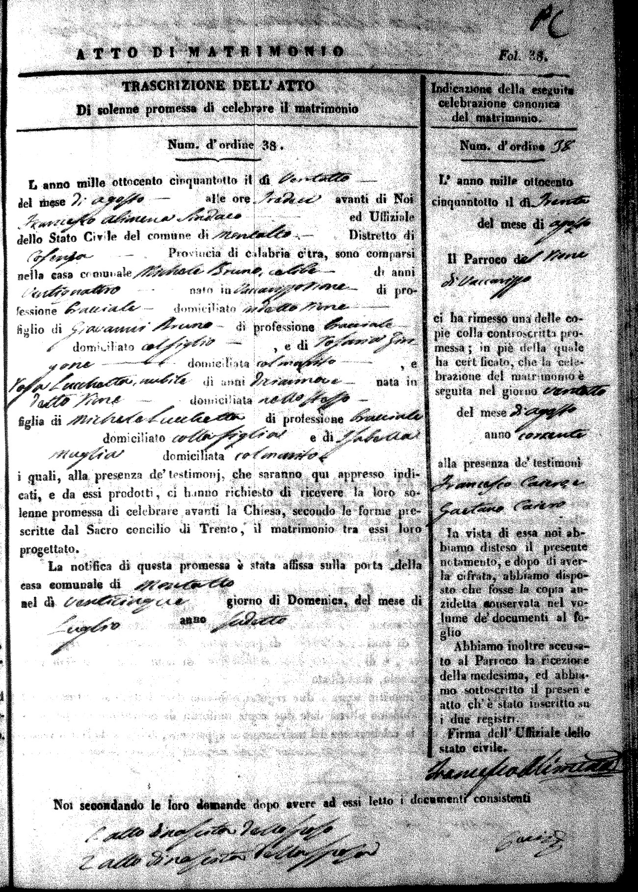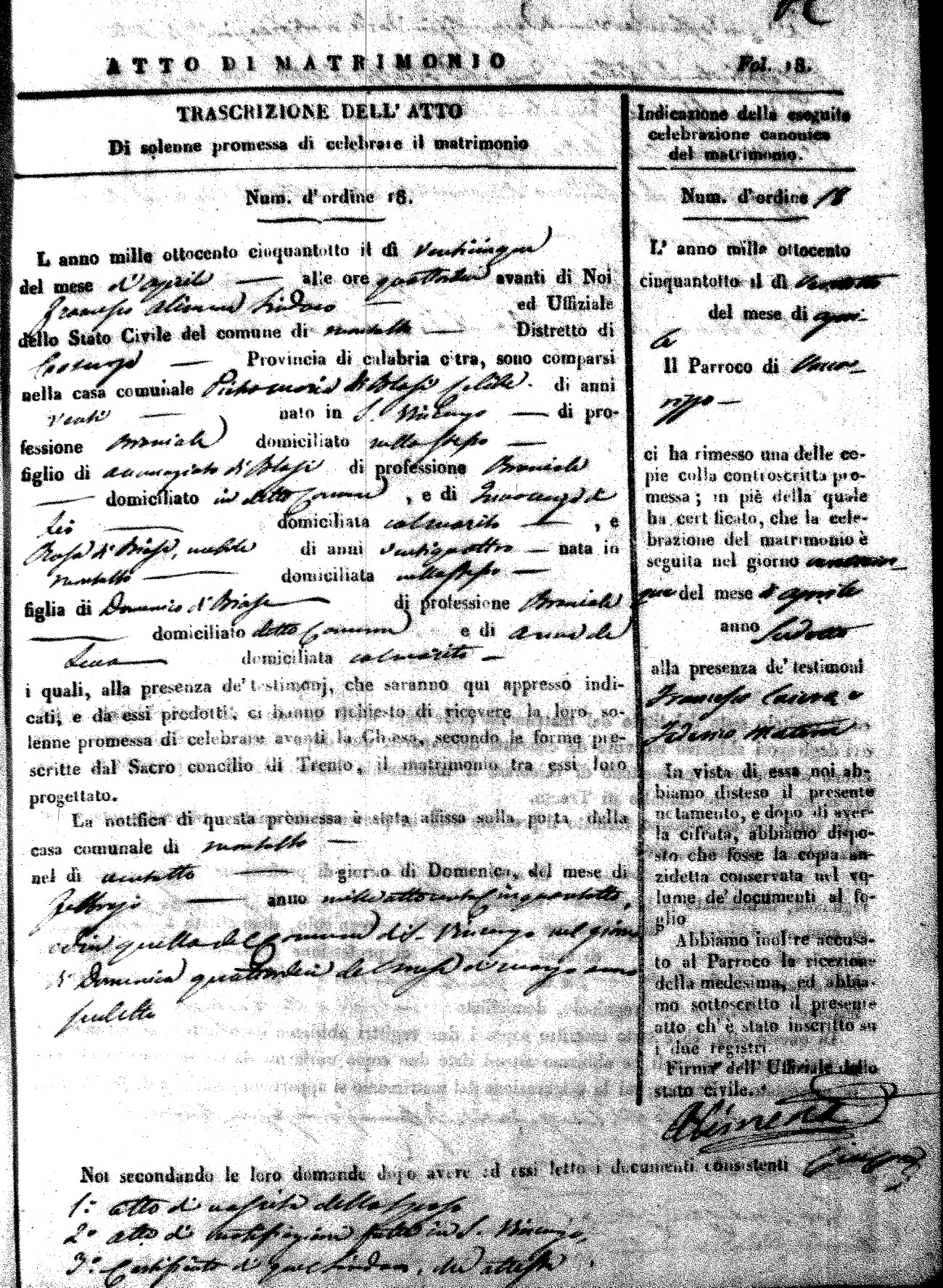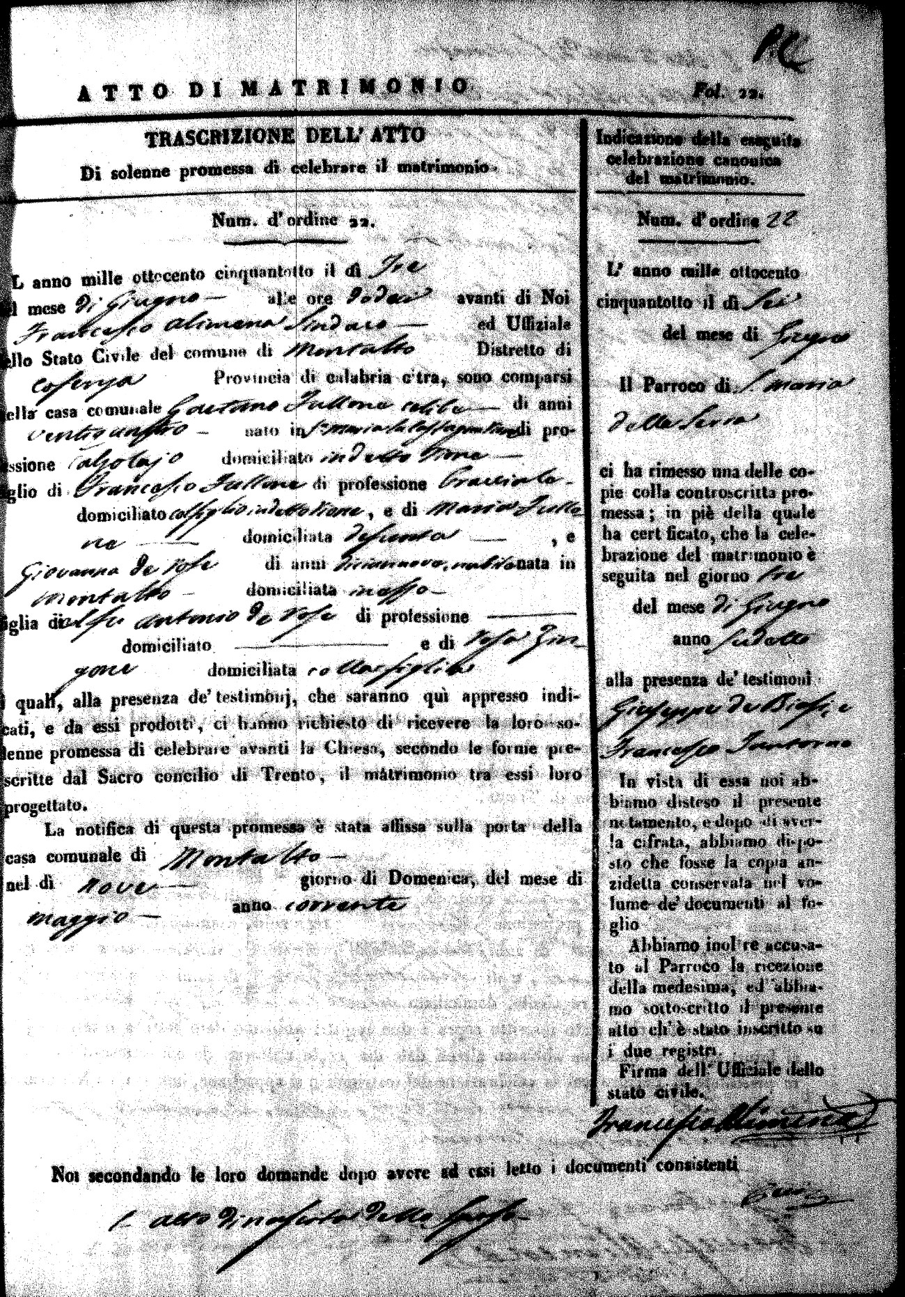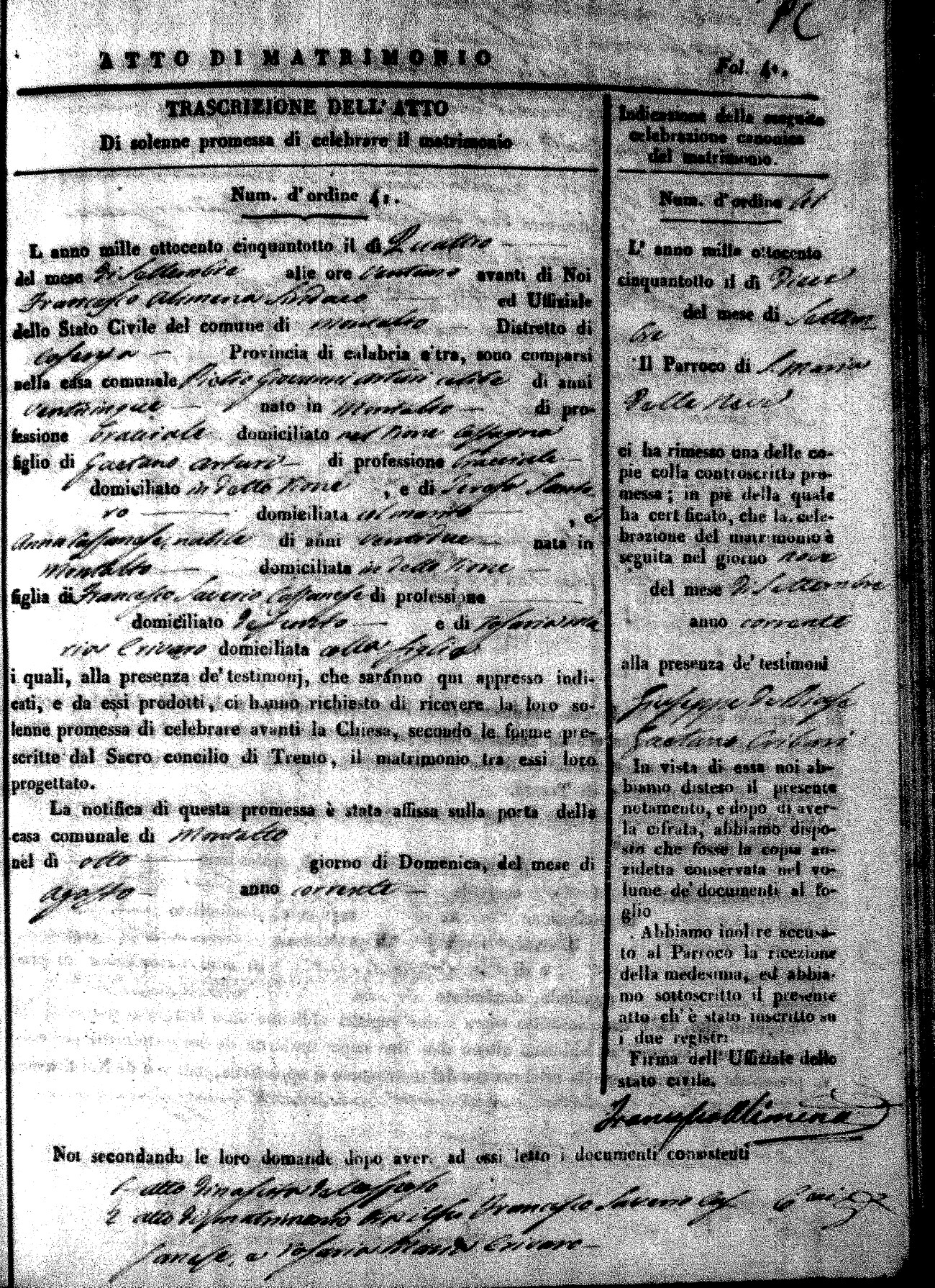 Here are the extractions for the marriage acts in 1858 for Montalto Uffugo. To save time we have only transcribed the names of the groom and bride. For more information, click on the groom's surname to view page 1 of the copy of the original document and his first name to view page 2. Please note this year is not complete yet.
