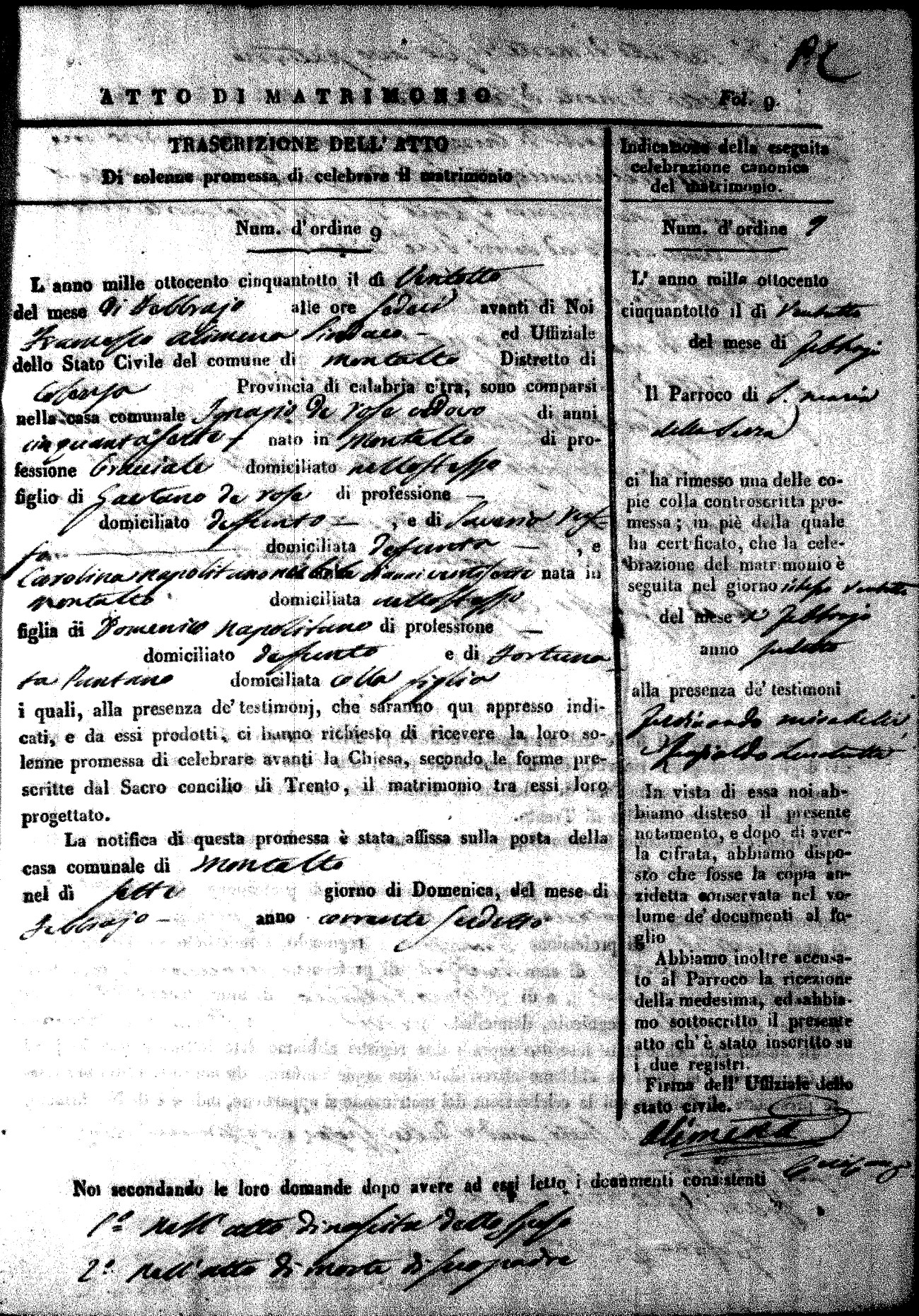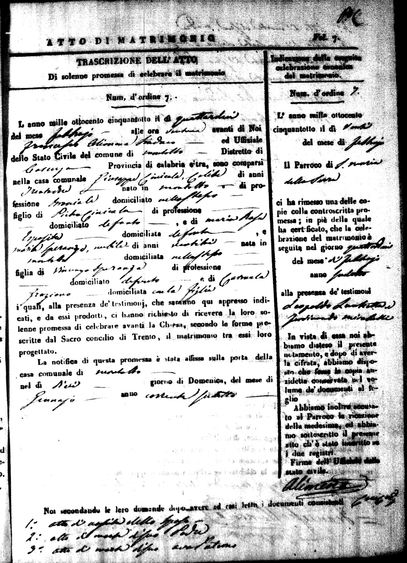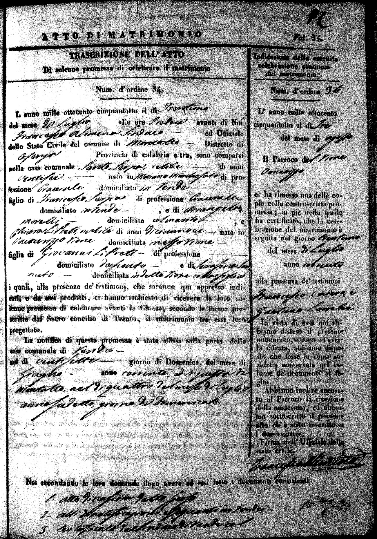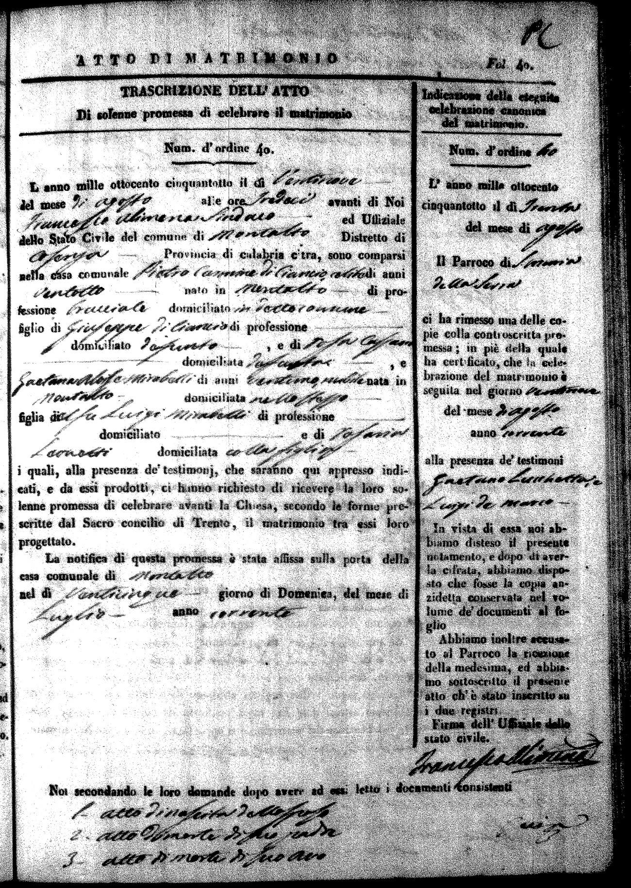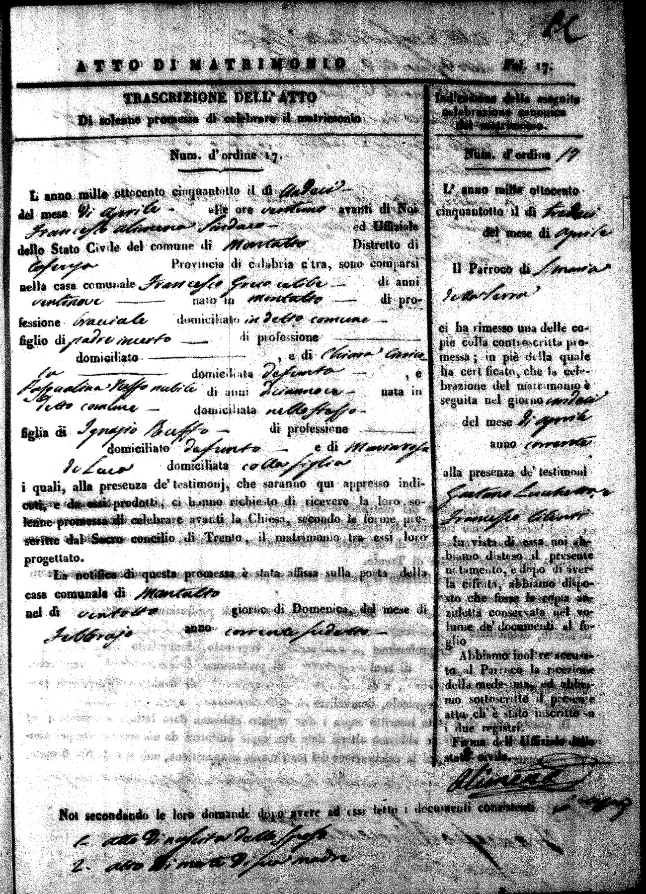 Here are the extractions for the marriage acts in 1858 for Montalto Uffugo. To save time we have only transcribed the names of the groom and bride. For more information, click on the groom's surname to view page 1 of the copy of the original document and his first name to view page 2. Please note this year is not complete yet.