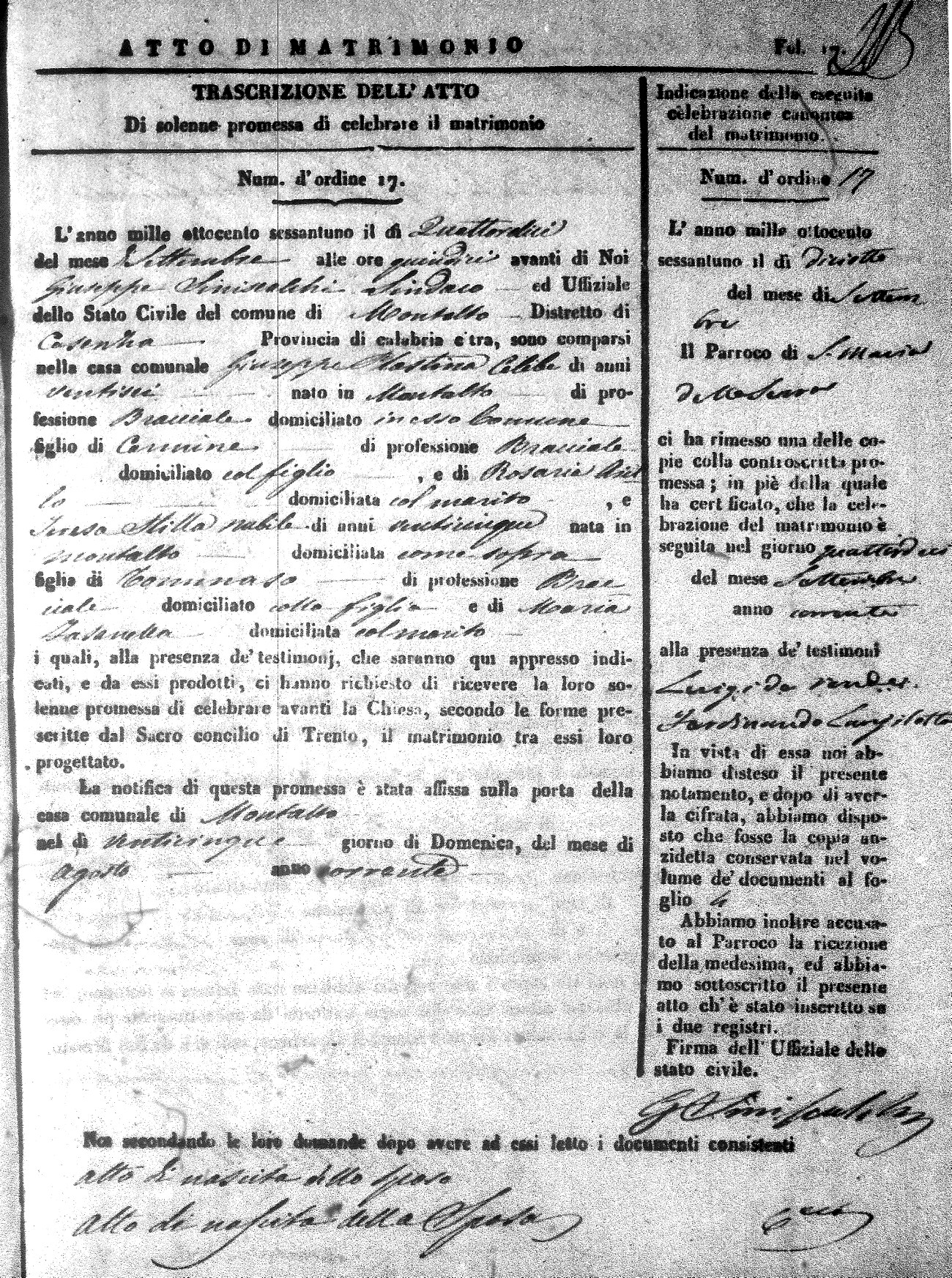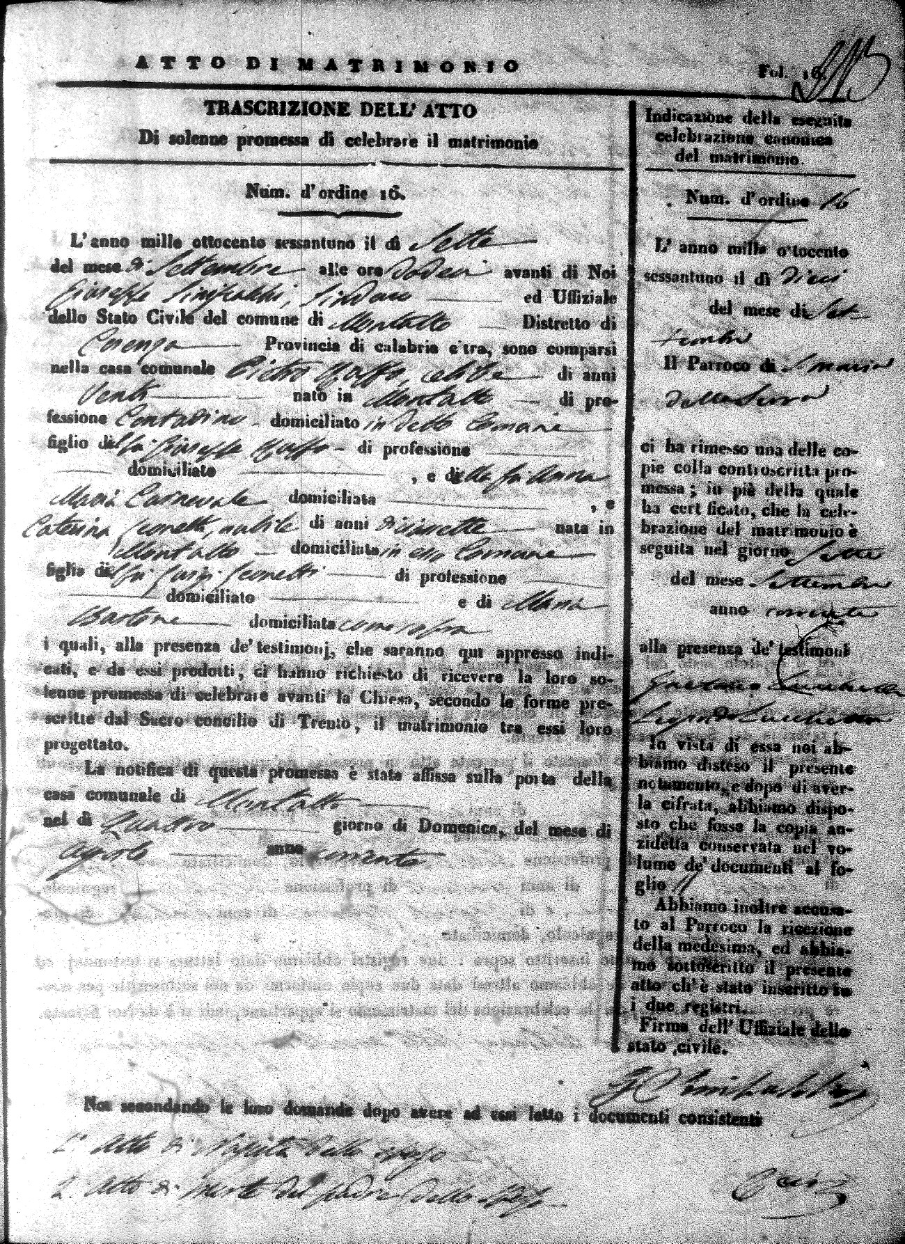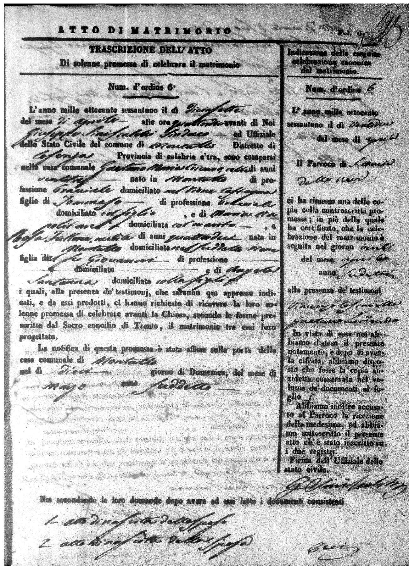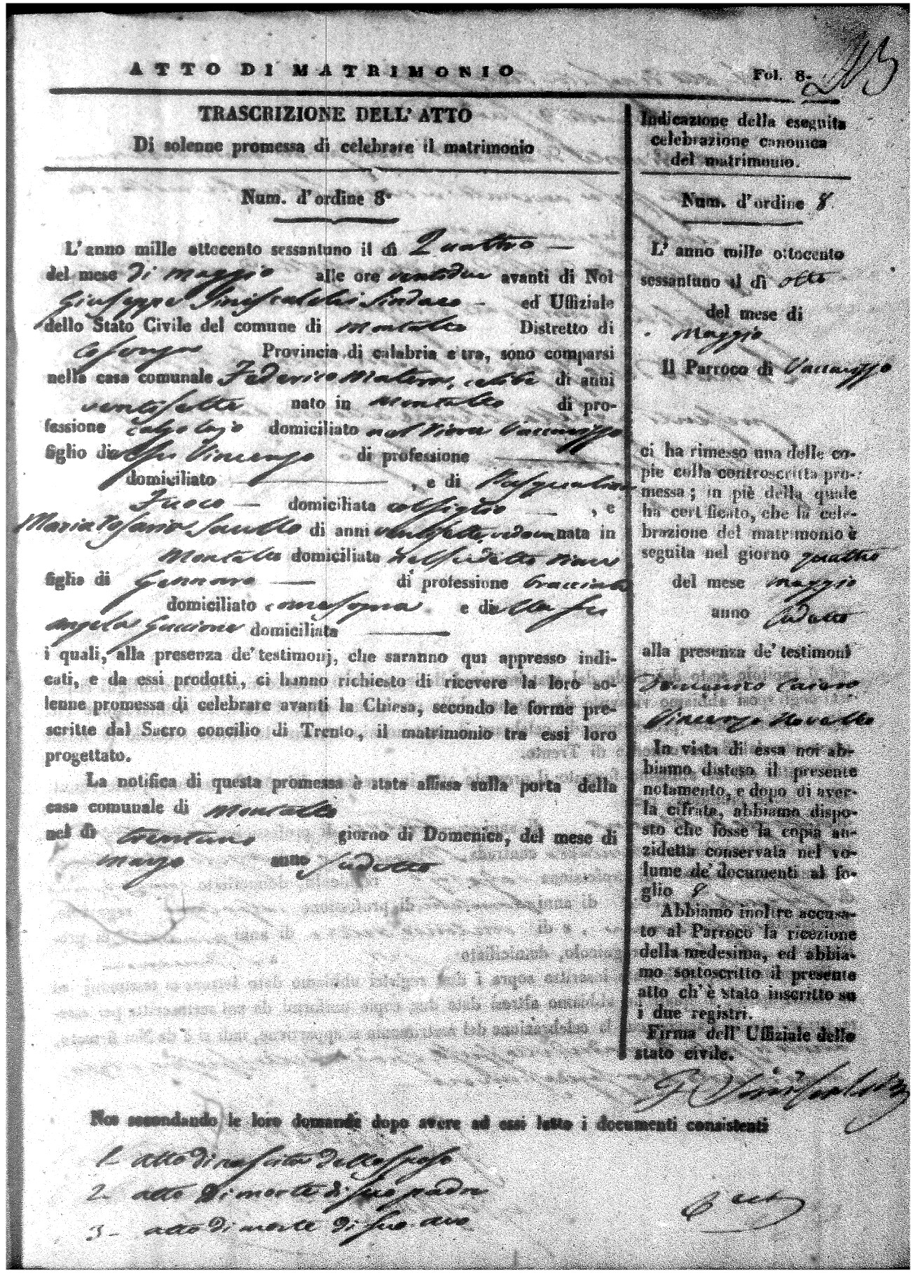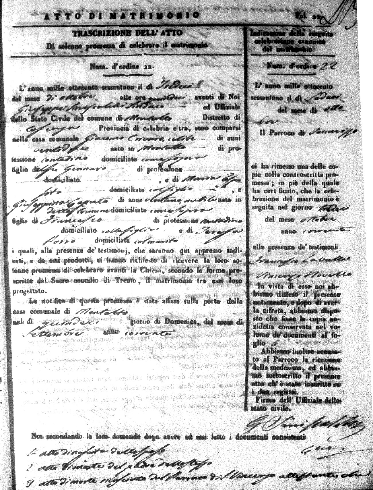 Here are the extractions for all the marriage acts in 1861 for Montalto Uffugo. This year is complete. For more information, click on the groom's surname to view a copy of the original document.