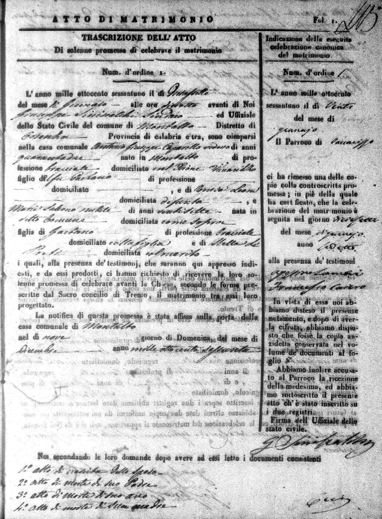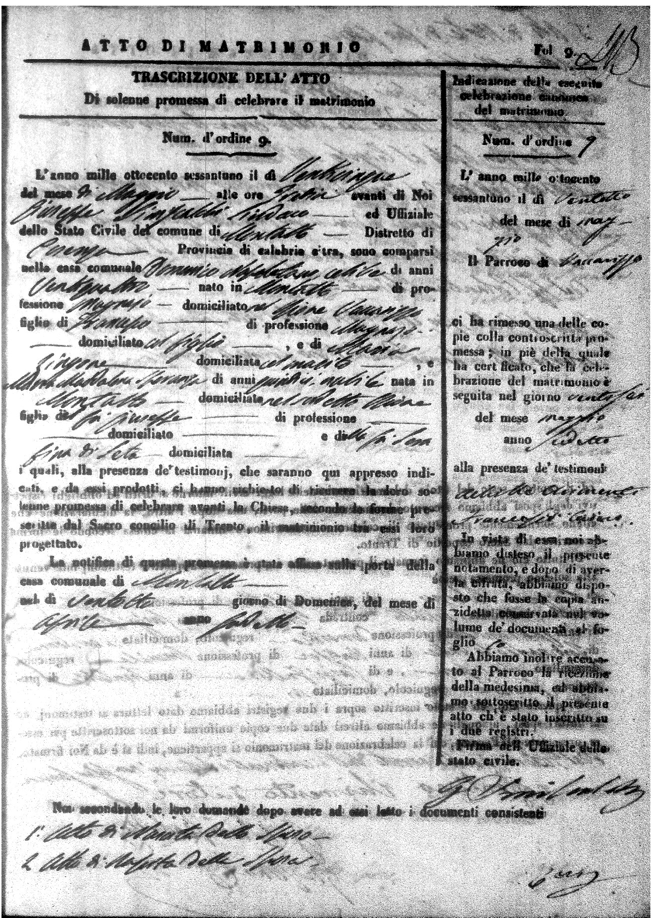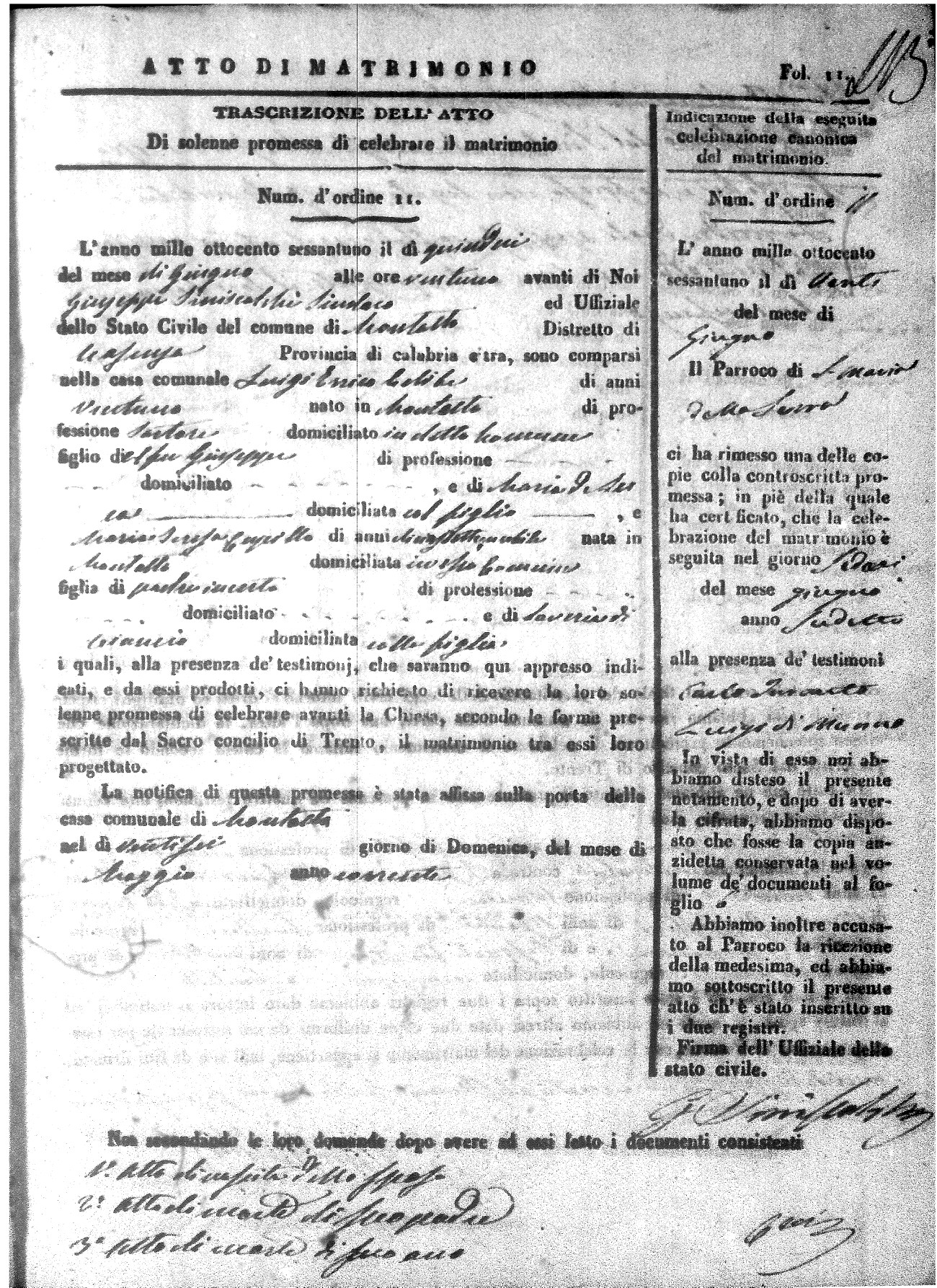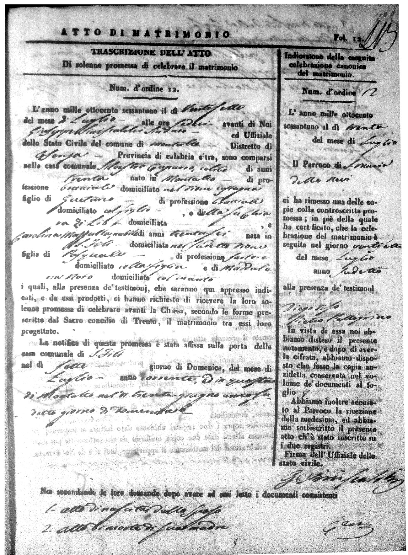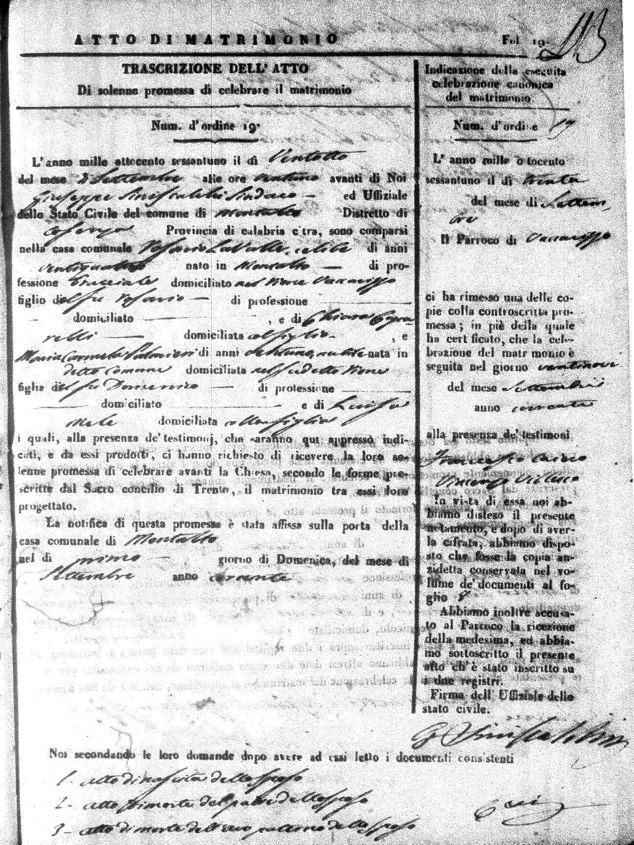 Here are the extractions for all the marriage acts in 1861 for Montalto Uffugo. This year is complete. For more information, click on the groom's surname to view a copy of the original document.