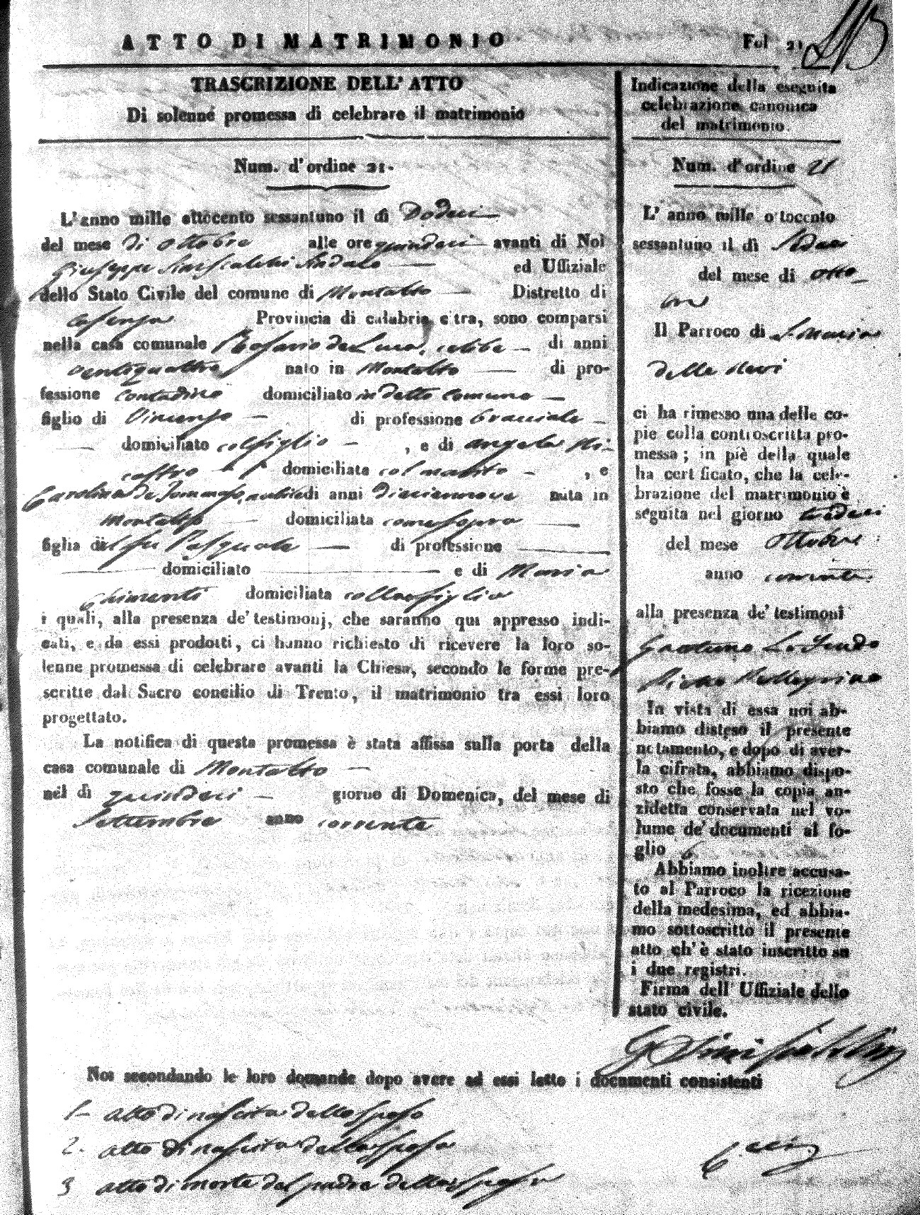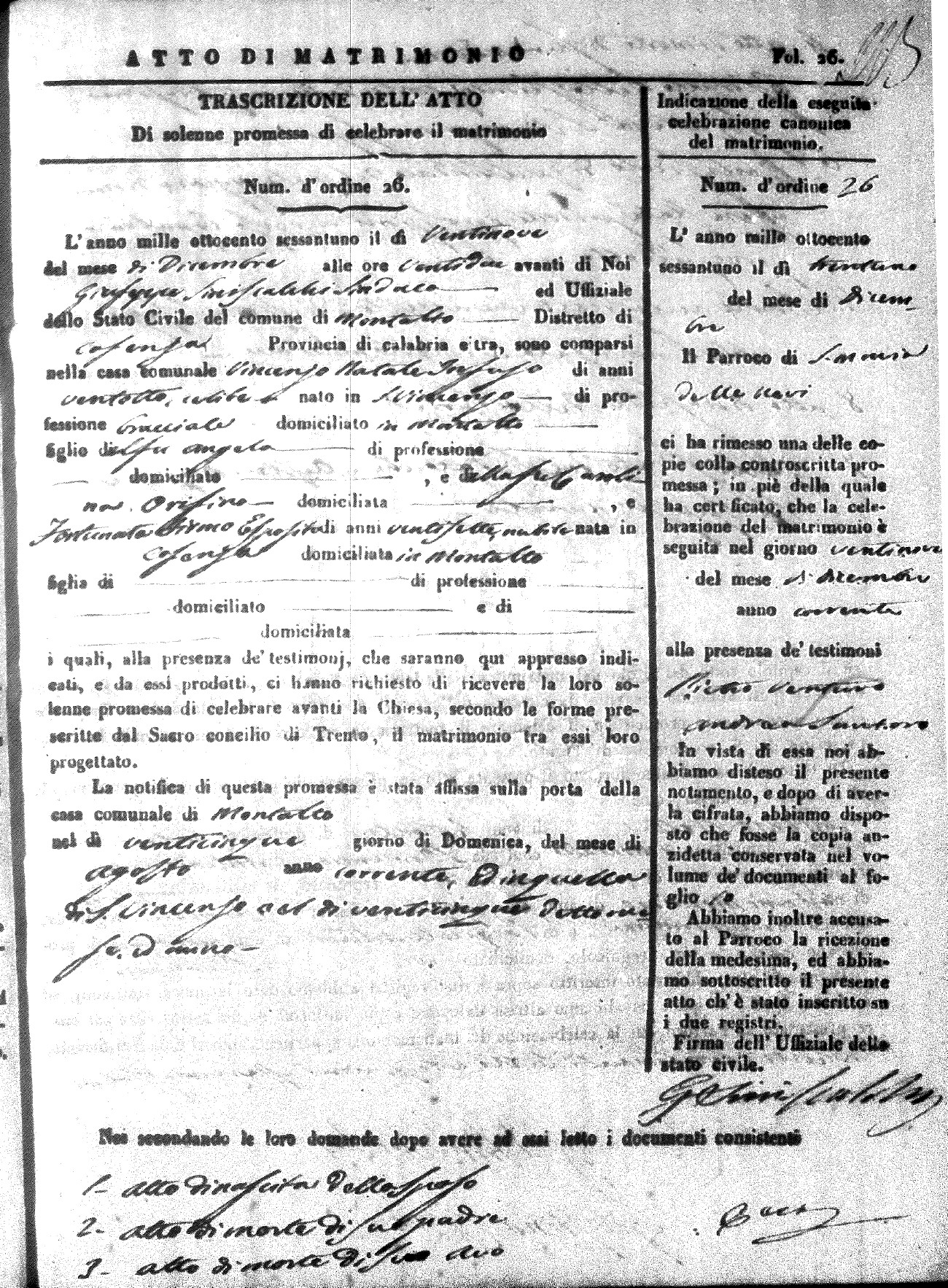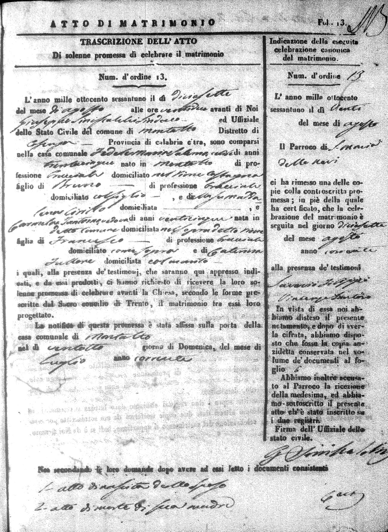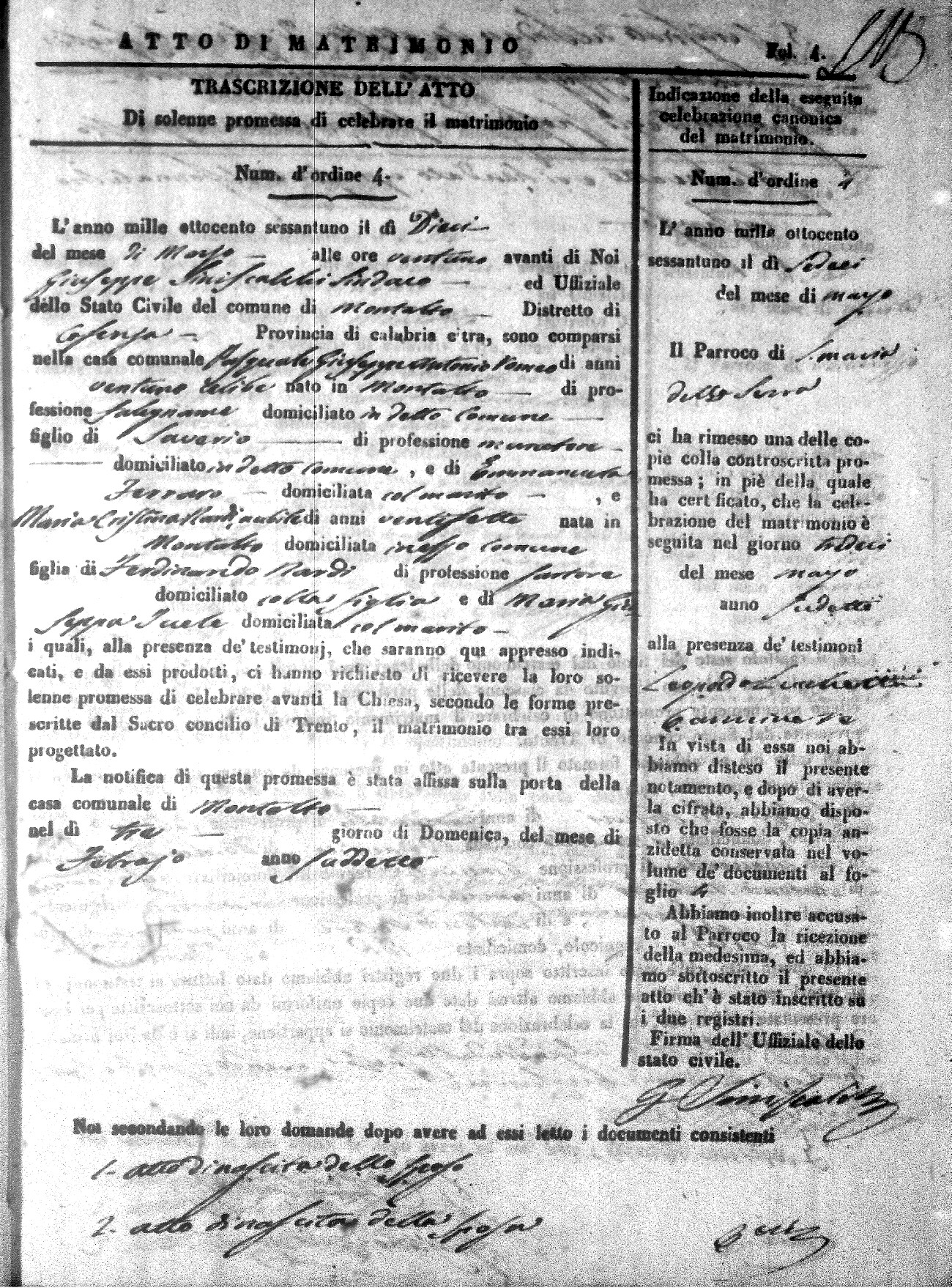 Here are the extractions for all the marriage acts in 1861 for Montalto Uffugo. This year is complete. For more information, click on the groom's surname to view a copy of the original document.