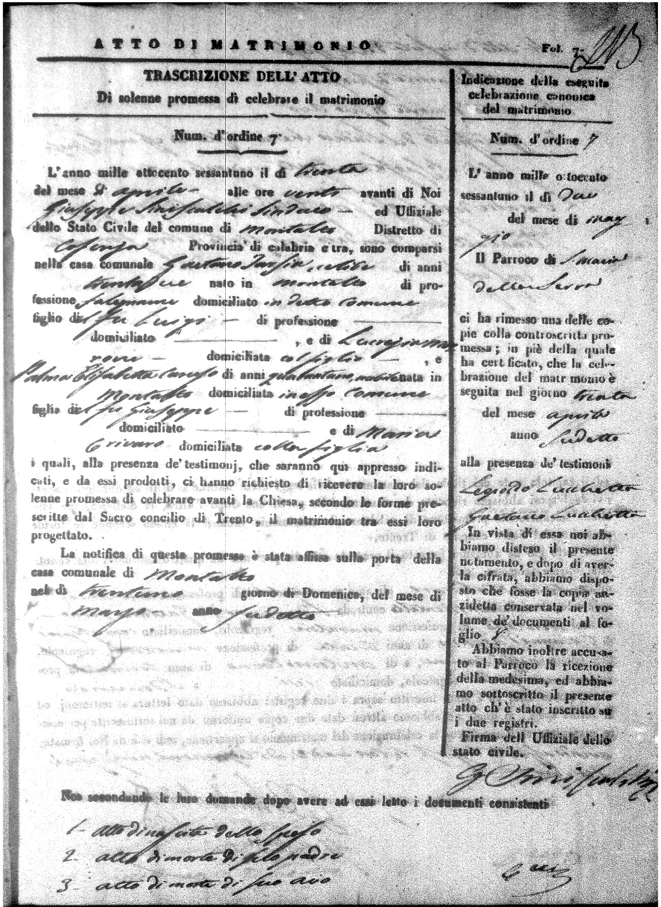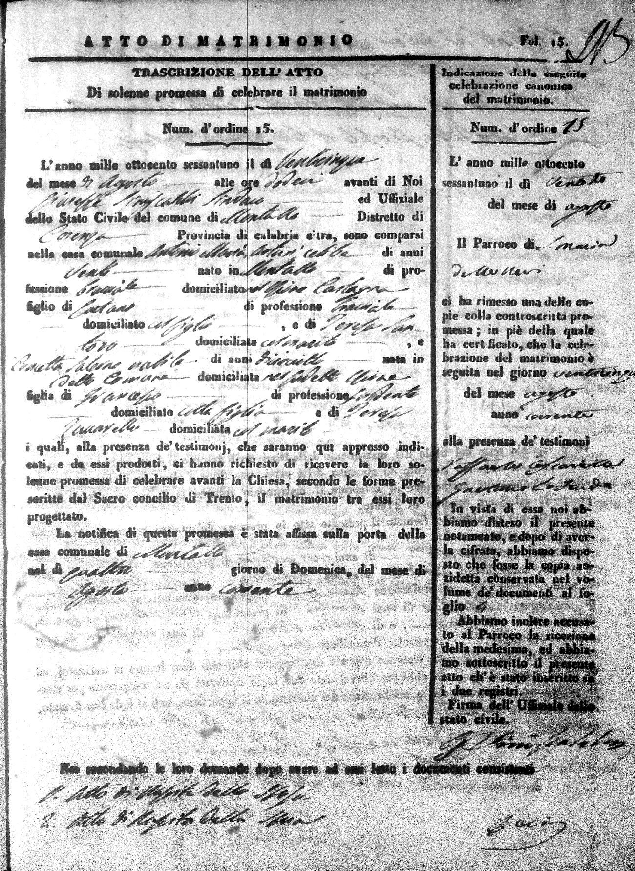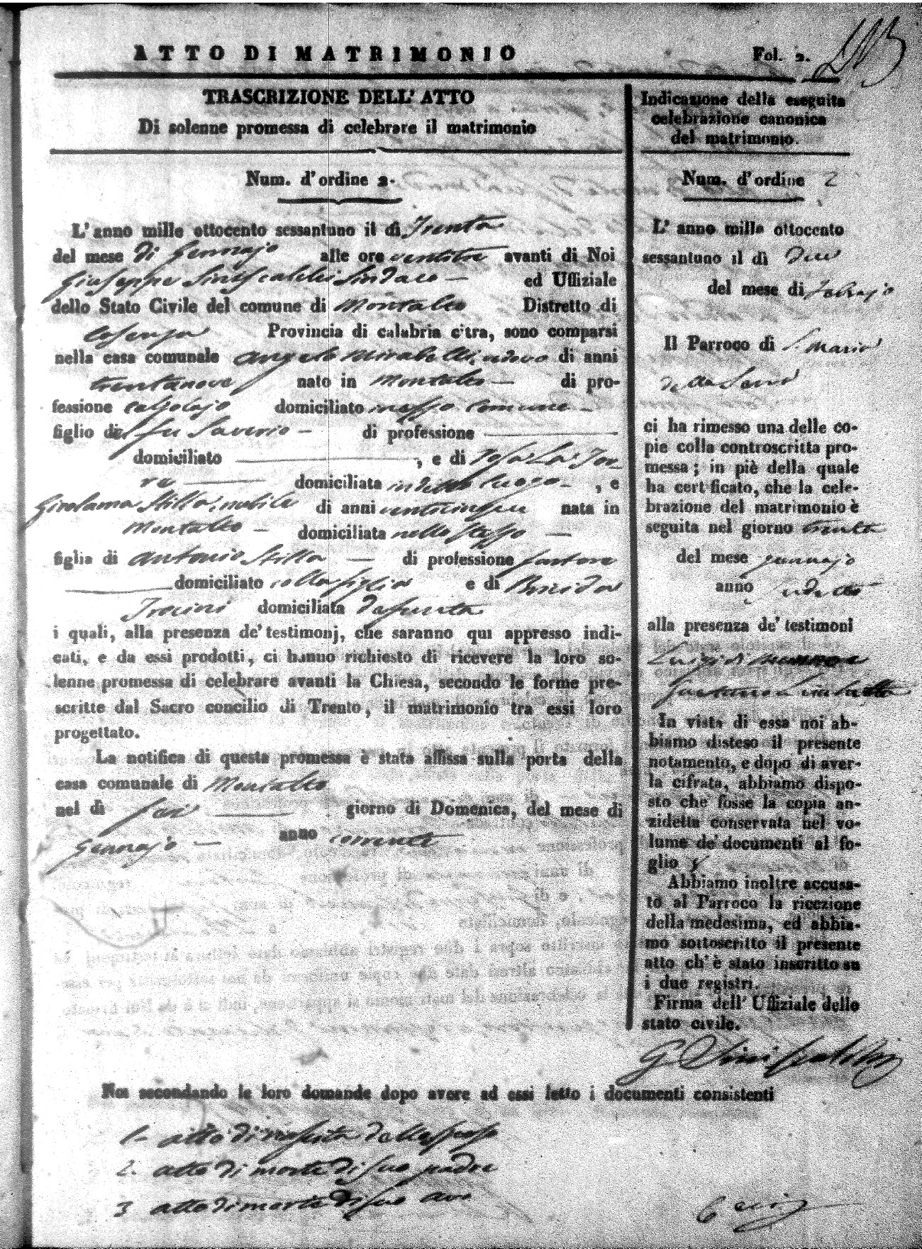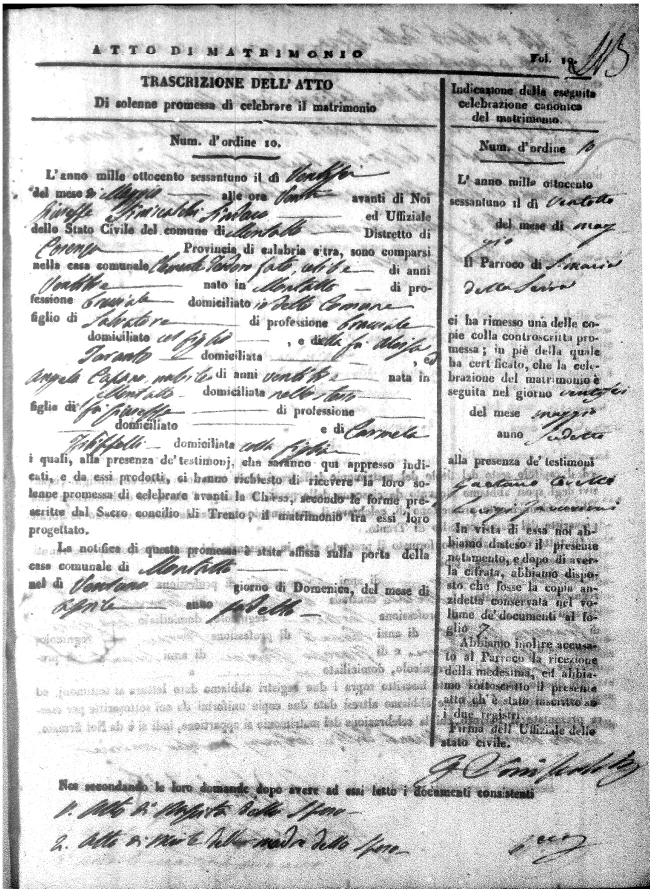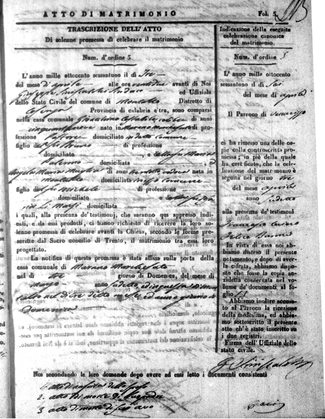 Here are the extractions for all the marriage acts in 1861 for Montalto Uffugo. This year is complete. For more information, click on the groom's surname to view a copy of the original document.