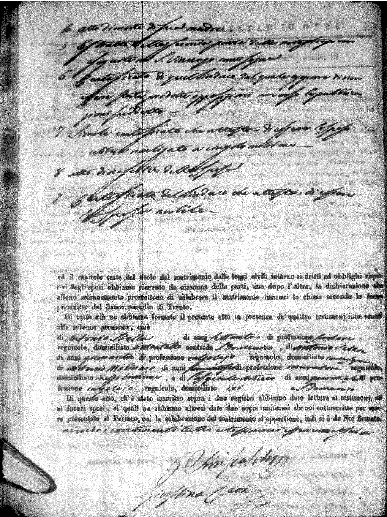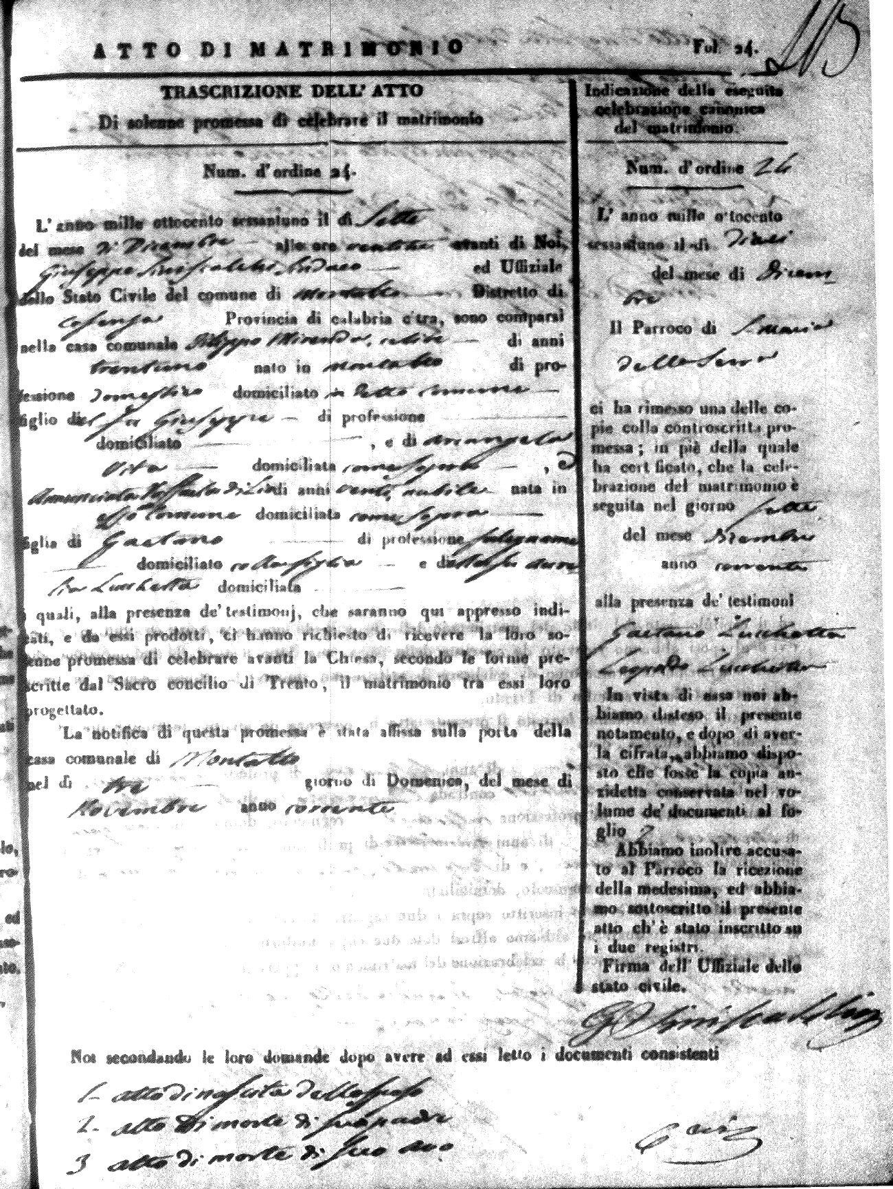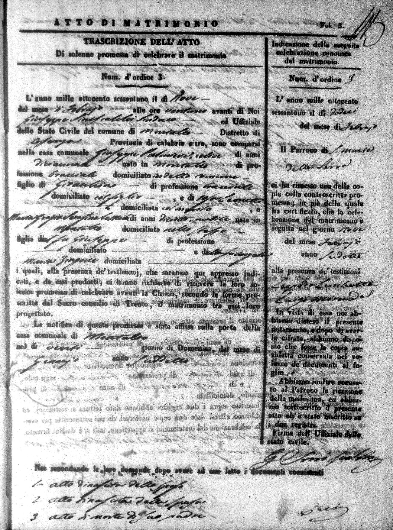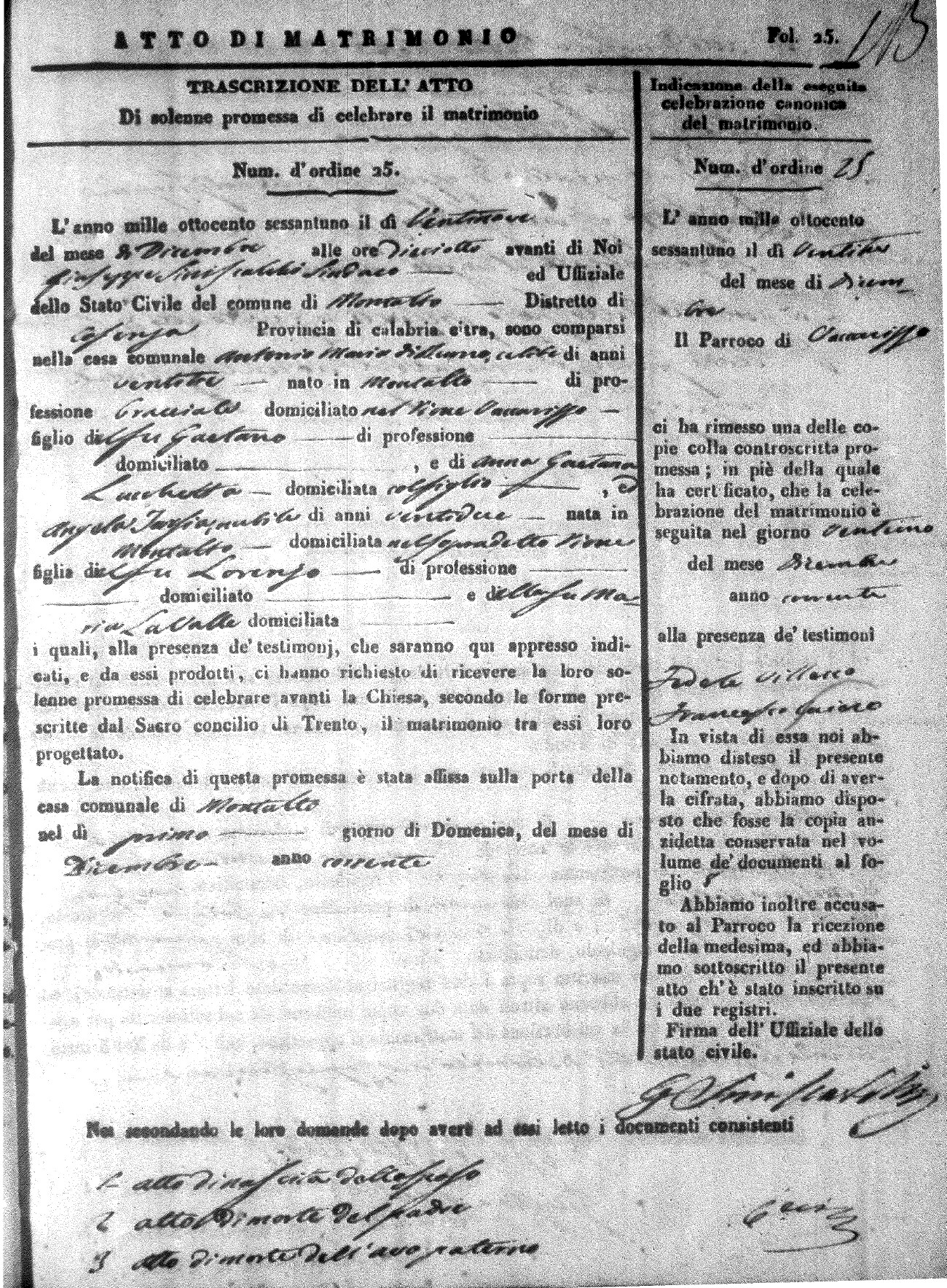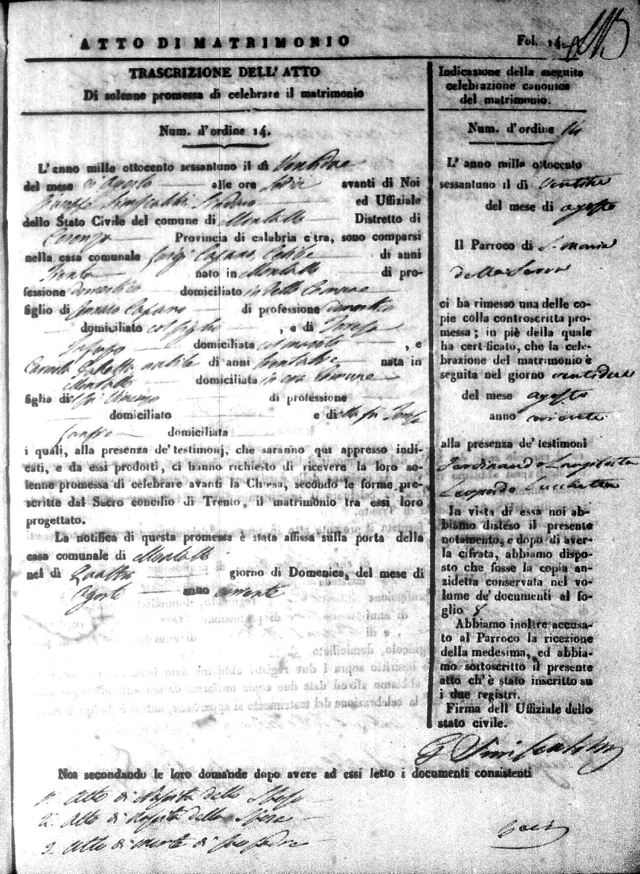 Here are the extractions for all the marriage acts in 1861 for Montalto Uffugo. This year is complete. For more information, click on the groom's surname to view a copy of the original document.