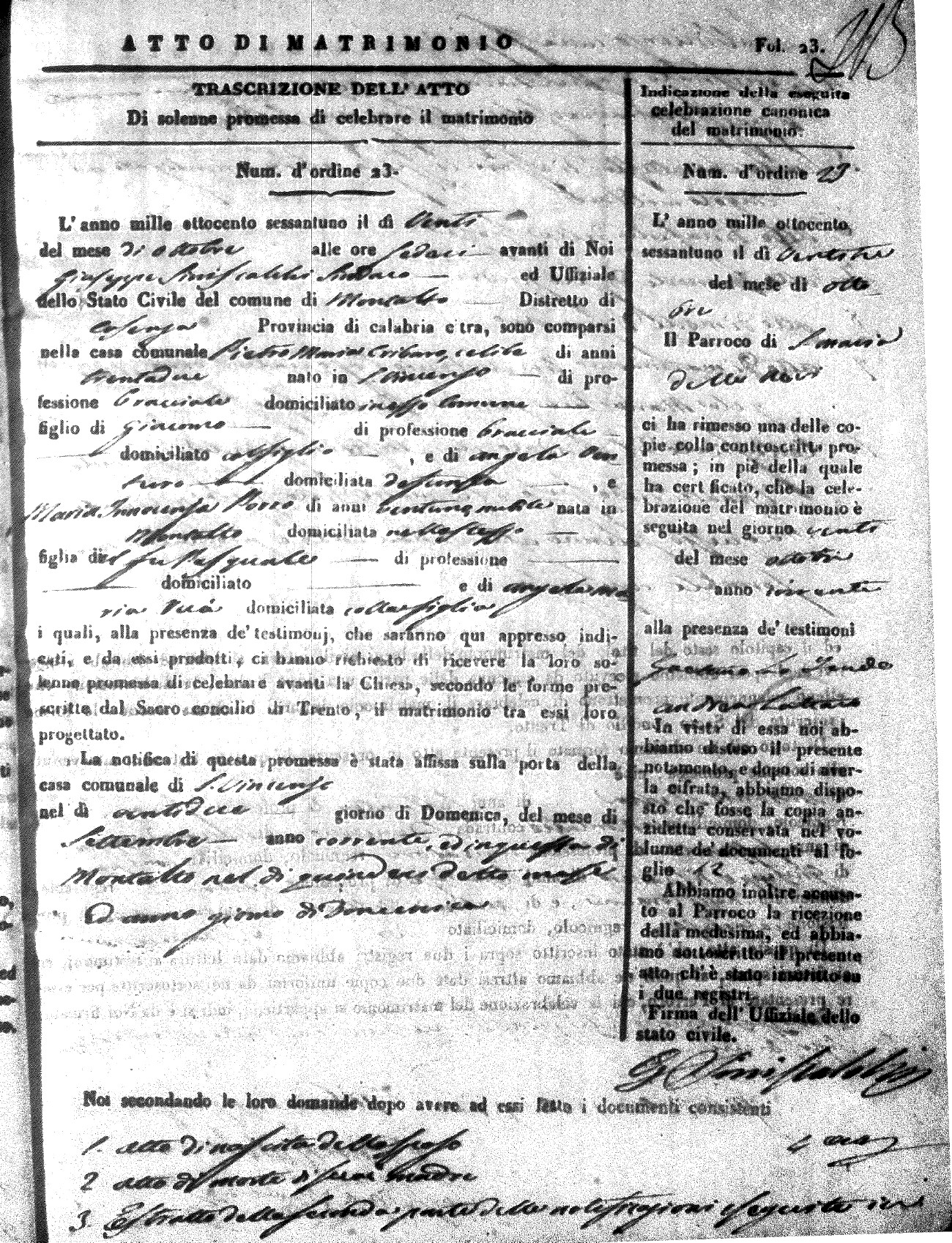 | 23 | Cribaro | Pietro Maria | Giacomo | Venturo | Angela (fu) | Porro | Maria Innocenza | Pasquale (fu) | Rua | Angela Maria |