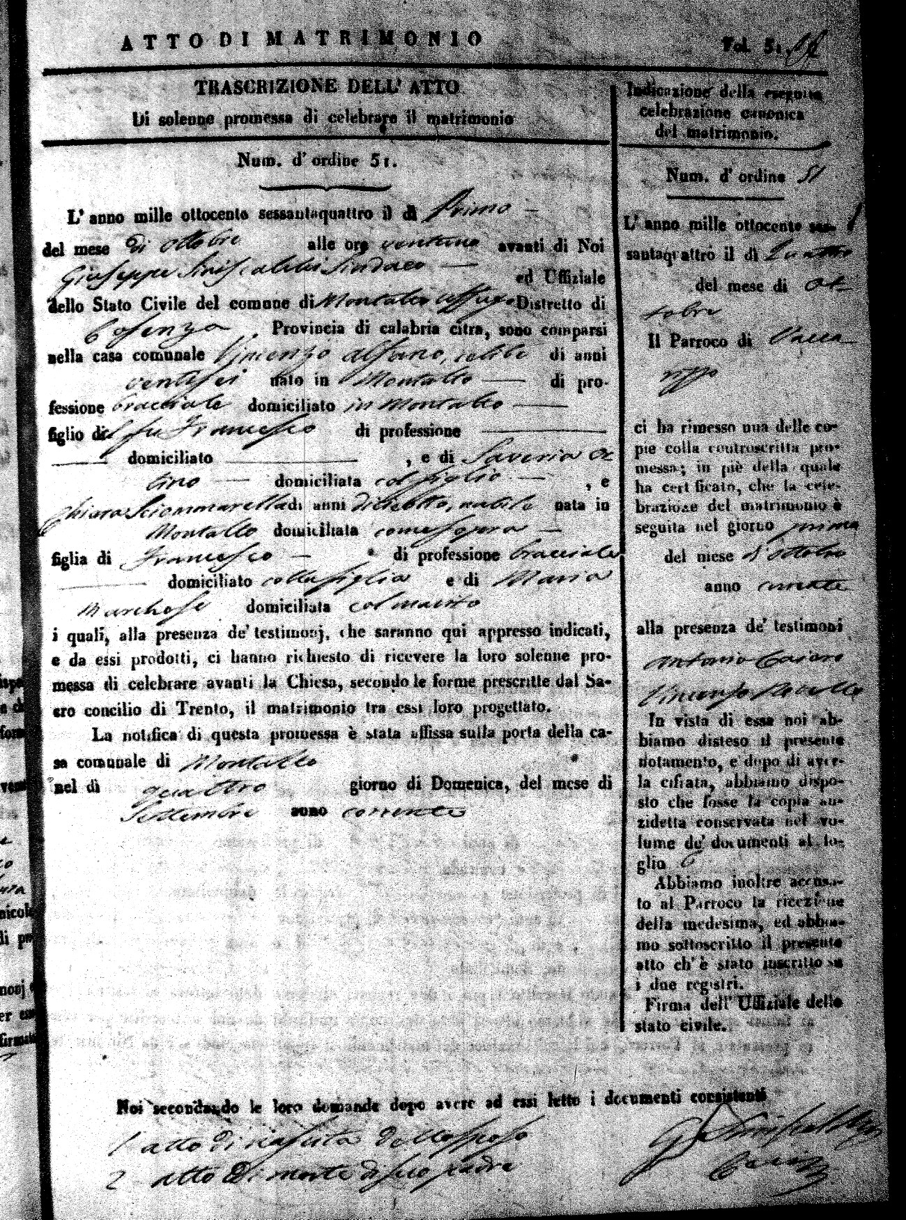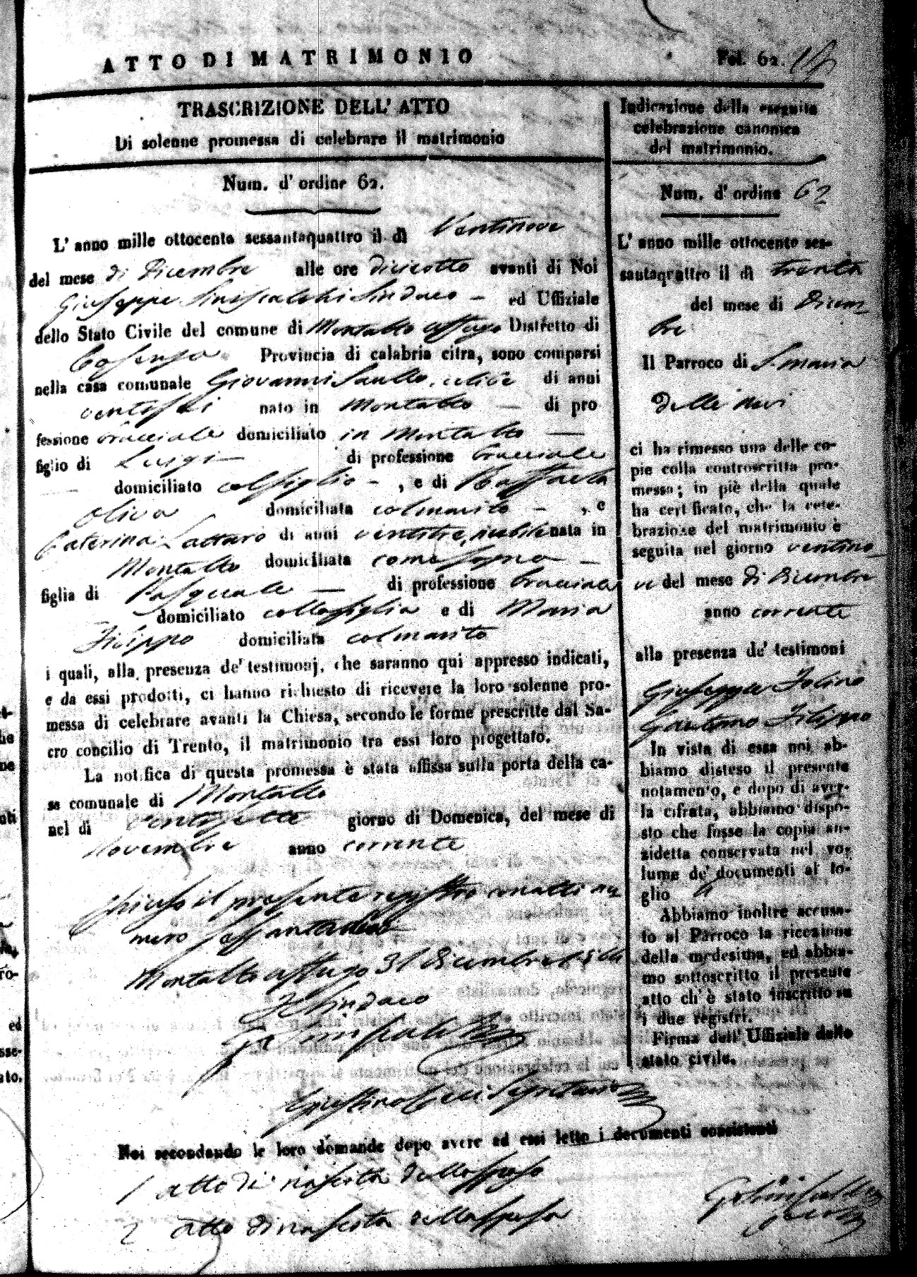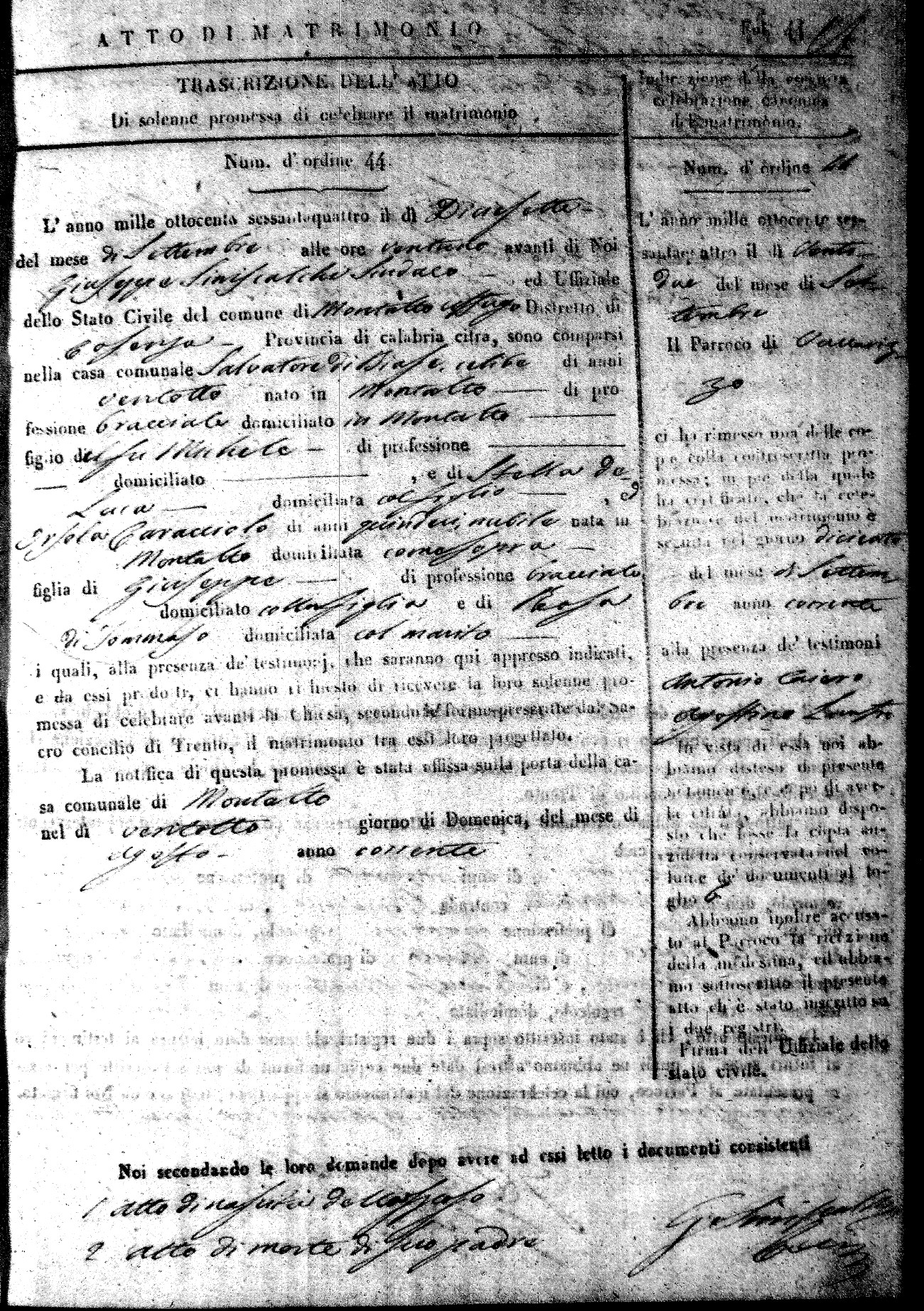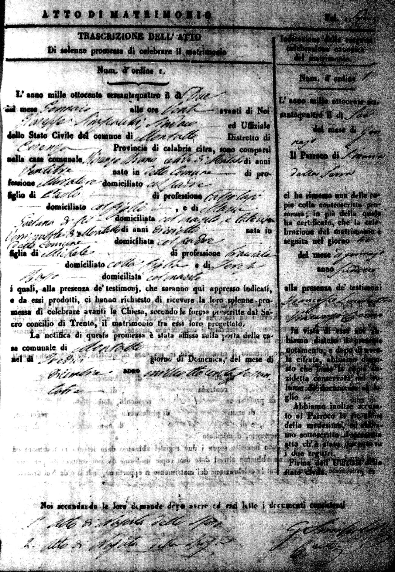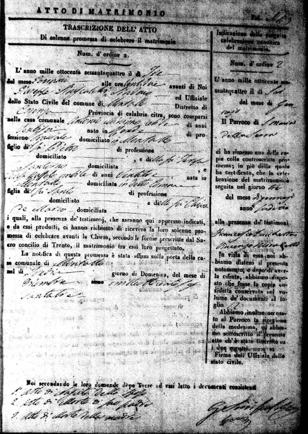 Here are the extractions for all the marriage acts in 1864 for Montalto Uffugo. To save time we have only transcribed the names of the groom and bride. For more information, click on the groom's surname to view a copy of the original document.