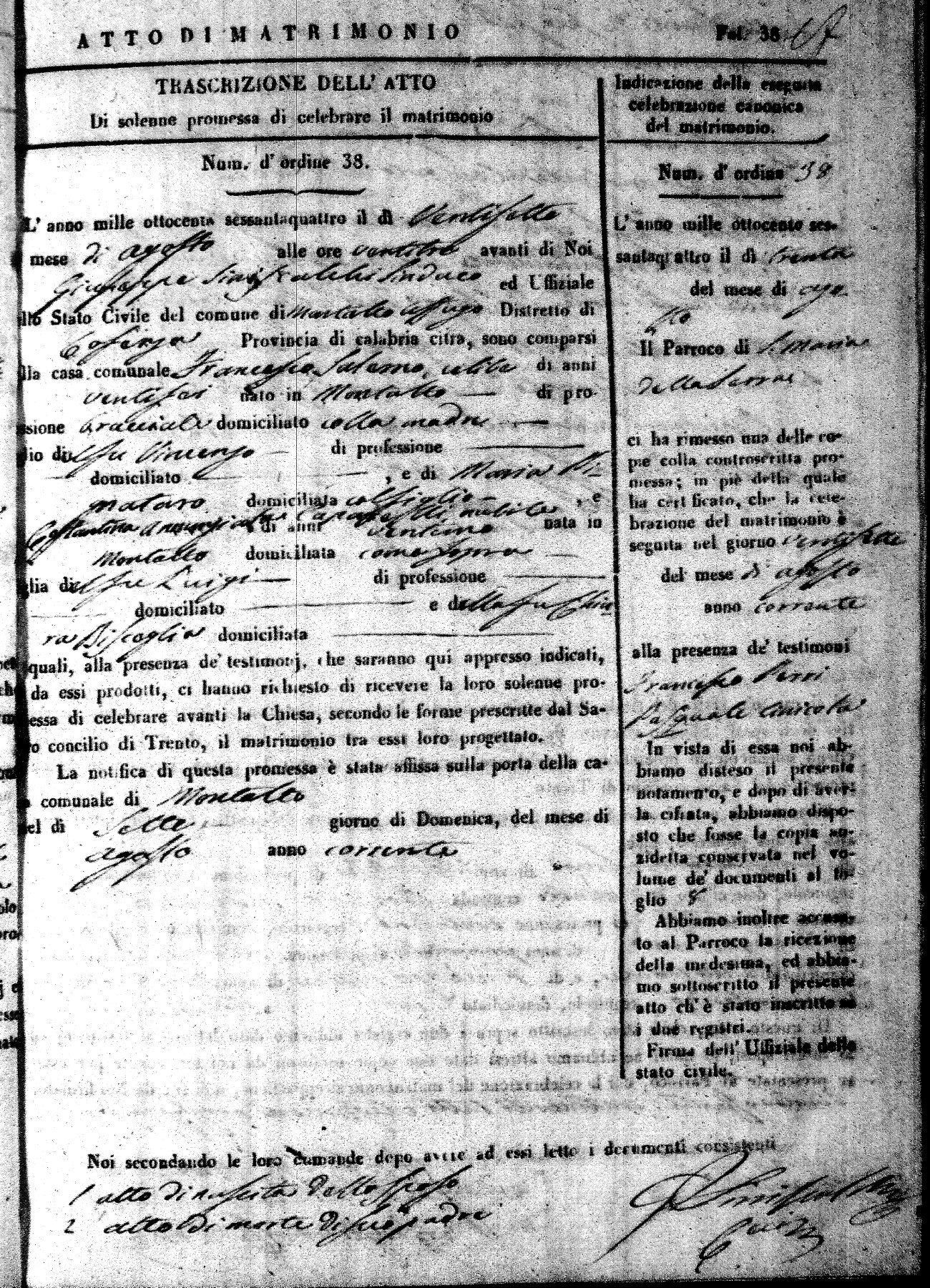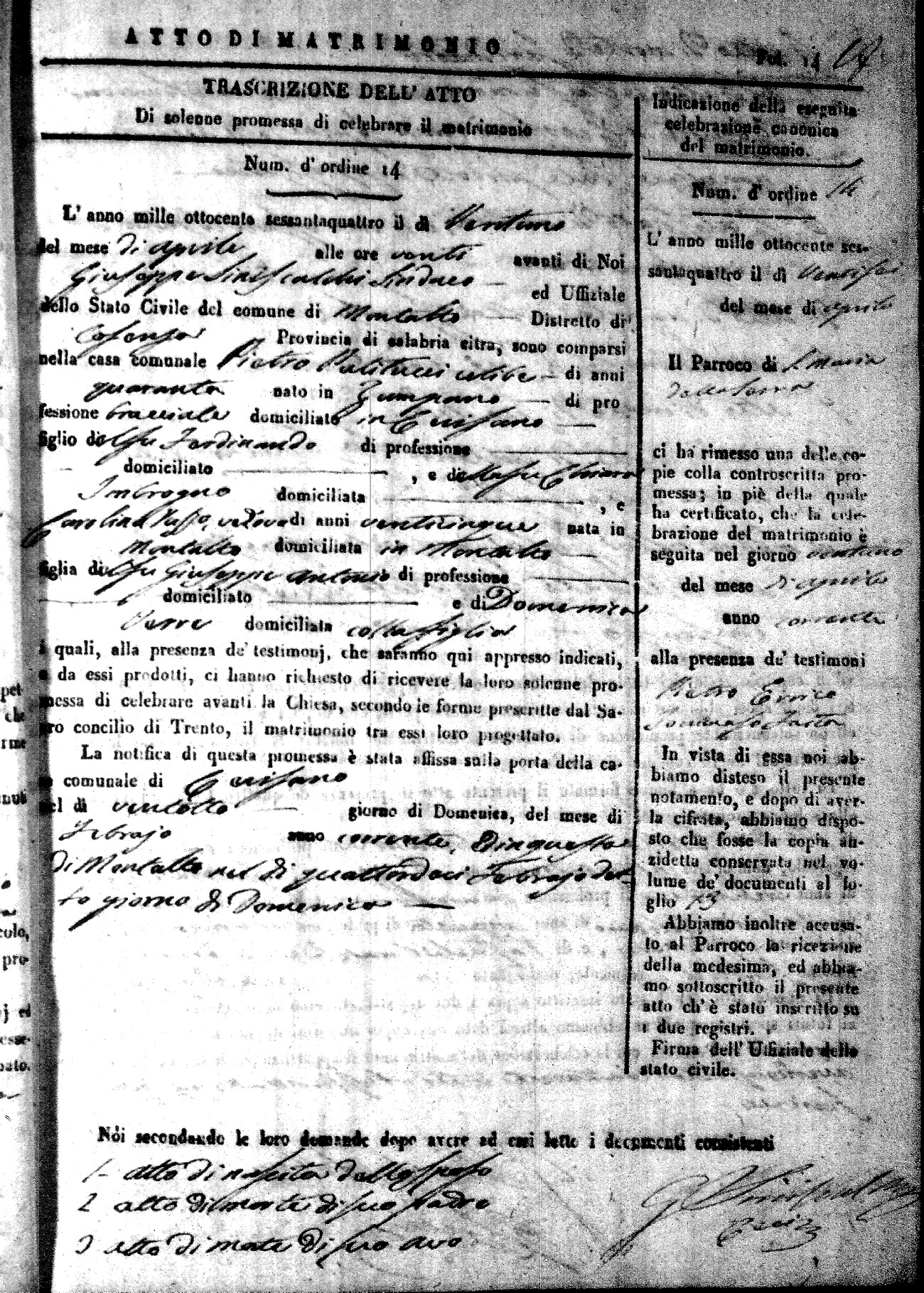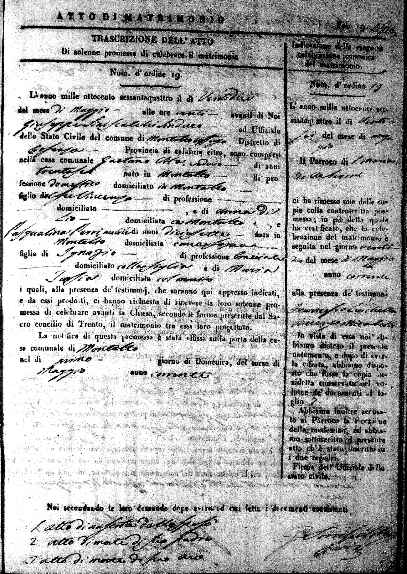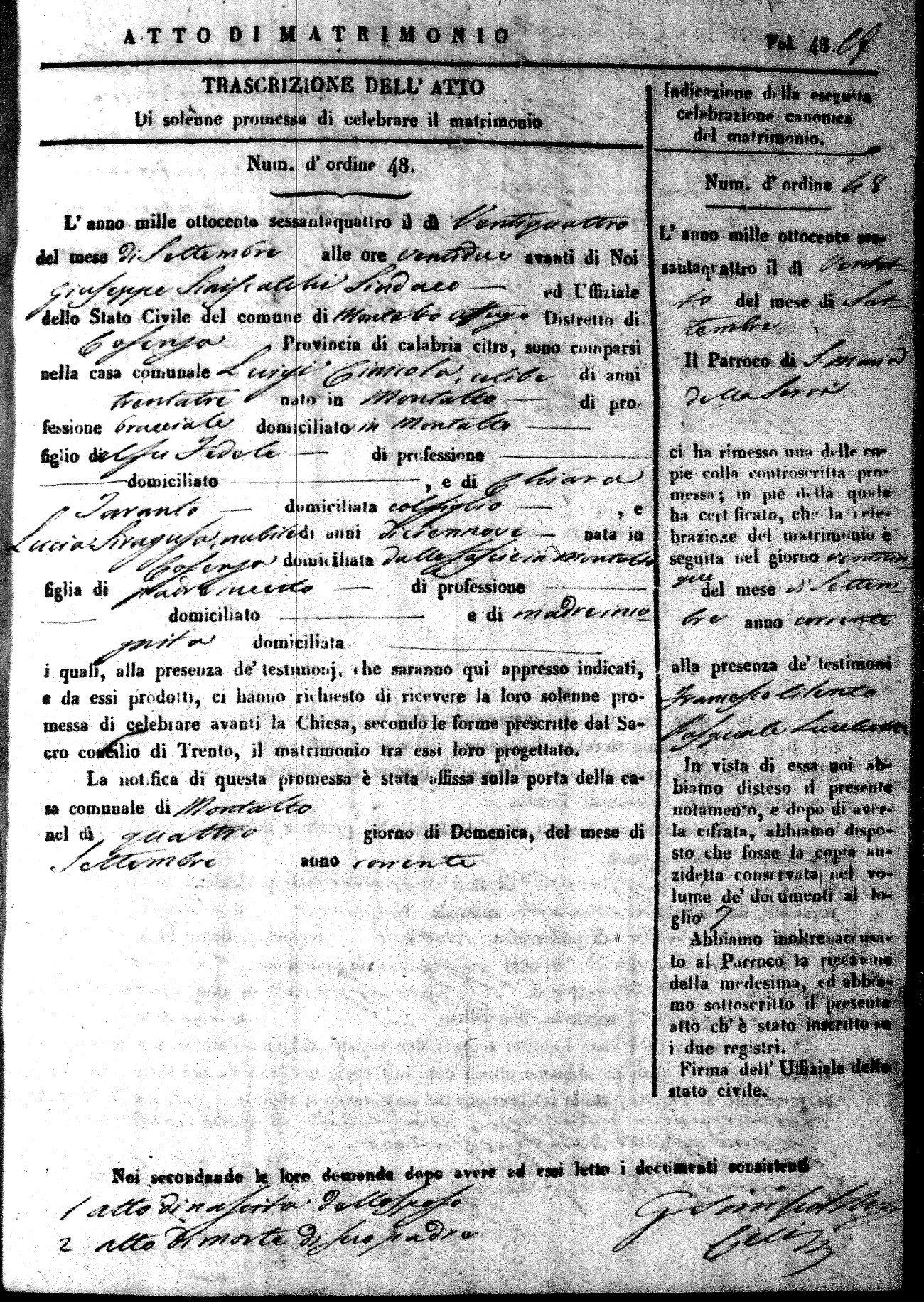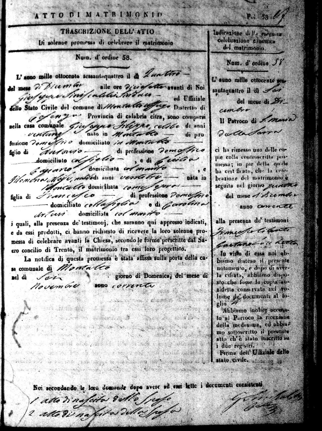 Here are the extractions for all the marriage acts in 1864 for Montalto Uffugo. To save time we have only transcribed the names of the groom and bride. For more information, click on the groom's surname to view a copy of the original document.