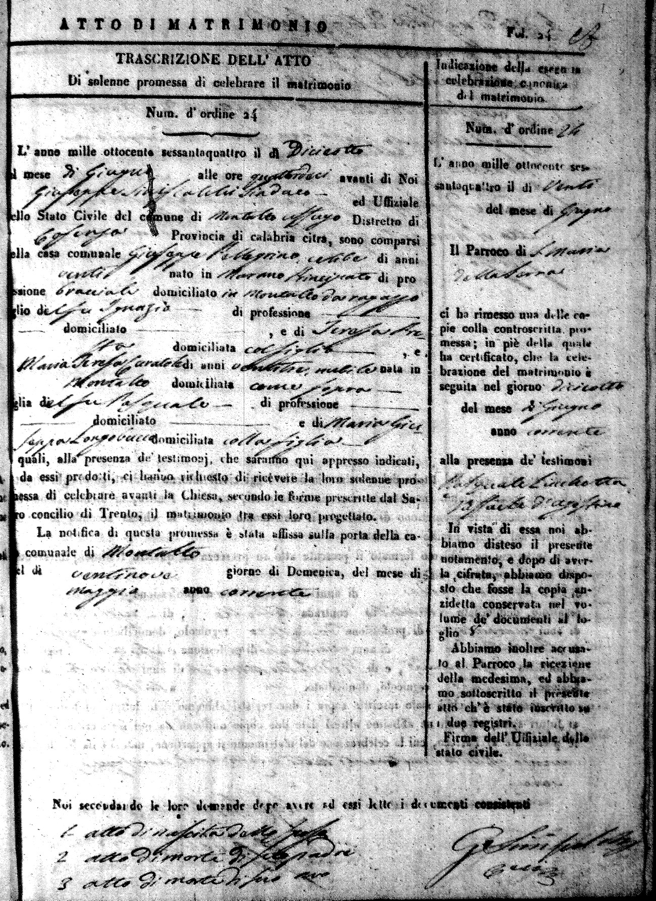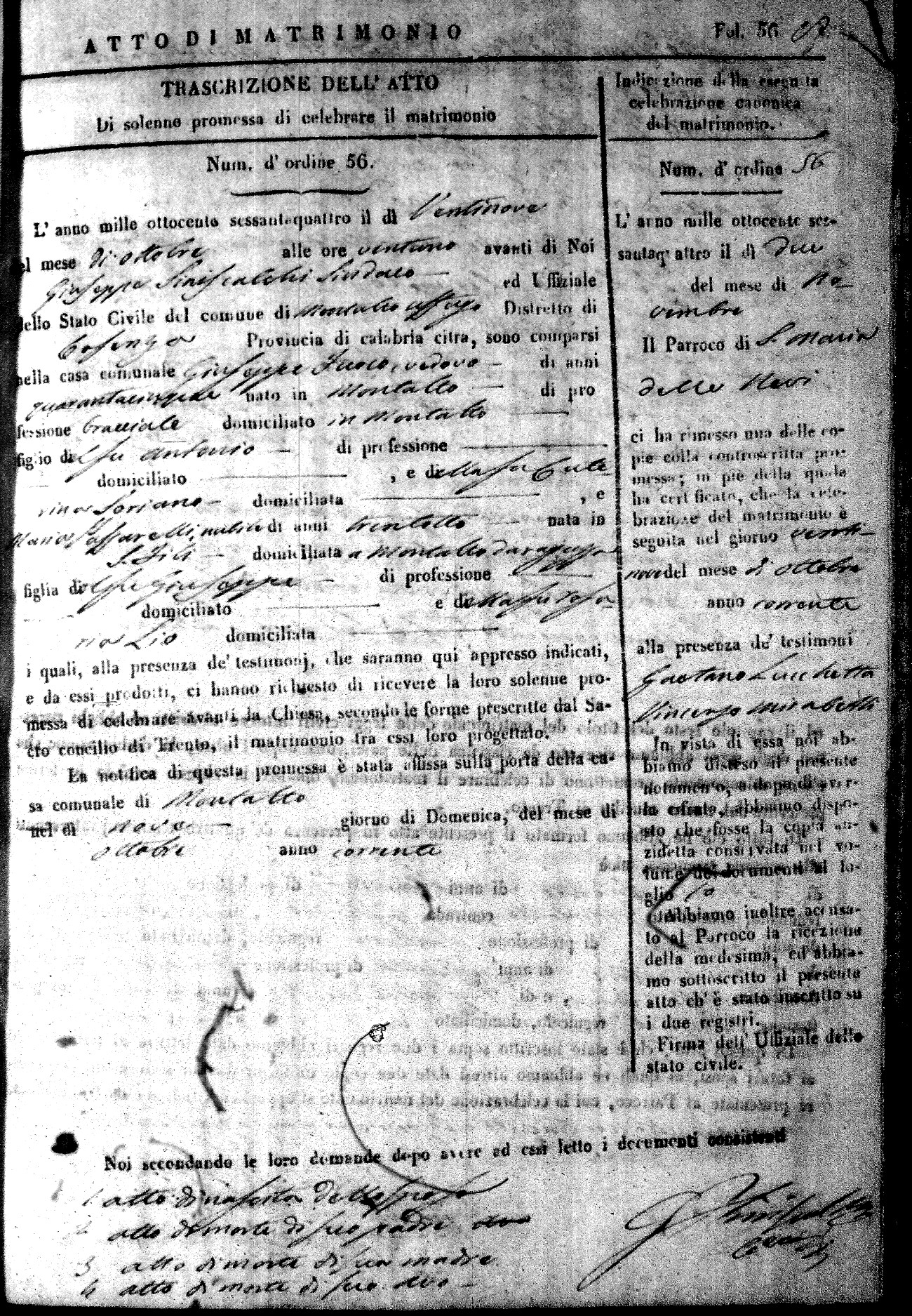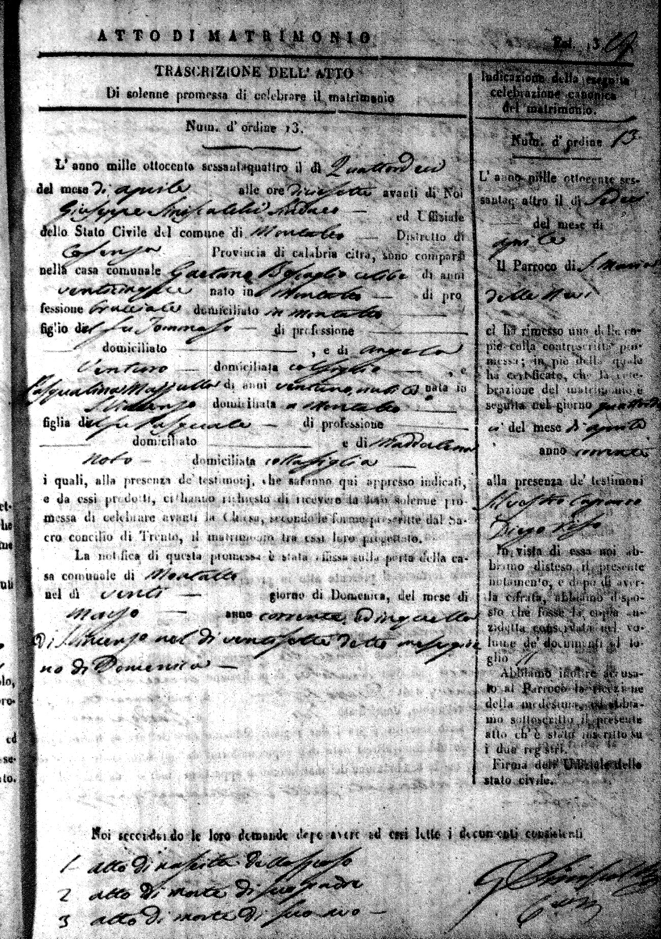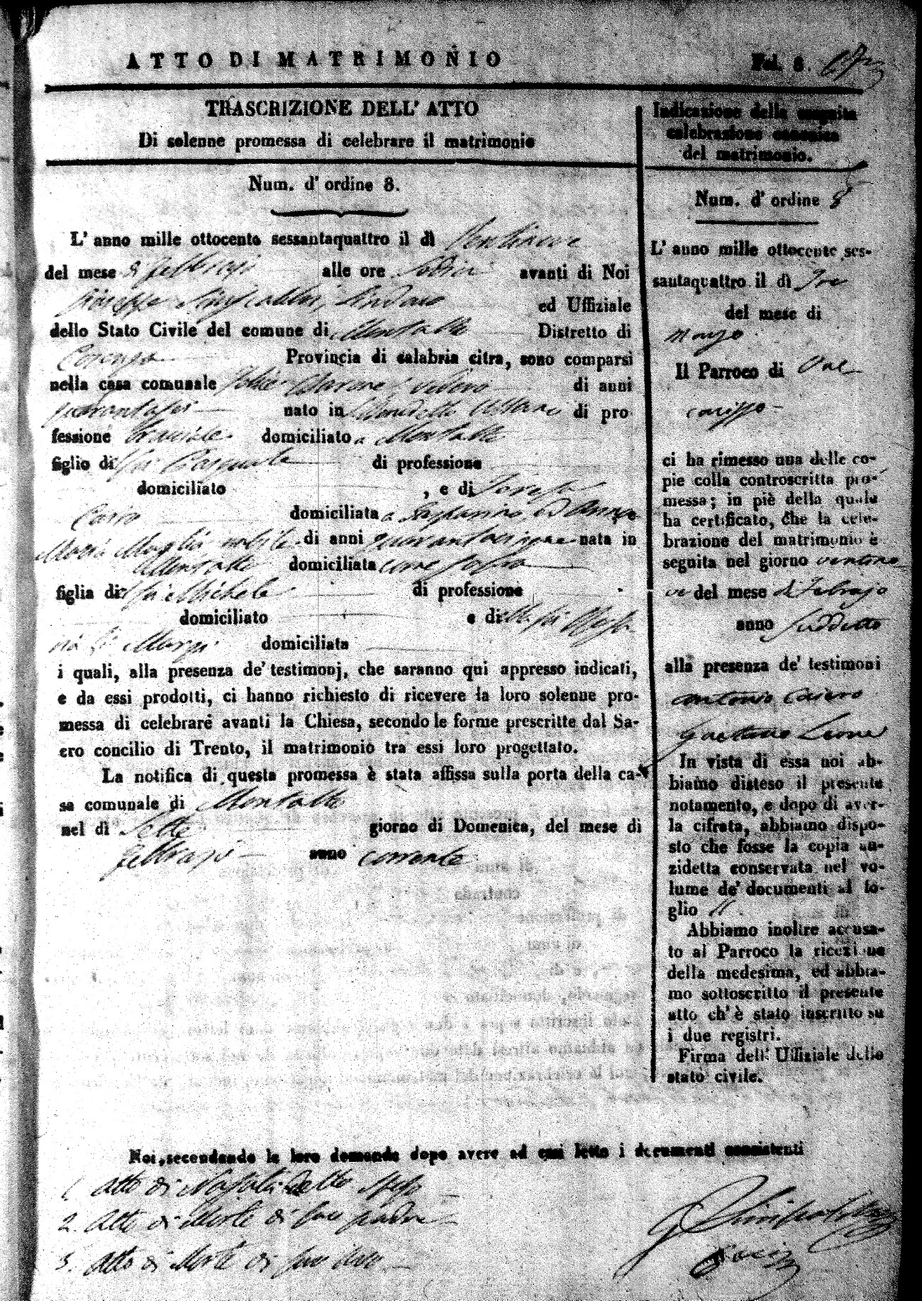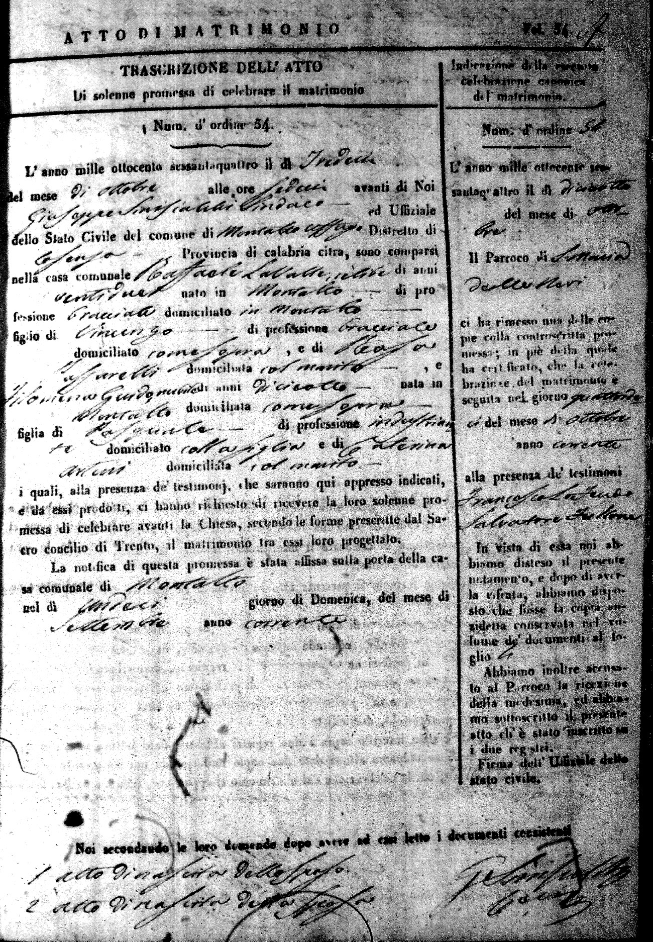 Here are the extractions for all the marriage acts in 1864 for Montalto Uffugo. To save time we have only transcribed the names of the groom and bride. For more information, click on the groom's surname to view a copy of the original document.