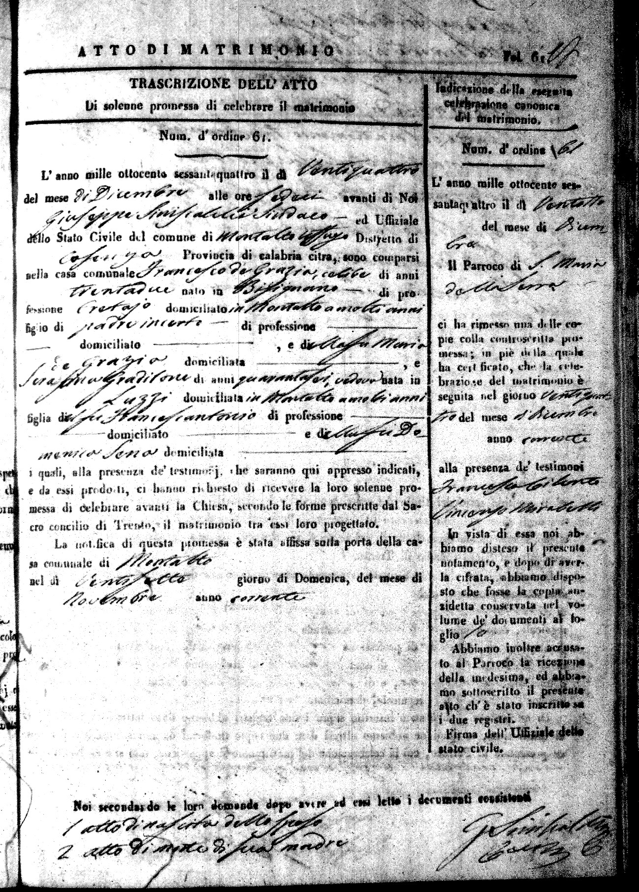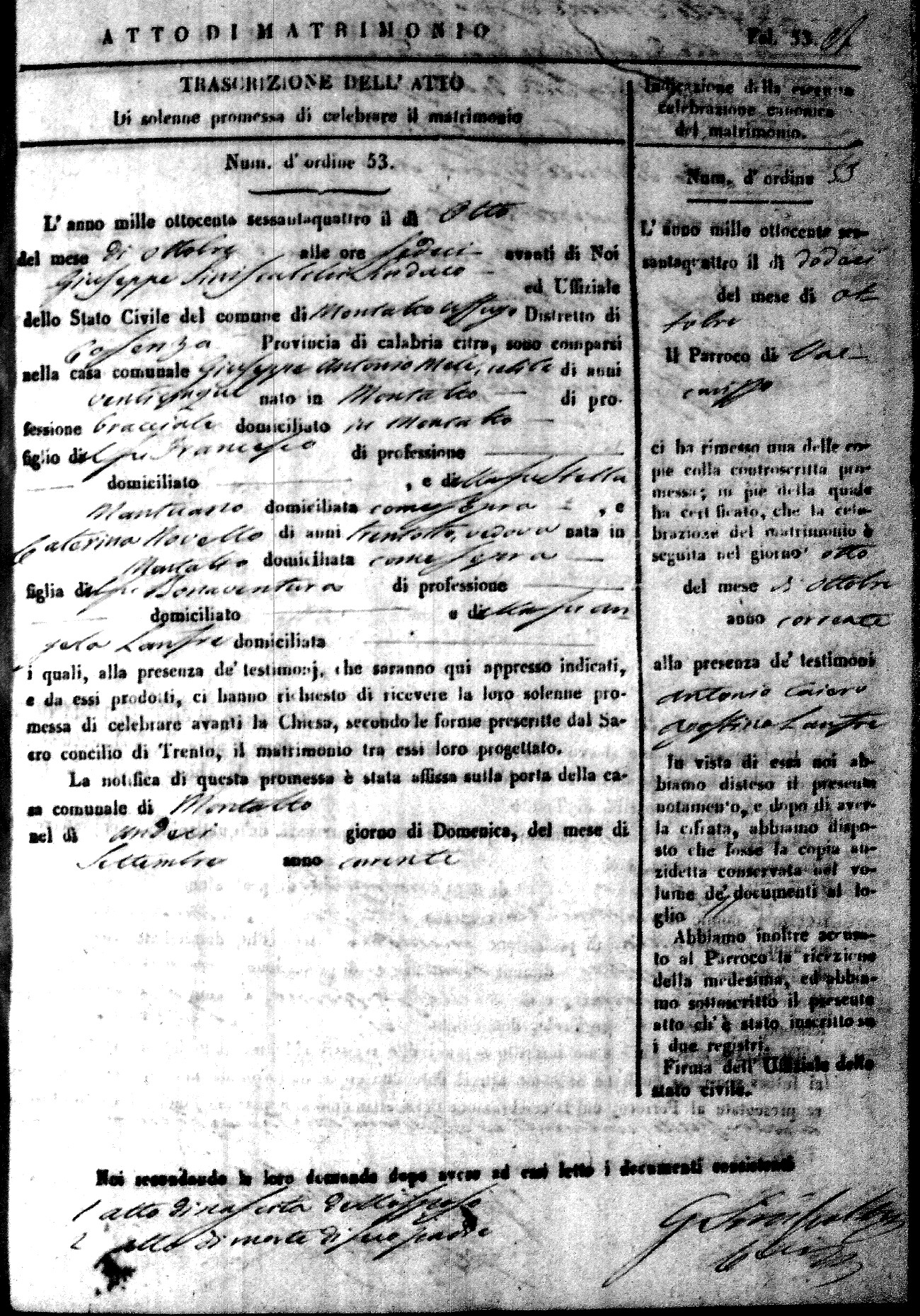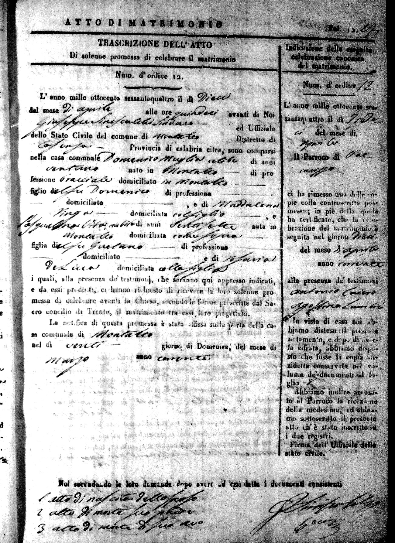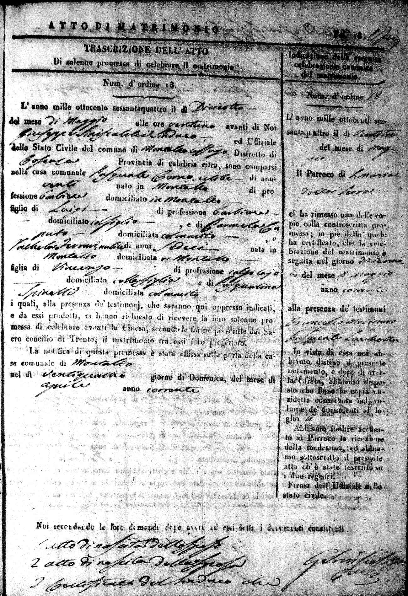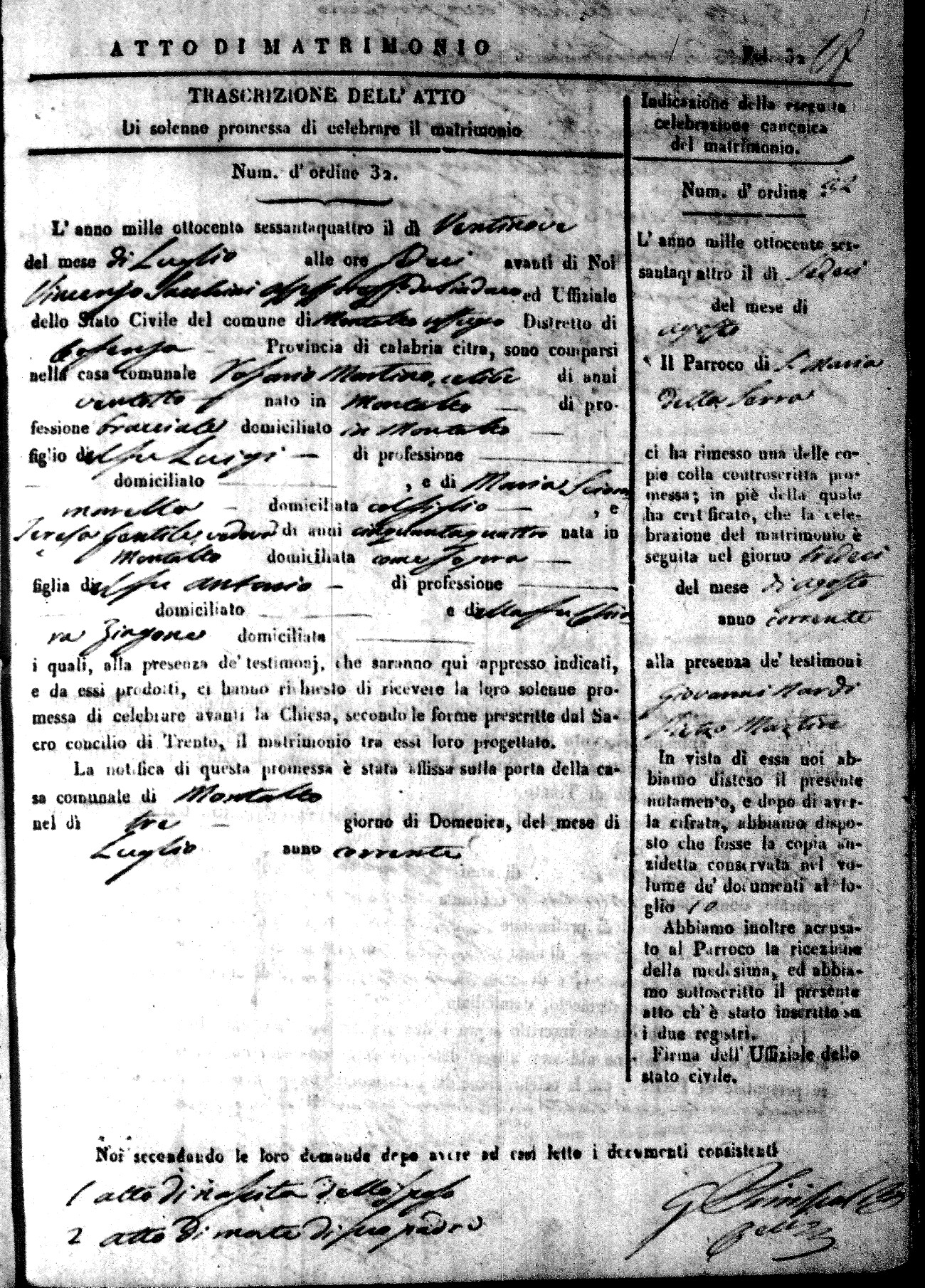 Here are the extractions for all the marriage acts in 1864 for Montalto Uffugo. To save time we have only transcribed the names of the groom and bride. For more information, click on the groom's surname to view a copy of the original document.