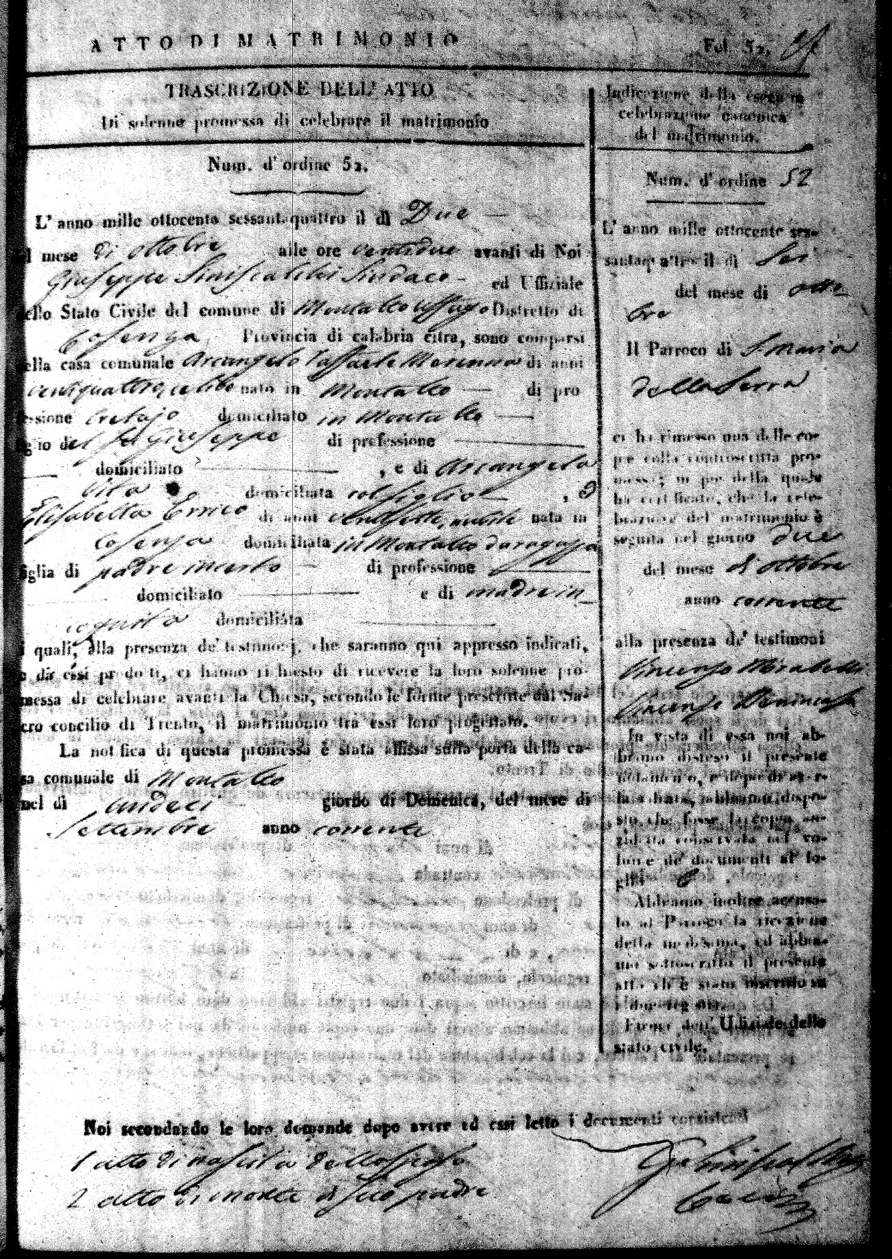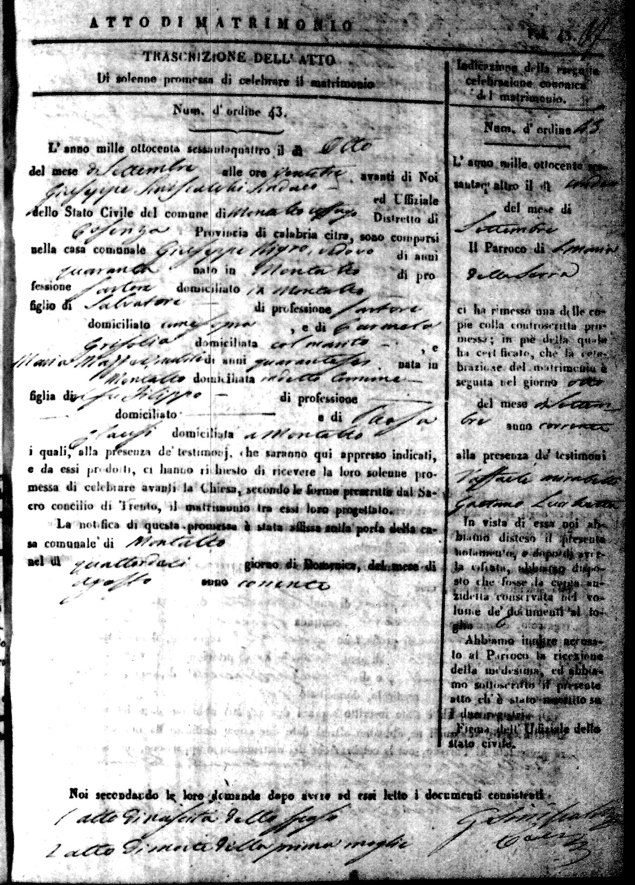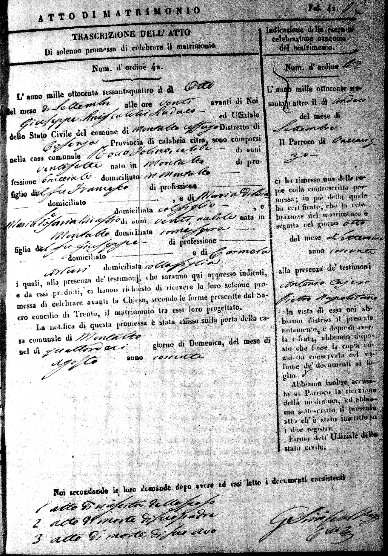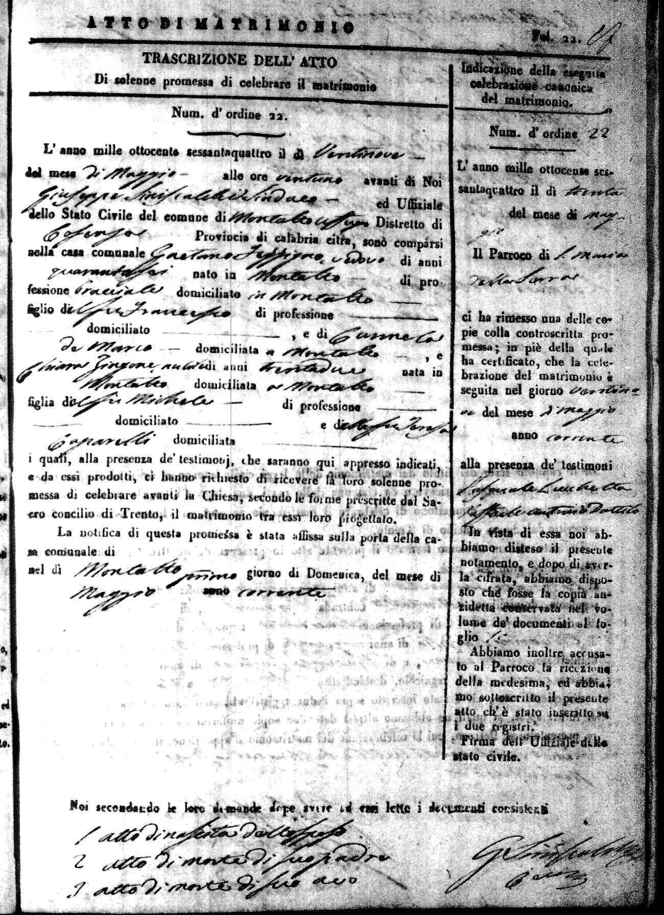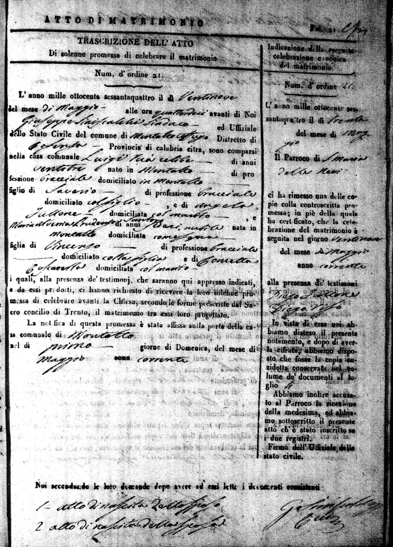 Here are the extractions for all the marriage acts in 1864 for Montalto Uffugo. To save time we have only transcribed the names of the groom and bride. For more information, click on the groom's surname to view a copy of the original document.