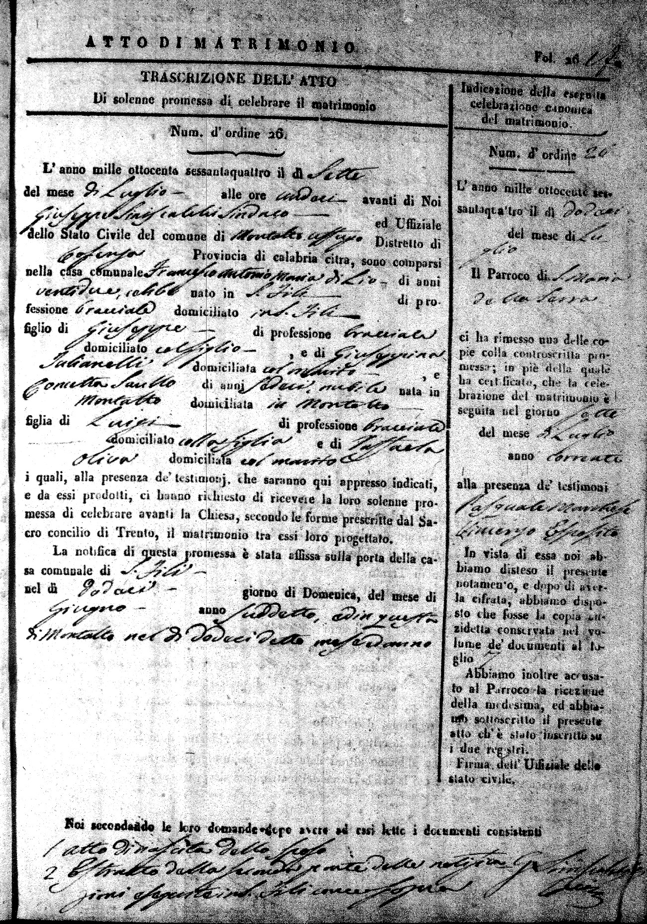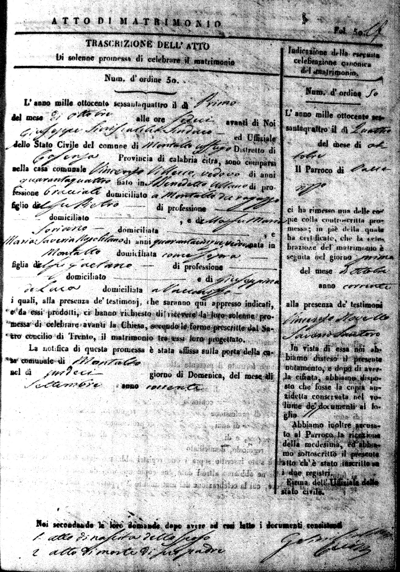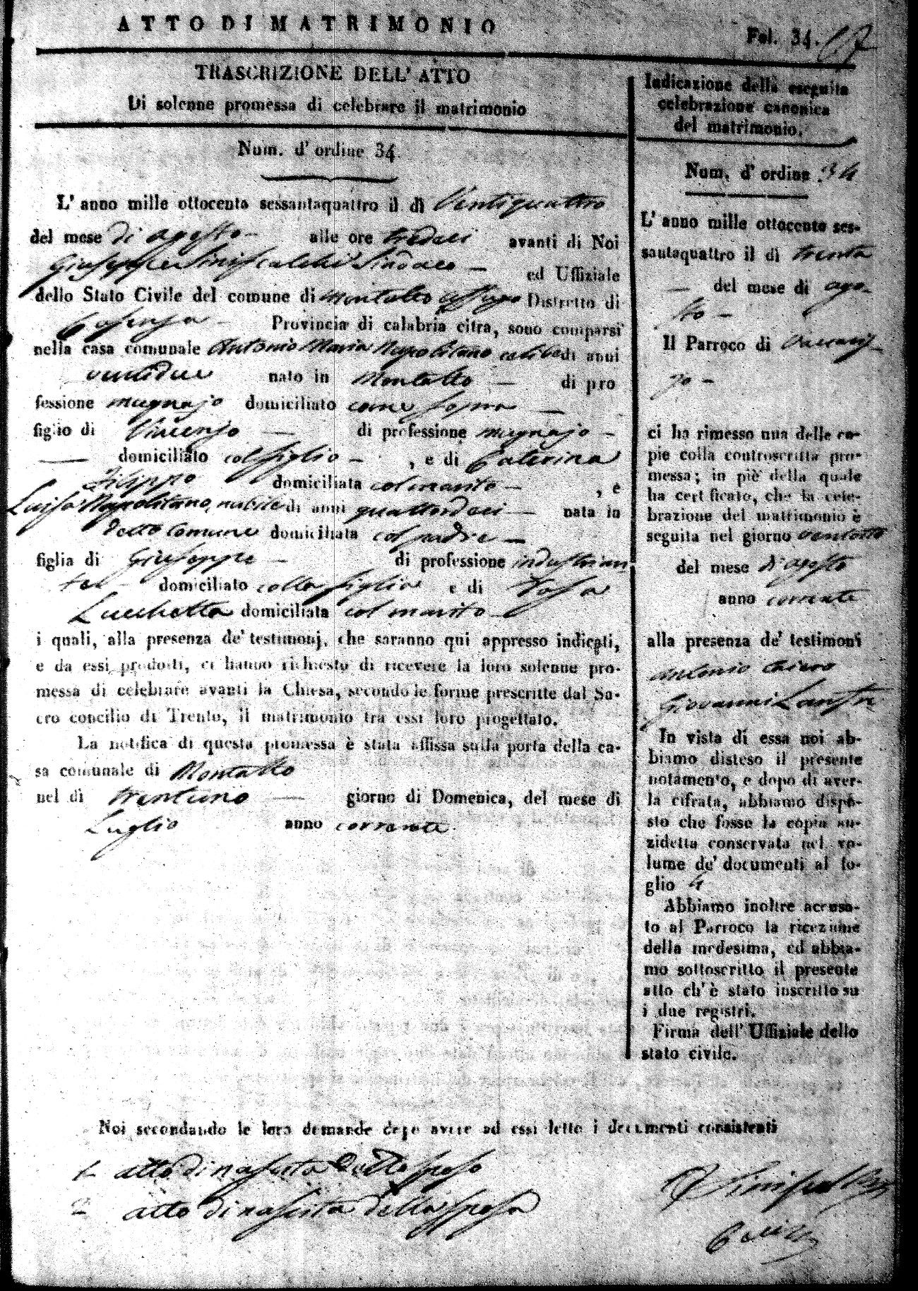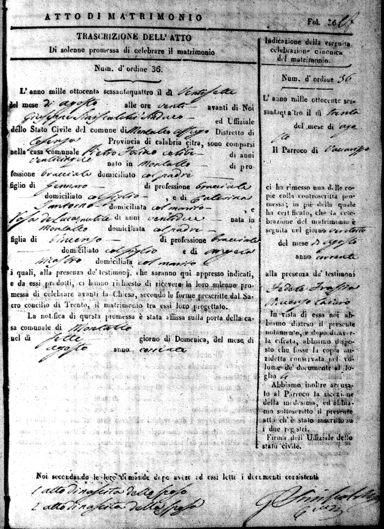 Here are the extractions for all the marriage acts in 1864 for Montalto Uffugo. To save time we have only transcribed the names of the groom and bride. For more information, click on the groom's surname to view a copy of the original document.