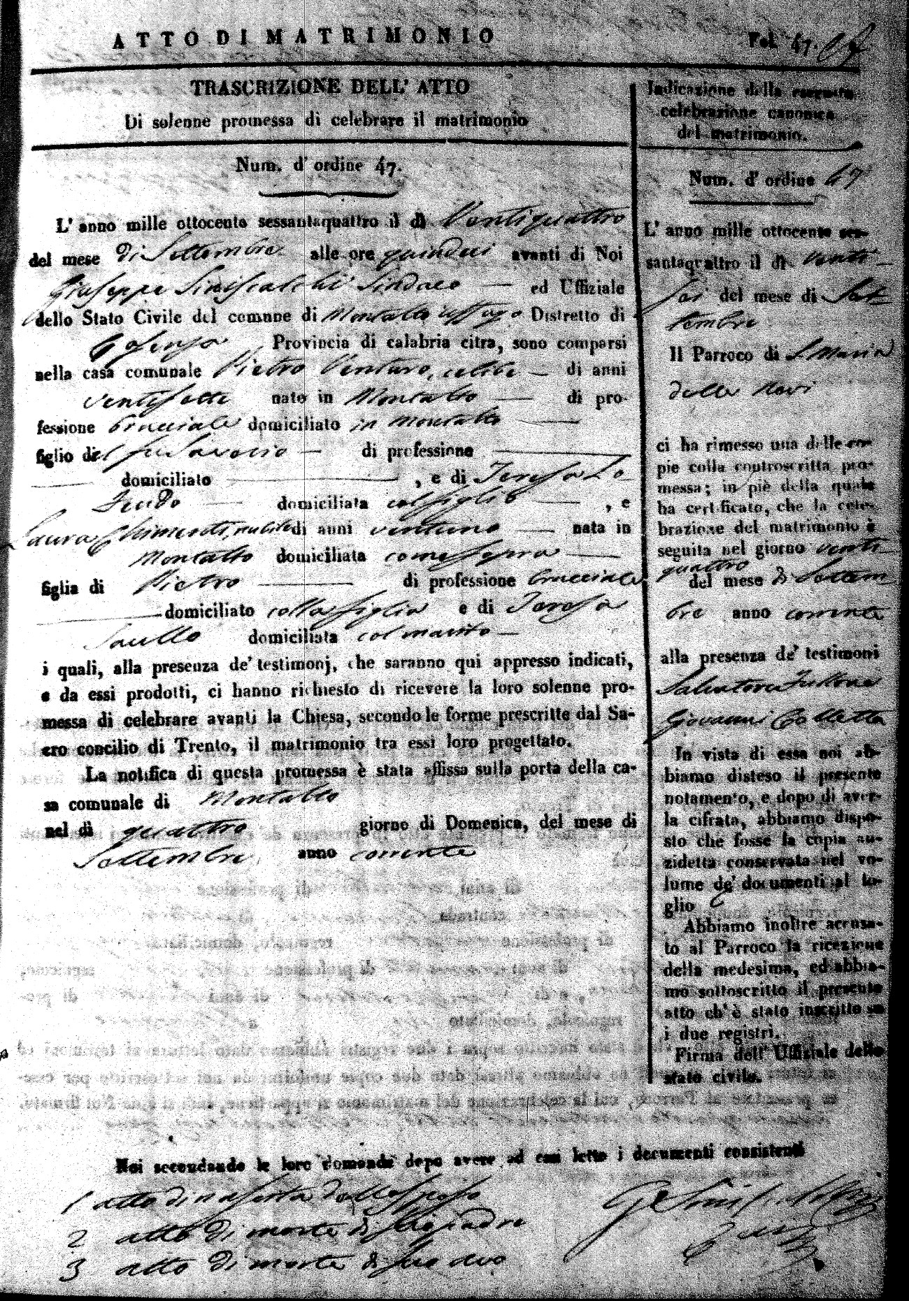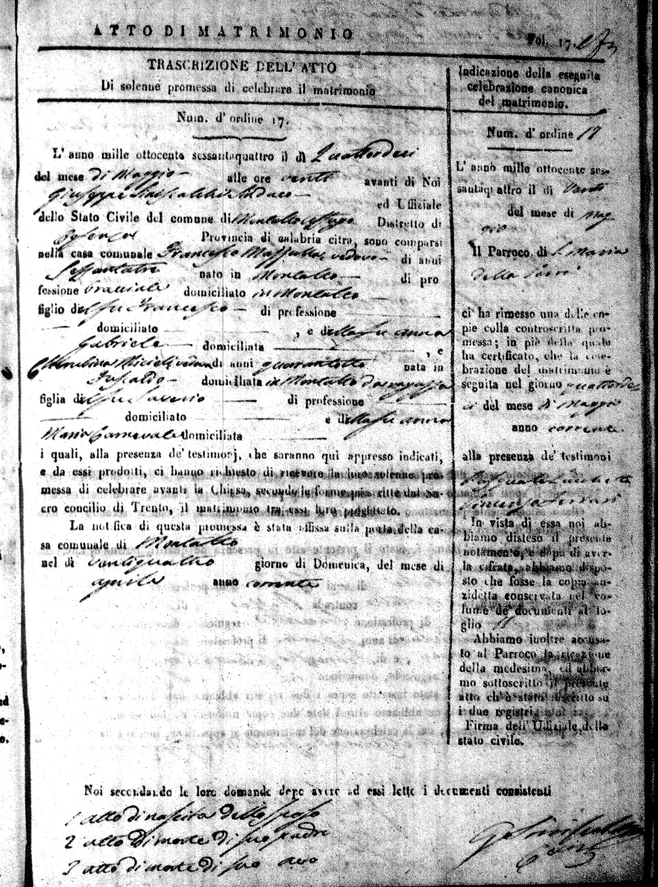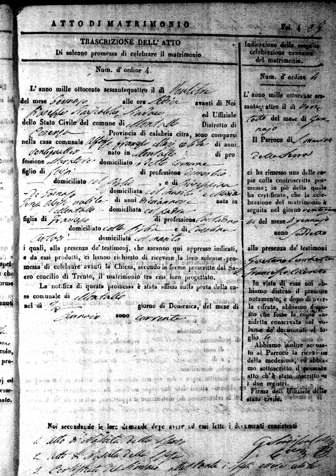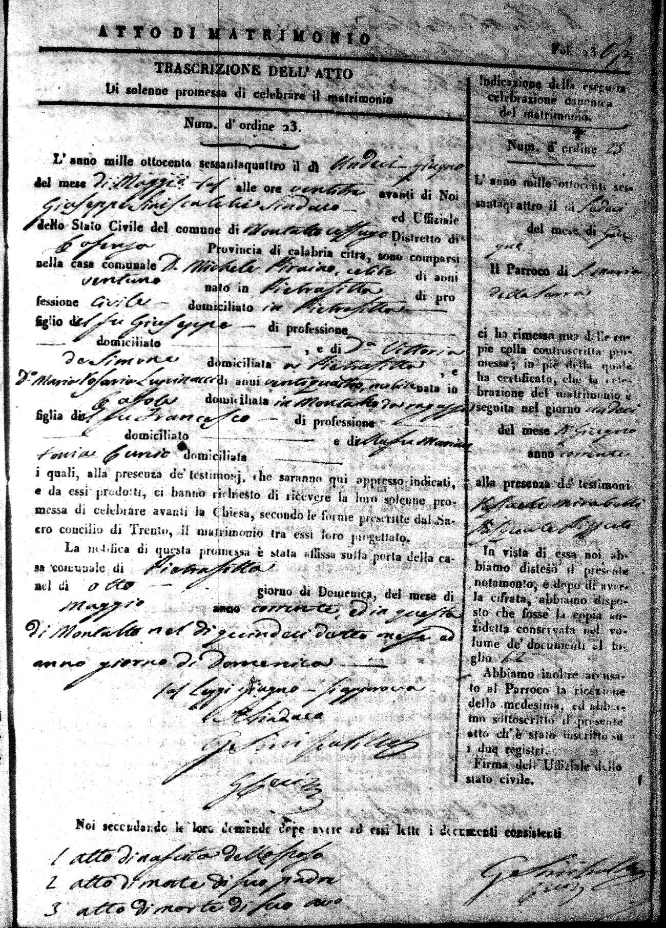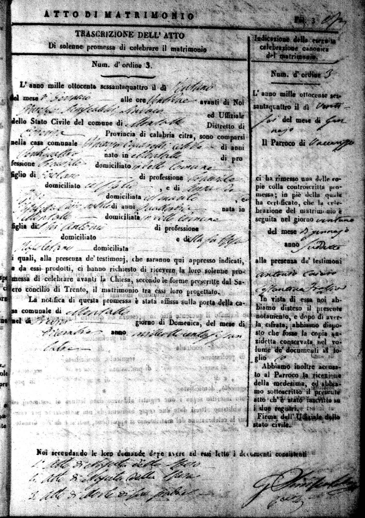 Here are the extractions for all the marriage acts in 1864 for Montalto Uffugo. To save time we have only transcribed the names of the groom and bride. For more information, click on the groom's surname to view a copy of the original document.