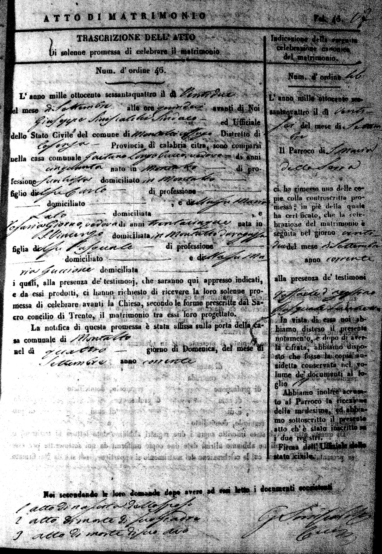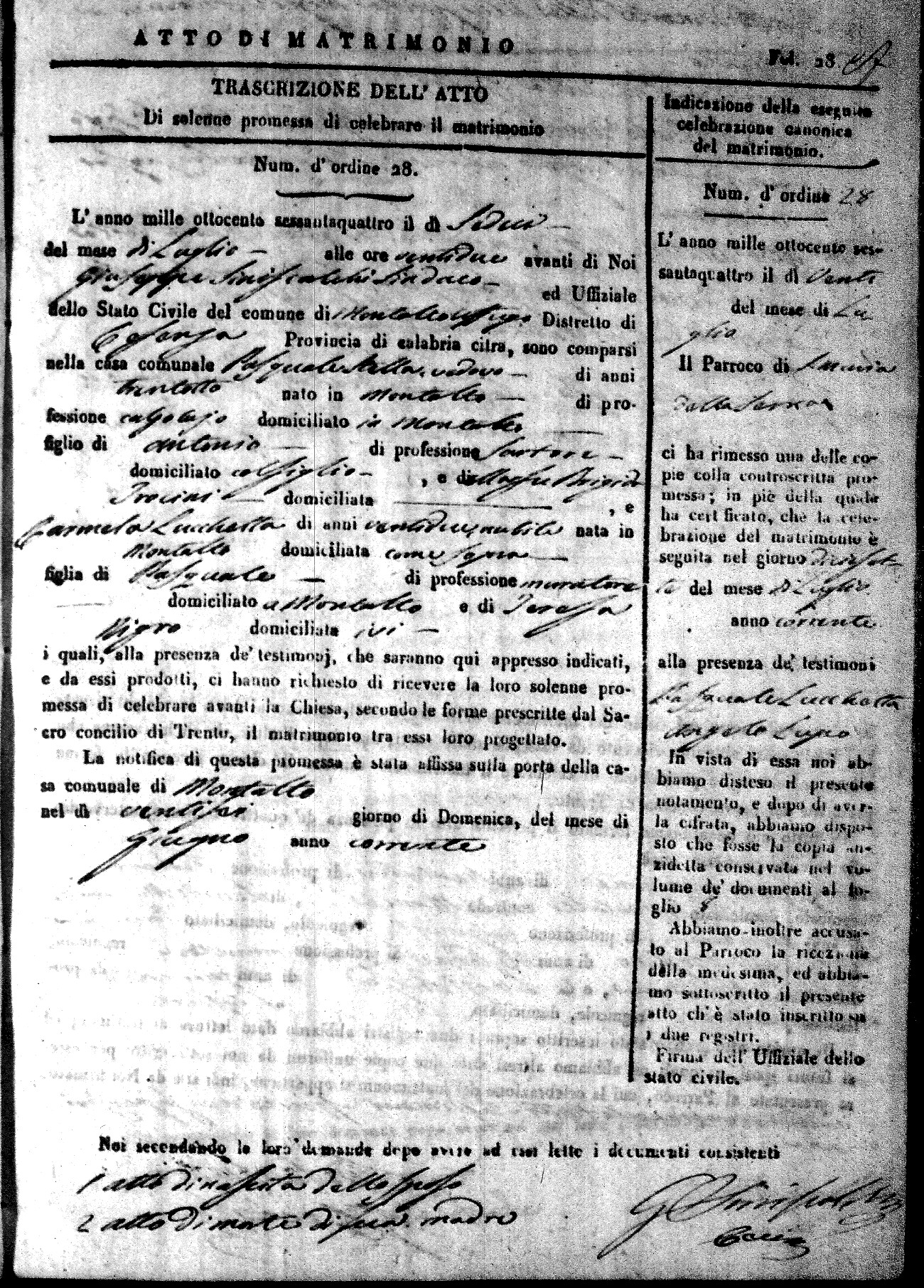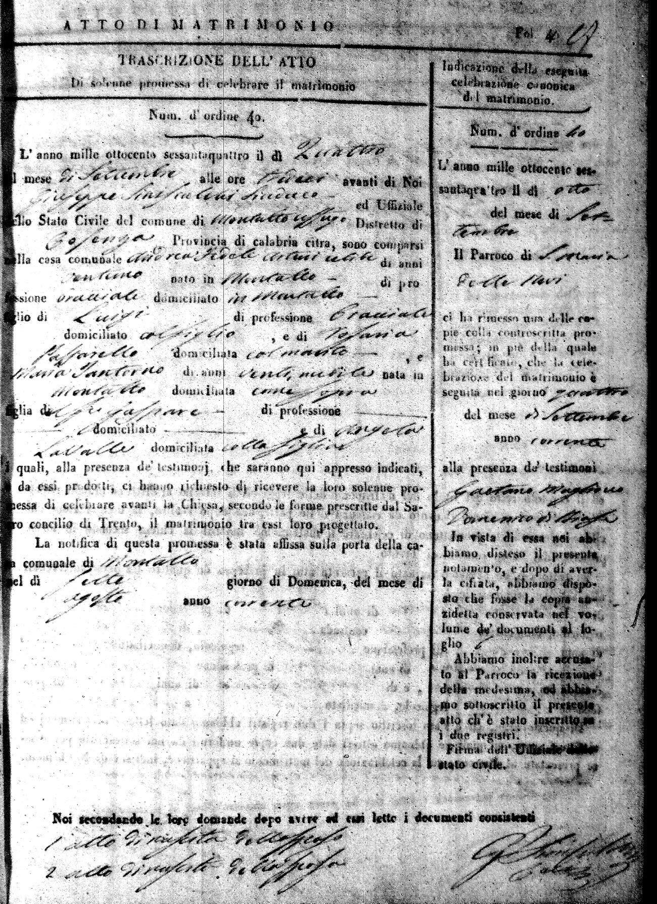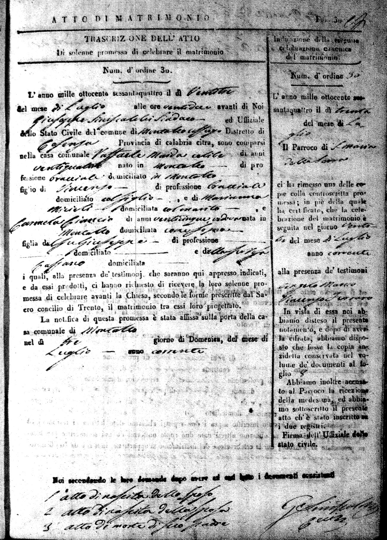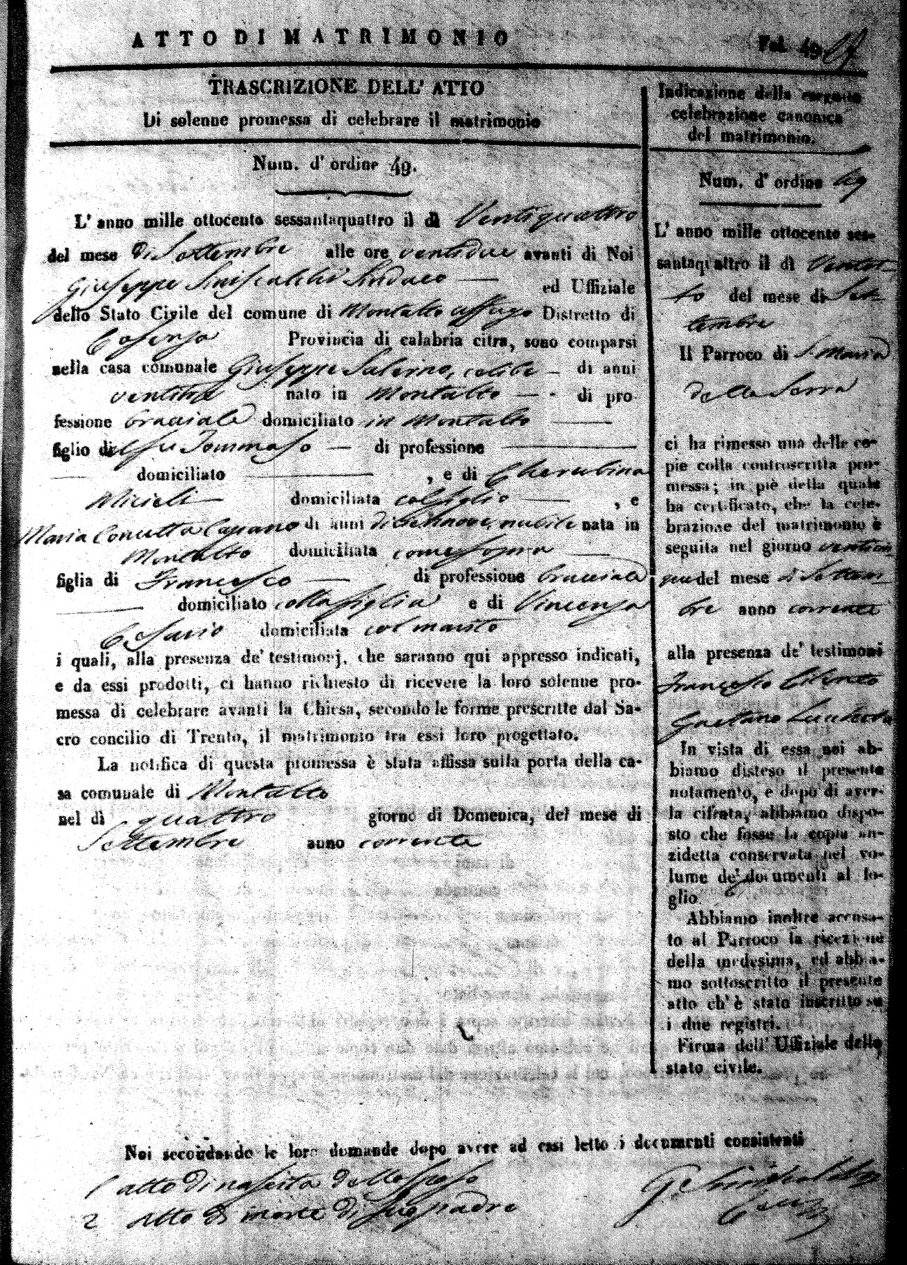 Here are the extractions for all the marriage acts in 1864 for Montalto Uffugo. To save time we have only transcribed the names of the groom and bride. For more information, click on the groom's surname to view a copy of the original document.
