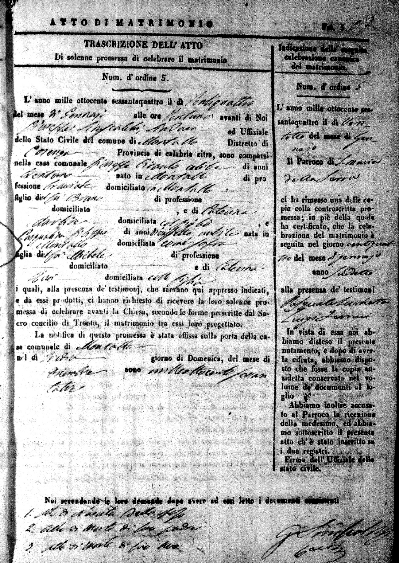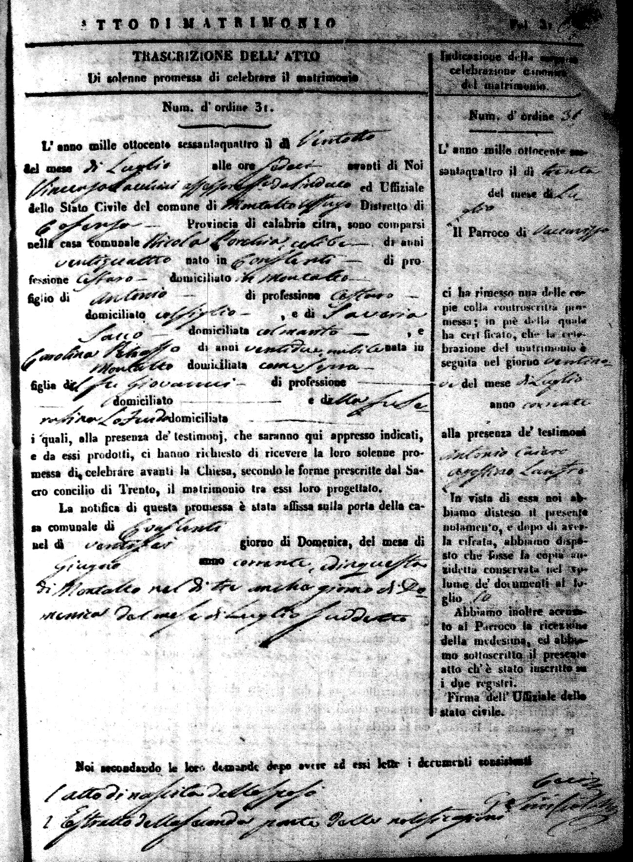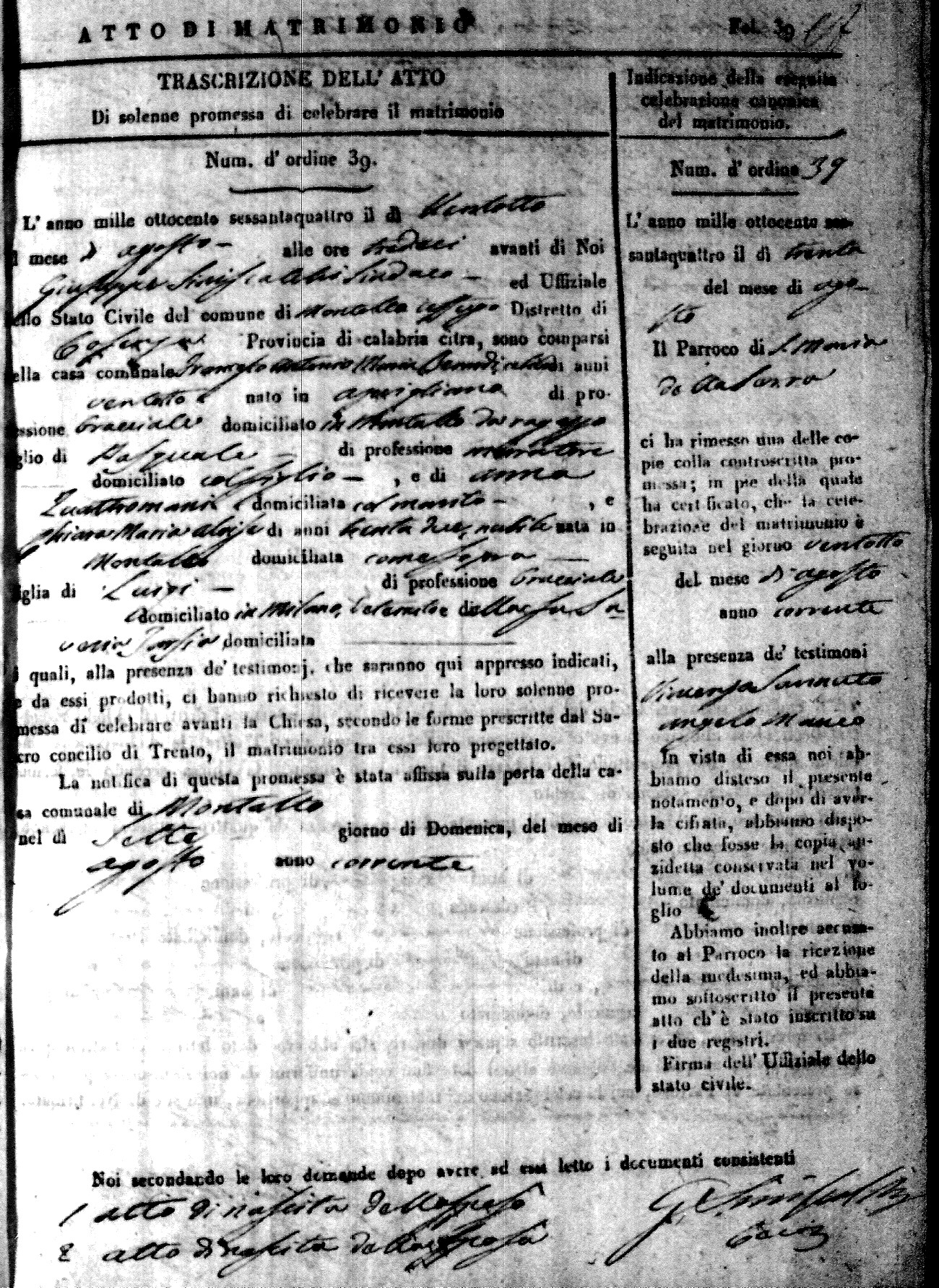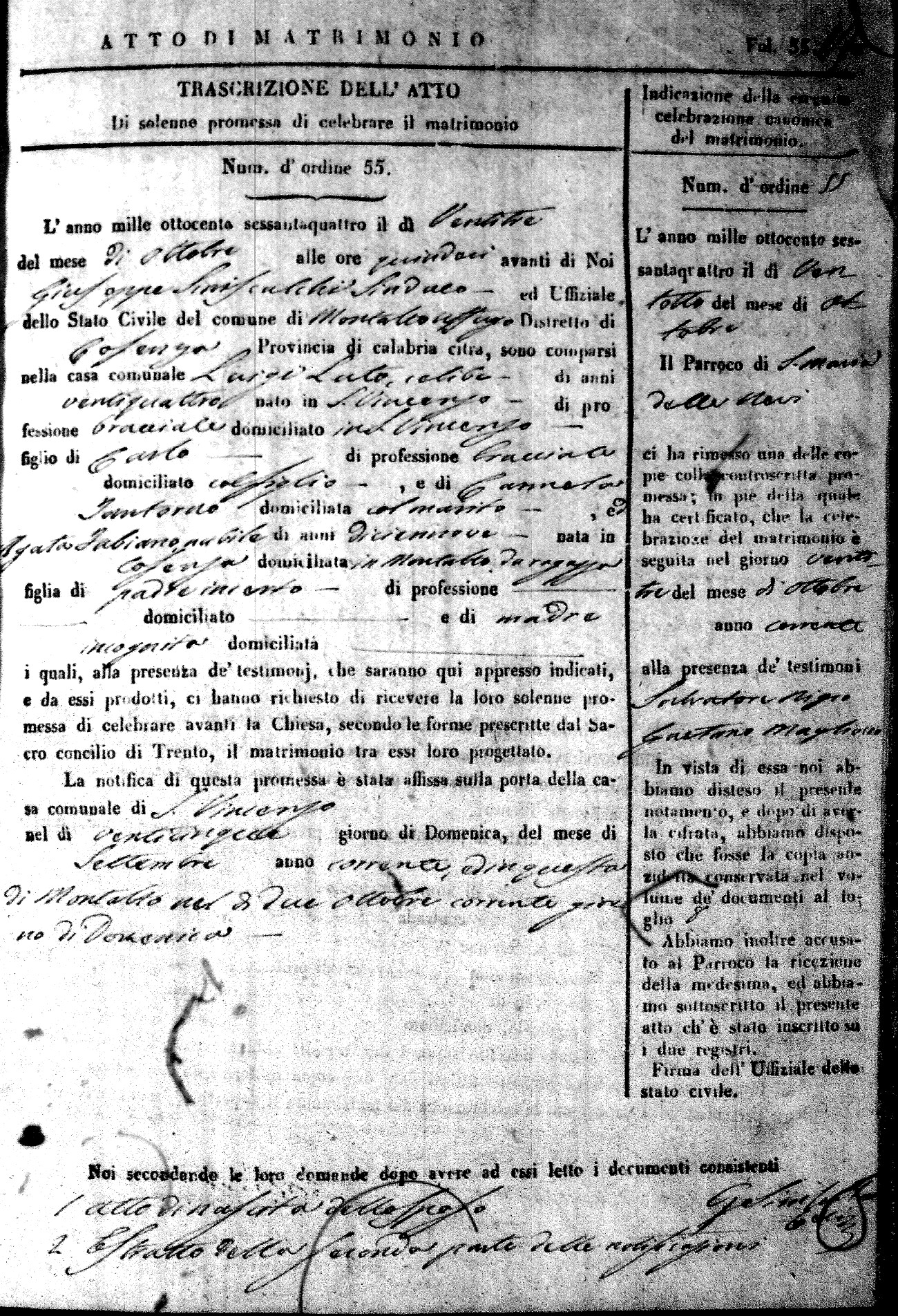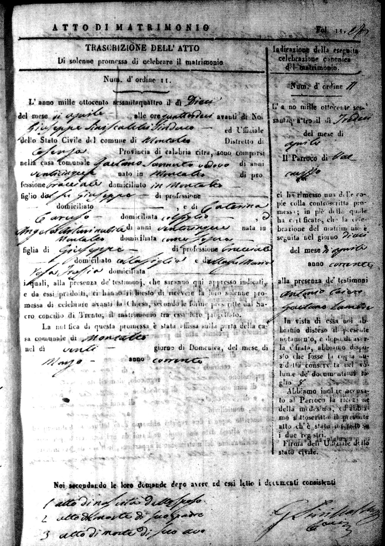 Here are the extractions for all the marriage acts in 1864 for Montalto Uffugo. To save time we have only transcribed the names of the groom and bride. For more information, click on the groom's surname to view a copy of the original document.
