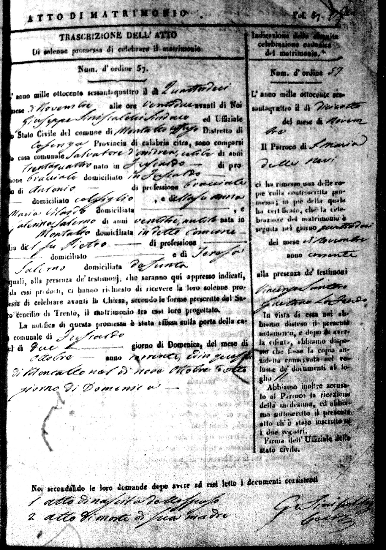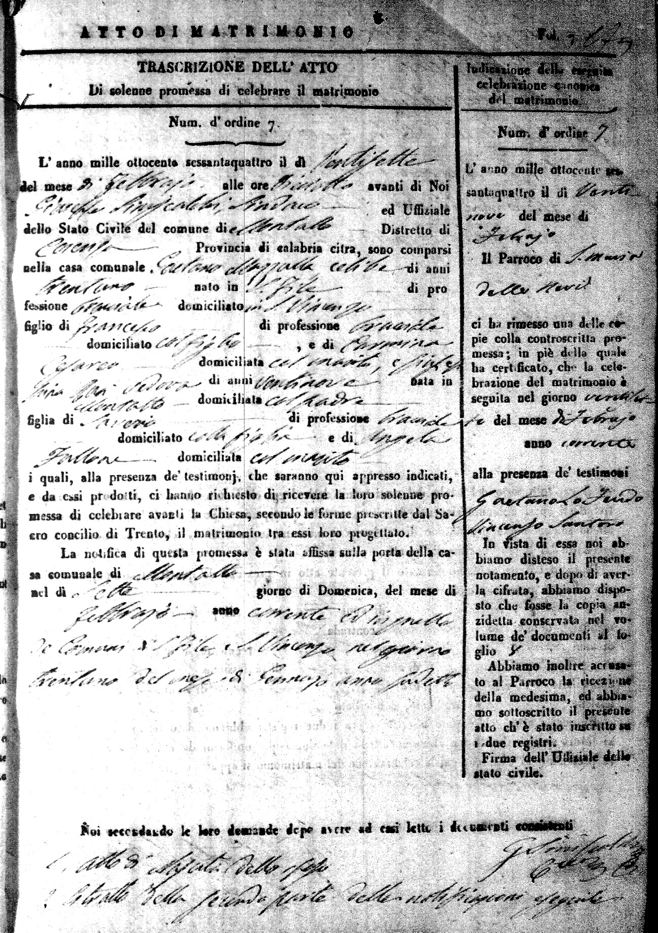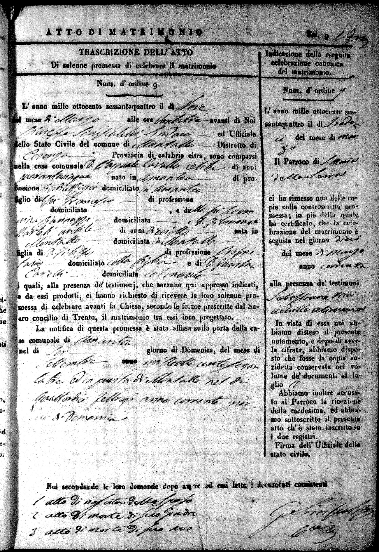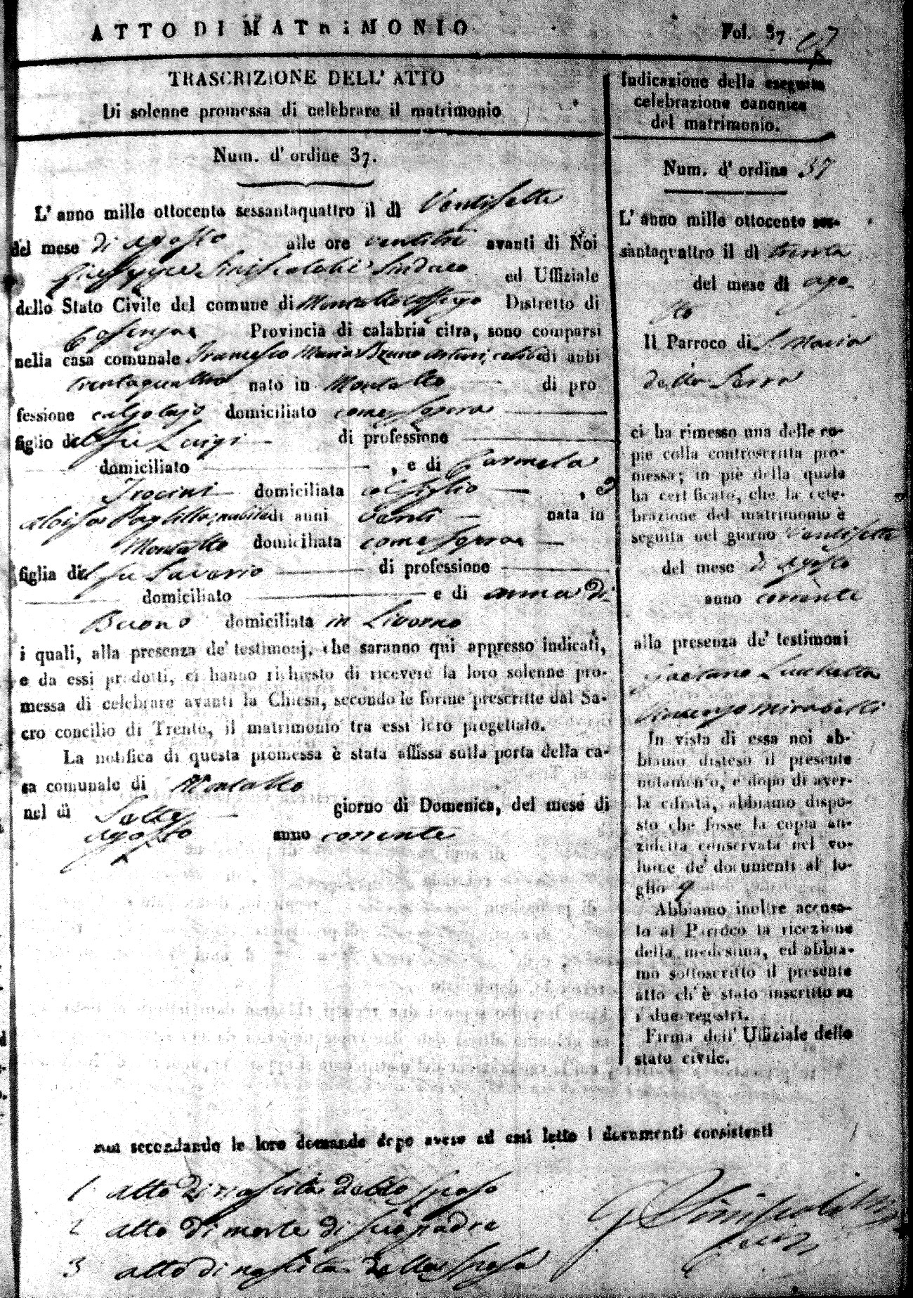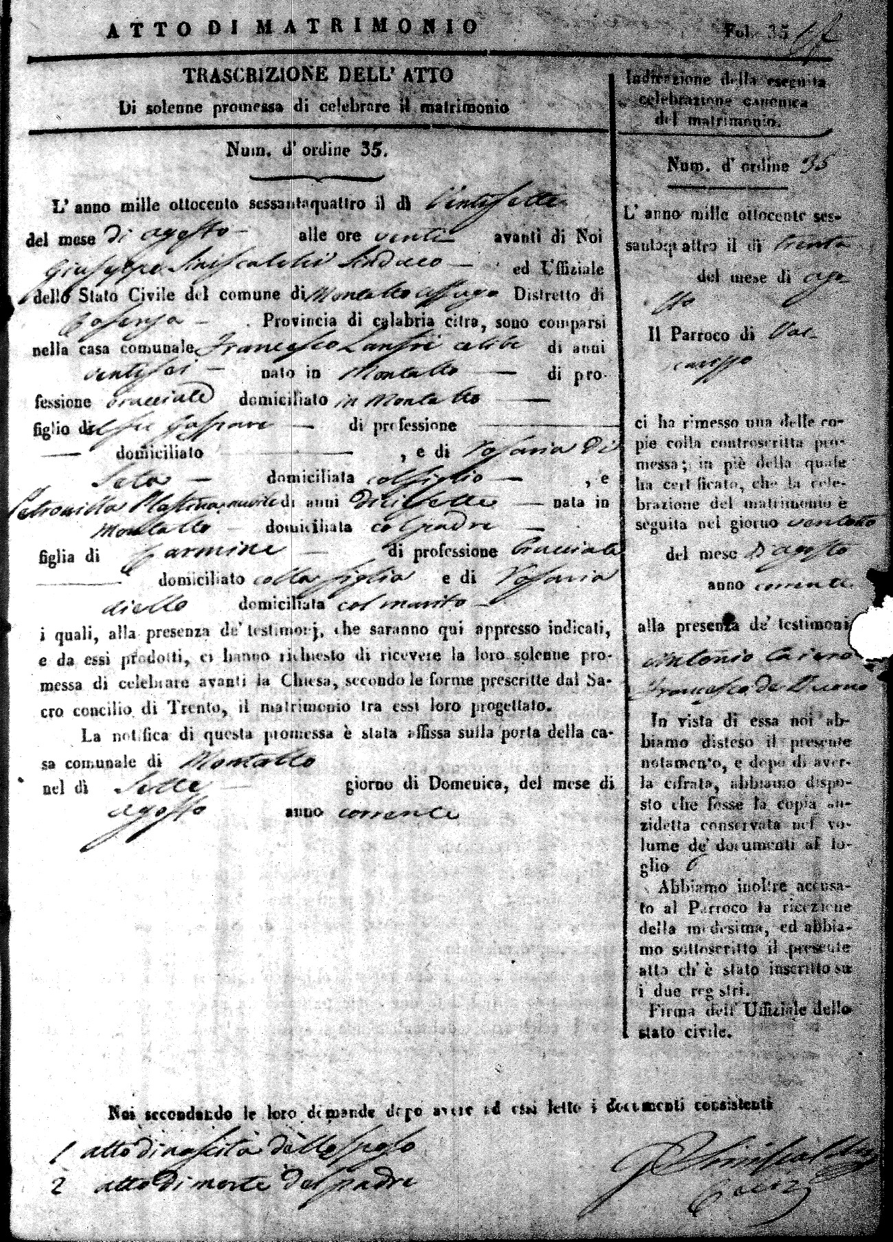 Here are the extractions for all the marriage acts in 1864 for Montalto Uffugo. To save time we have only transcribed the names of the groom and bride. For more information, click on the groom's surname to view a copy of the original document.
