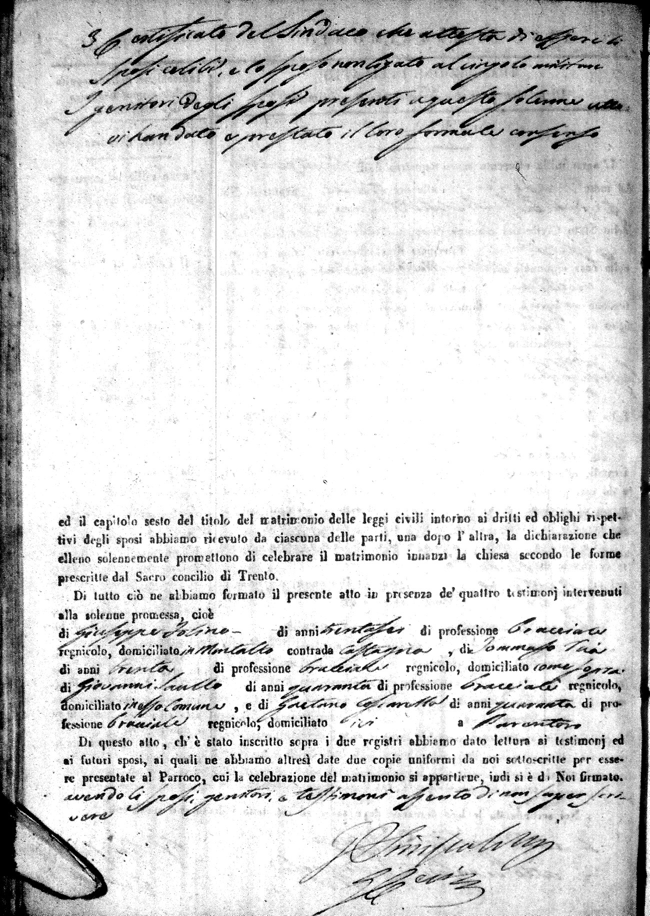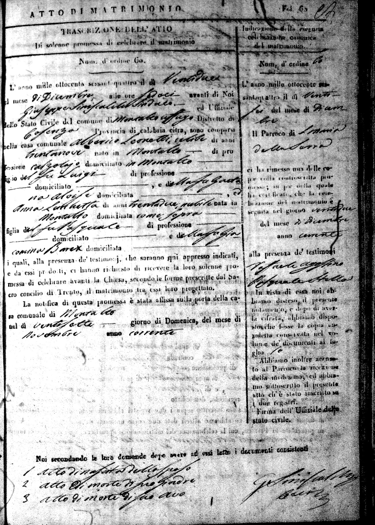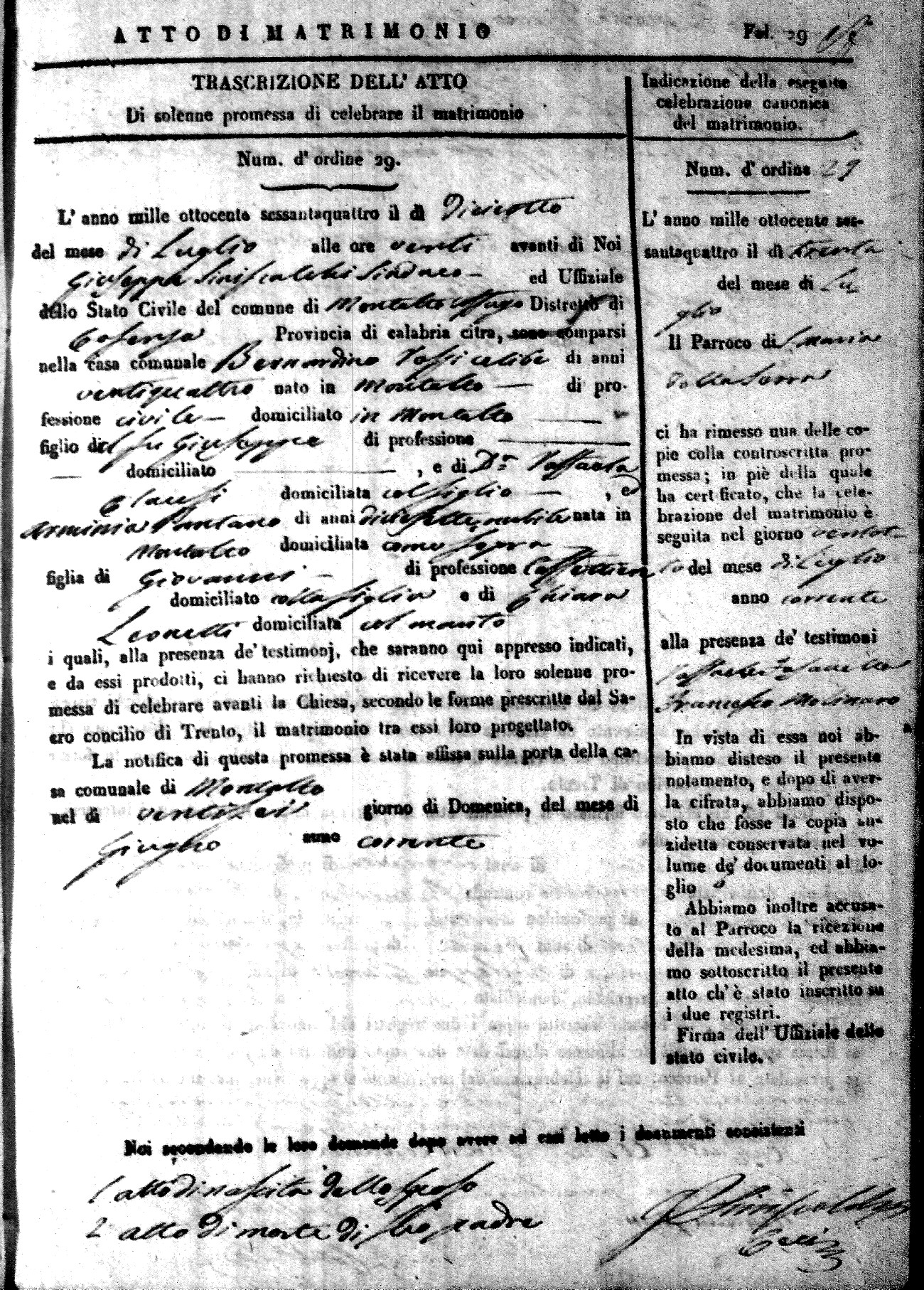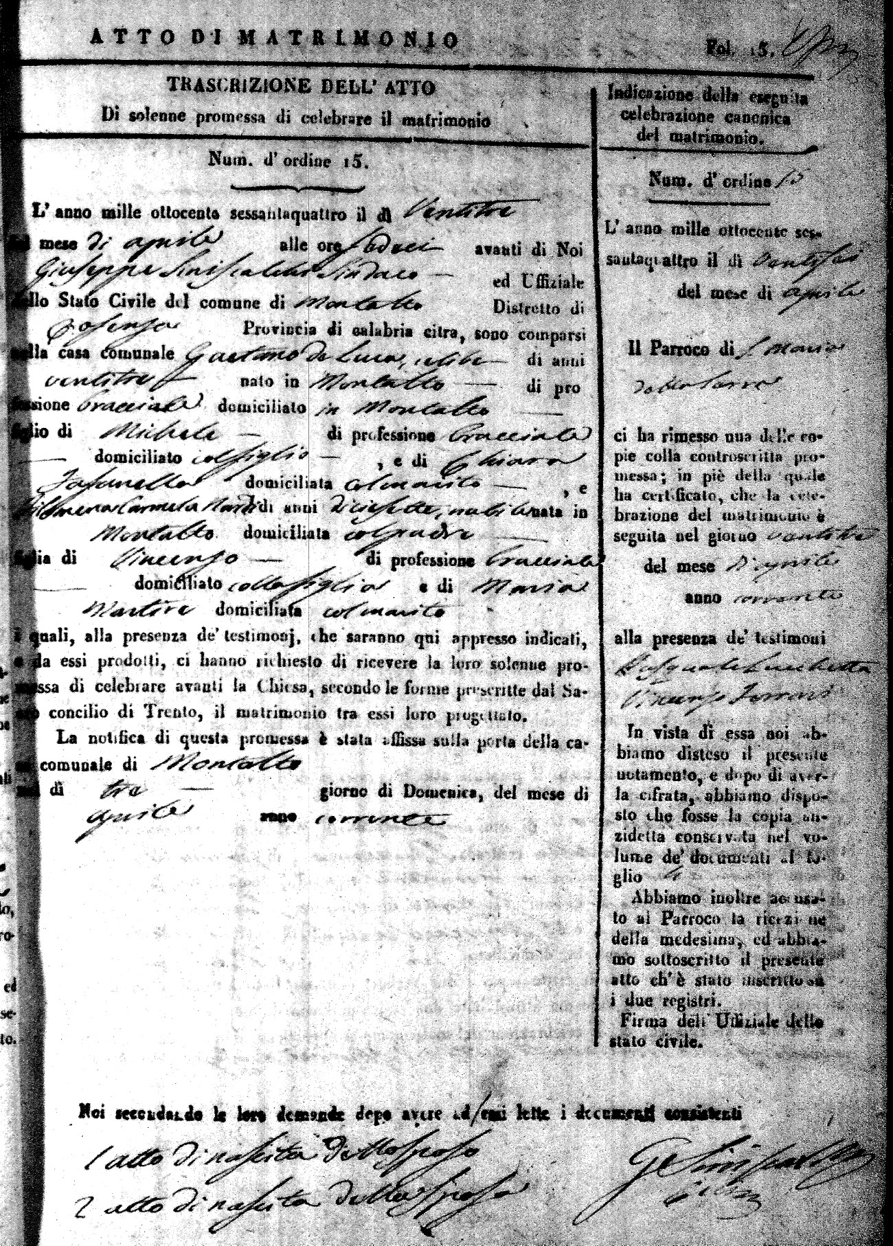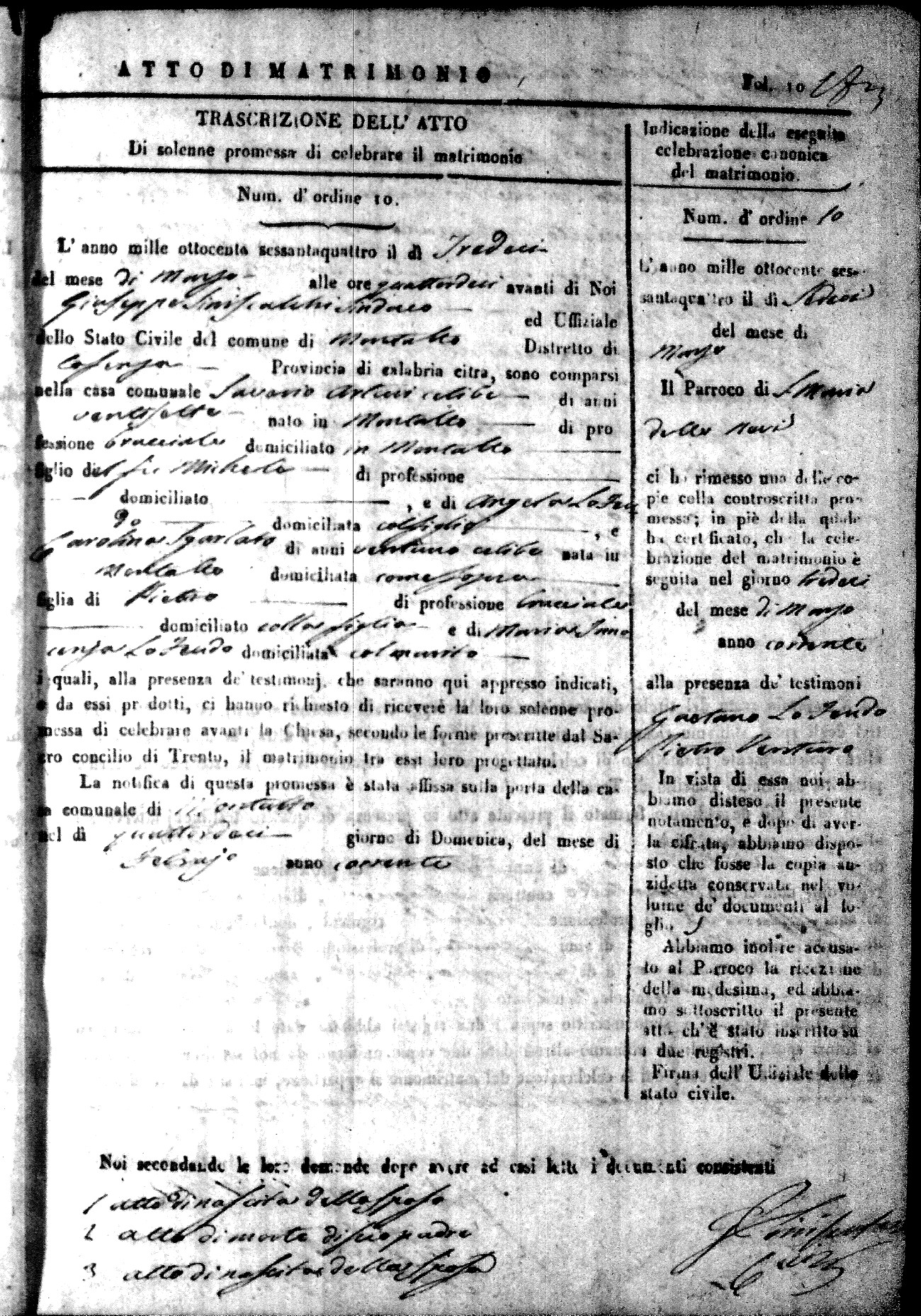 Here are the extractions for all the marriage acts in 1864 for Montalto Uffugo. To save time we have only transcribed the names of the groom and bride. For more information, click on the groom's surname to view a copy of the original document.