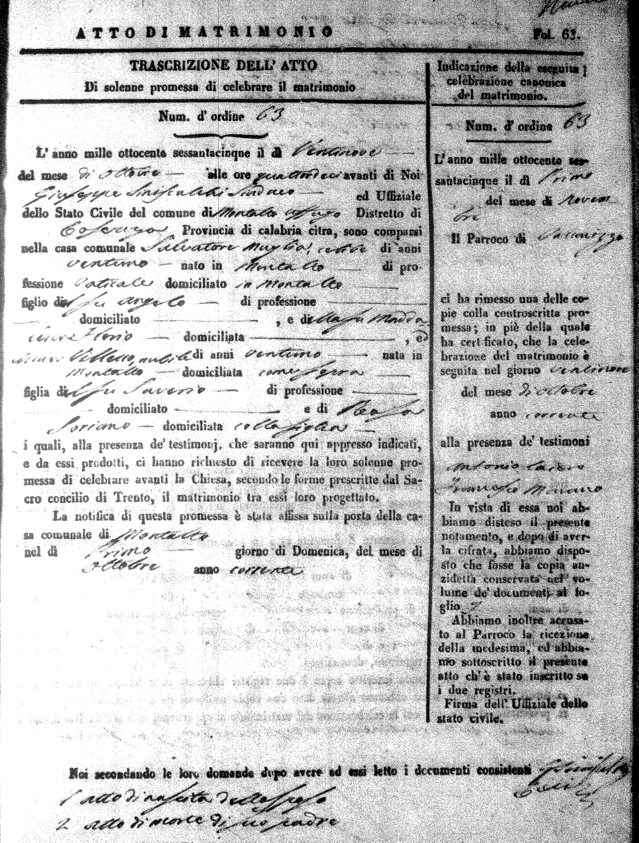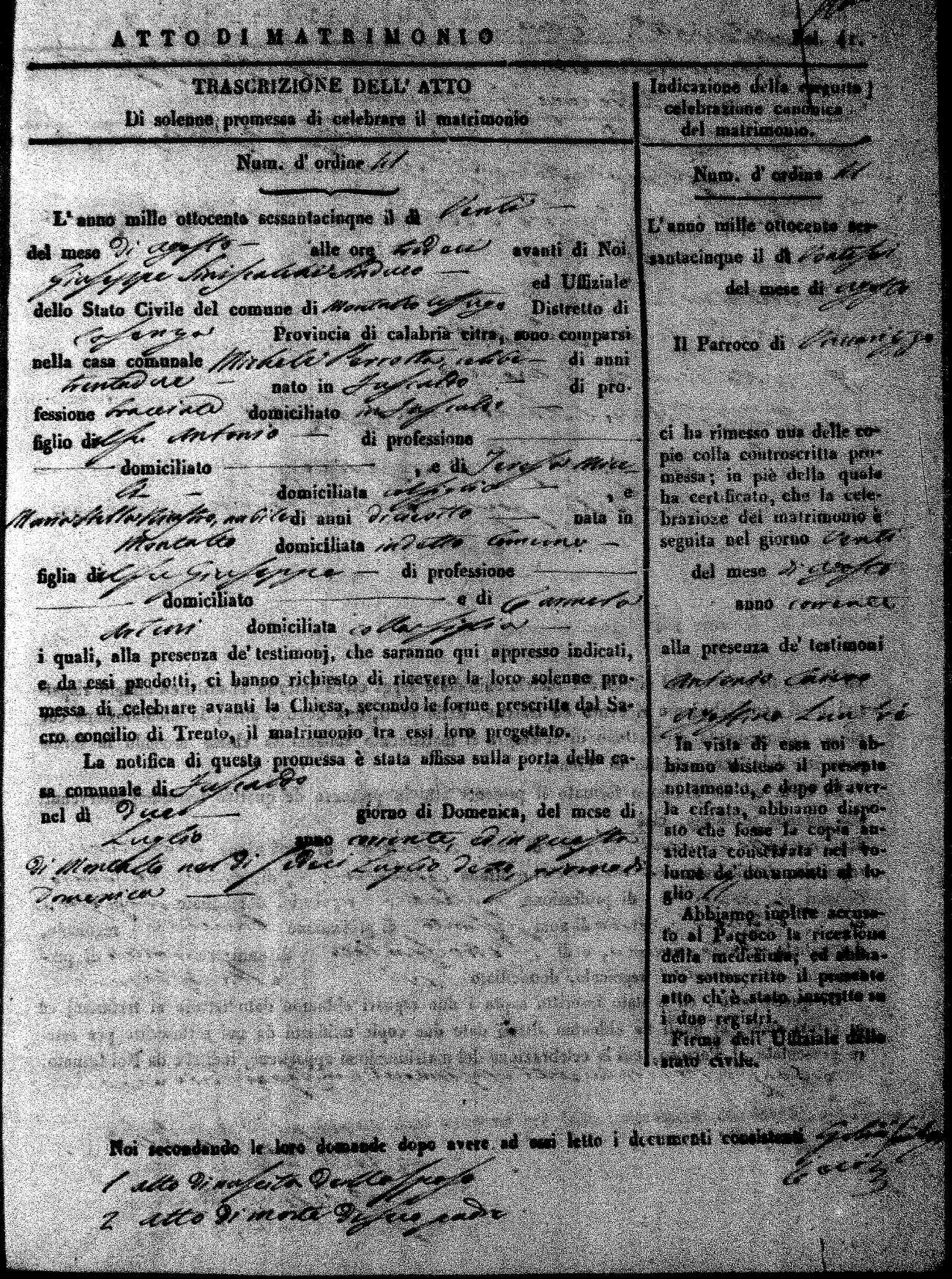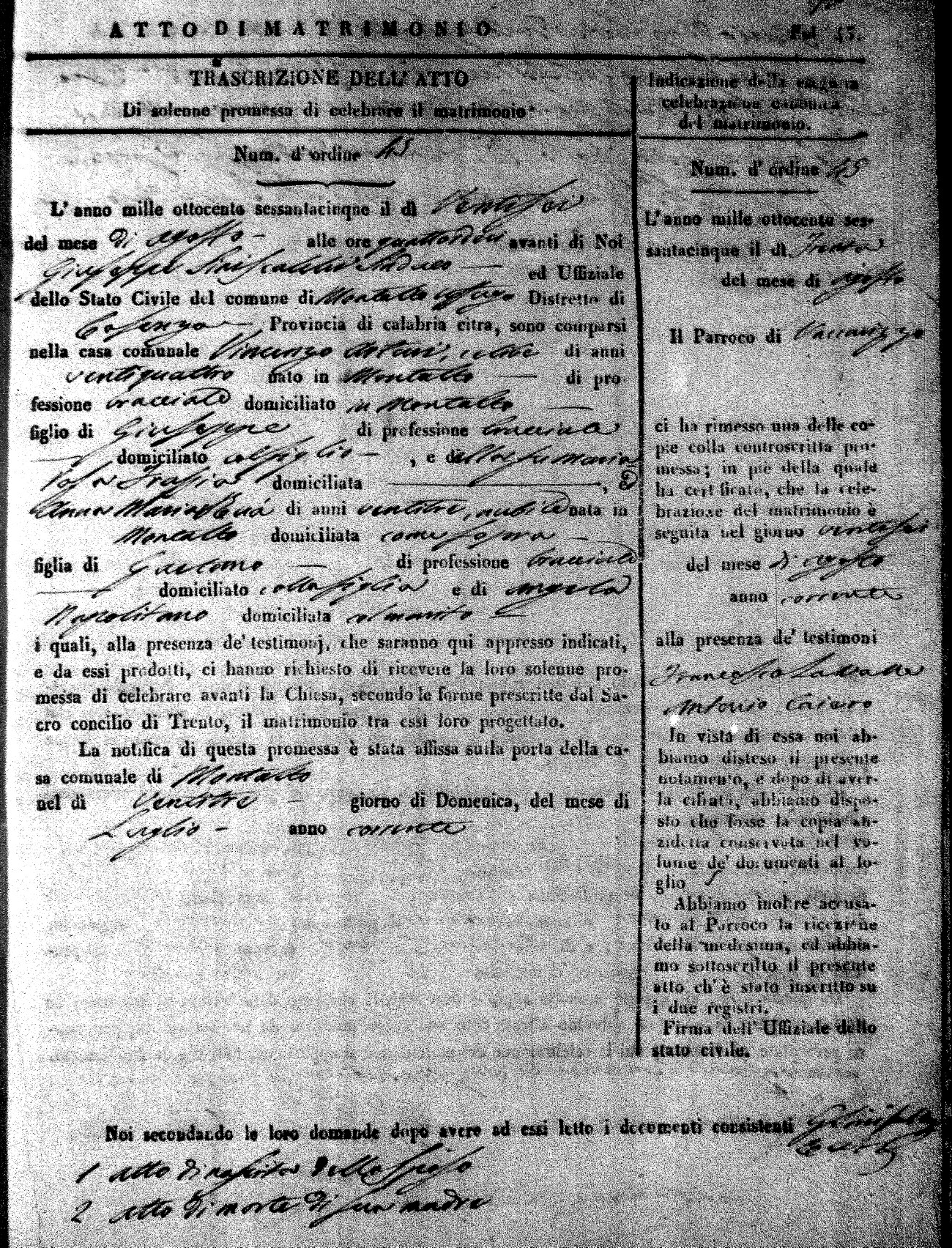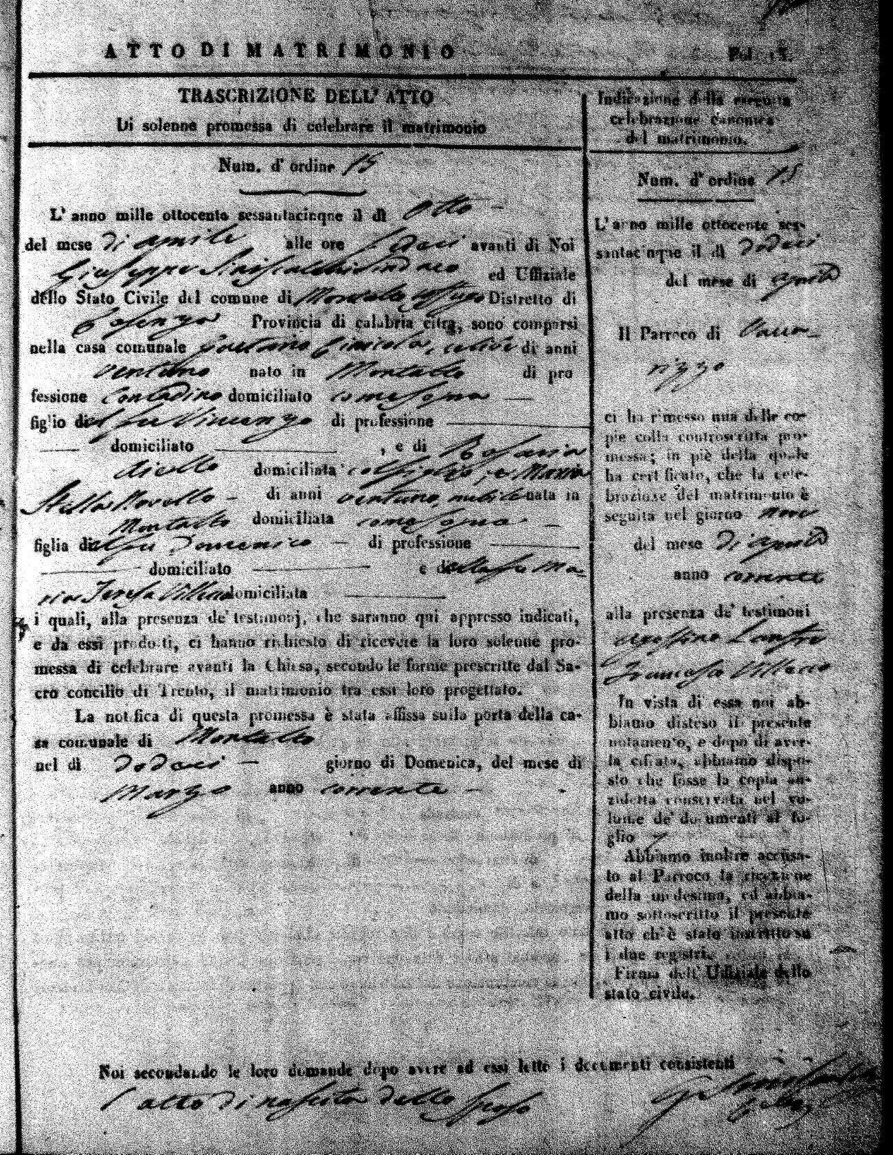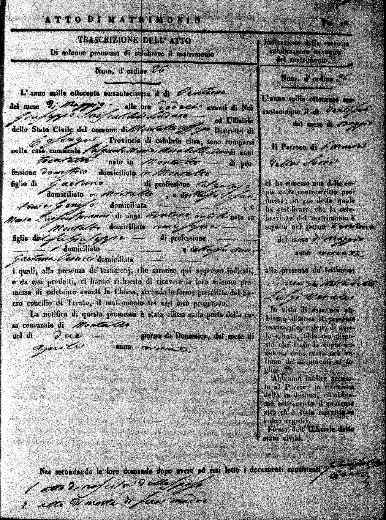 Here are the extractions for all the marriage acts in 1865 for Montalto Uffugo. When you see (fu) next to the parents names, that indicates that they were deceased at the time the marriage took place. For more information, click on the groom's surname to view a copy of the original document.