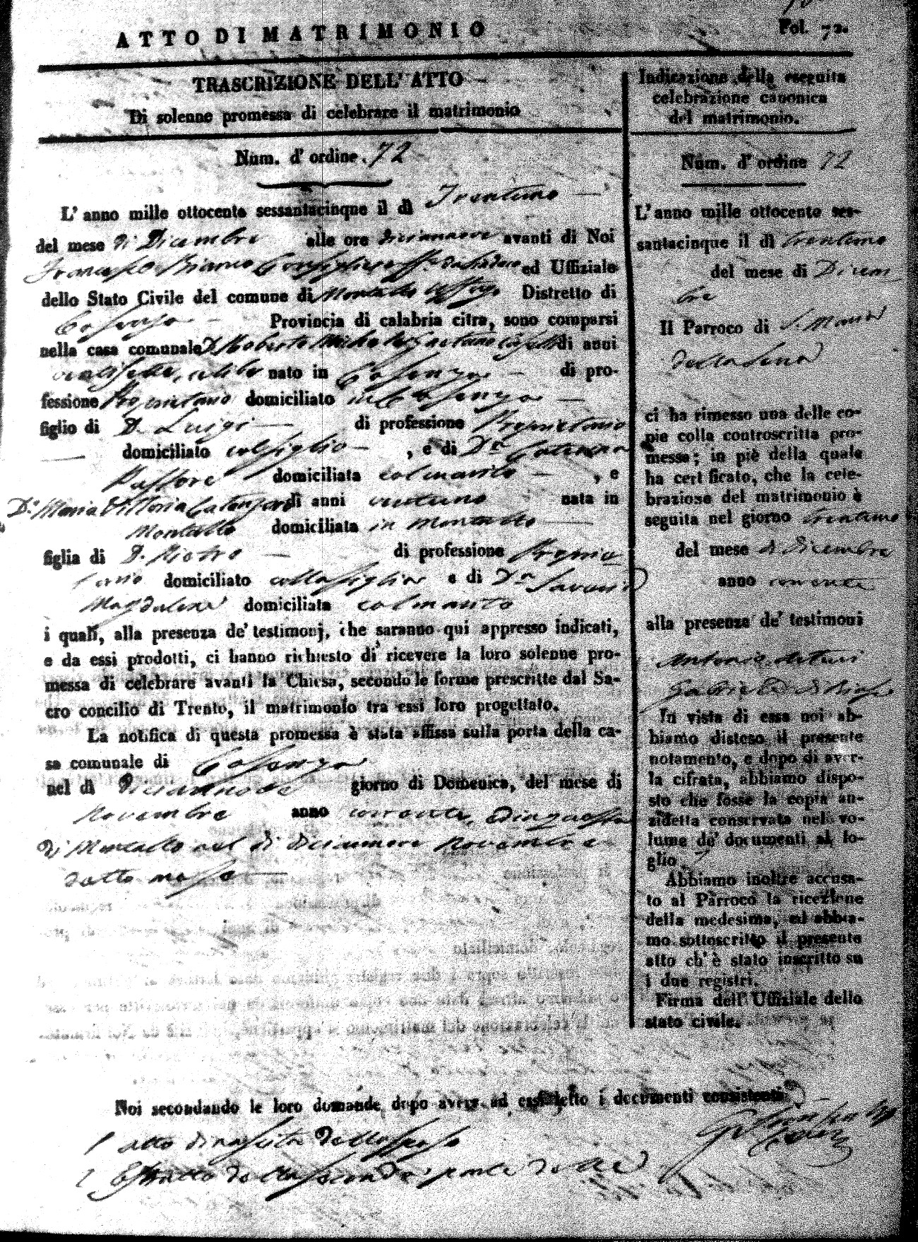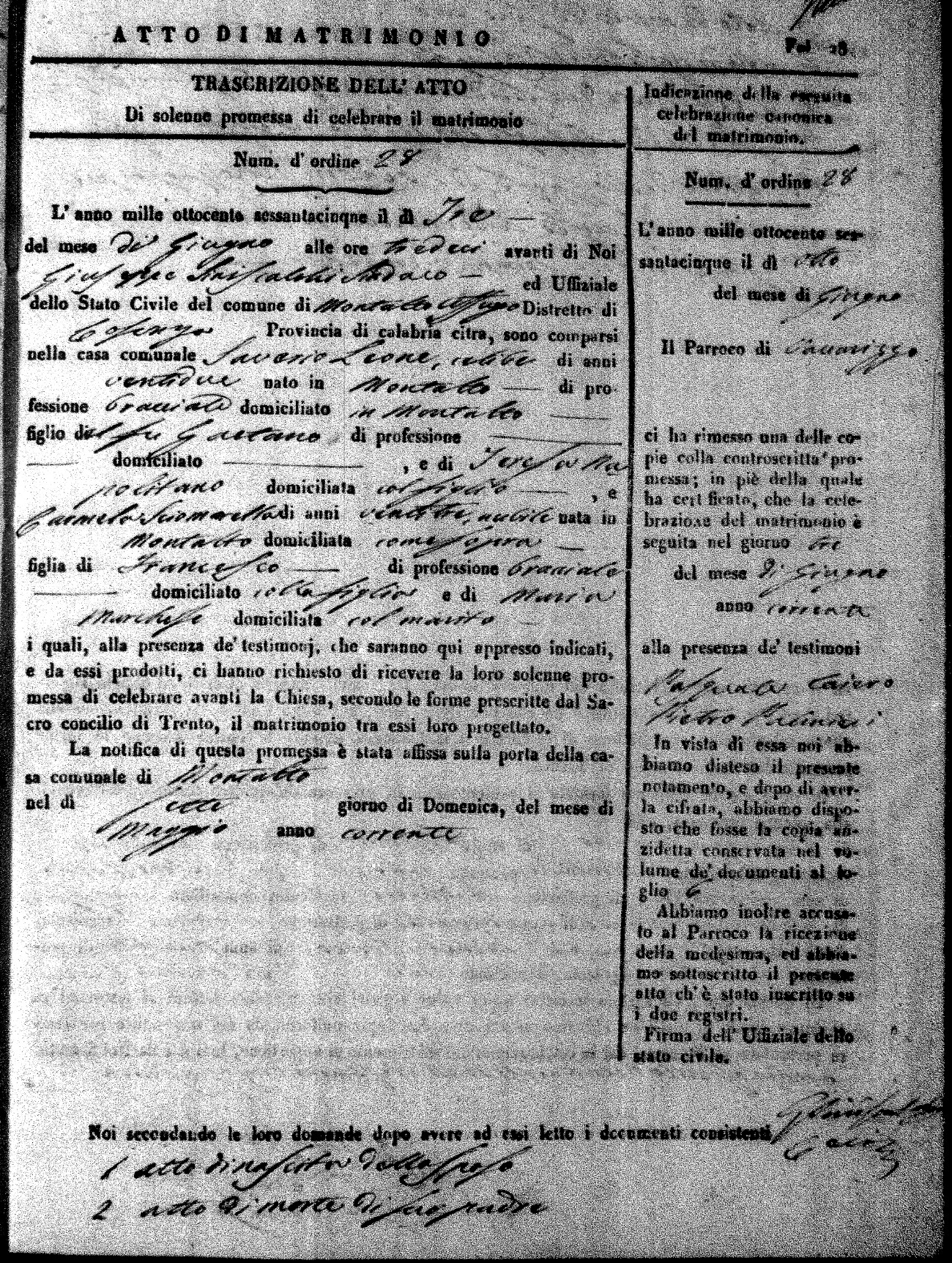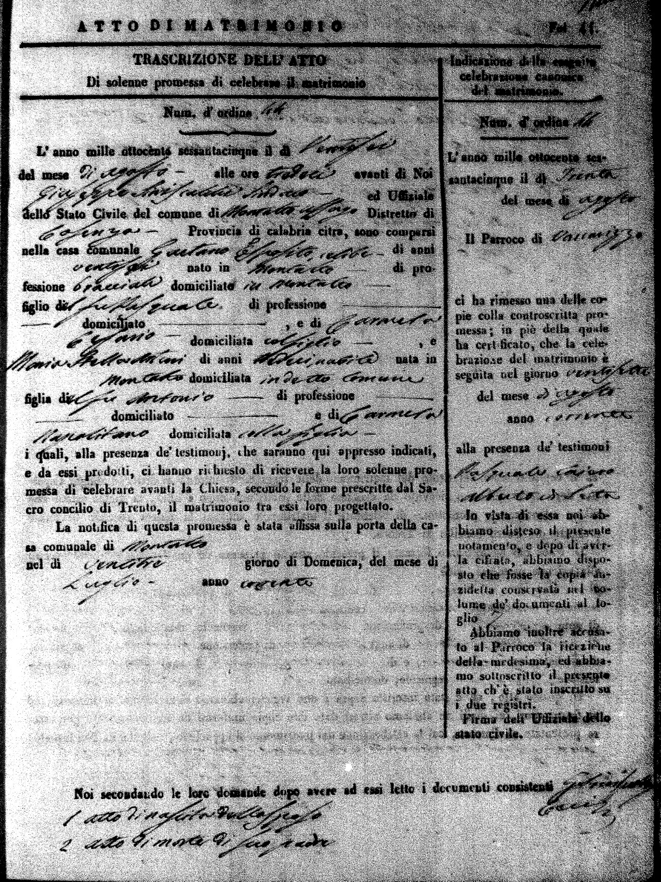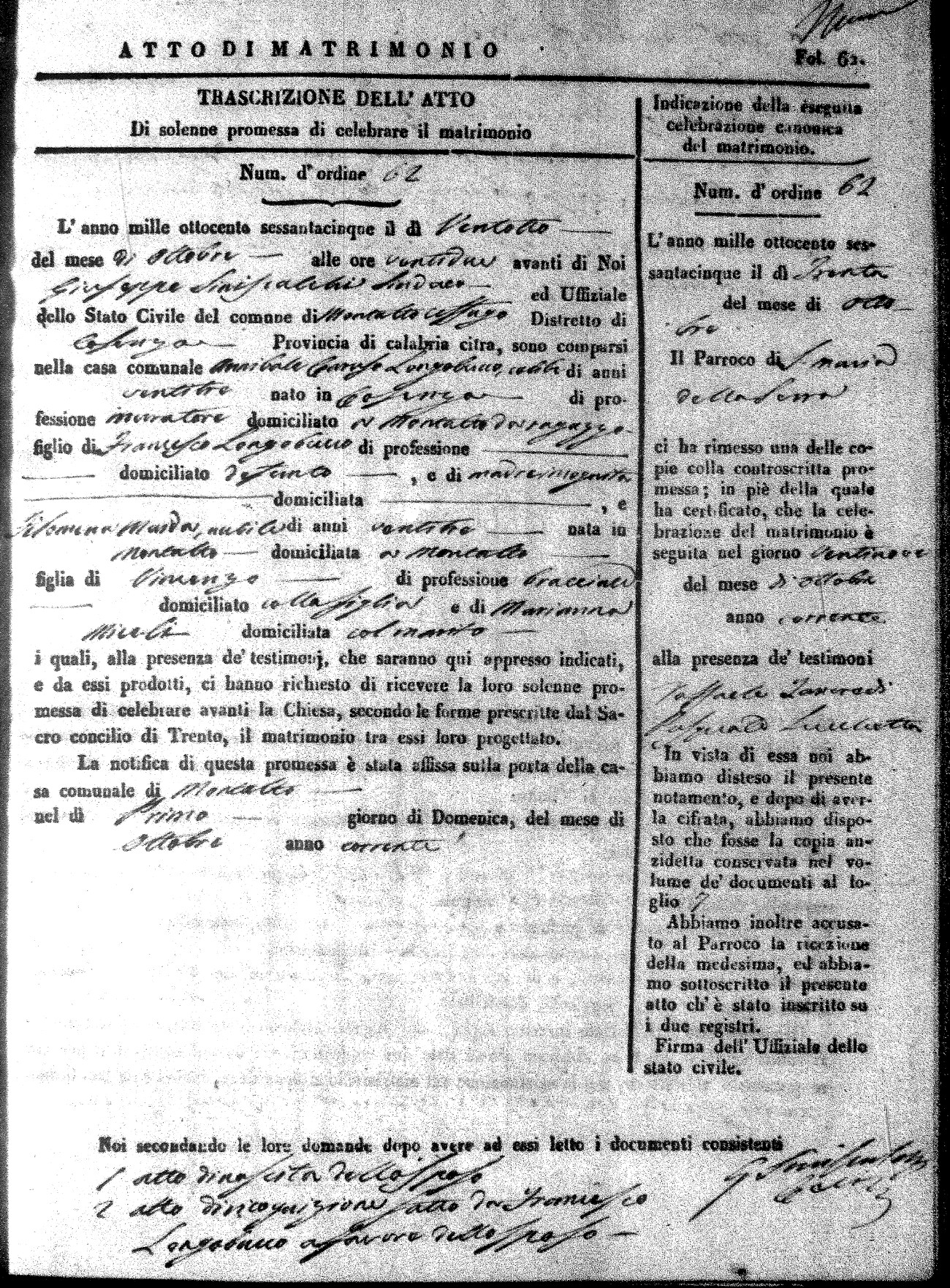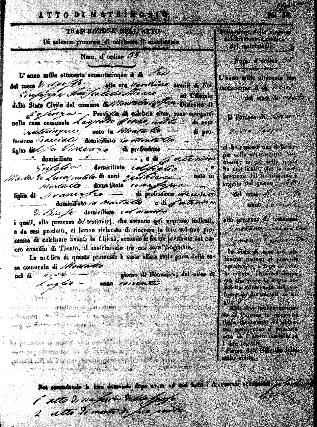 Here are the extractions for all the marriage acts in 1865 for Montalto Uffugo. When you see (fu) next to the parents names, that indicates that they were deceased at the time the marriage took place. For more information, click on the groom's surname to view a copy of the original document.