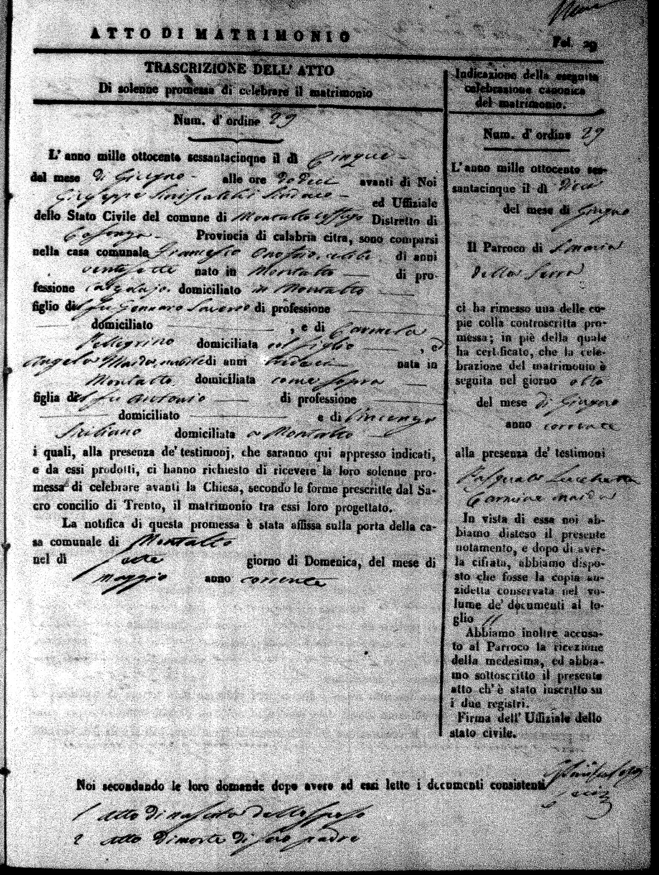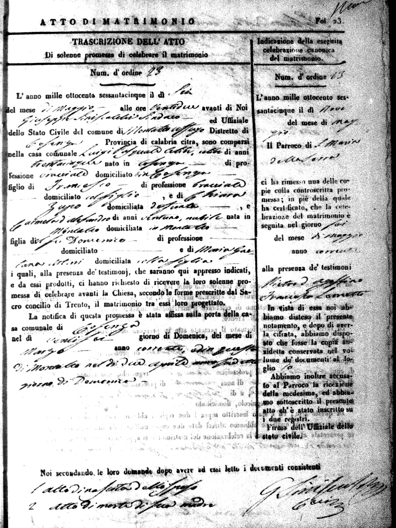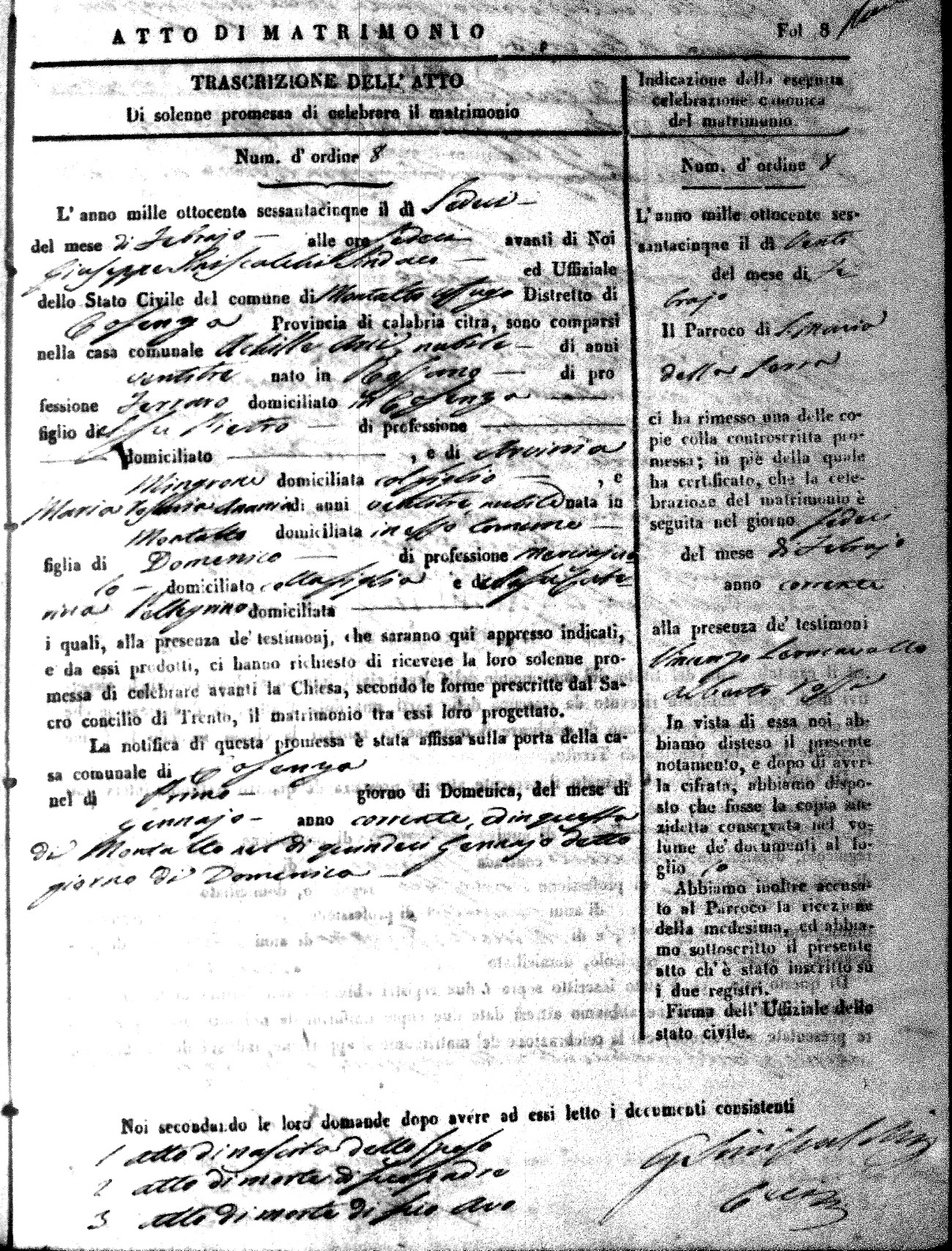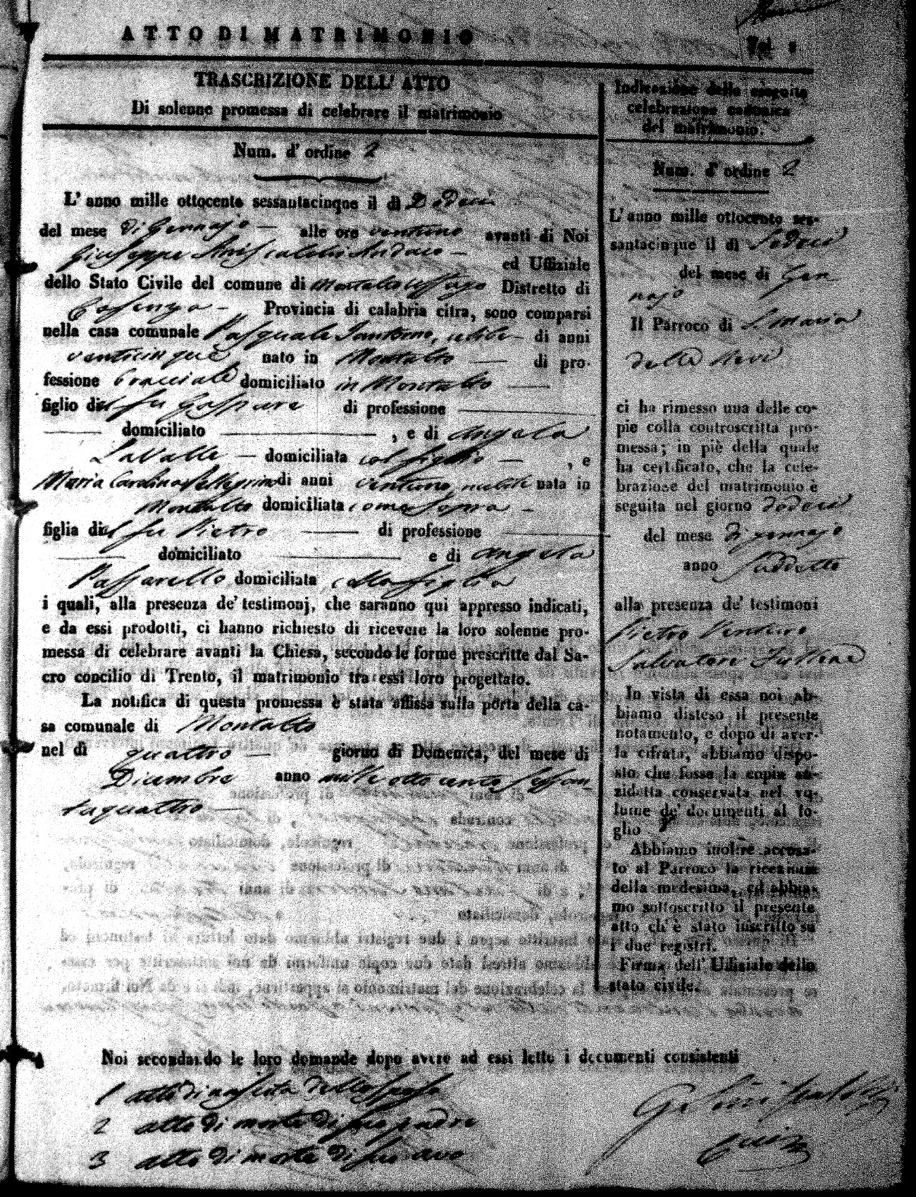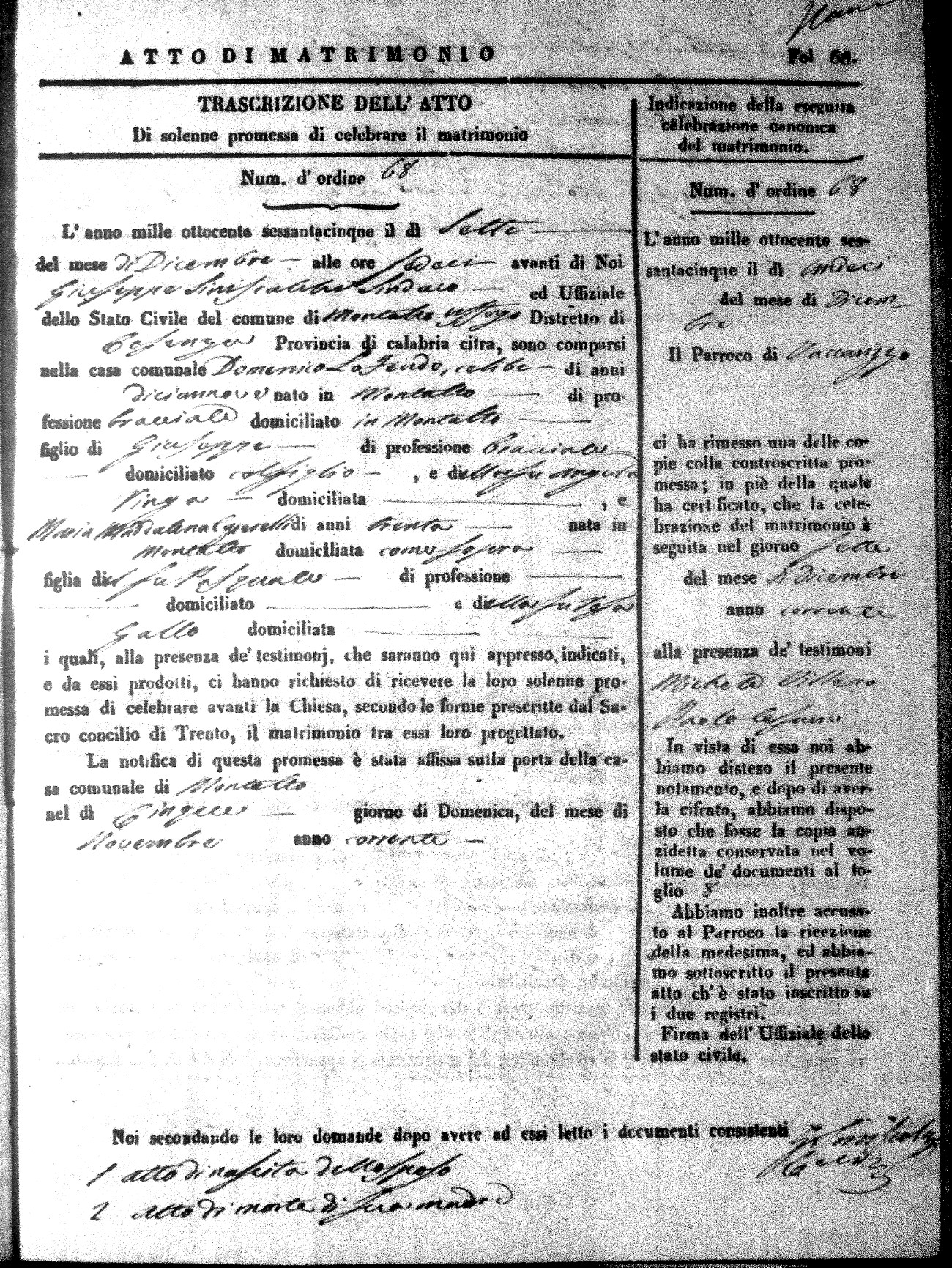 Here are the extractions for all the marriage acts in 1865 for Montalto Uffugo. When you see (fu) next to the parents names, that indicates that they were deceased at the time the marriage took place. For more information, click on the groom's surname to view a copy of the original document.