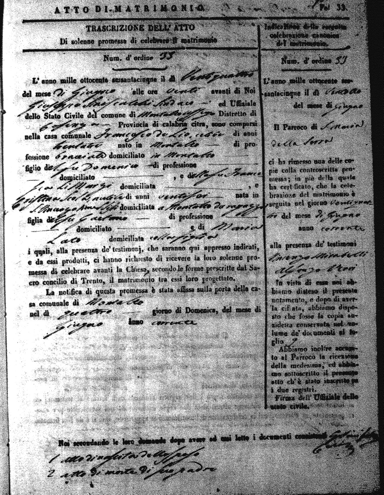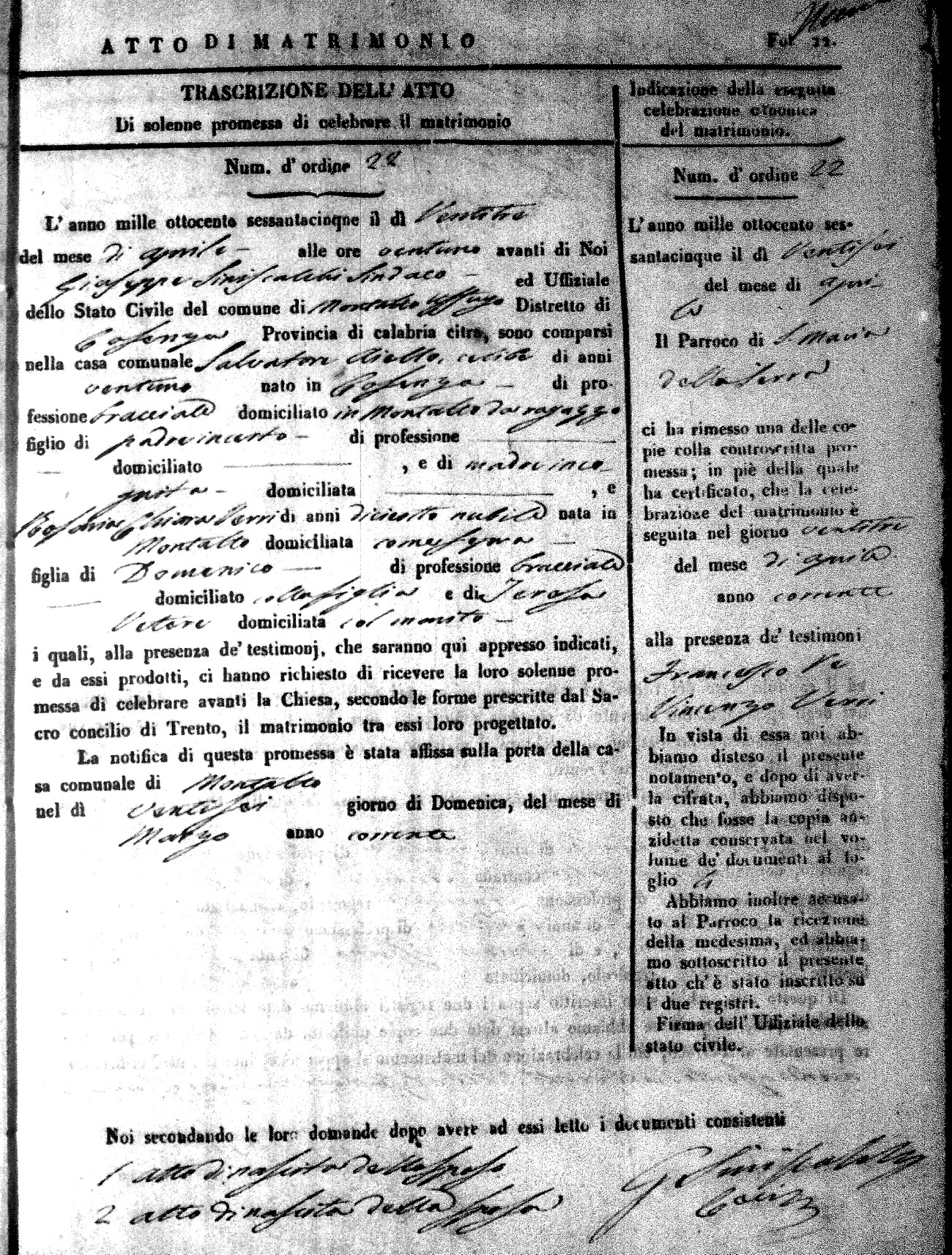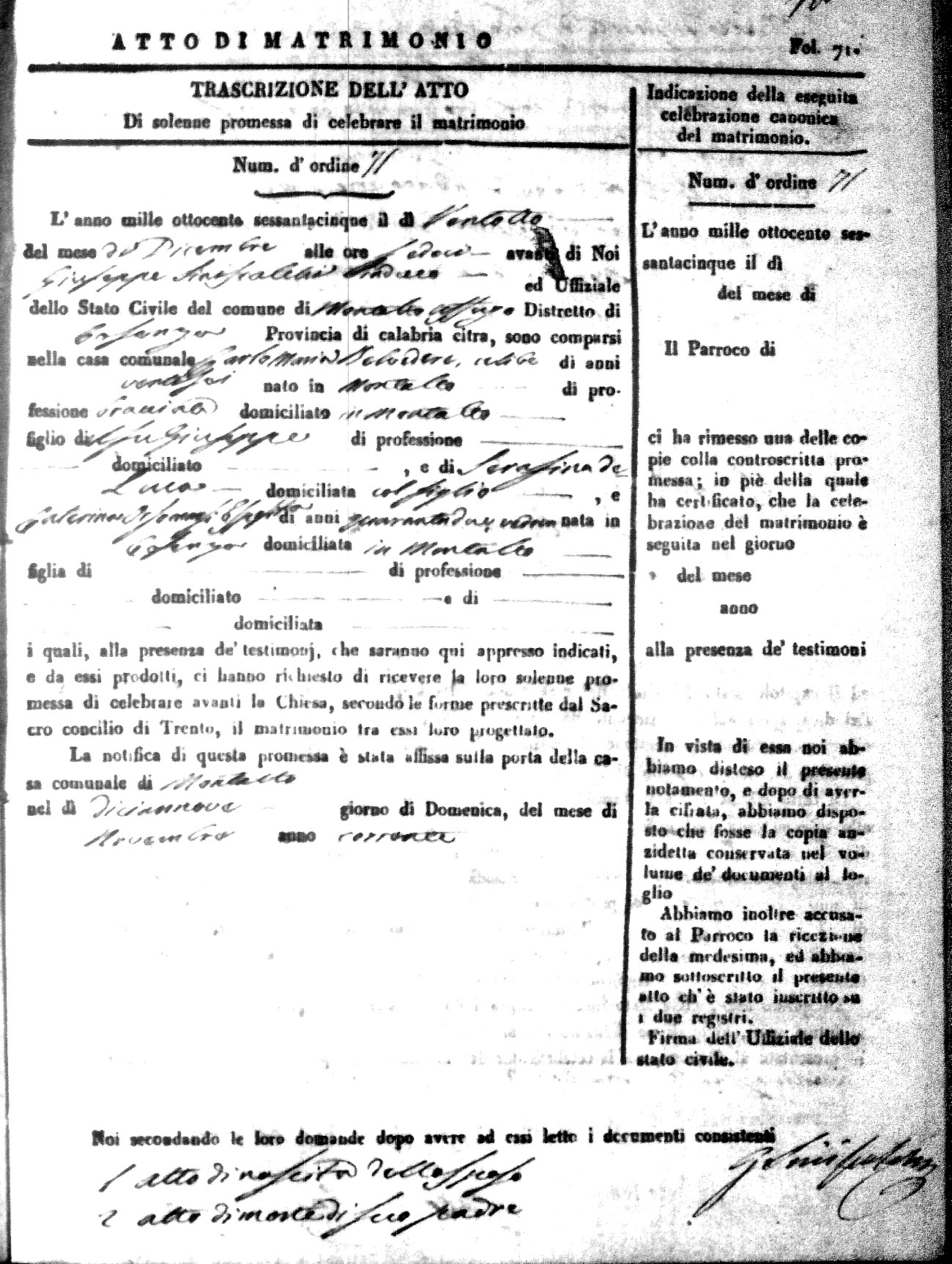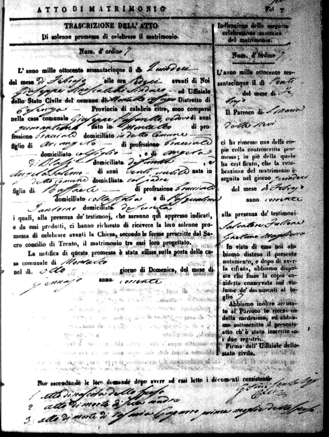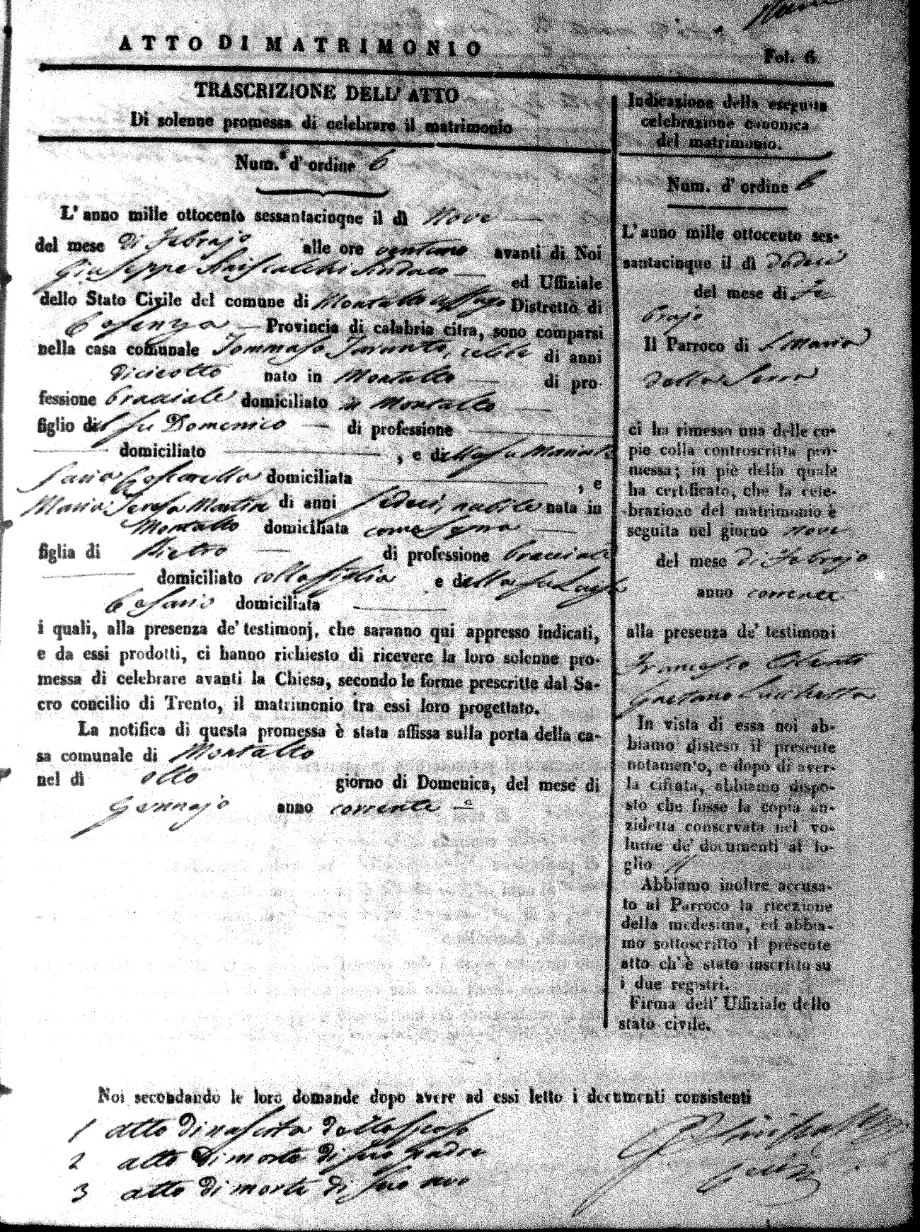 Here are the extractions for all the marriage acts in 1865 for Montalto Uffugo. When you see (fu) next to the parents names, that indicates that they were deceased at the time the marriage took place. For more information, click on the groom's surname to view a copy of the original document.