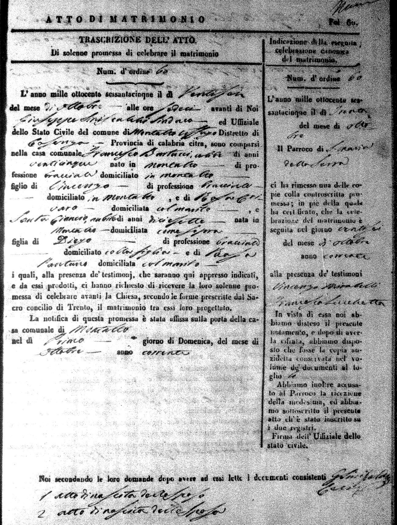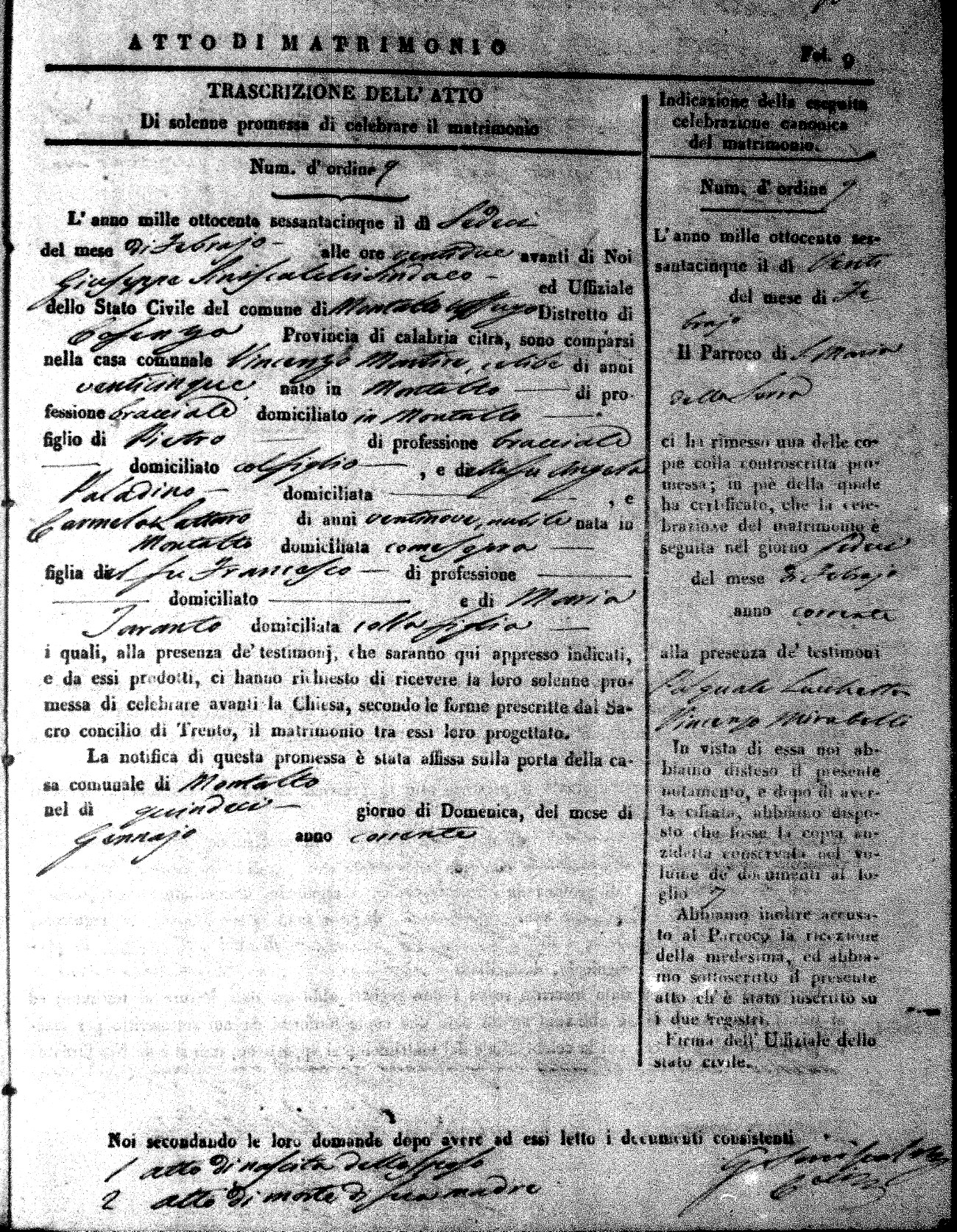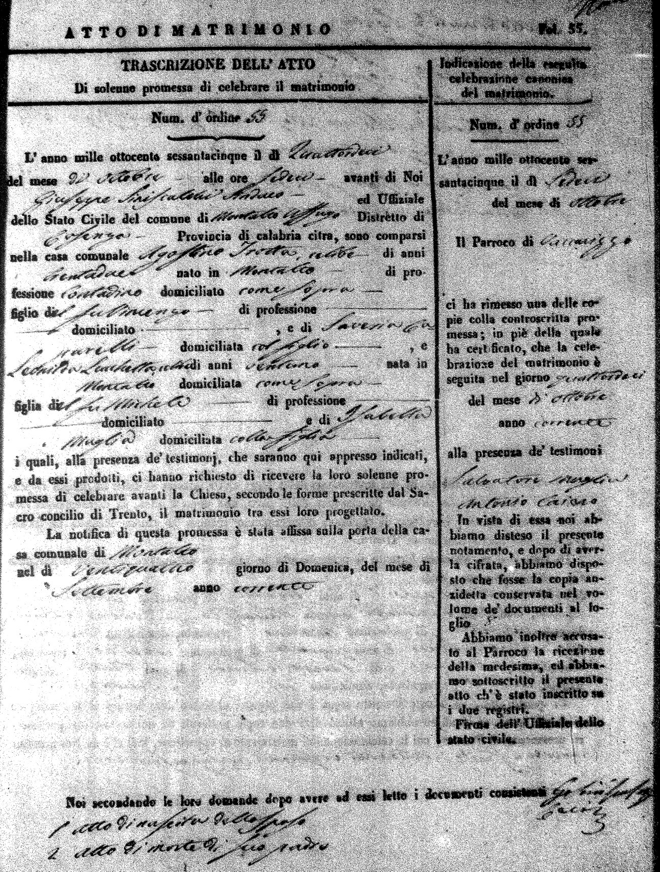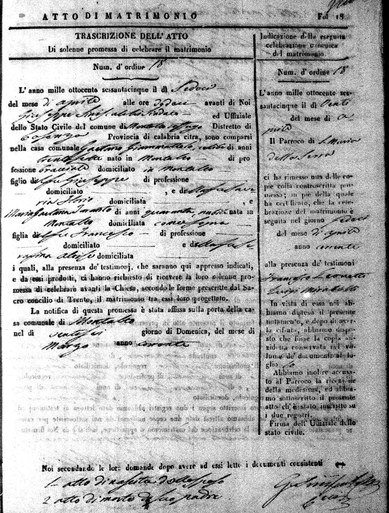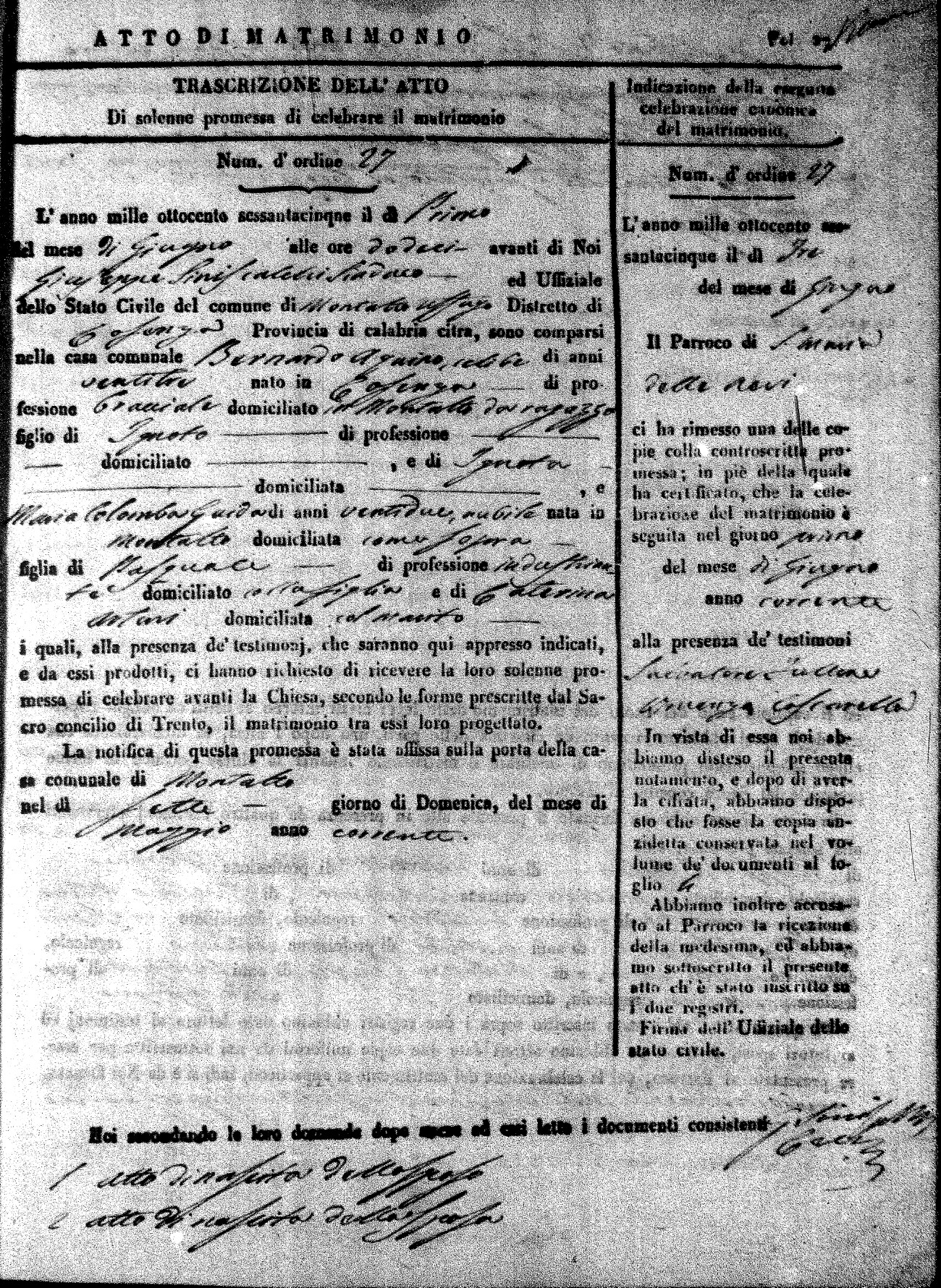 Here are the extractions for all the marriage acts in 1865 for Montalto Uffugo. When you see (fu) next to the parents names, that indicates that they were deceased at the time the marriage took place. For more information, click on the groom's surname to view a copy of the original document.