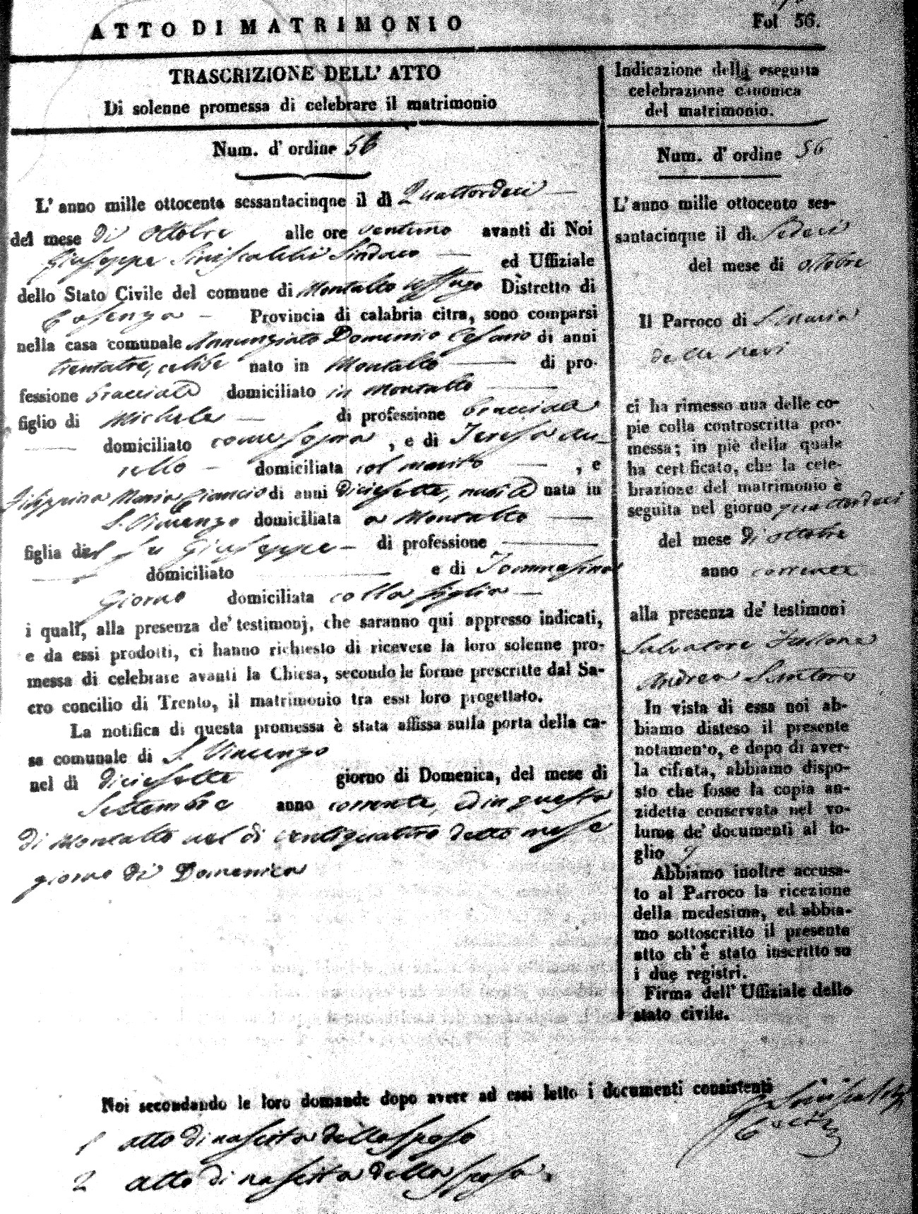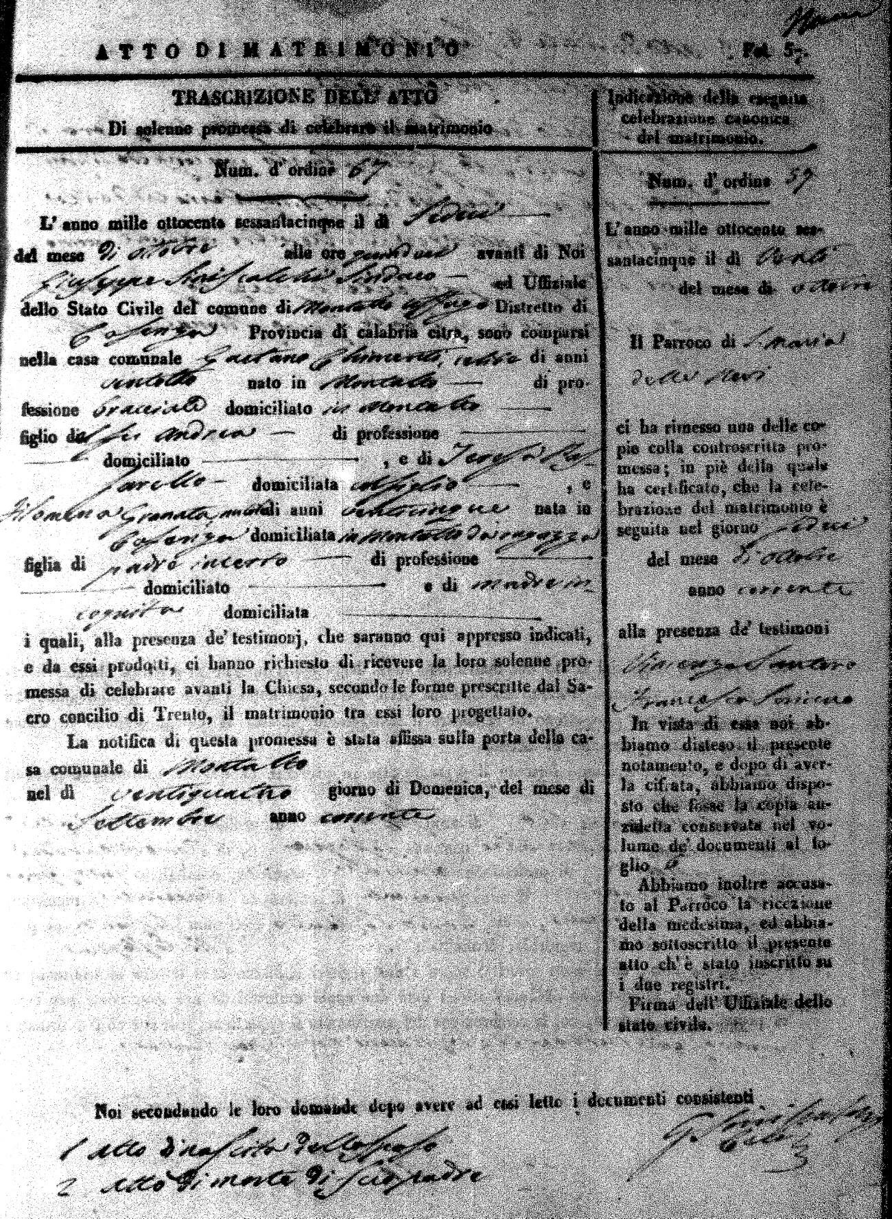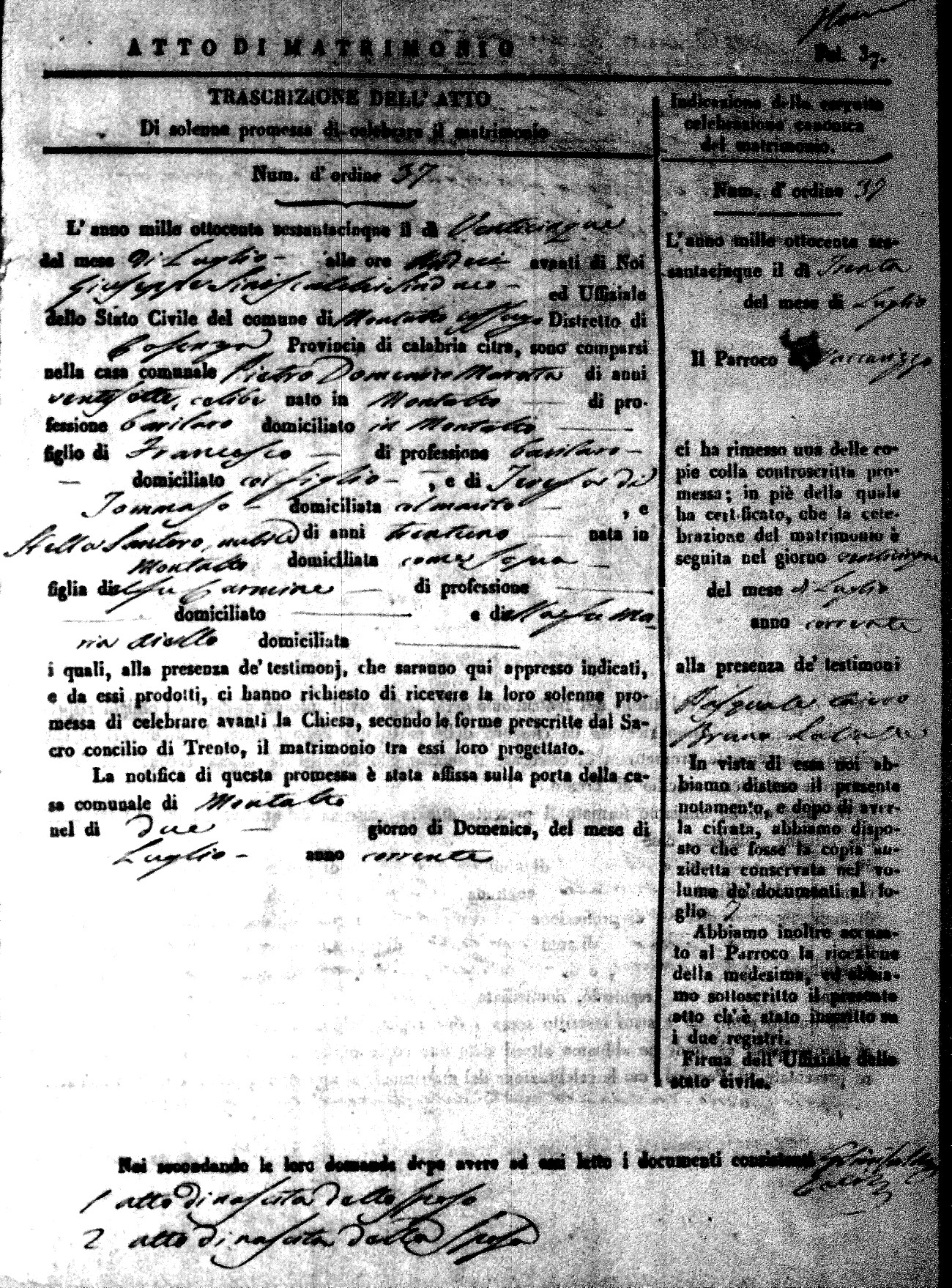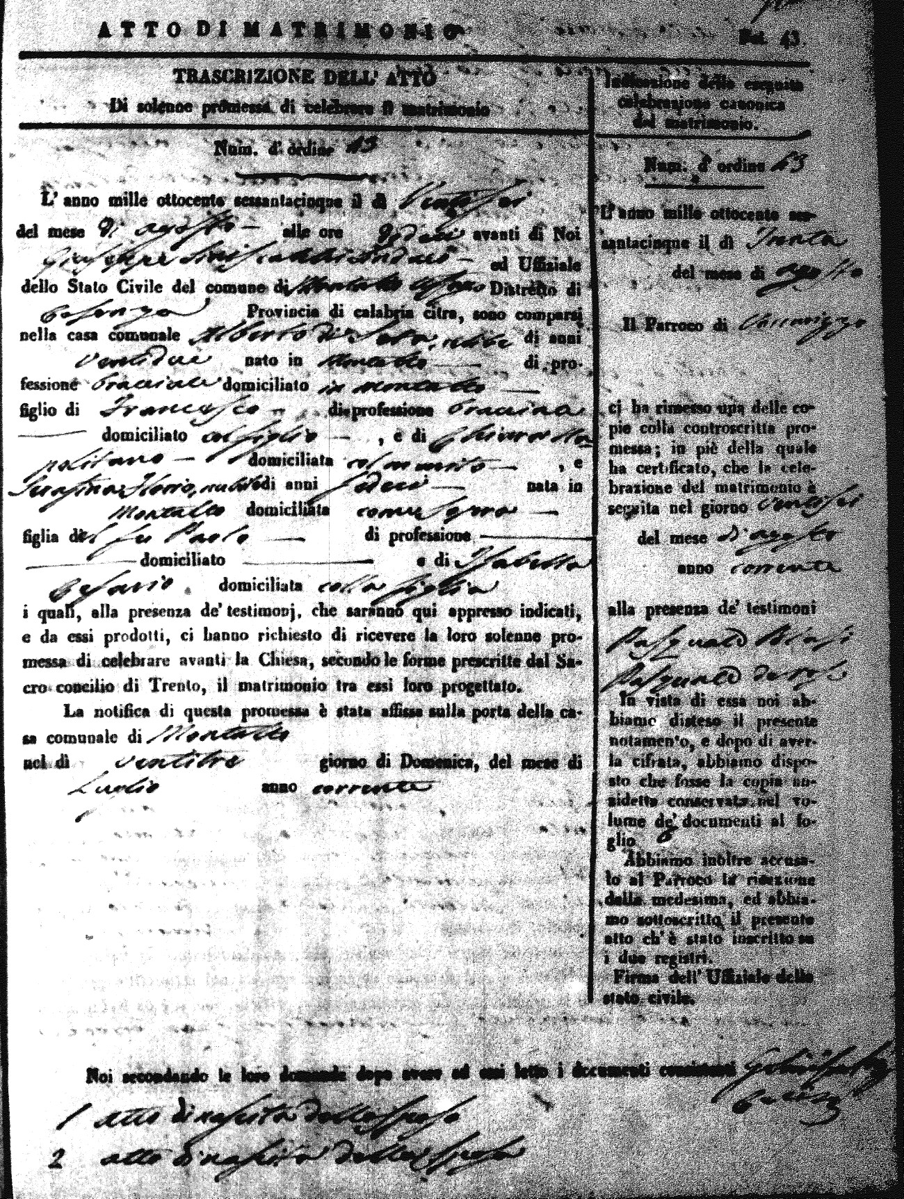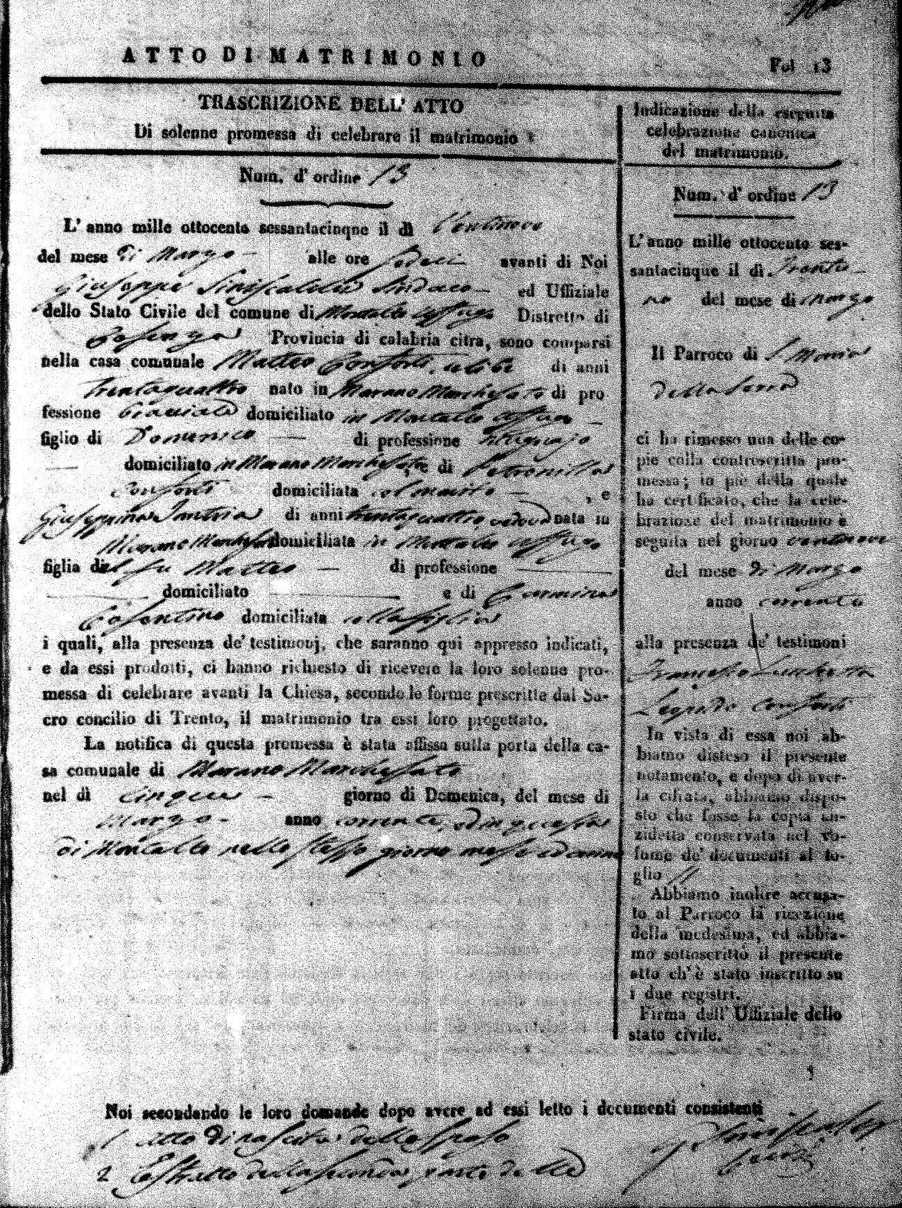 Here are the extractions for all the marriage acts in 1865 for Montalto Uffugo. When you see (fu) next to the parents names, that indicates that they were deceased at the time the marriage took place. For more information, click on the groom's surname to view a copy of the original document.