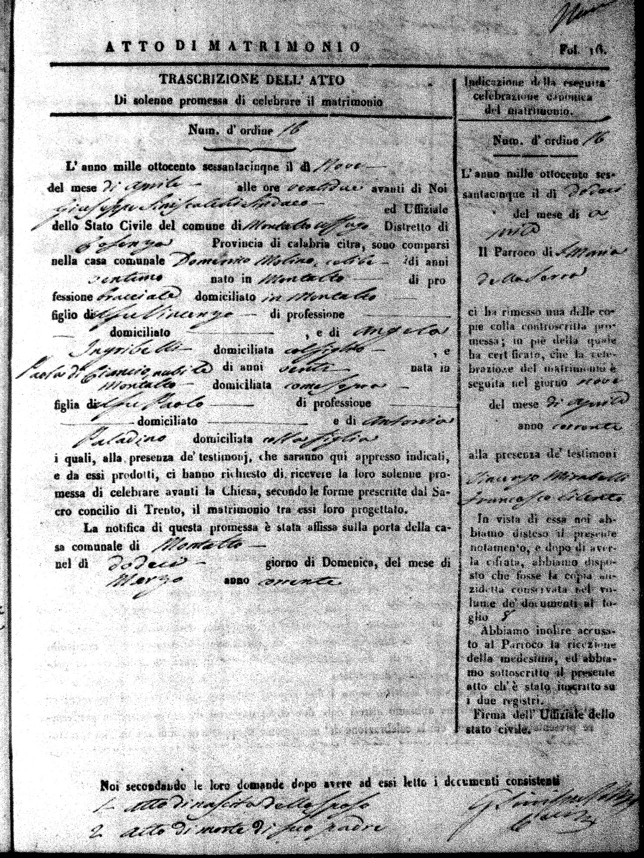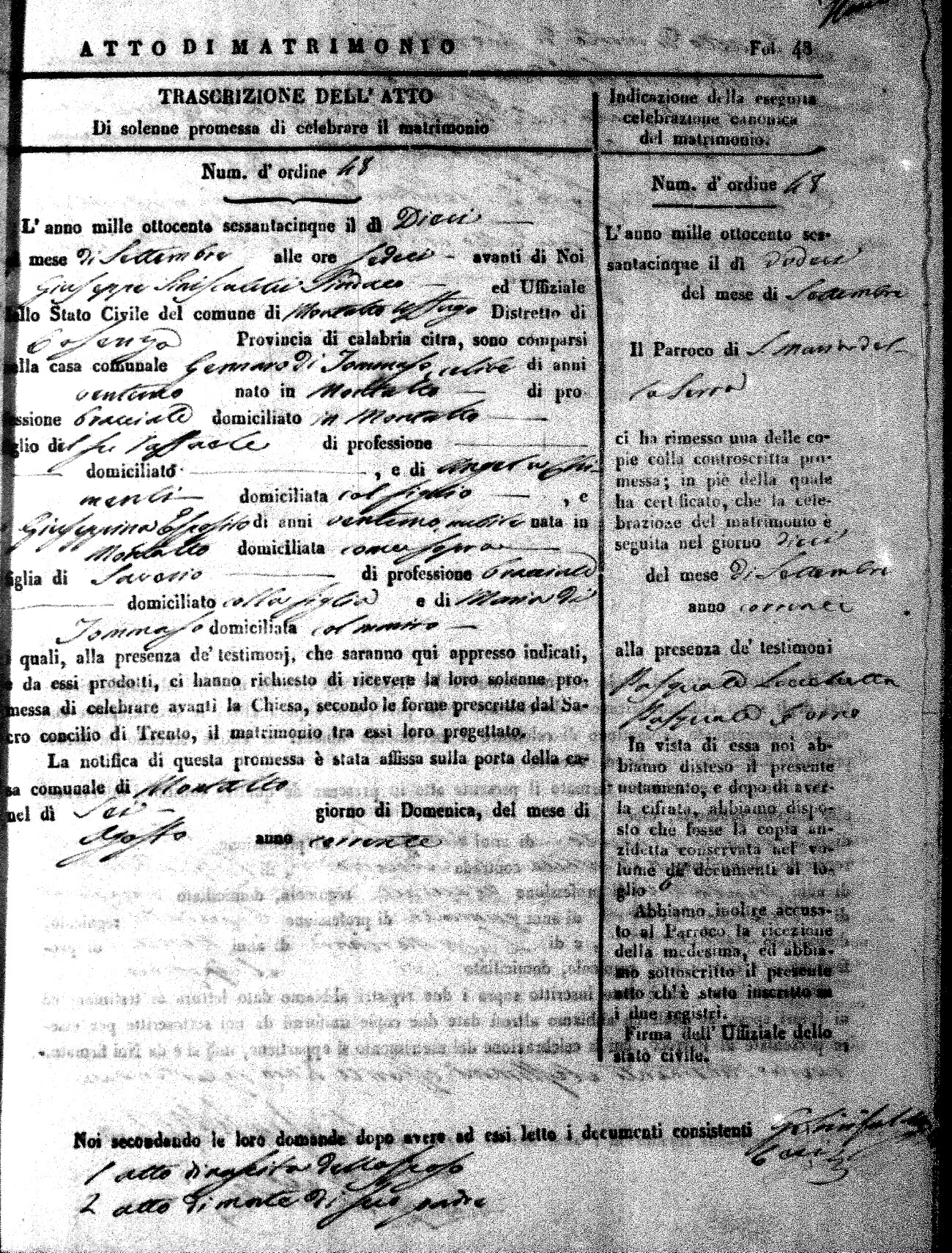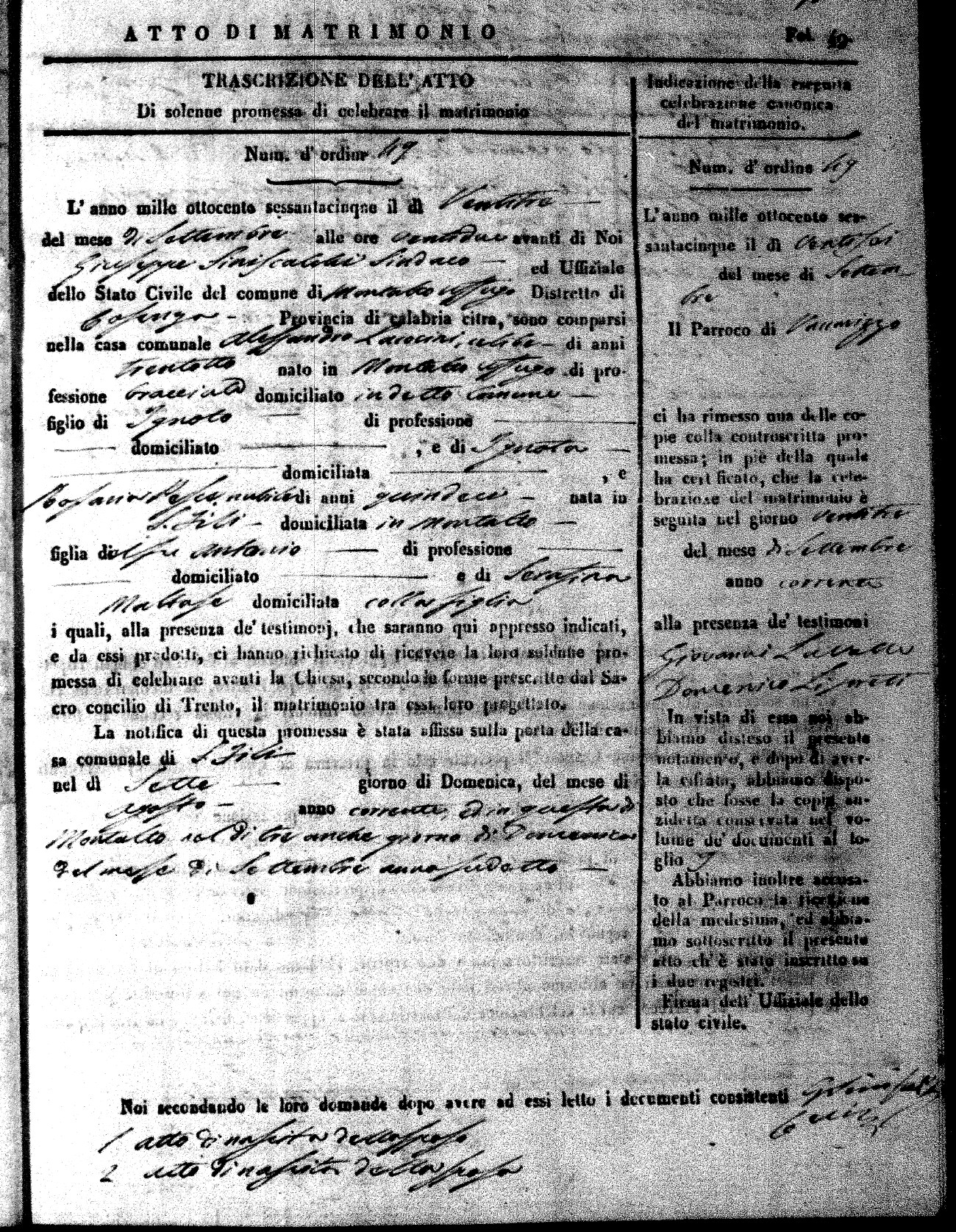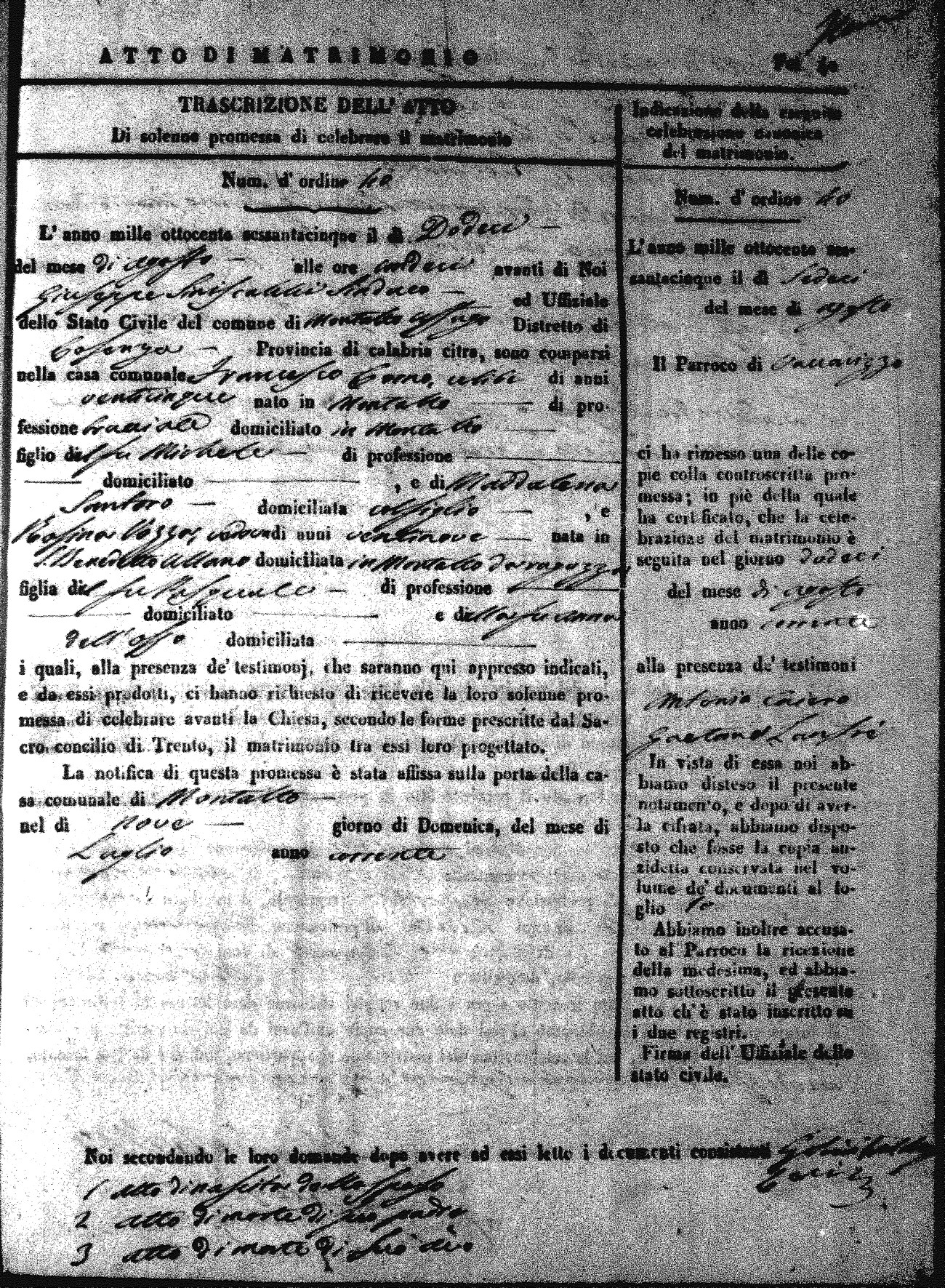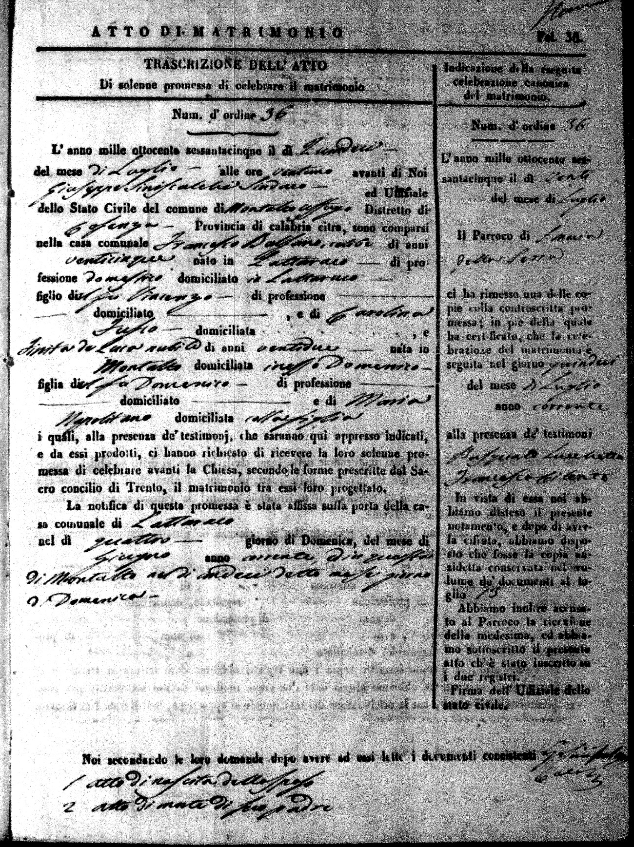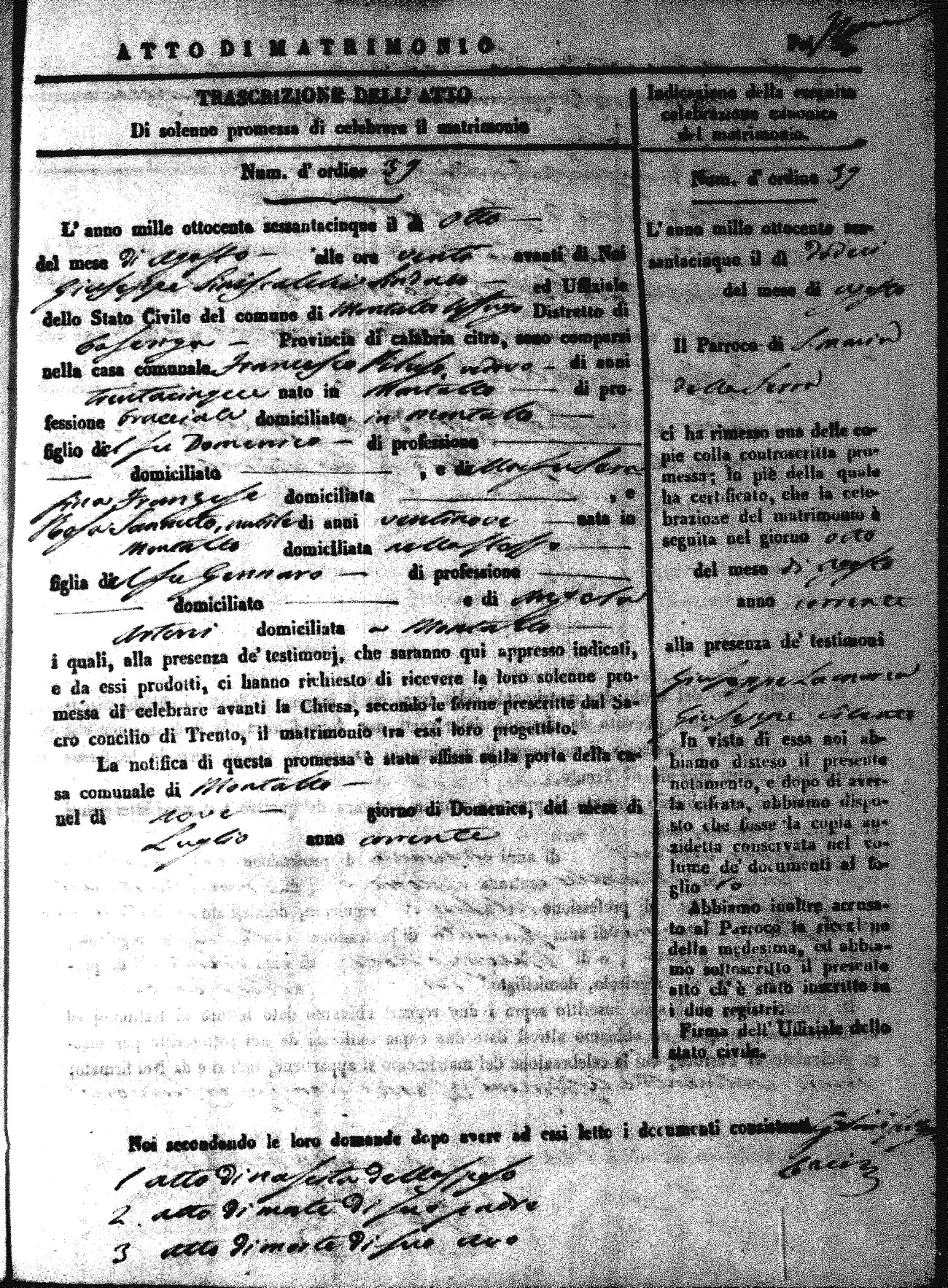 Here are the extractions for all the marriage acts in 1865 for Montalto Uffugo. When you see (fu) next to the parents names, that indicates that they were deceased at the time the marriage took place. For more information, click on the groom's surname to view a copy of the original document.