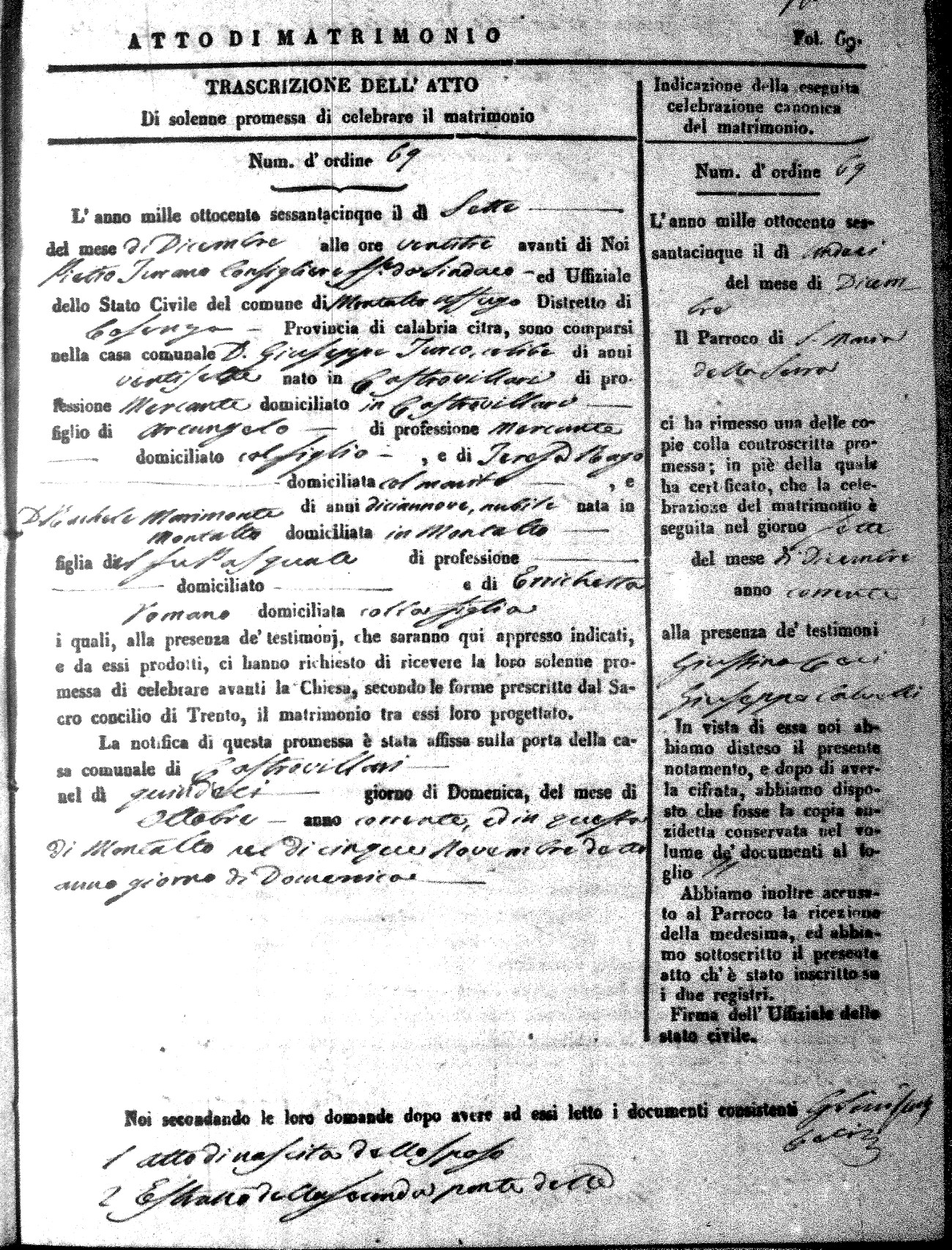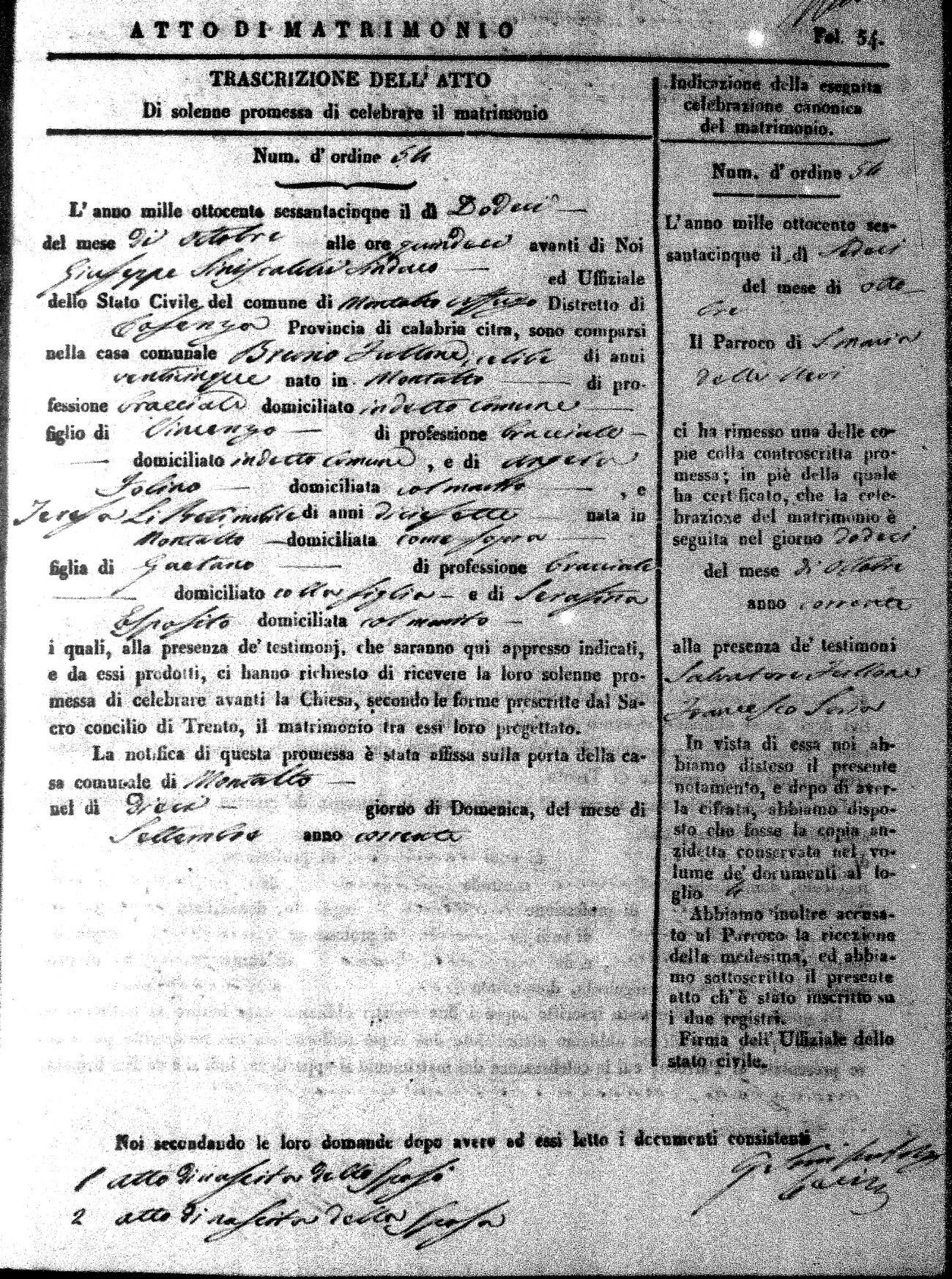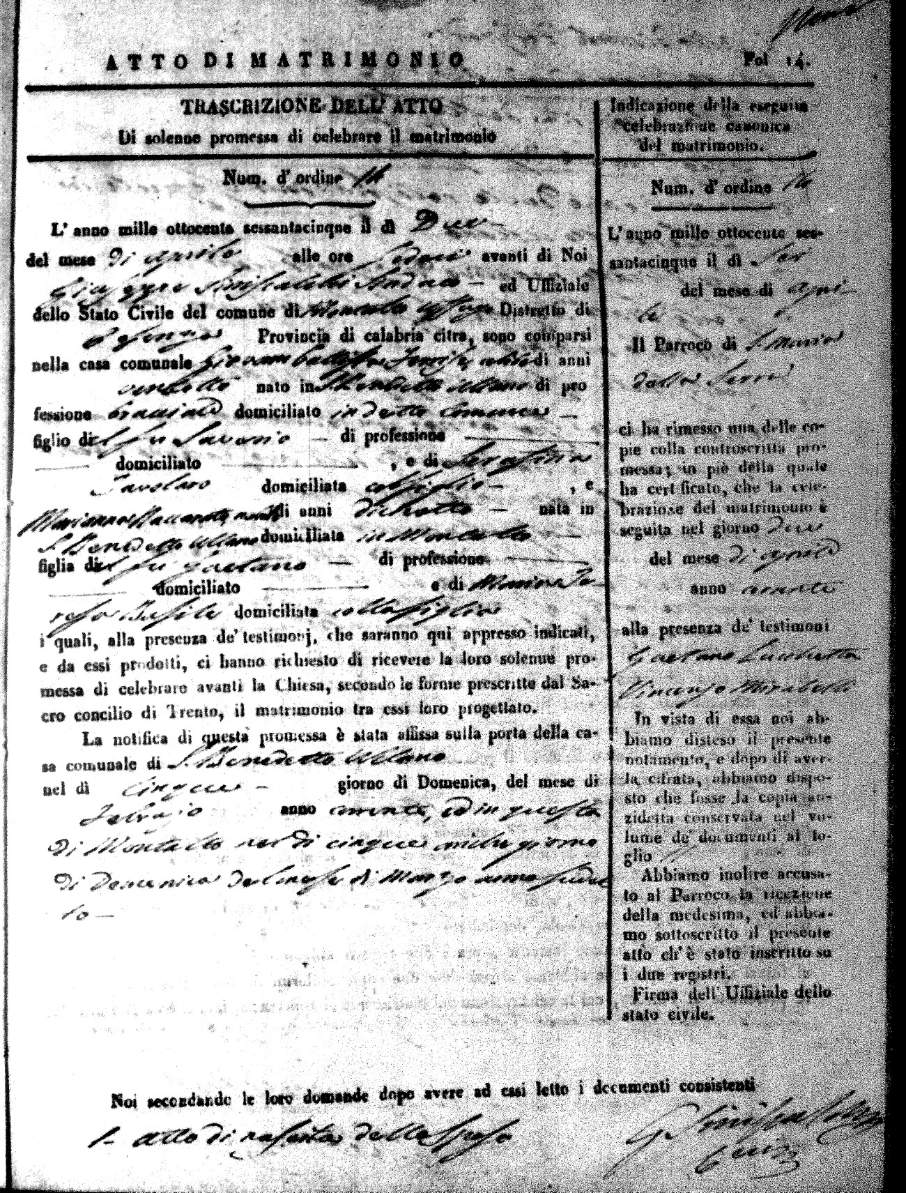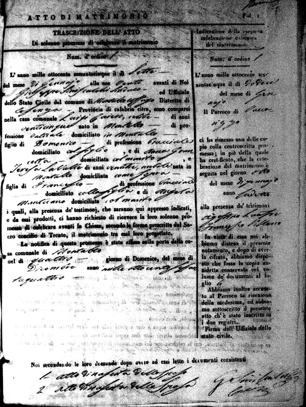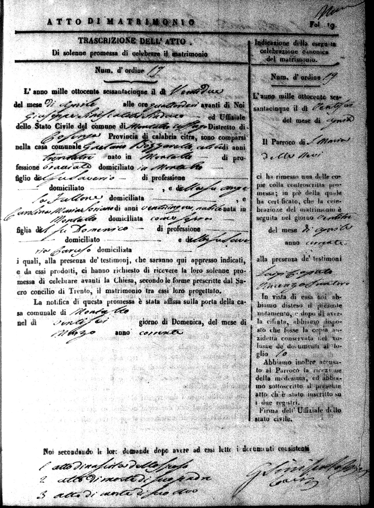 Here are the extractions for all the marriage acts in 1865 for Montalto Uffugo. When you see (fu) next to the parents names, that indicates that they were deceased at the time the marriage took place. For more information, click on the groom's surname to view a copy of the original document.