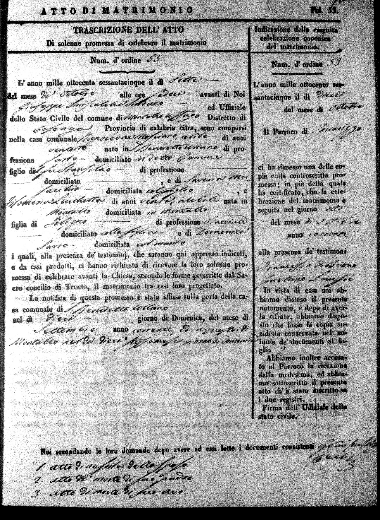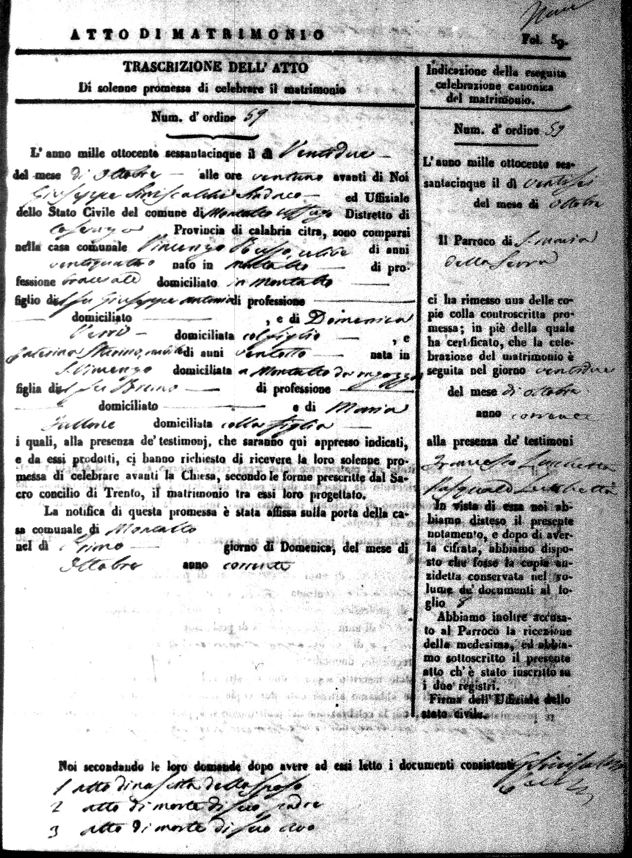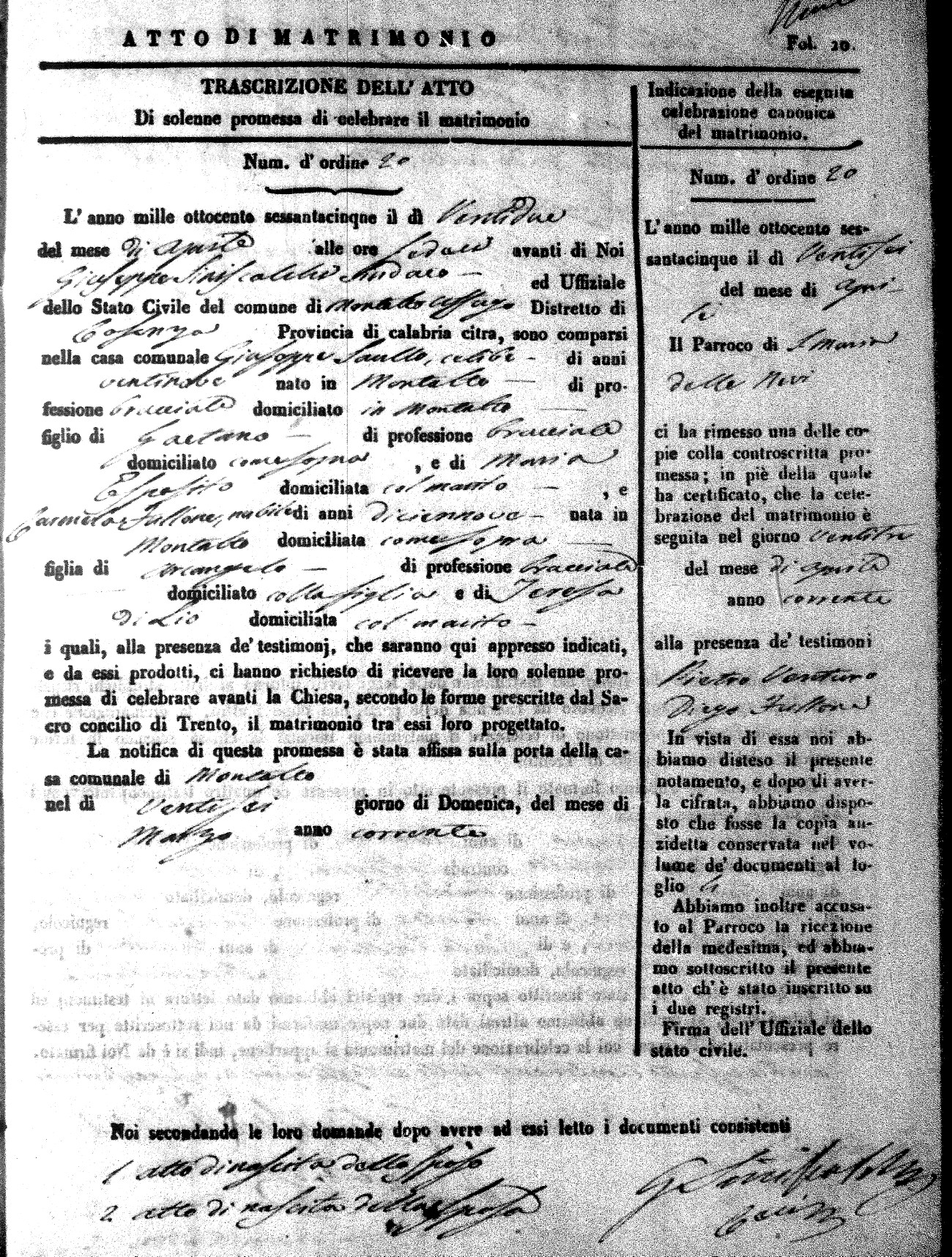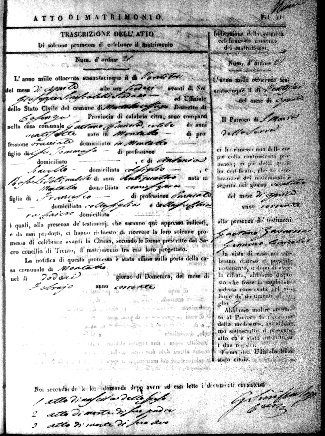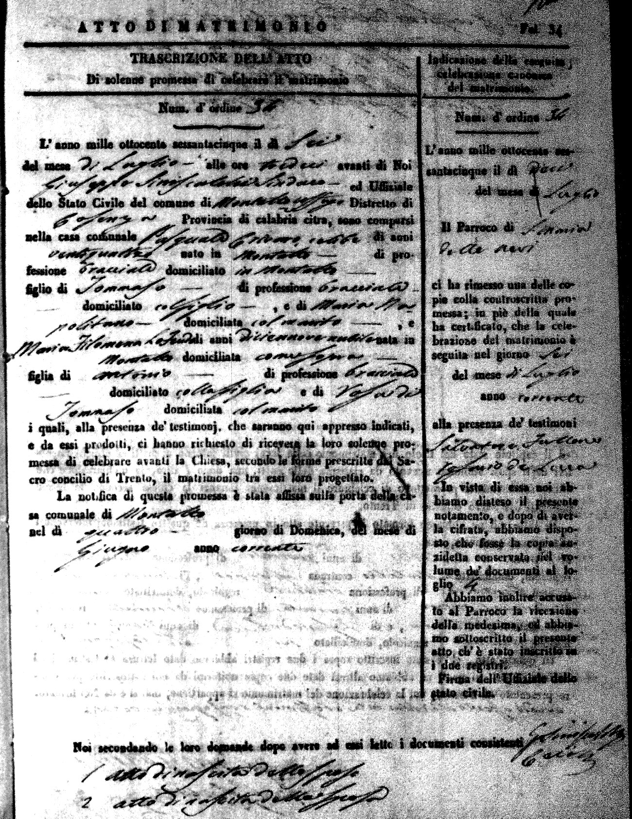 Here are the extractions for all the marriage acts in 1865 for Montalto Uffugo. When you see (fu) next to the parents names, that indicates that they were deceased at the time the marriage took place. For more information, click on the groom's surname to view a copy of the original document.