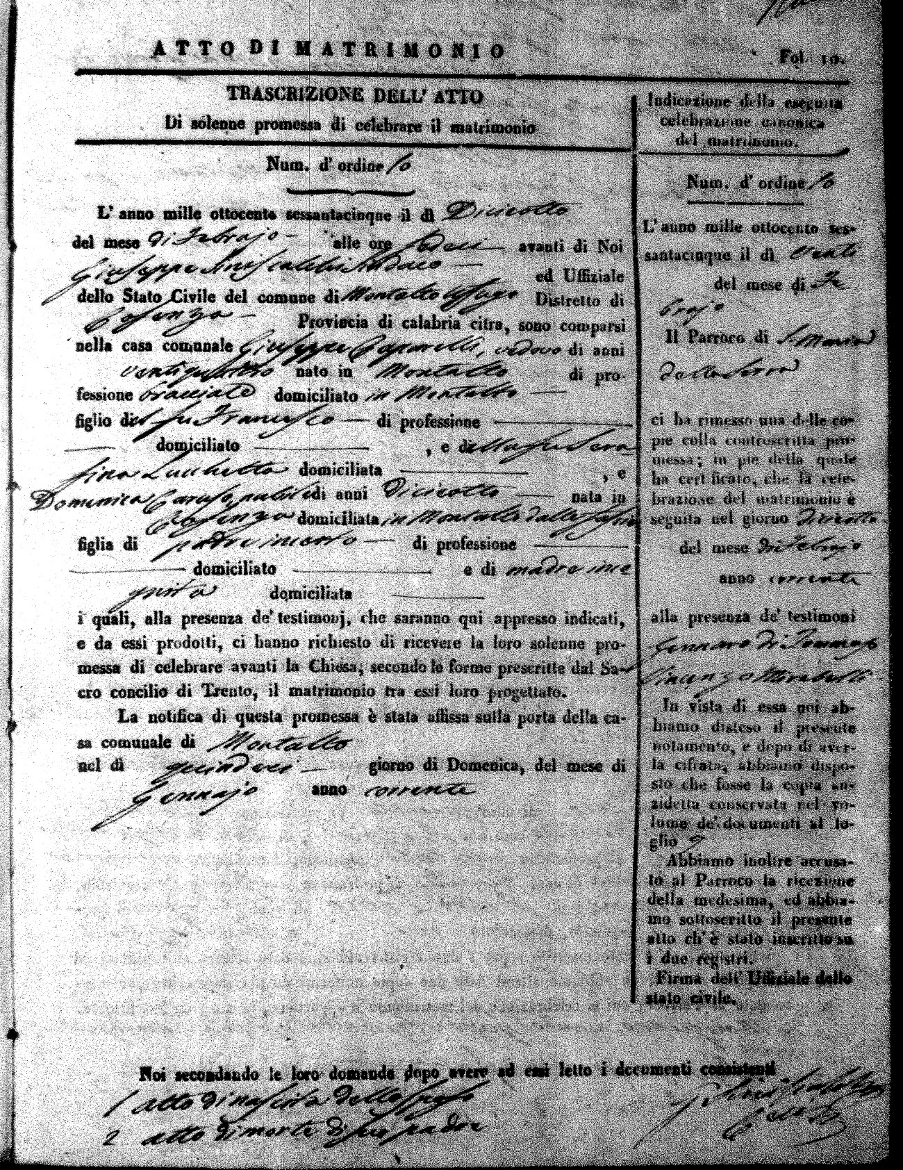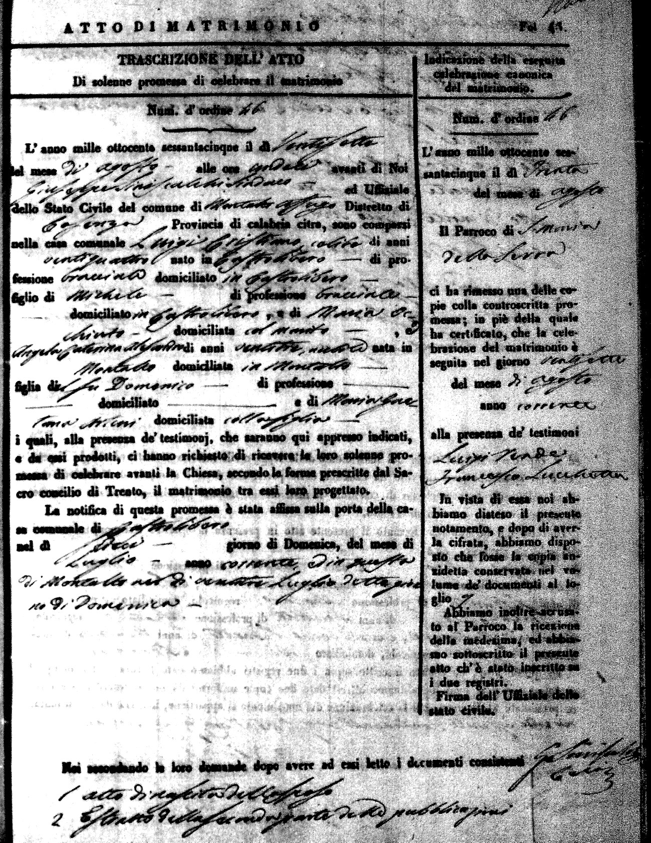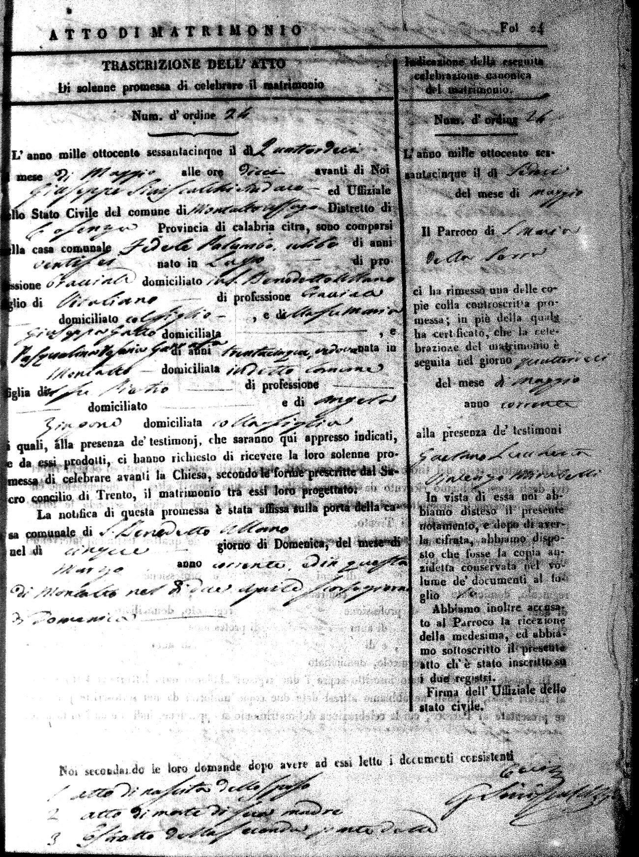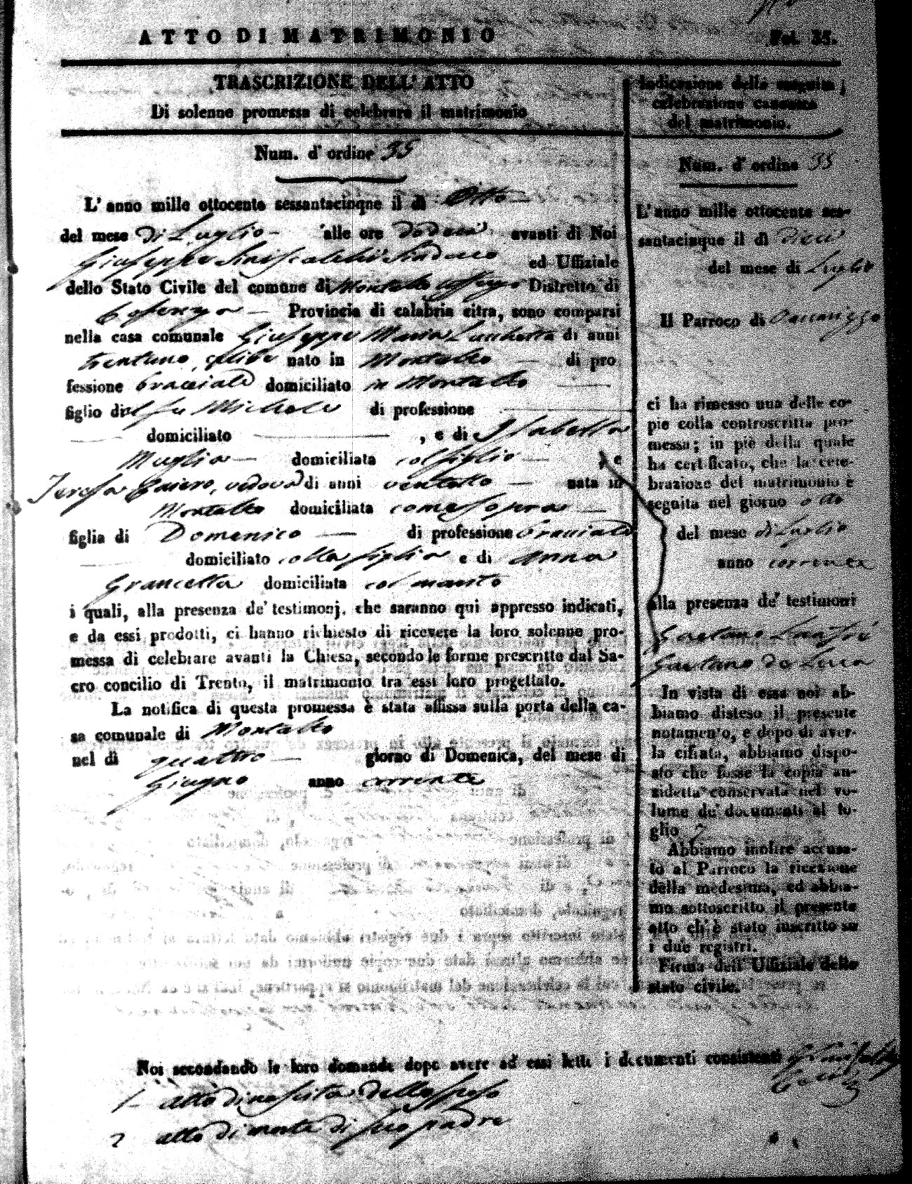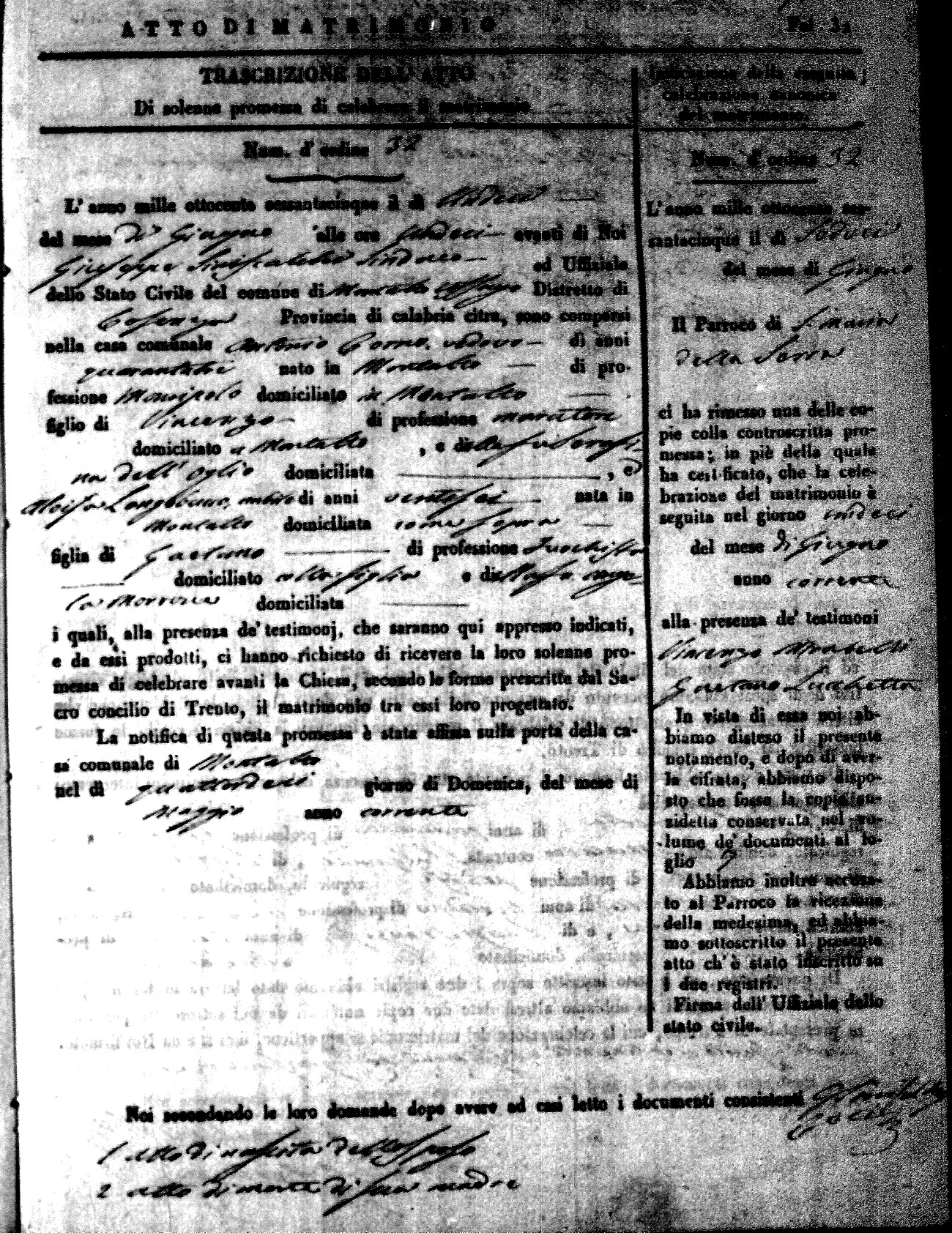 Here are the extractions for all the marriage acts in 1865 for Montalto Uffugo. When you see (fu) next to the parents names, that indicates that they were deceased at the time the marriage took place. For more information, click on the groom's surname to view a copy of the original document.