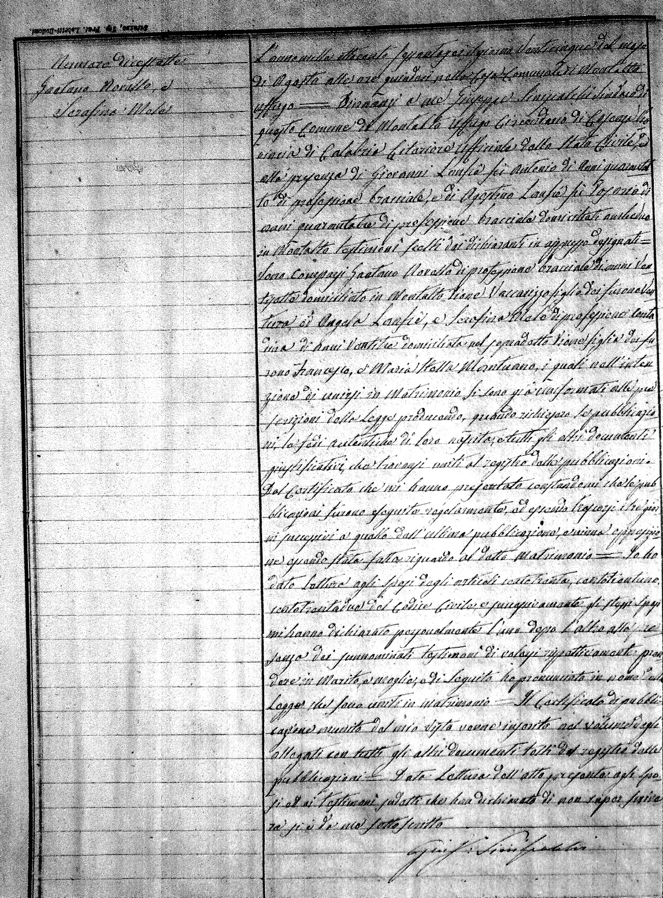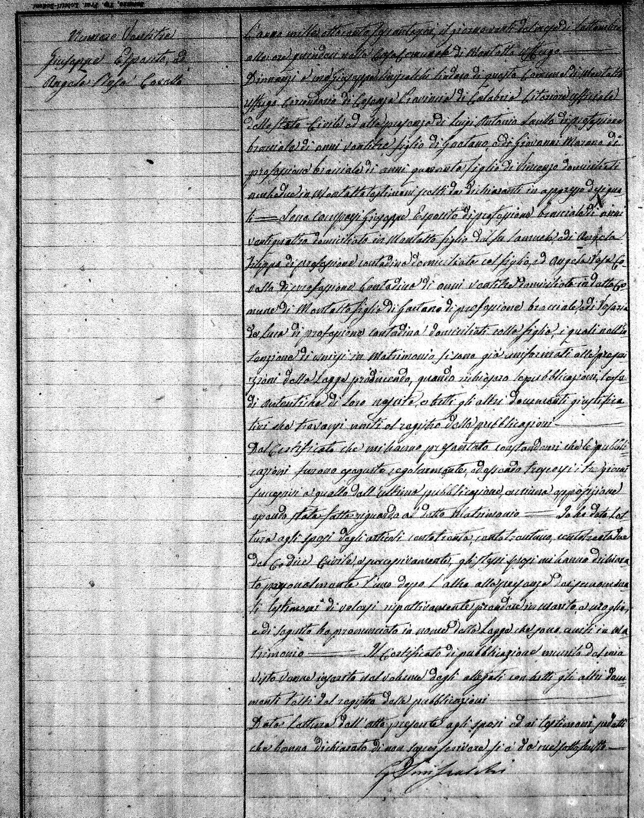 Here are the extractions for all the marriage acts in 1866 for Montalto Uffugo. To save time we have only transcribed the names of the groom and bride. For more information, click on the groom's surname to view a copy of the original document.