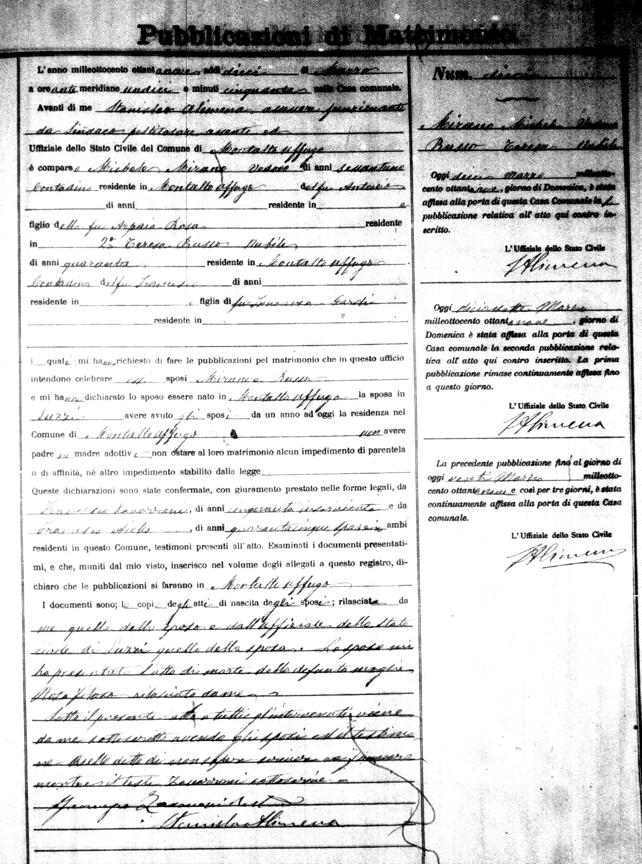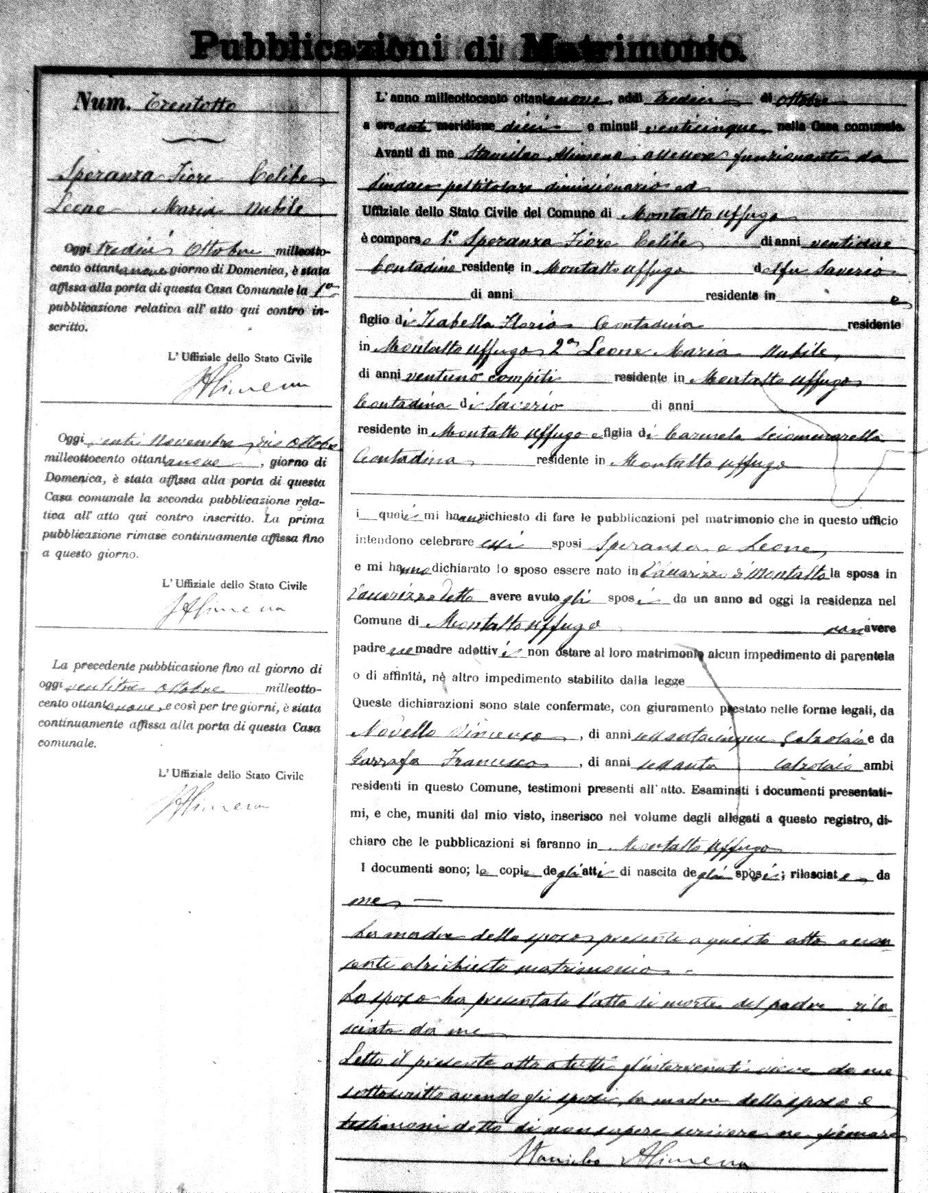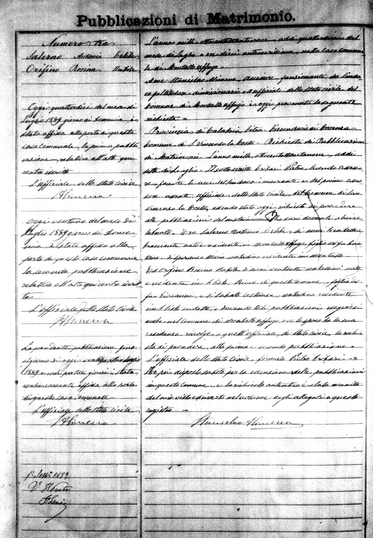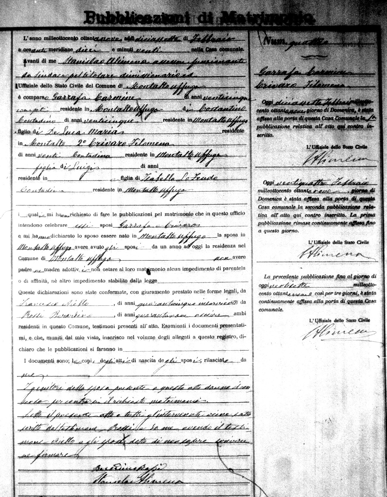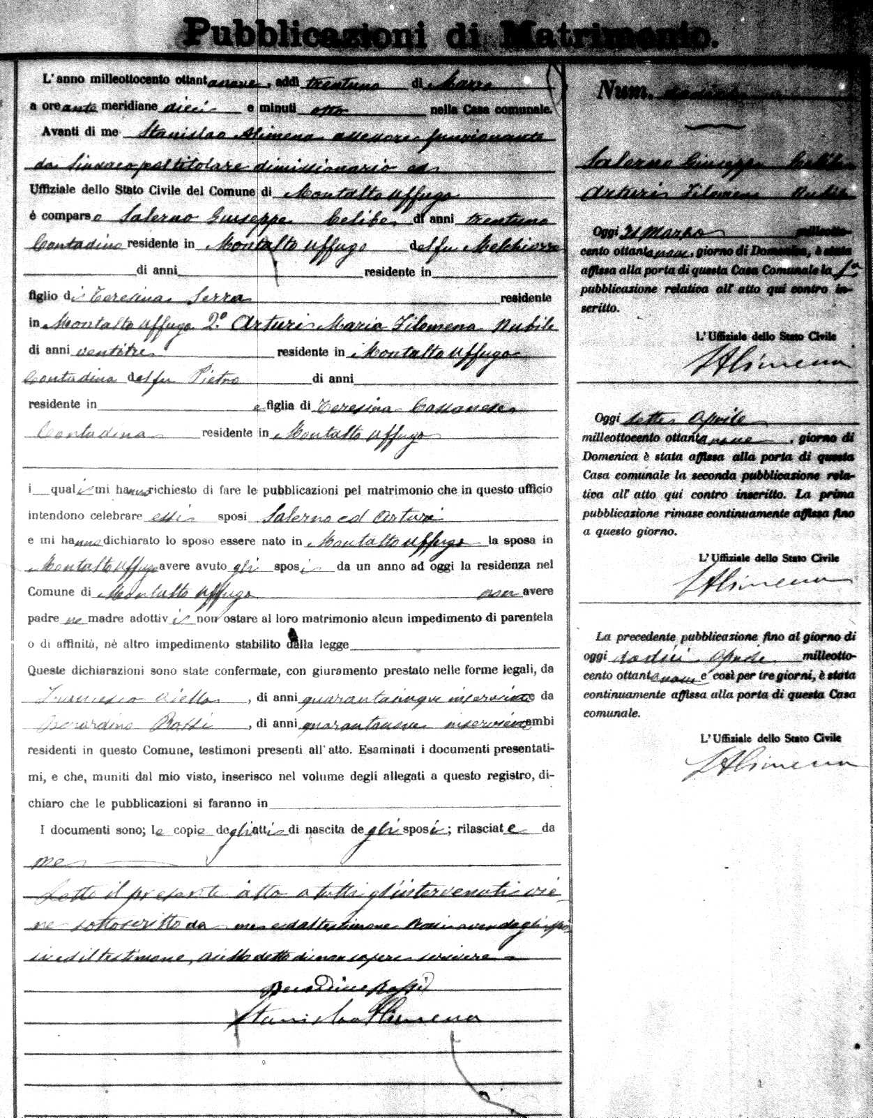 Here are the extractions for the marriage banns in 1889 for Montalto Uffugo. Each extraction has a link to a copy of the original document on the groom's surname. Please note: (fu) indicates the the person was deceased at the time of the marriage bann. For a translation of the basic Pubblicazioni document, look here.