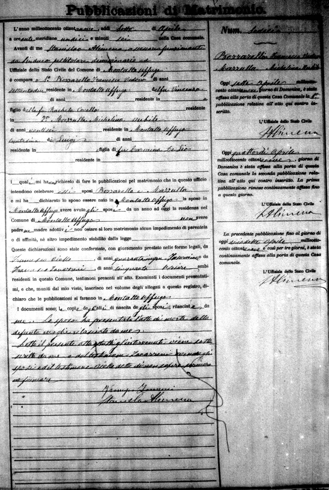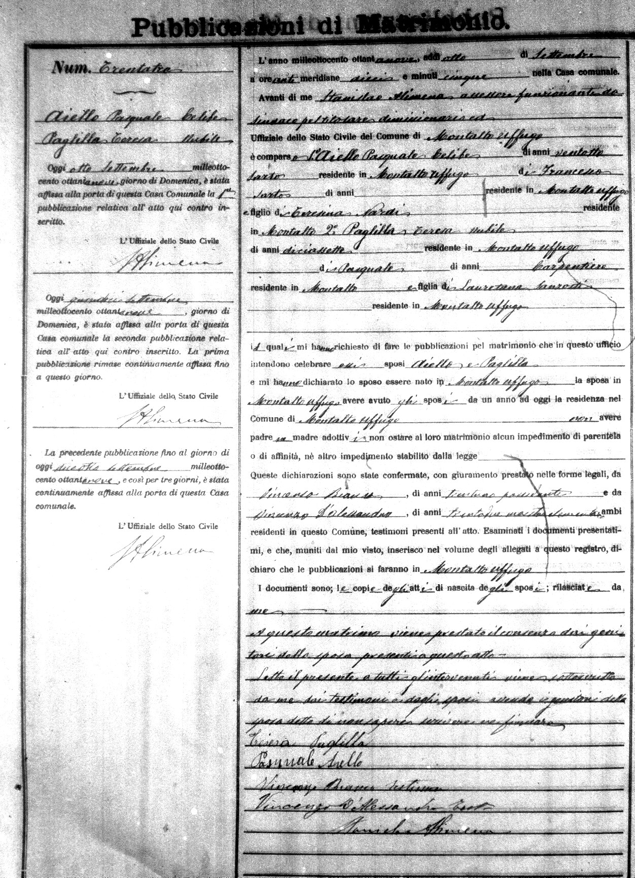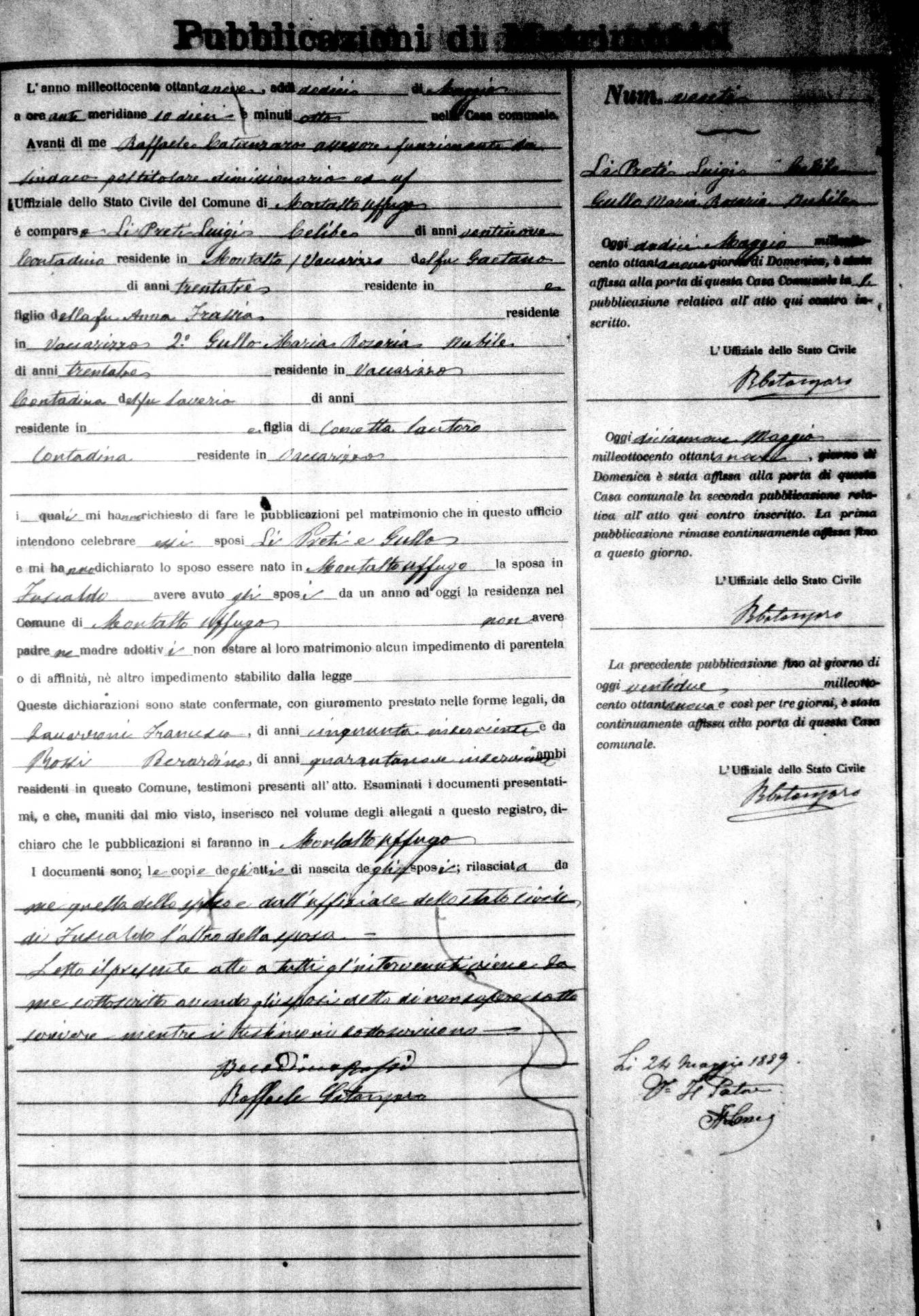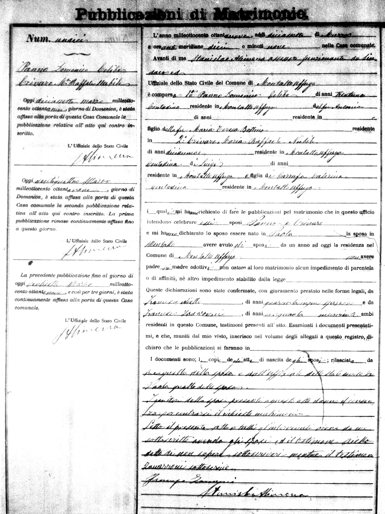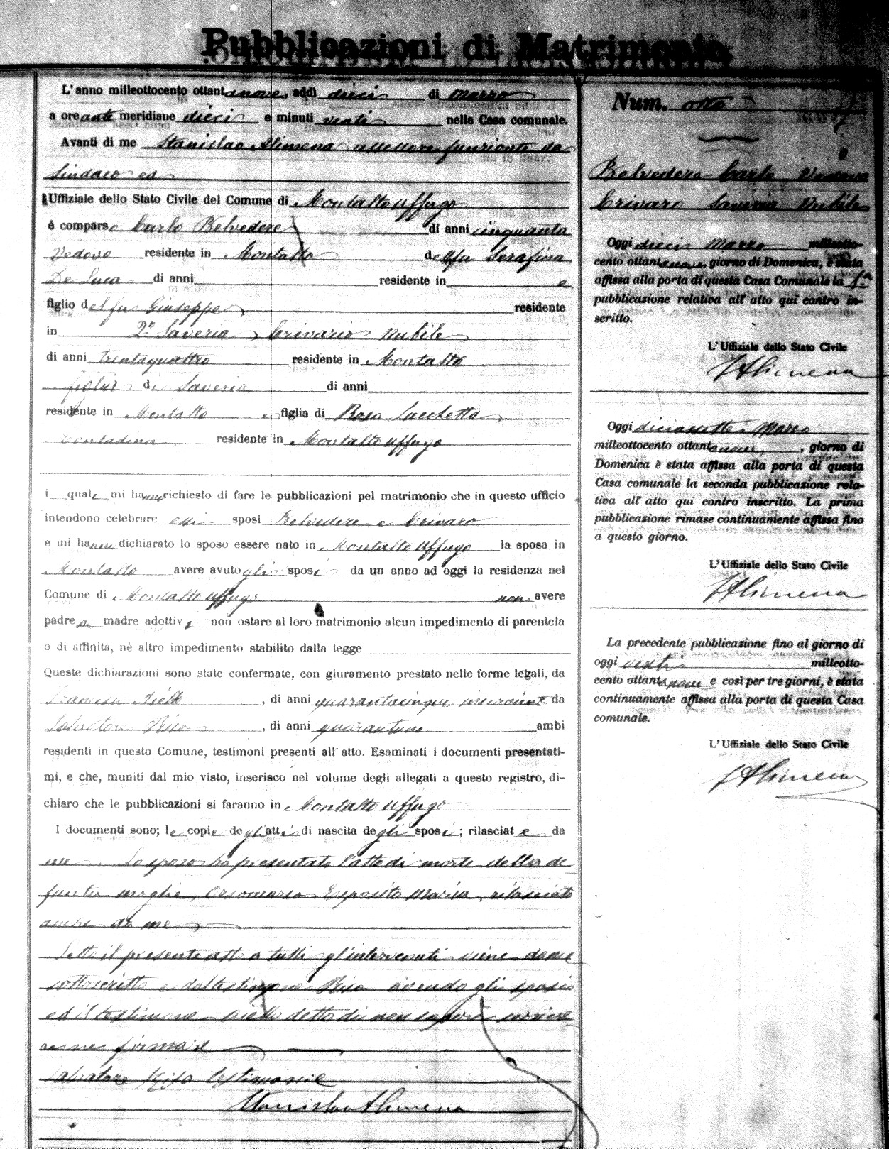 Here are the extractions for the marriage banns in 1889 for Montalto Uffugo. Each extraction has a link to a copy of the original document on the groom's surname. Please note: (fu) indicates the the person was deceased at the time of the marriage bann. For a translation of the basic Pubblicazioni document, look here.