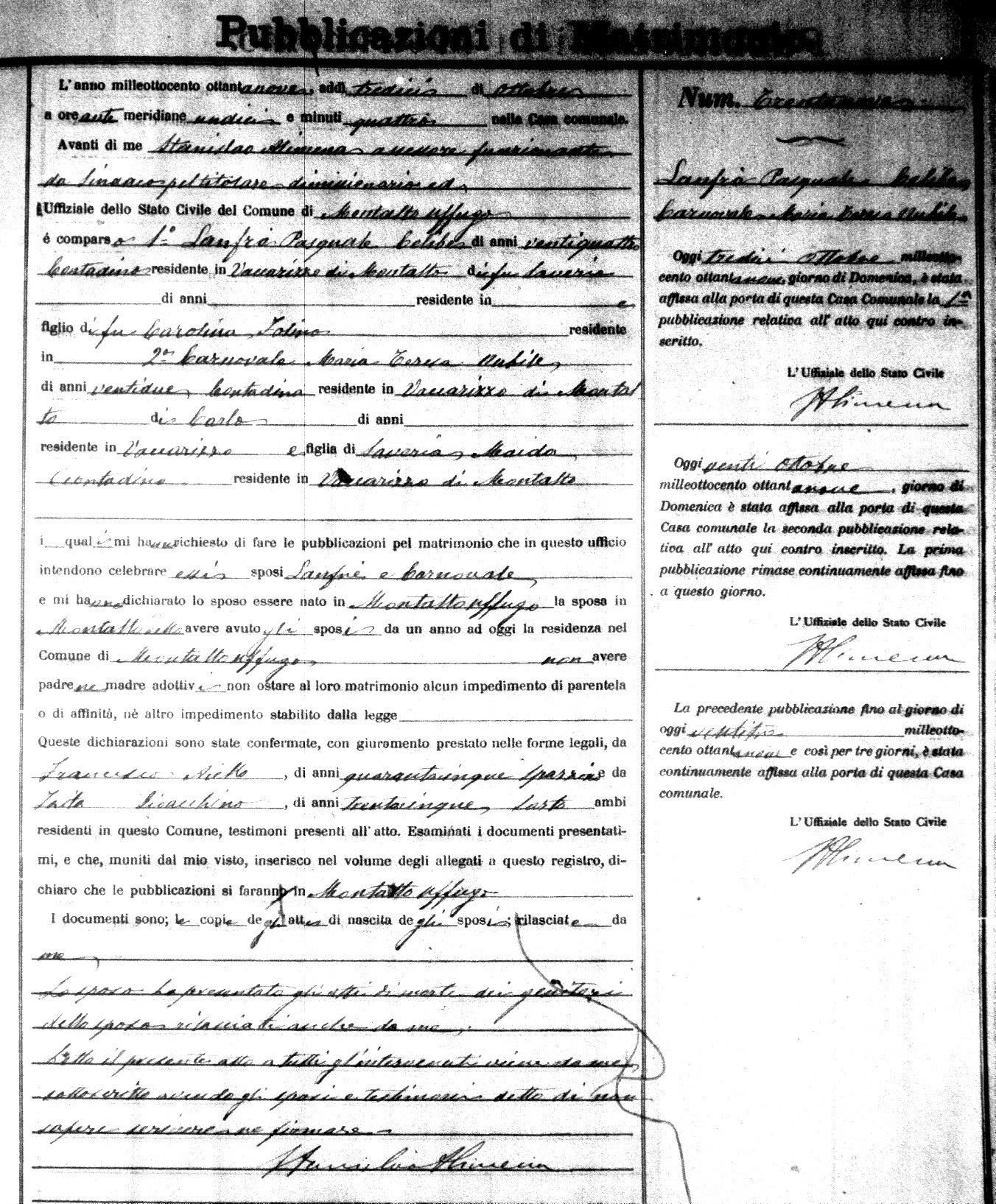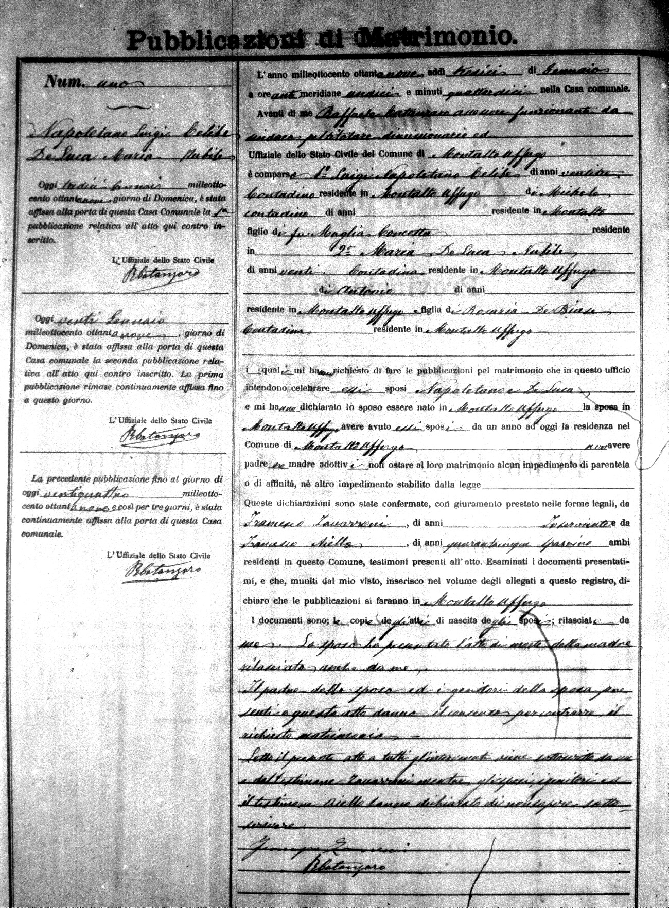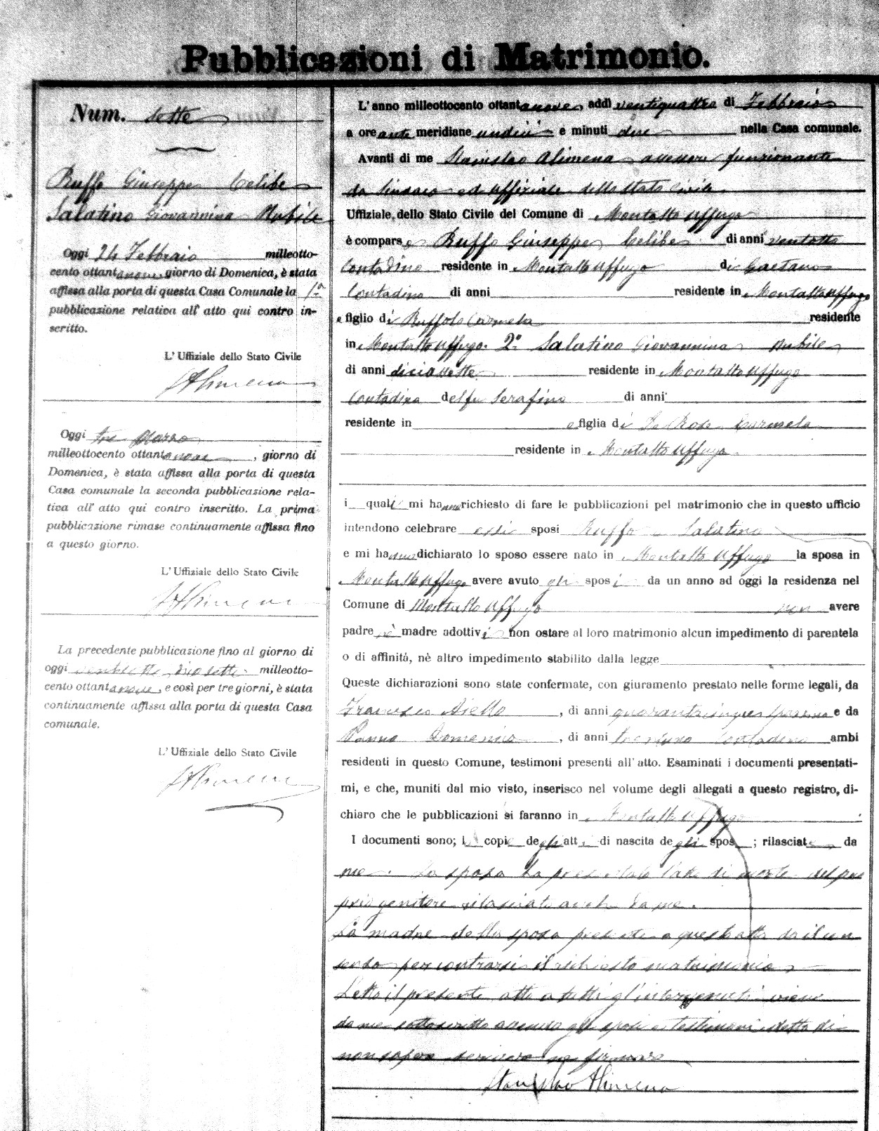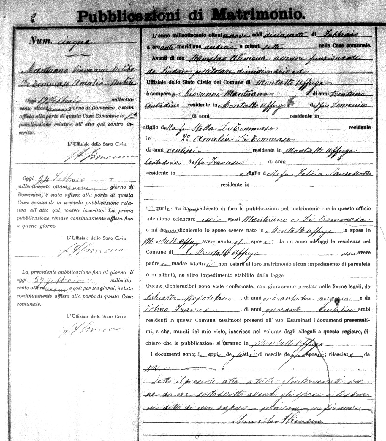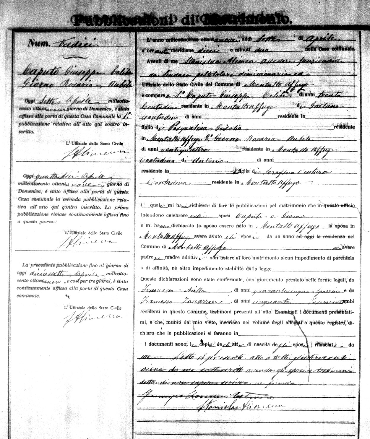 Here are the extractions for the marriage banns in 1889 for Montalto Uffugo. Each extraction has a link to a copy of the original document on the groom's surname. Please note: (fu) indicates the the person was deceased at the time of the marriage bann. For a translation of the basic Pubblicazioni document, look here.