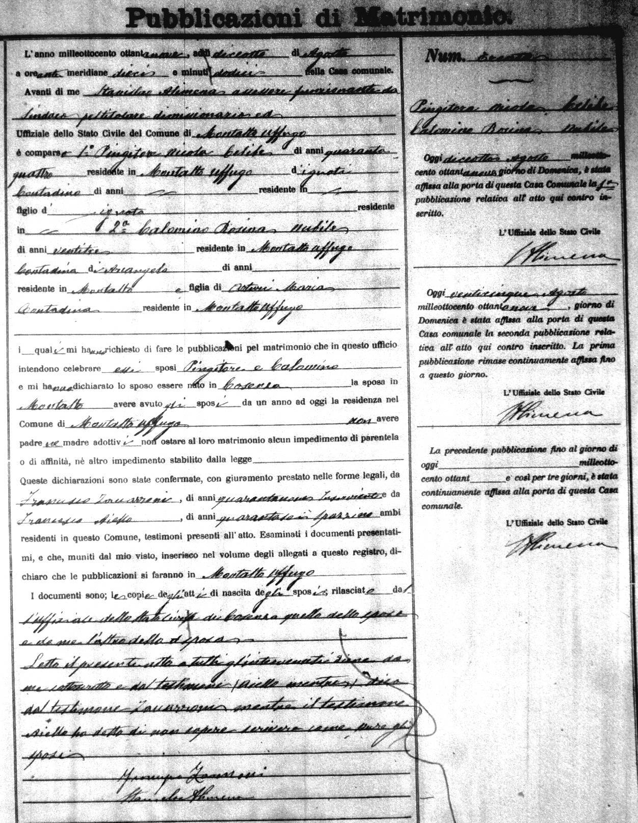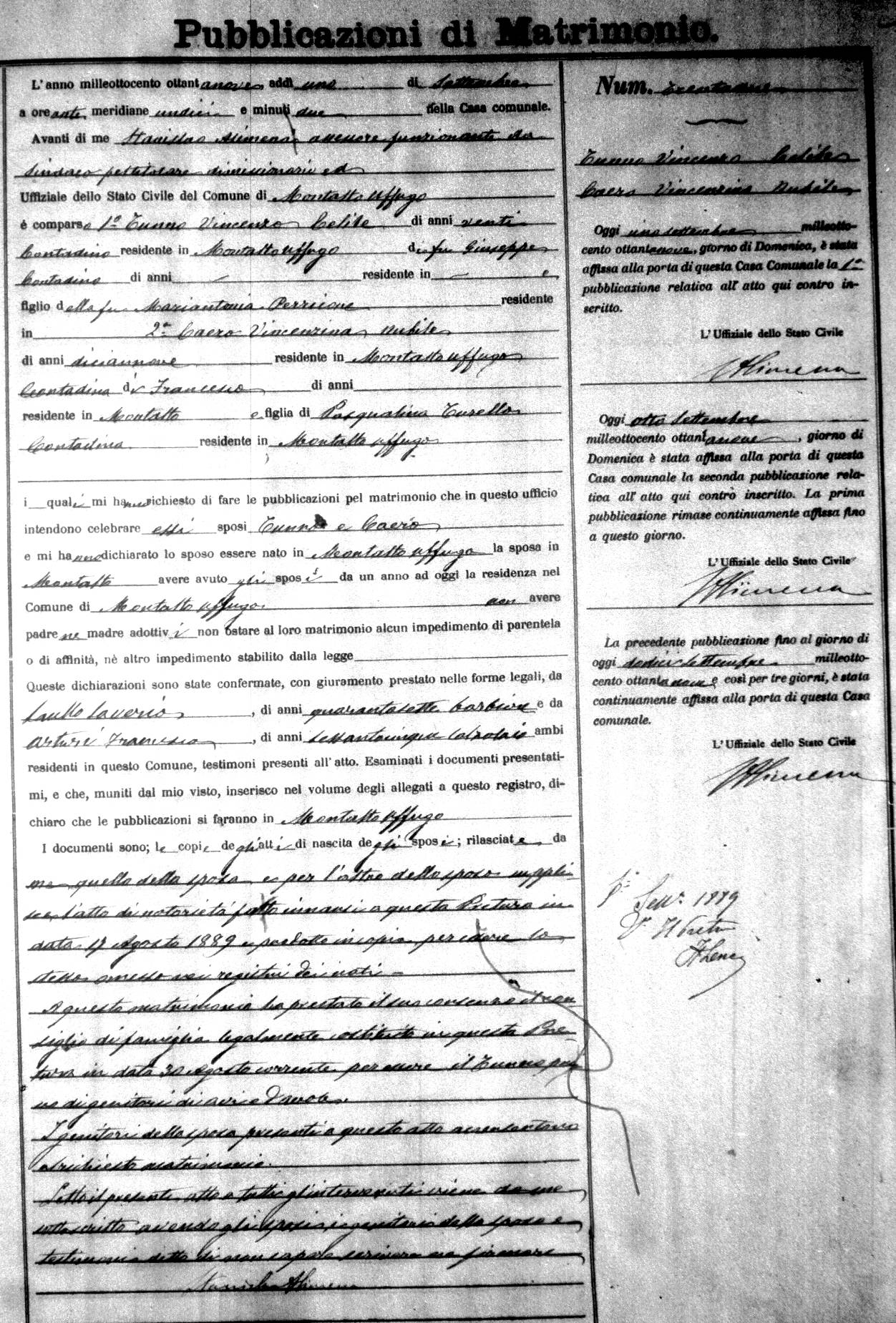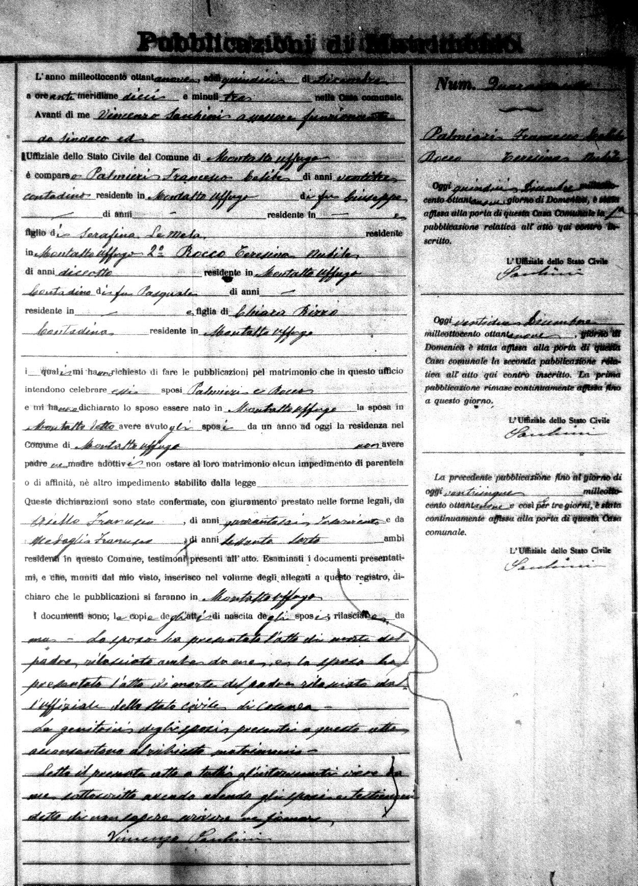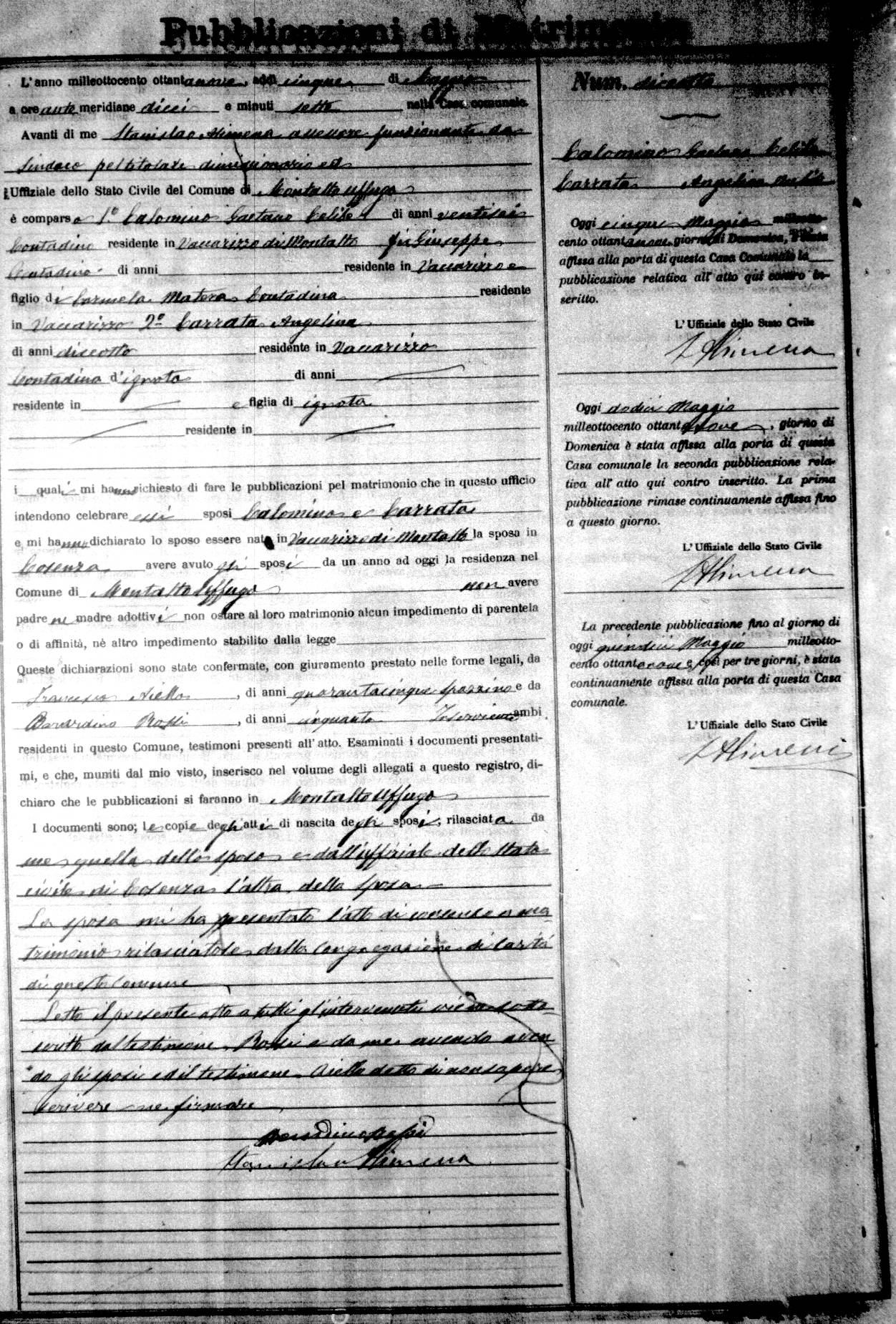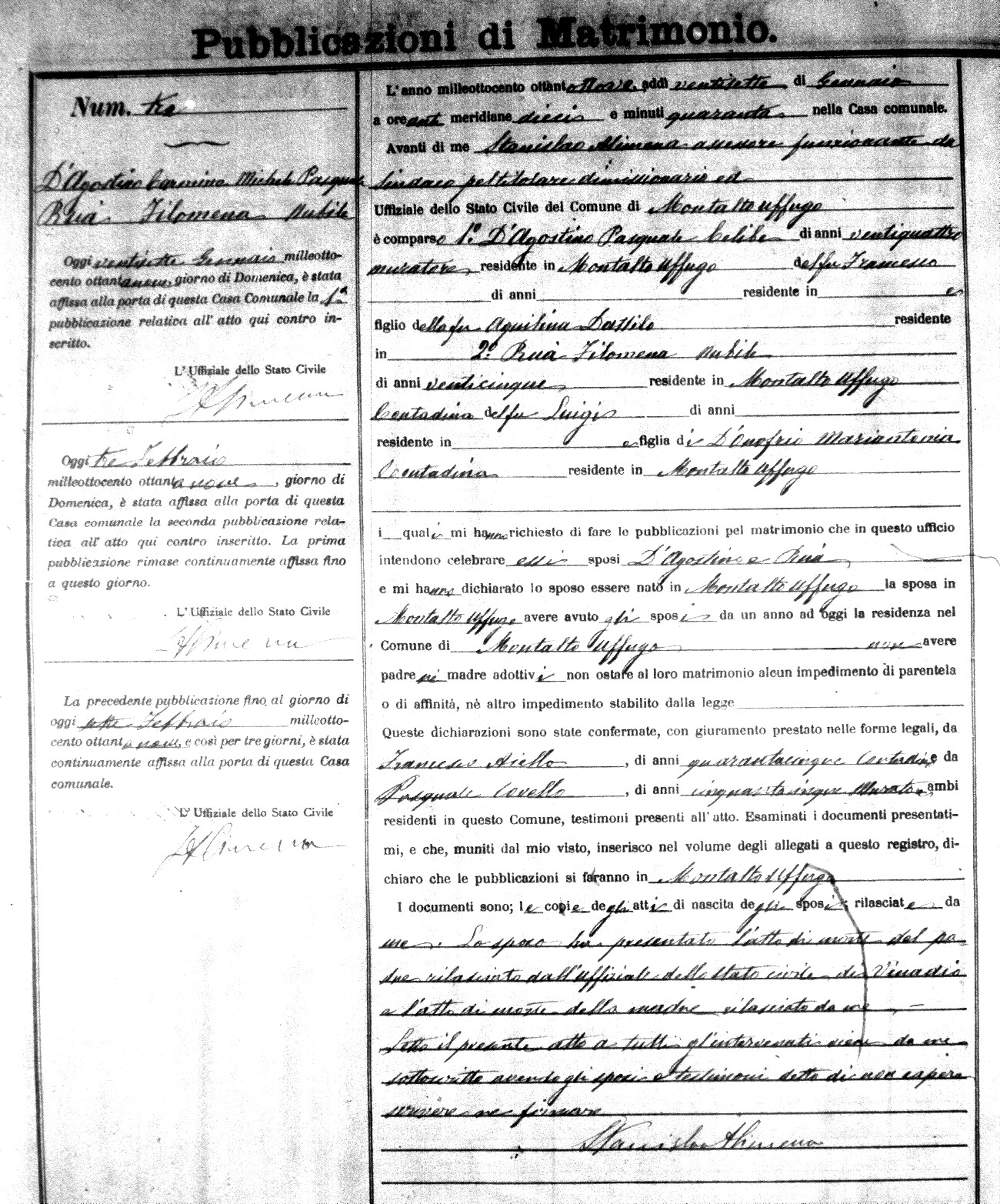 Here are the extractions for the marriage banns in 1889 for Montalto Uffugo. Each extraction has a link to a copy of the original document on the groom's surname. Please note: (fu) indicates the the person was deceased at the time of the marriage bann. For a translation of the basic Pubblicazioni document, look here.