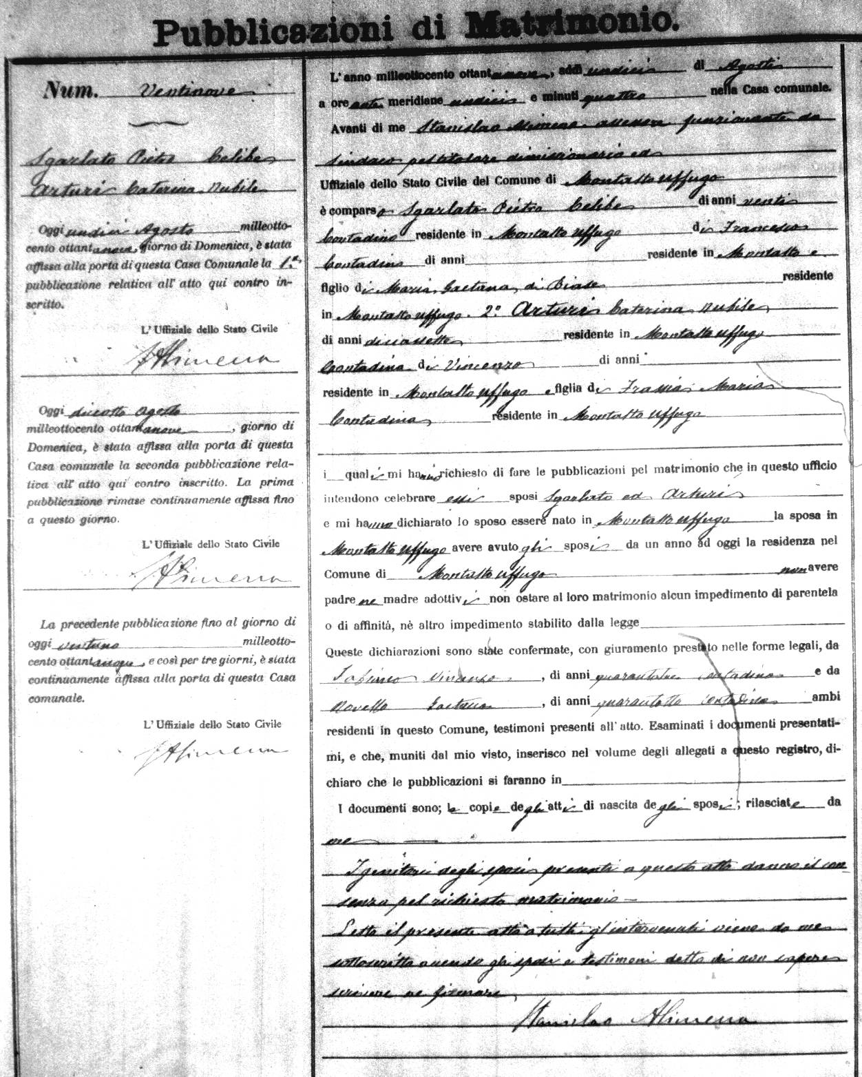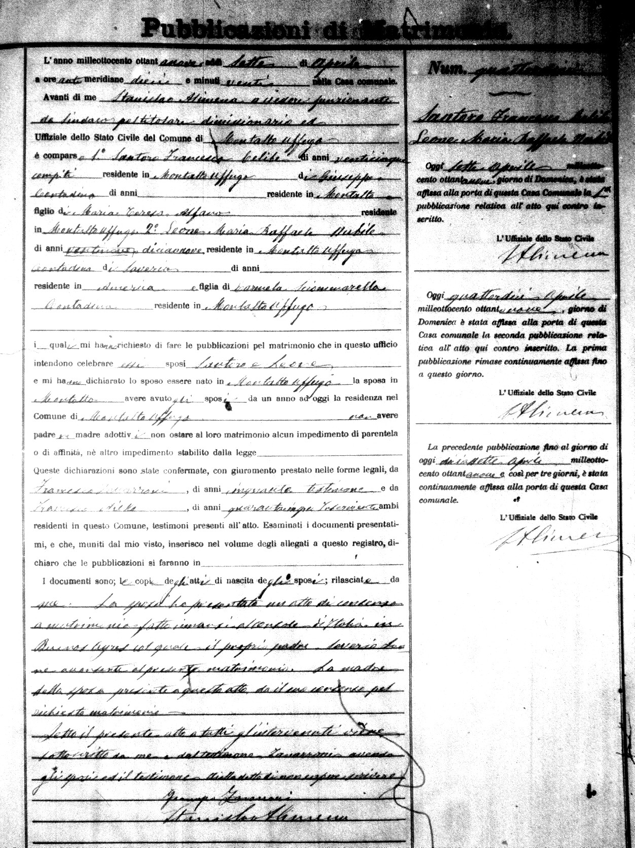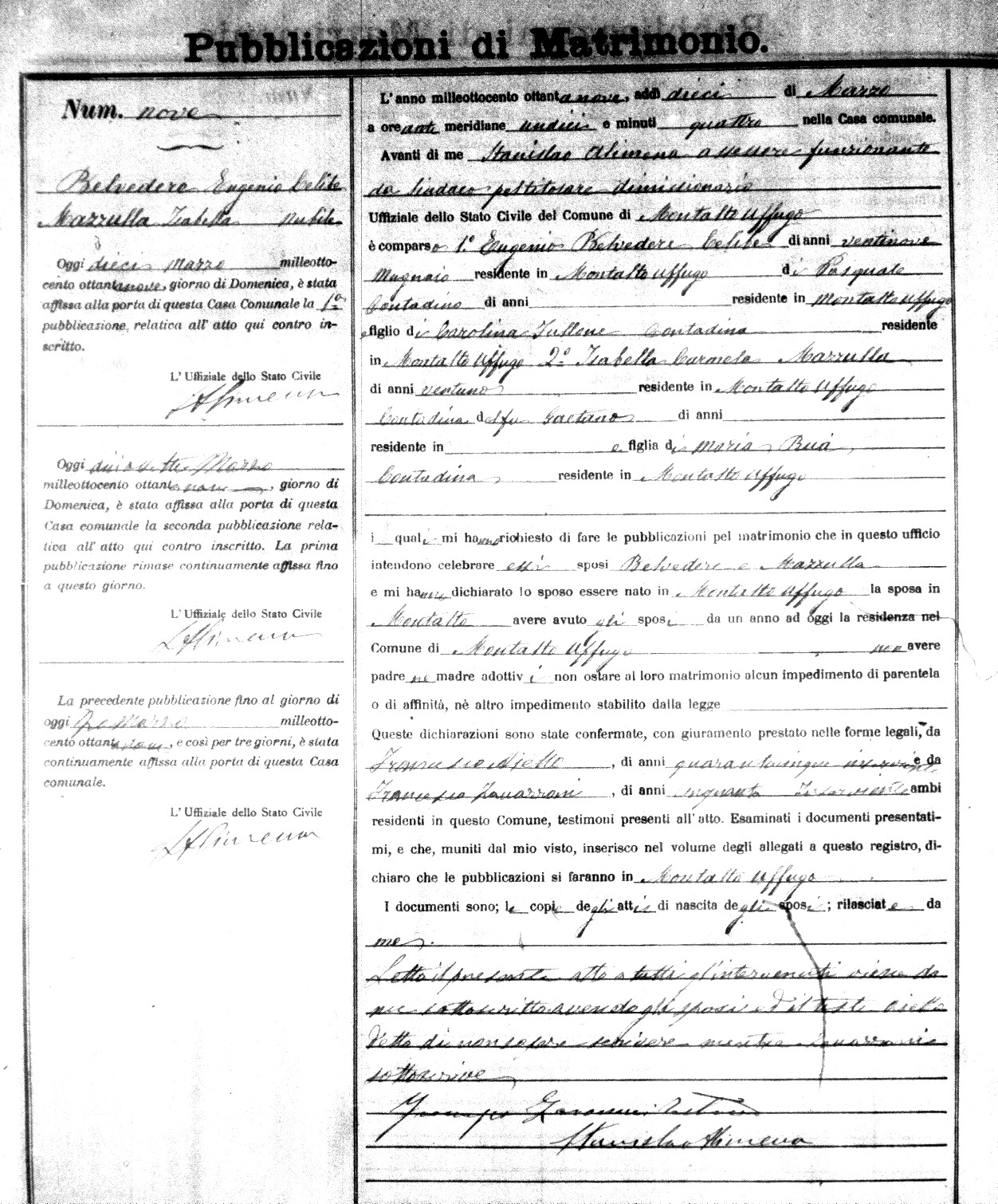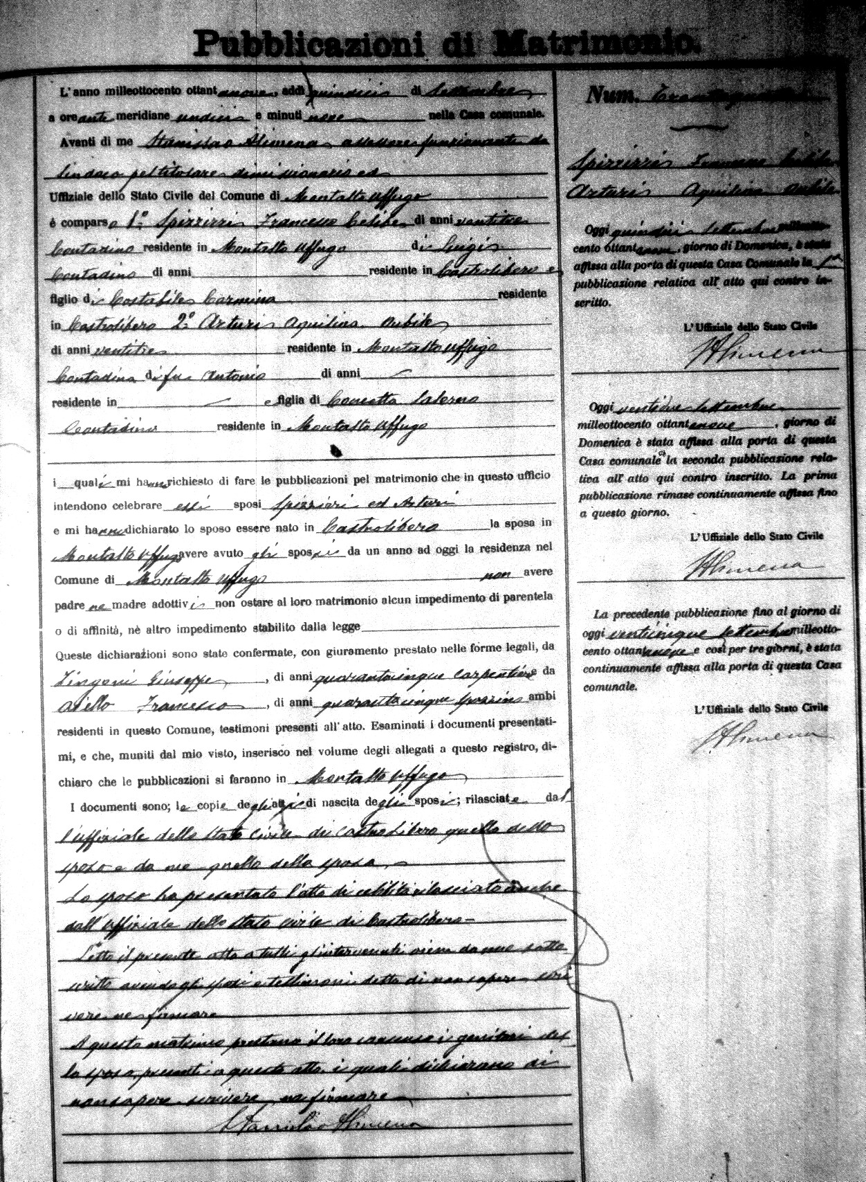 Here are the extractions for the marriage banns in 1889 for Montalto Uffugo. Each extraction has a link to a copy of the original document on the groom's surname. Please note: (fu) indicates the the person was deceased at the time of the marriage bann. For a translation of the basic Pubblicazioni document, look here.
