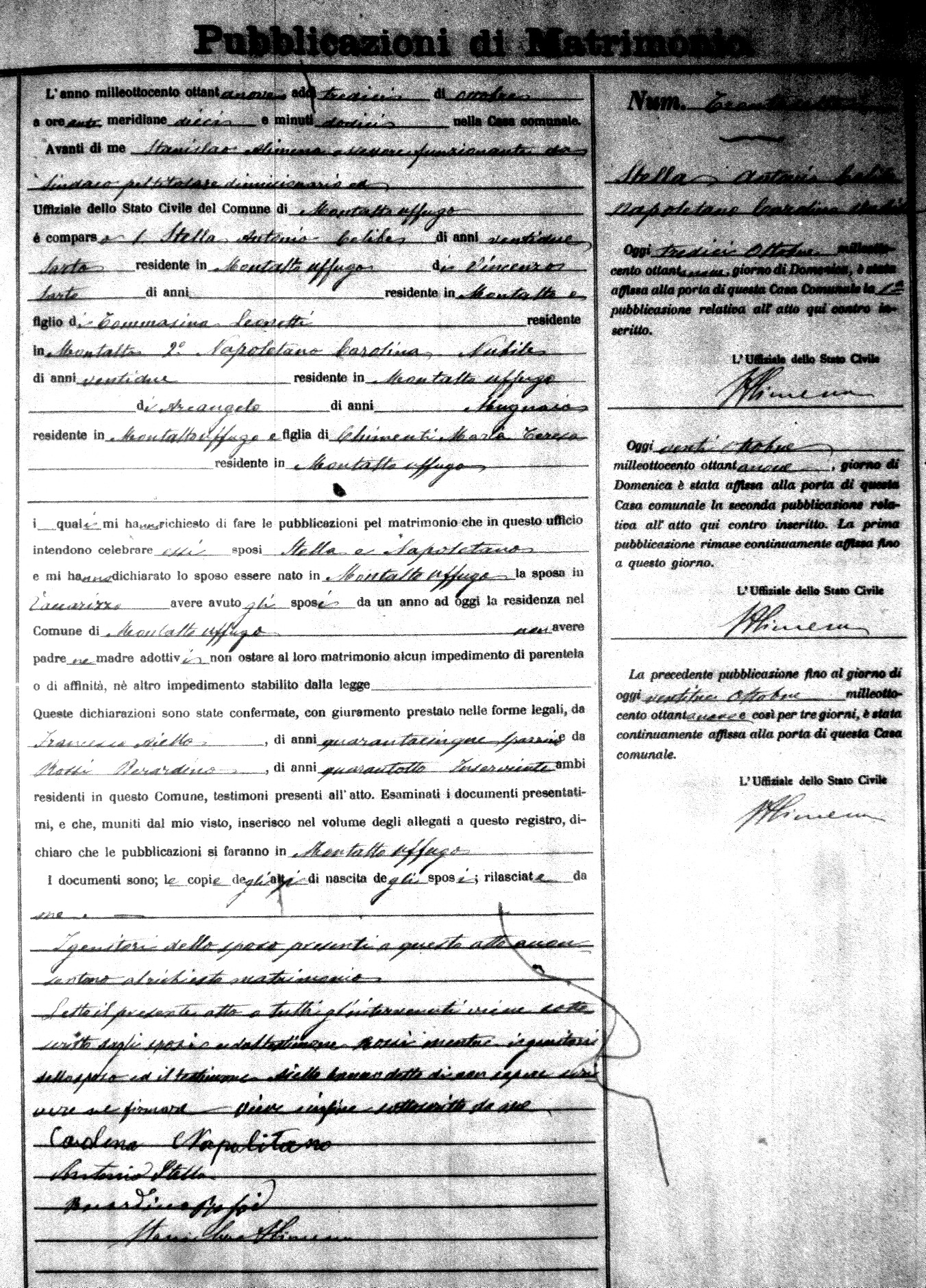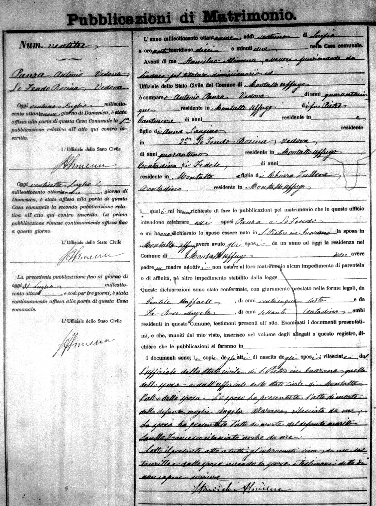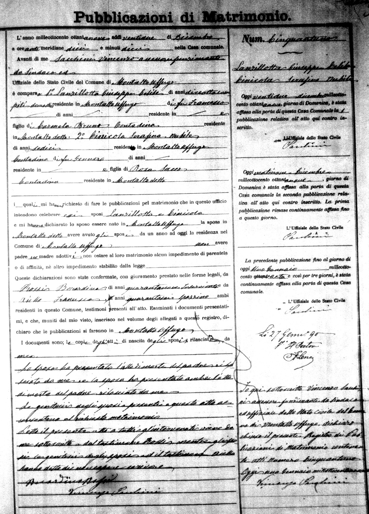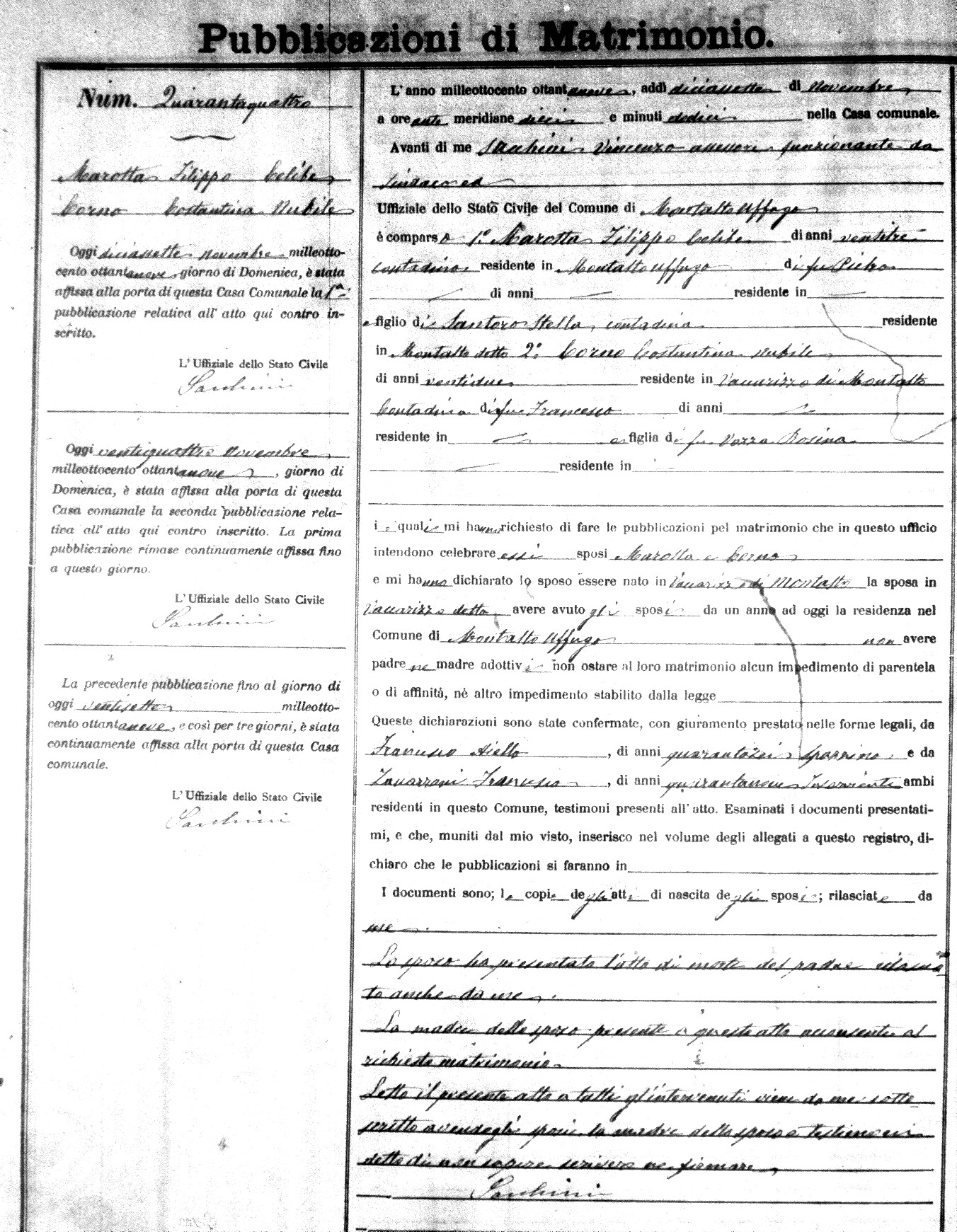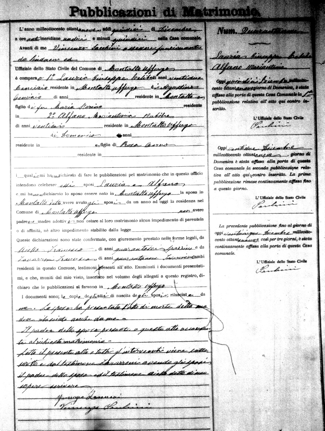 Here are the extractions for the marriage banns in 1889 for Montalto Uffugo. Each extraction has a link to a copy of the original document on the groom's surname. Please note: (fu) indicates the the person was deceased at the time of the marriage bann. For a translation of the basic Pubblicazioni document, look here.
