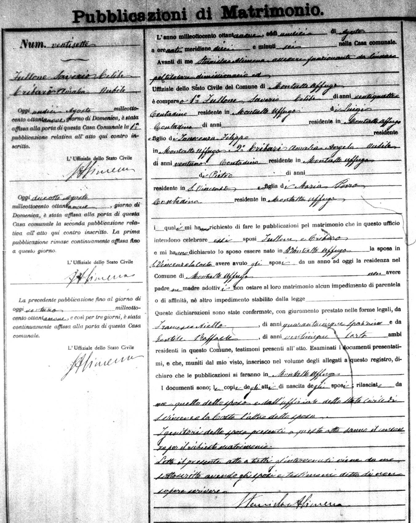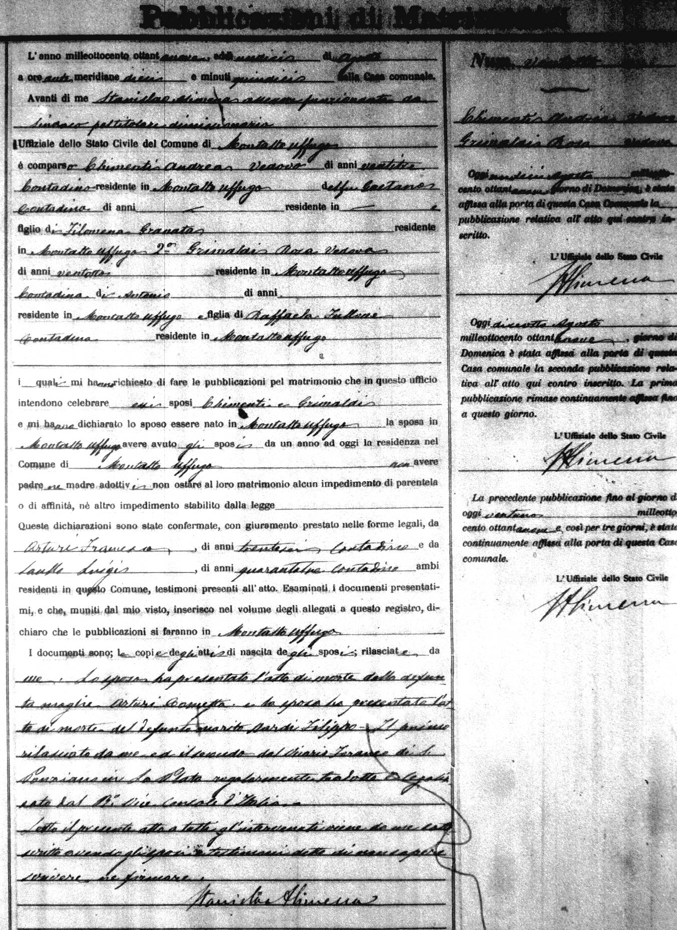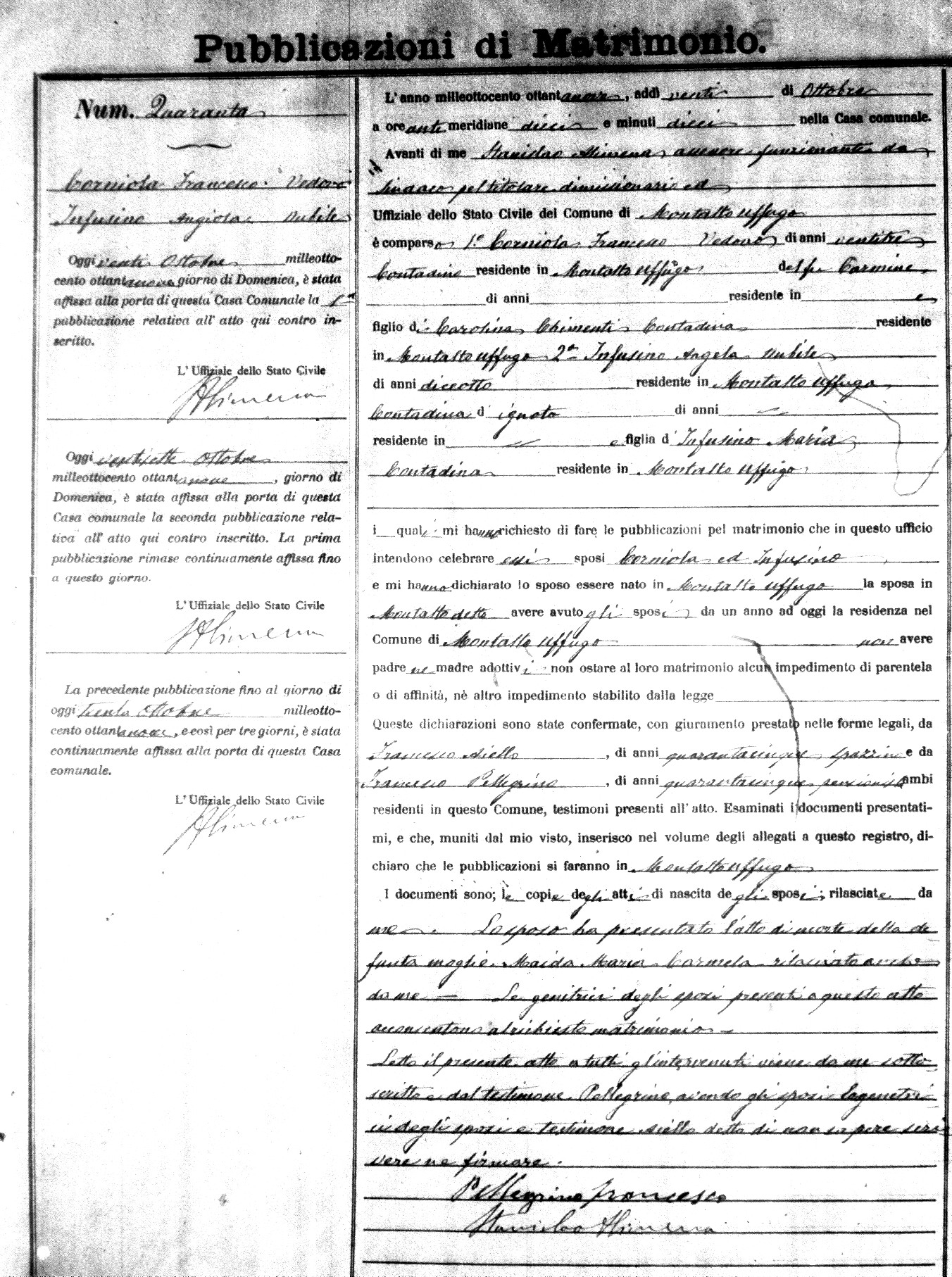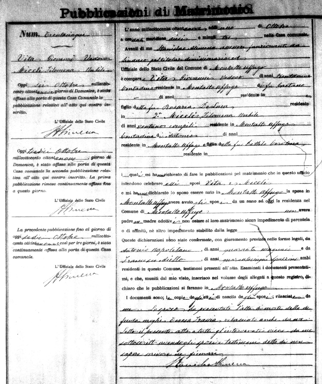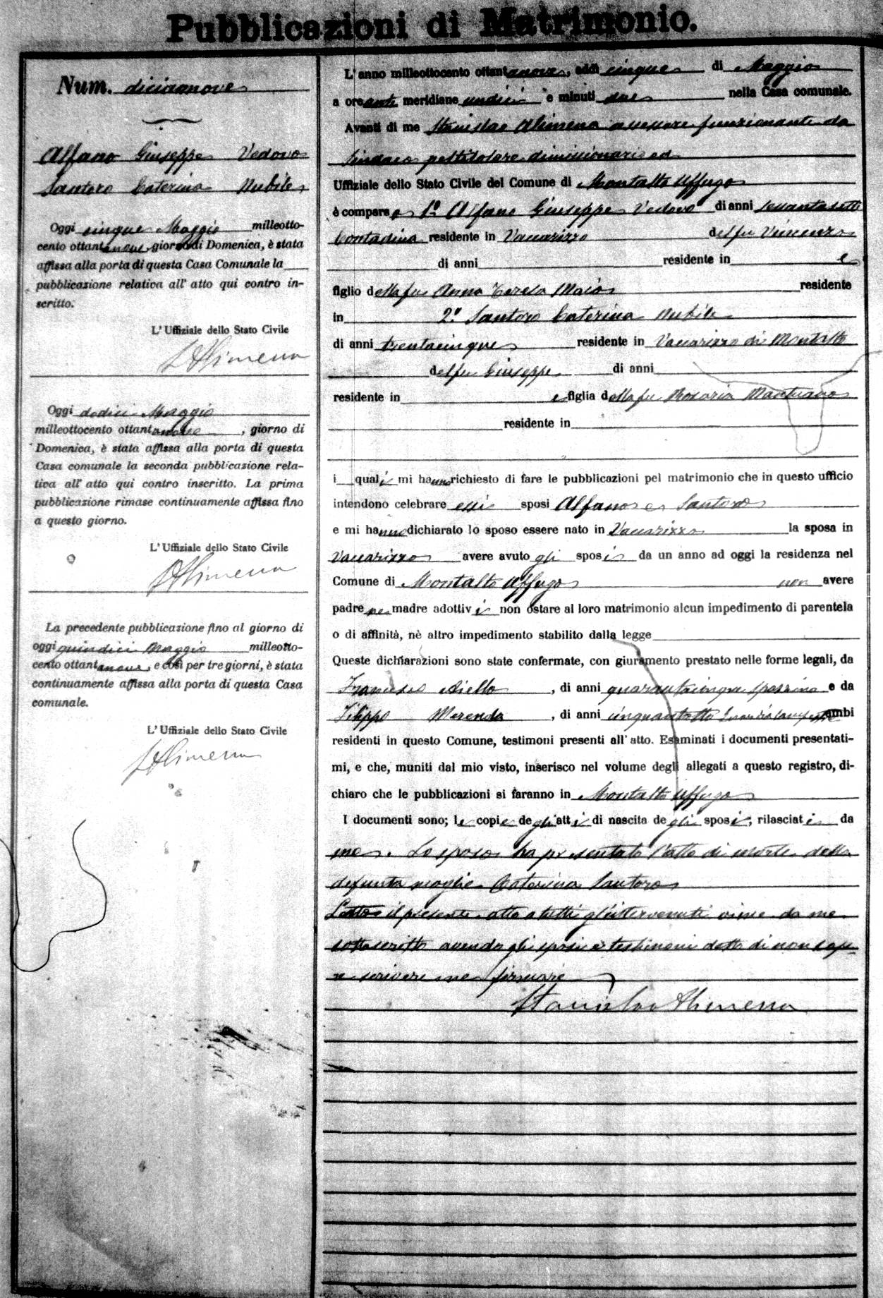 Here are the extractions for the marriage banns in 1889 for Montalto Uffugo. Each extraction has a link to a copy of the original document on the groom's surname. Please note: (fu) indicates the the person was deceased at the time of the marriage bann. For a translation of the basic Pubblicazioni document, look here.