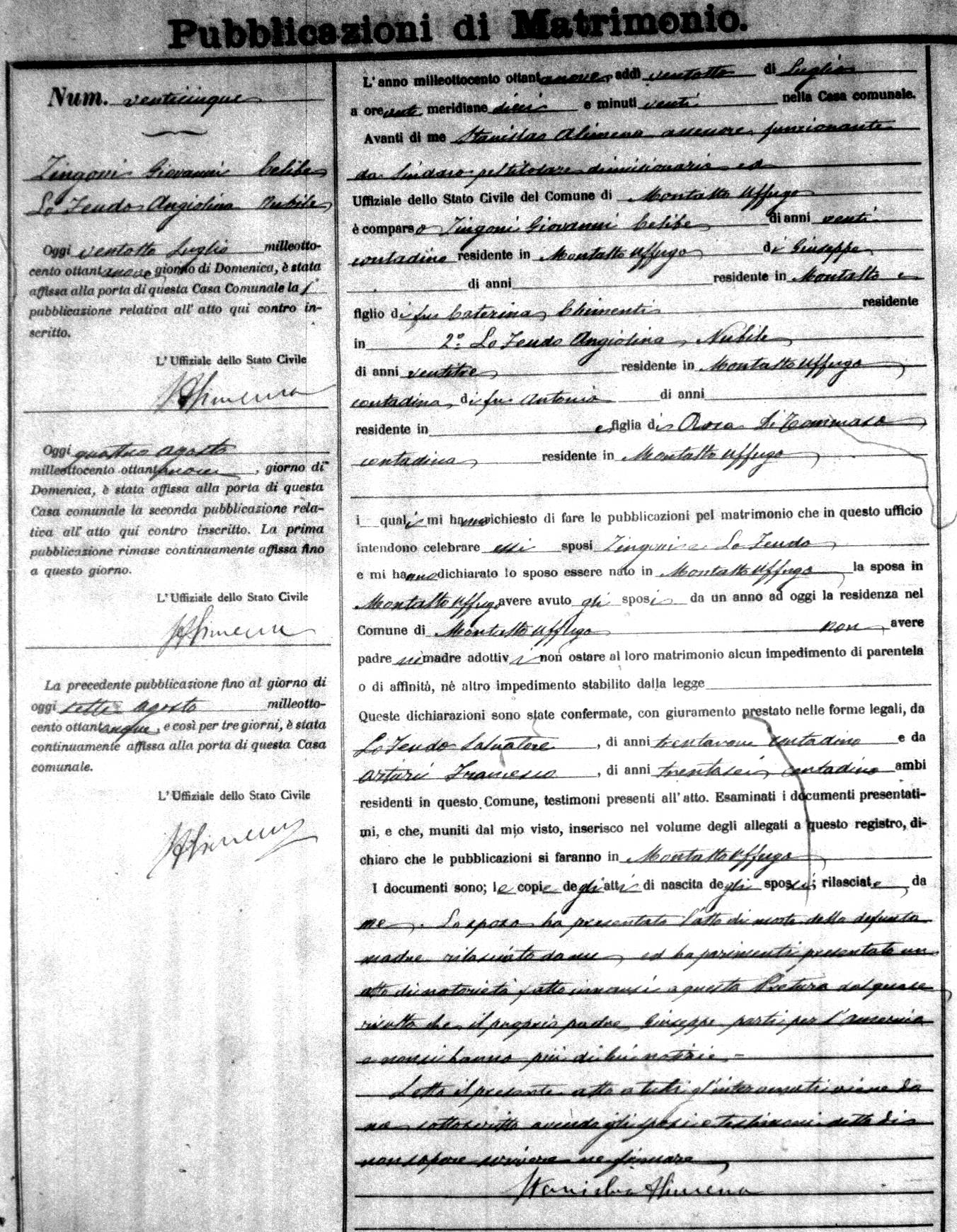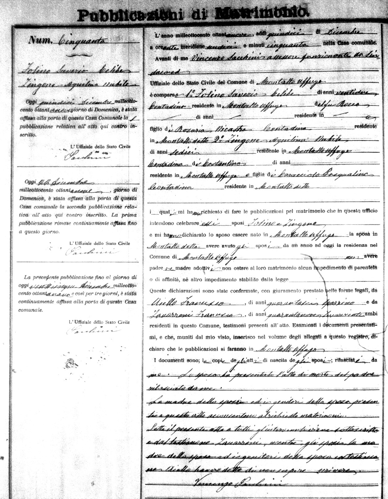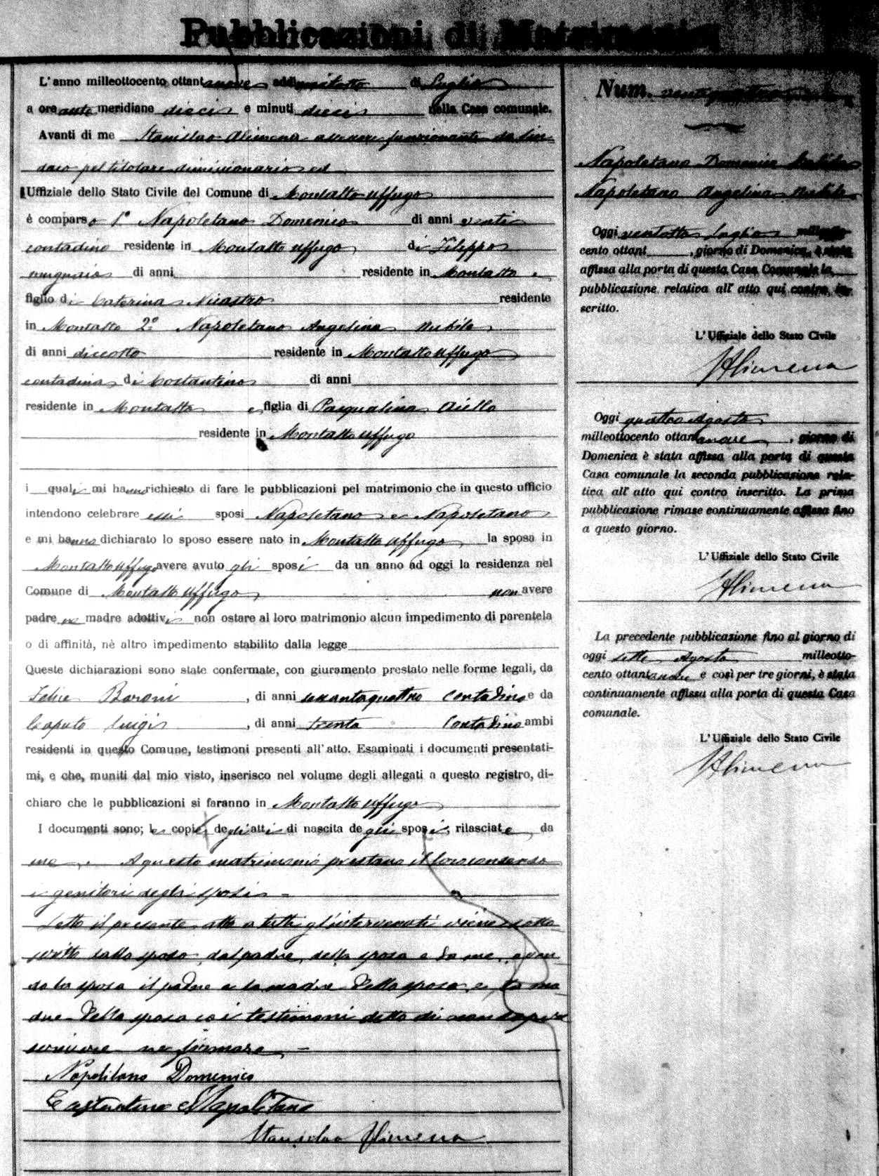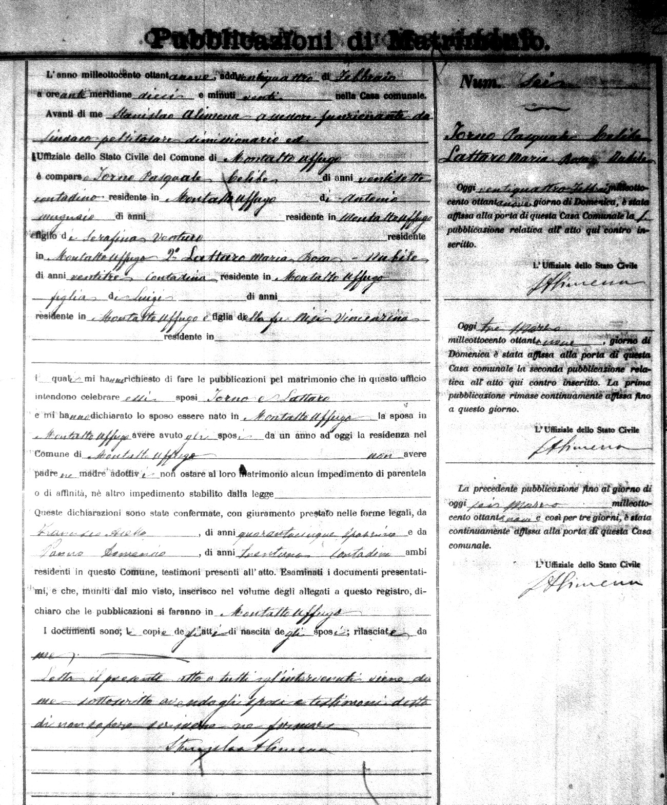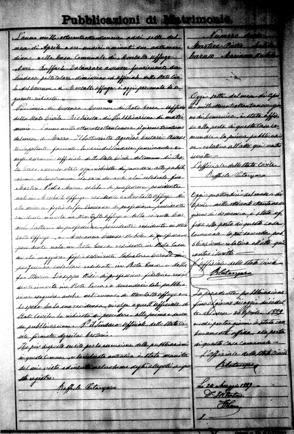 Here are the extractions for the marriage banns in 1889 for Montalto Uffugo. Each extraction has a link to a copy of the original document on the groom's surname. Please note: (fu) indicates the the person was deceased at the time of the marriage bann. For a translation of the basic Pubblicazioni document, look here.