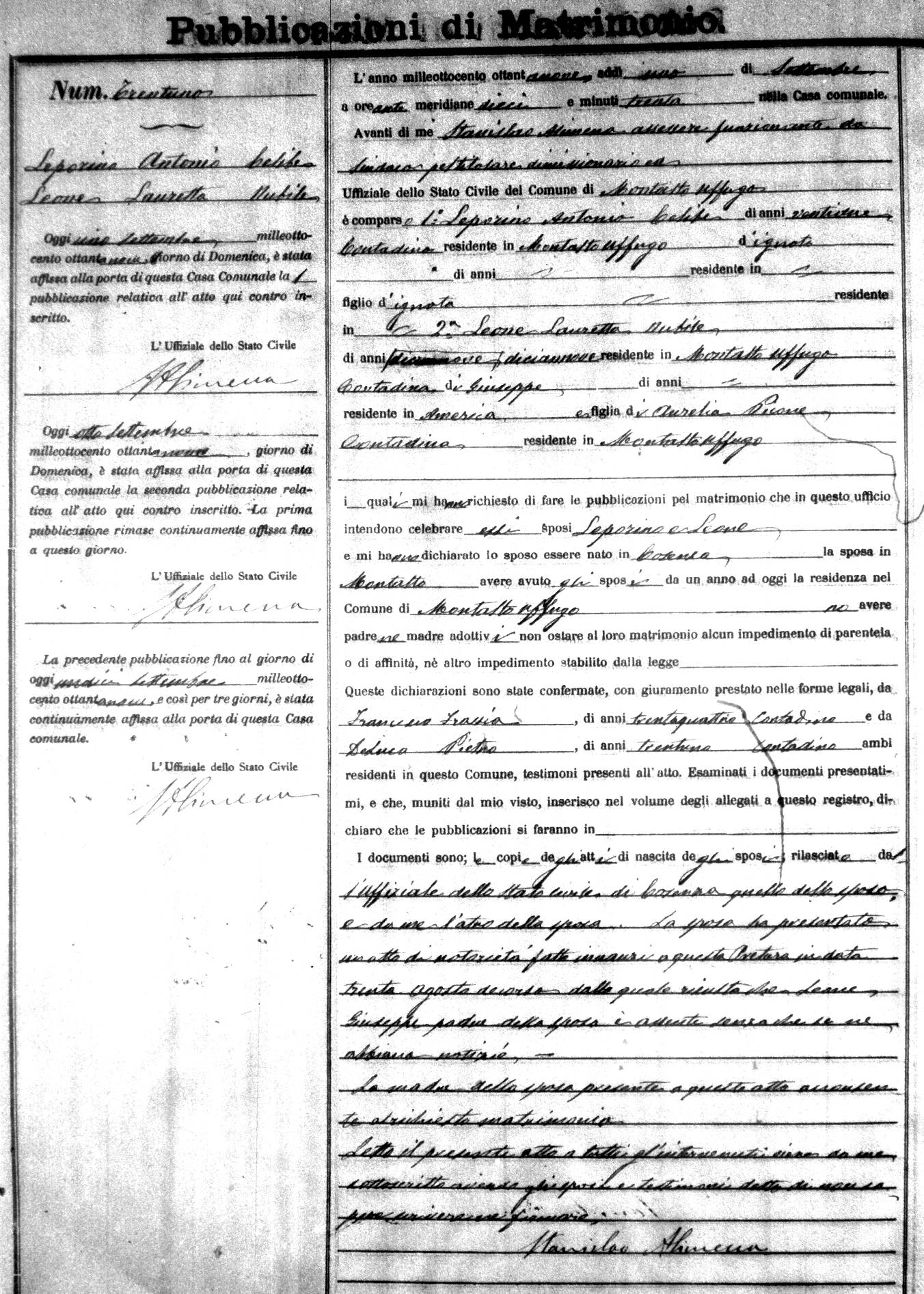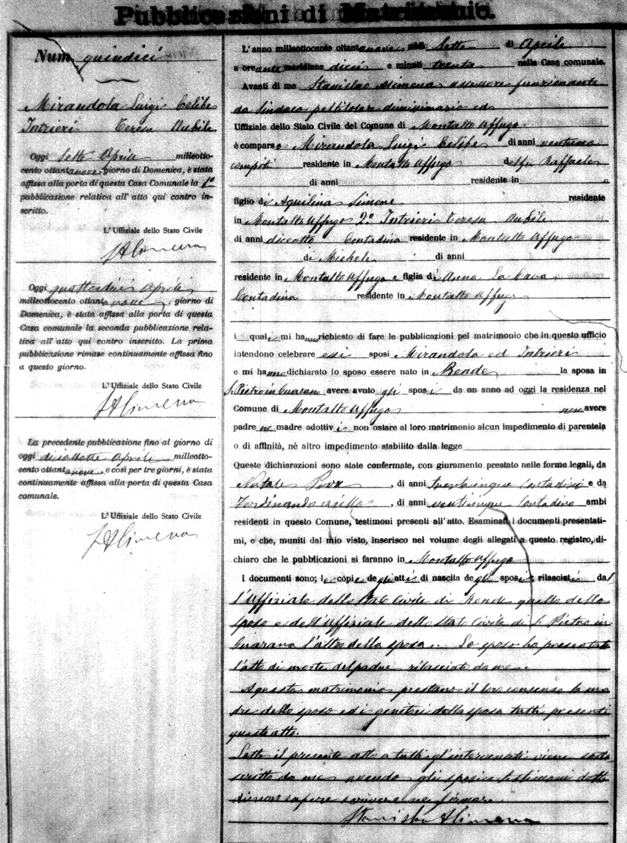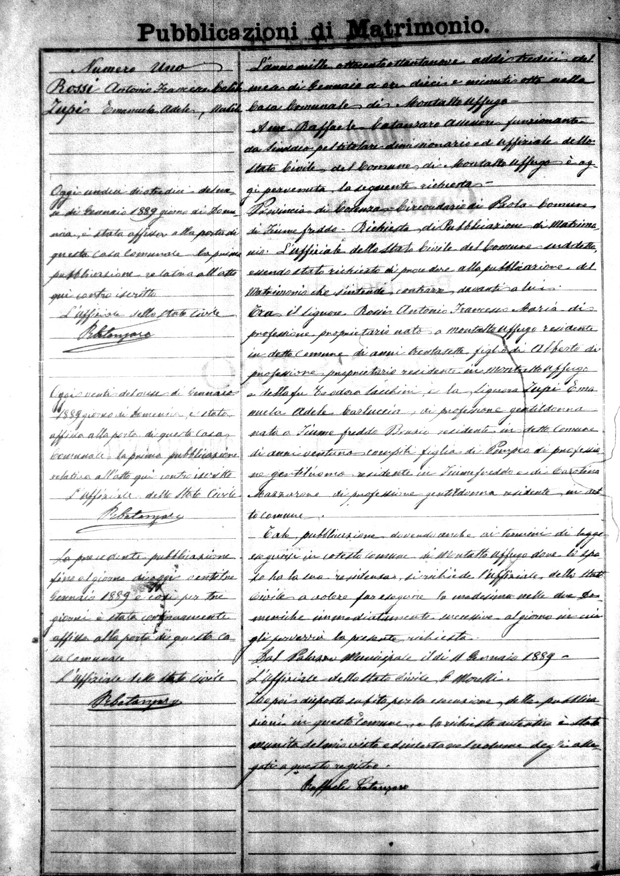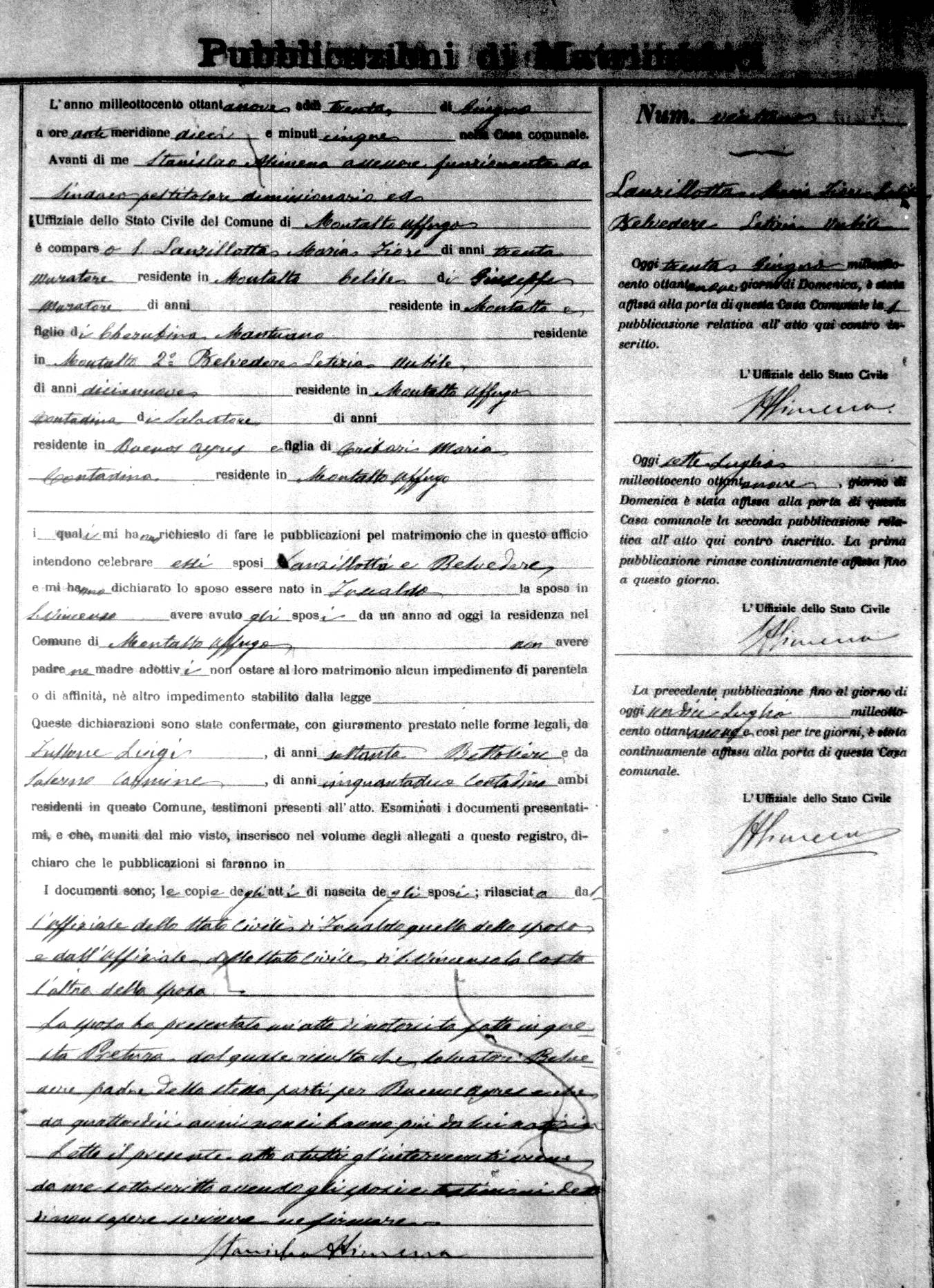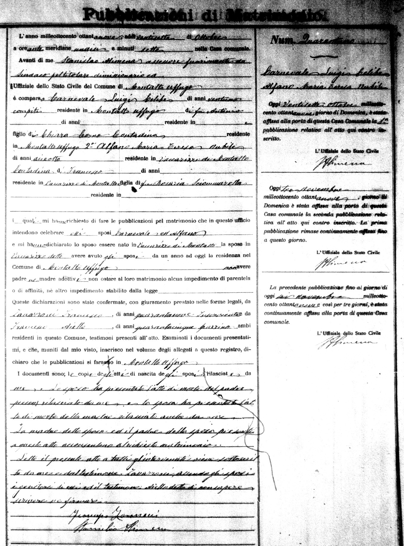 Here are the extractions for the marriage banns in 1889 for Montalto Uffugo. Each extraction has a link to a copy of the original document on the groom's surname. Please note: (fu) indicates the the person was deceased at the time of the marriage bann. For a translation of the basic Pubblicazioni document, look here.