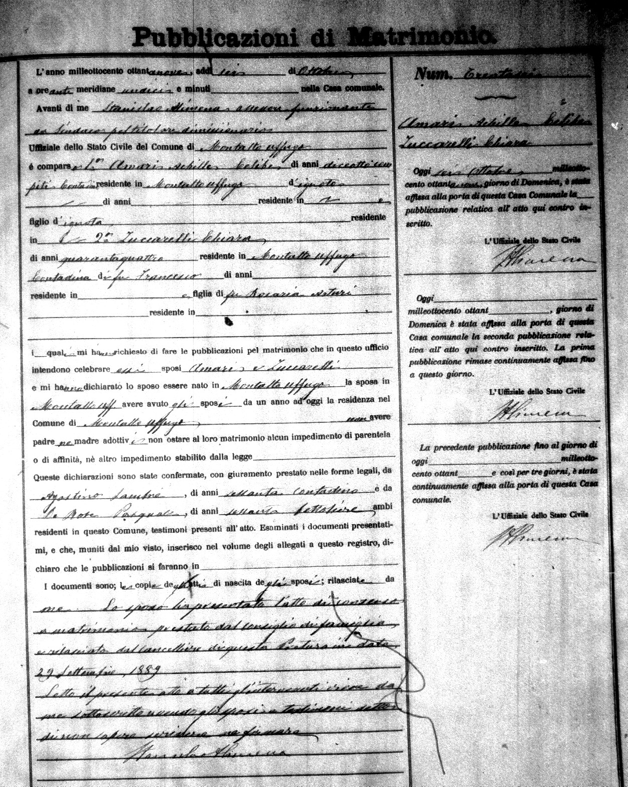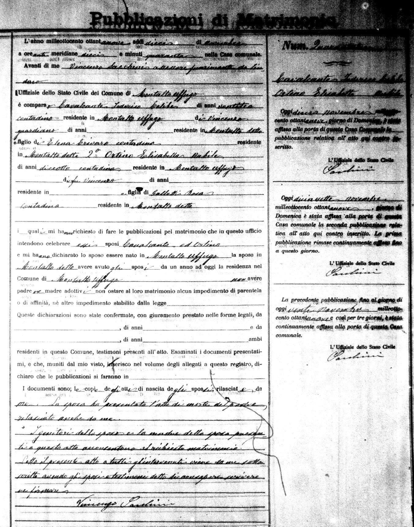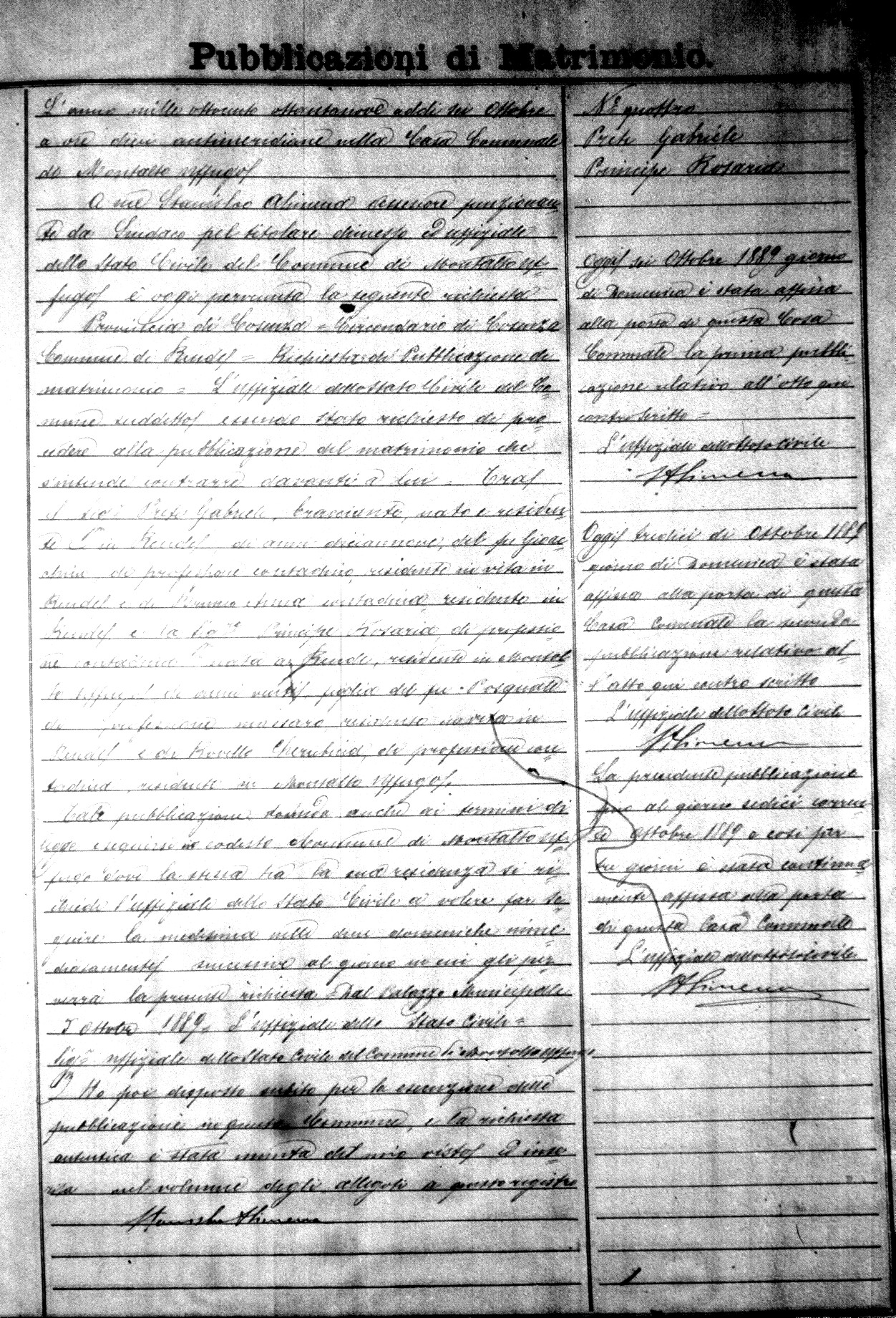 Here are the extractions for Parte II in 1889 for Montalto Uffugo. Parte II Pubblicazioni records are done for marriages that occur in another town but either the bride or groom were born in Montalto Uffugo. Marriage banns had to be posted in both towns.