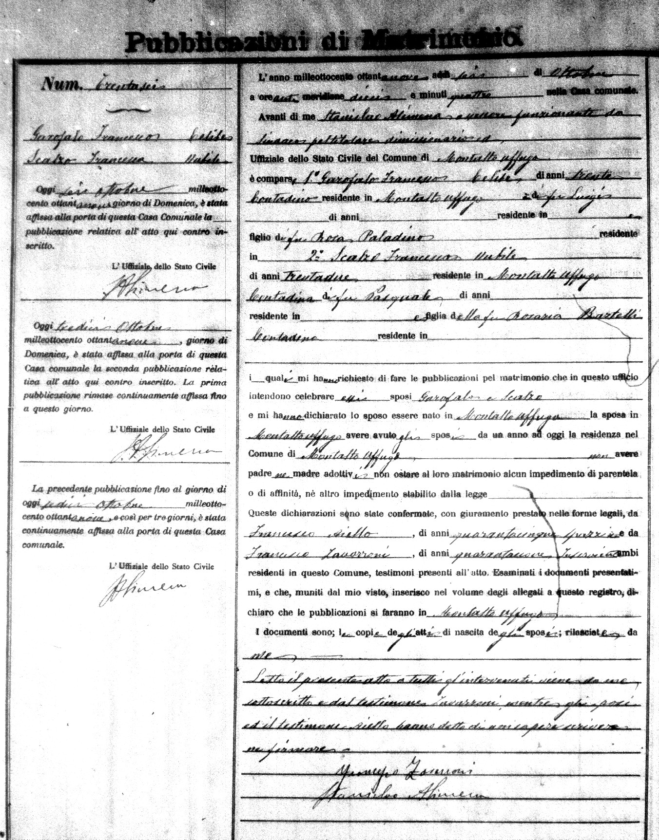 | 6 Oct | Garofalo | Francesco | Luigi (fu) | Paladino | Rosa (fu) | Scalzo | Francesca | Pasquale (fu) | Bartelli | Rosaria (fu) |