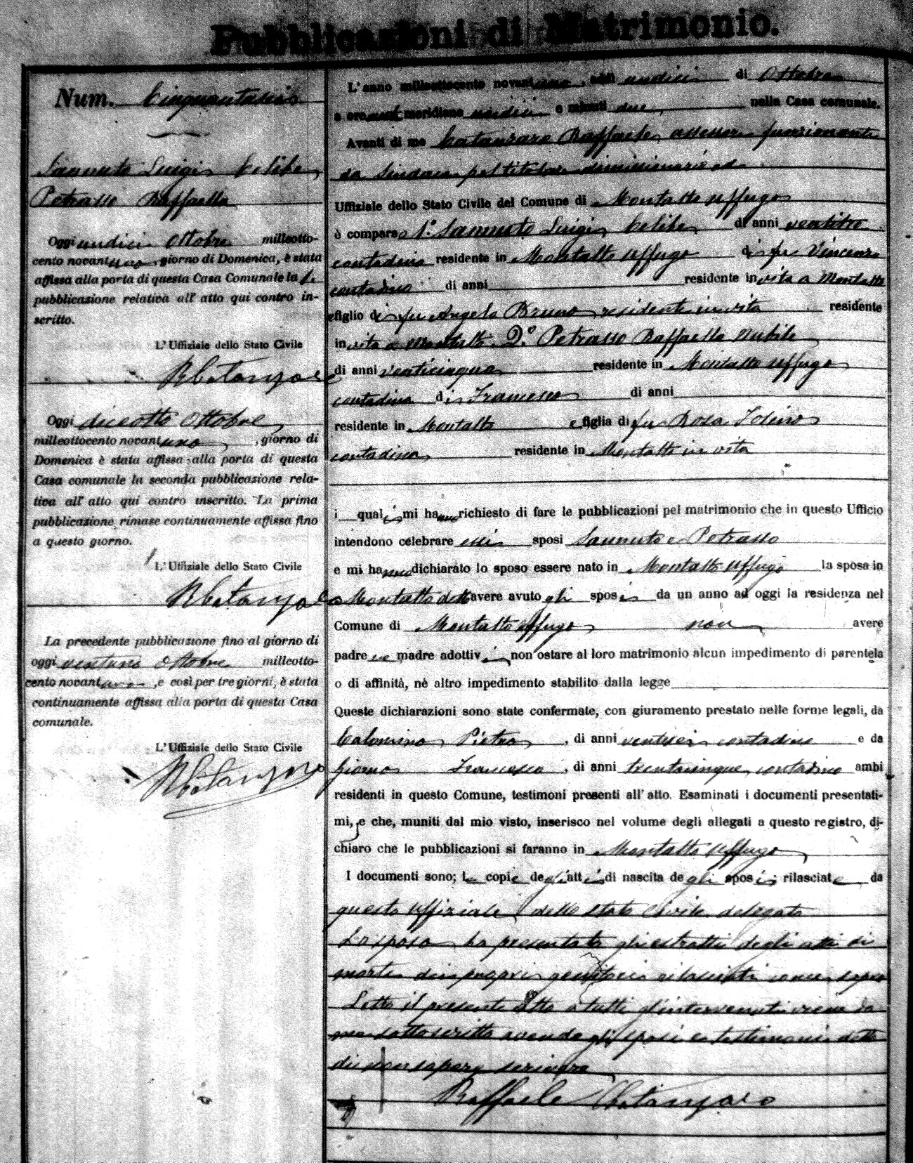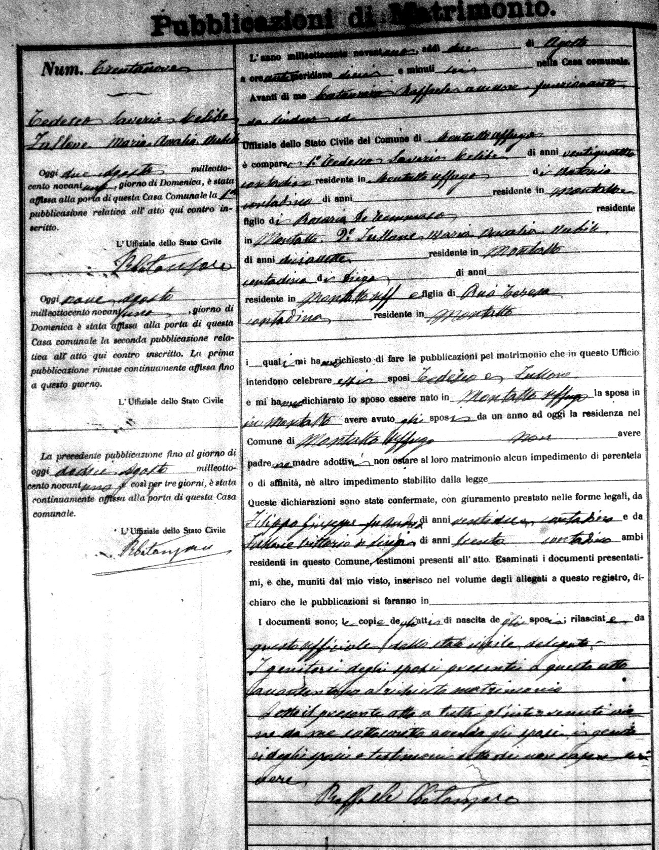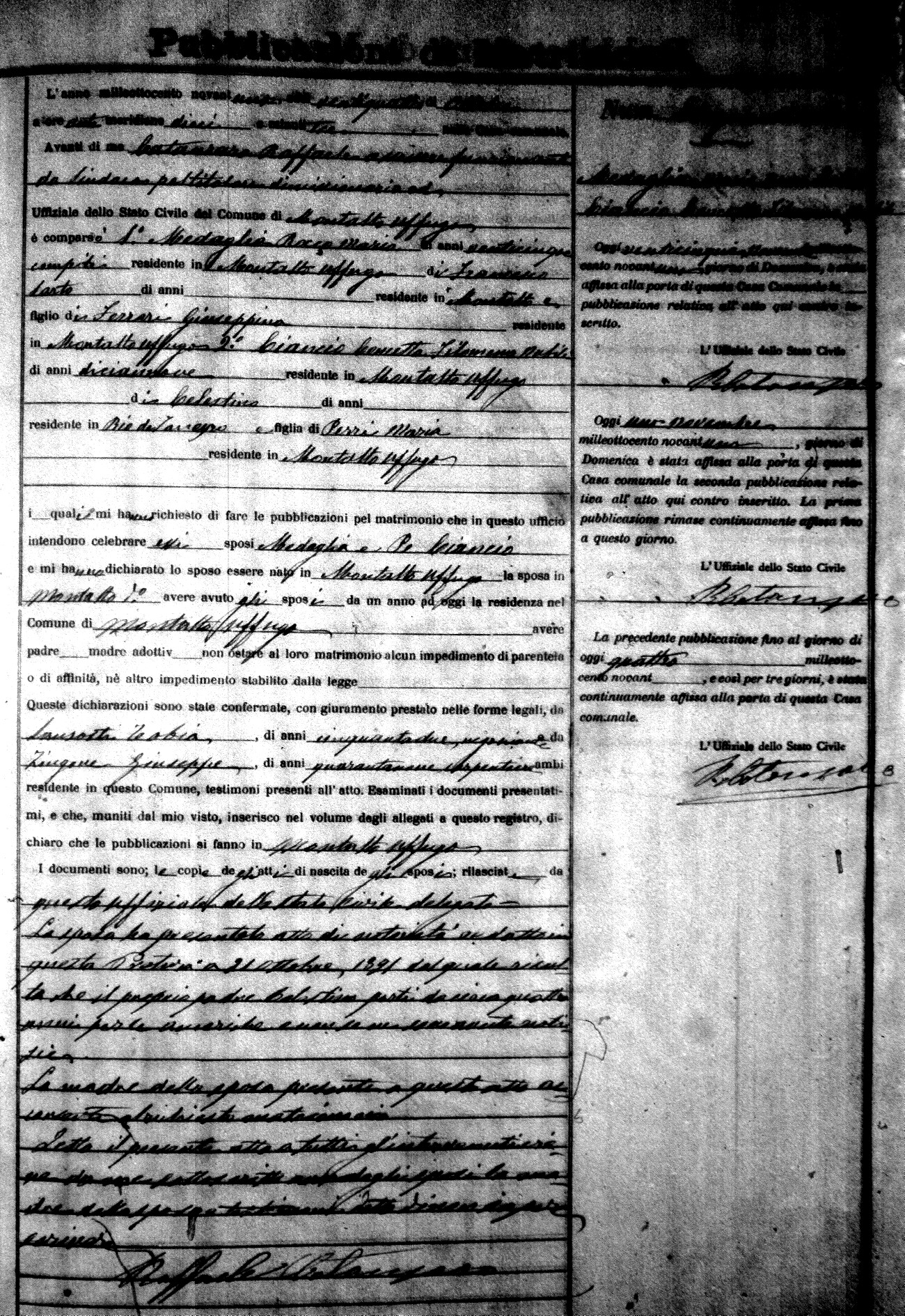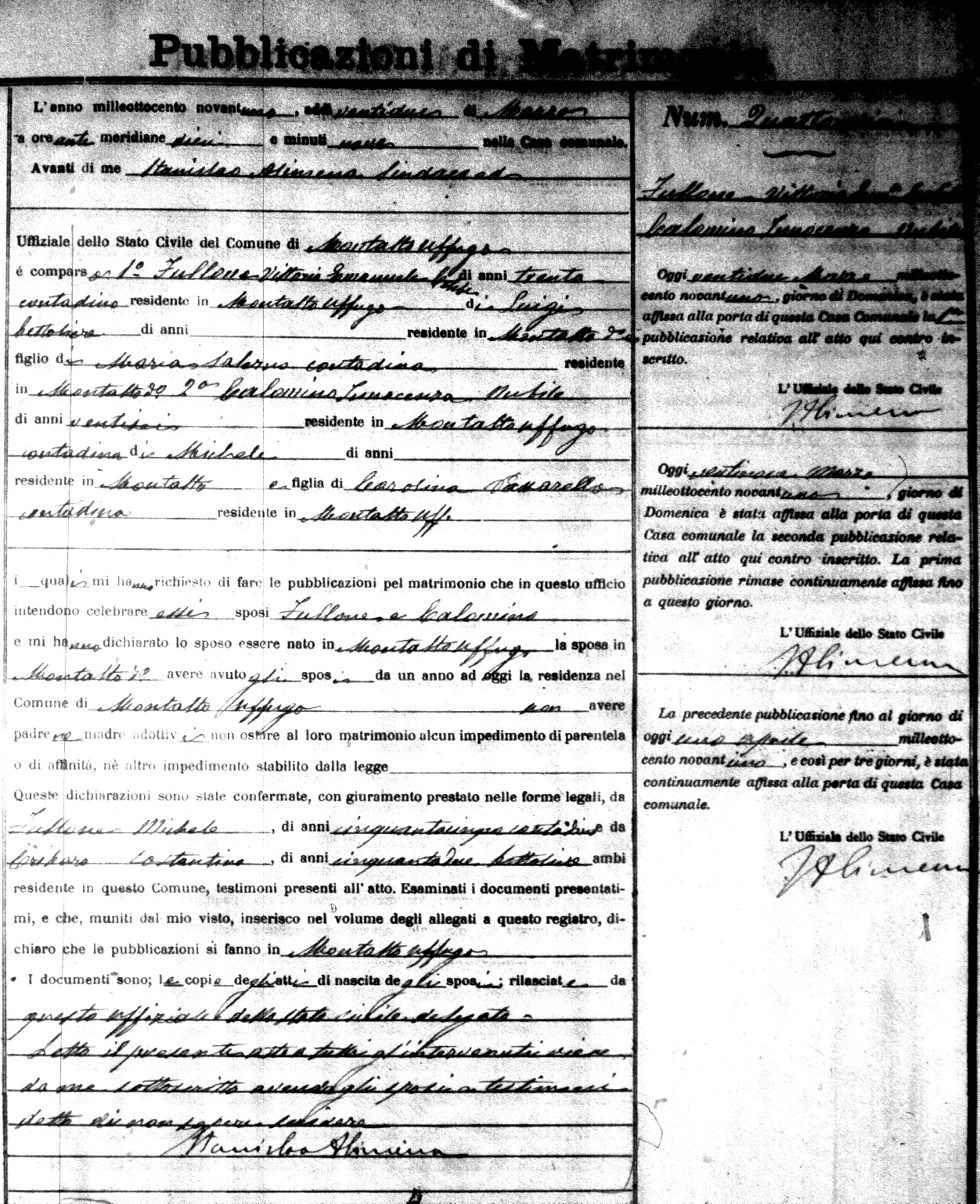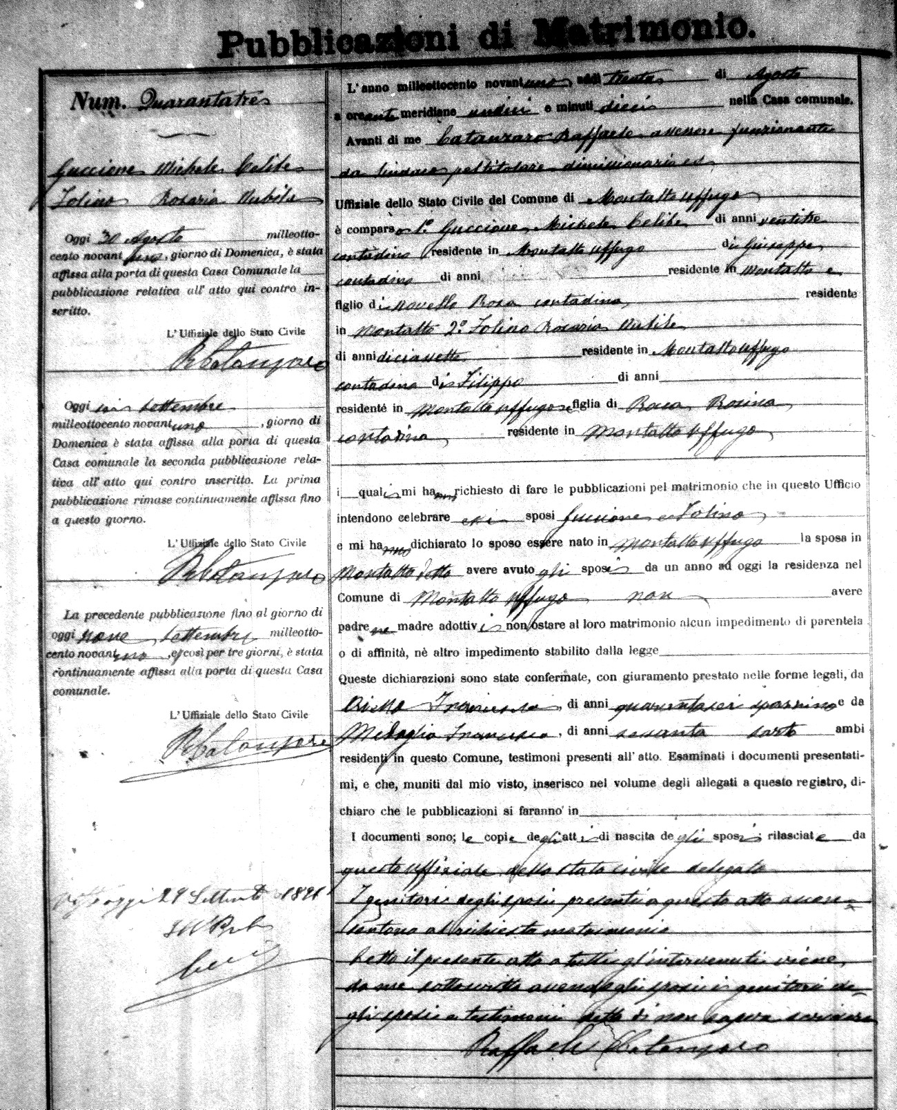 Here are the extractions for the marriage banns in 1891 for Montalto Uffugo. Each extraction has a link to a copy of the original document on the groom's surname. Please note: (fu) indicates the the person was deceased at the time of the marriage bann. For a translation of the basic Pubblicazioni document, look here.