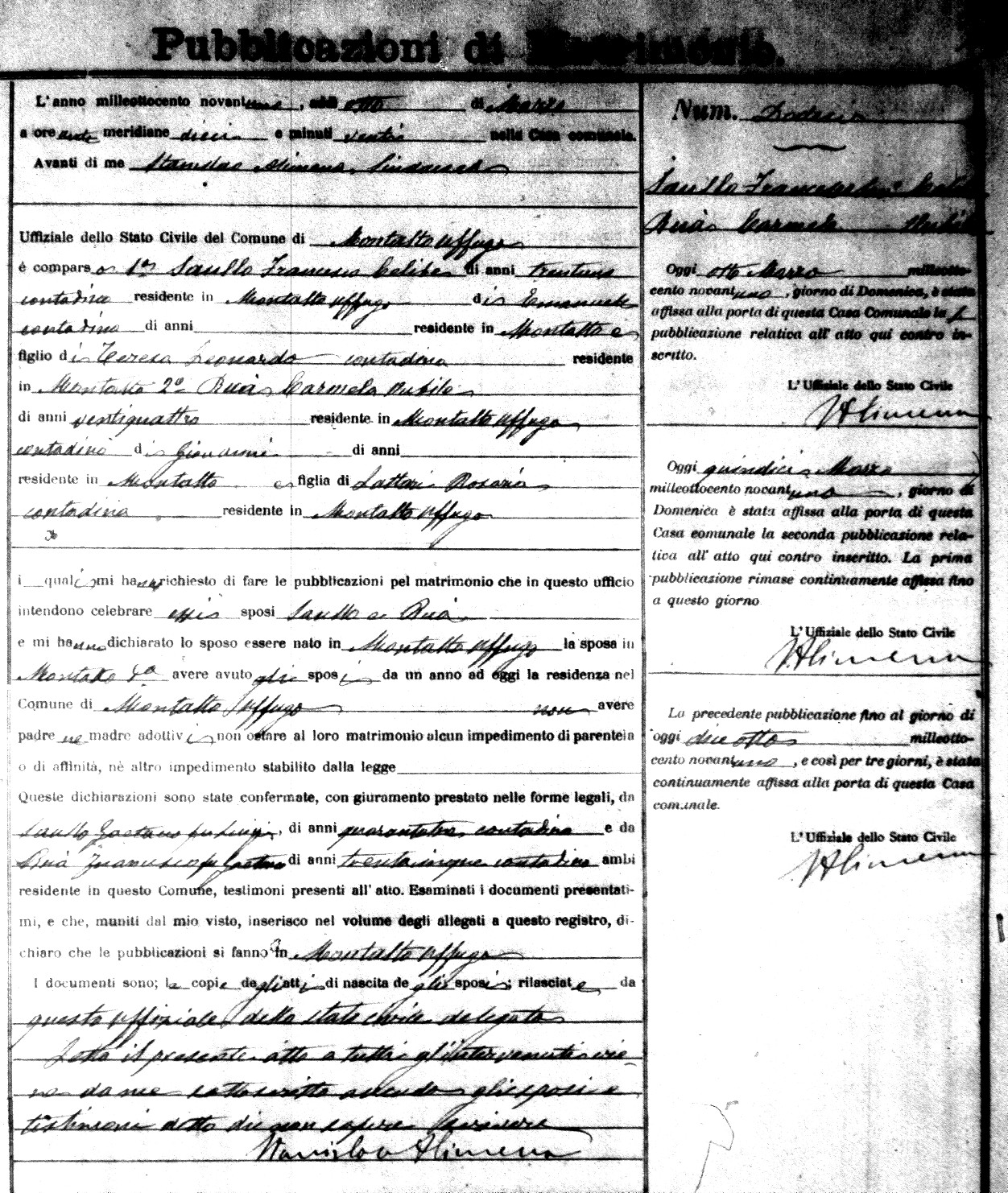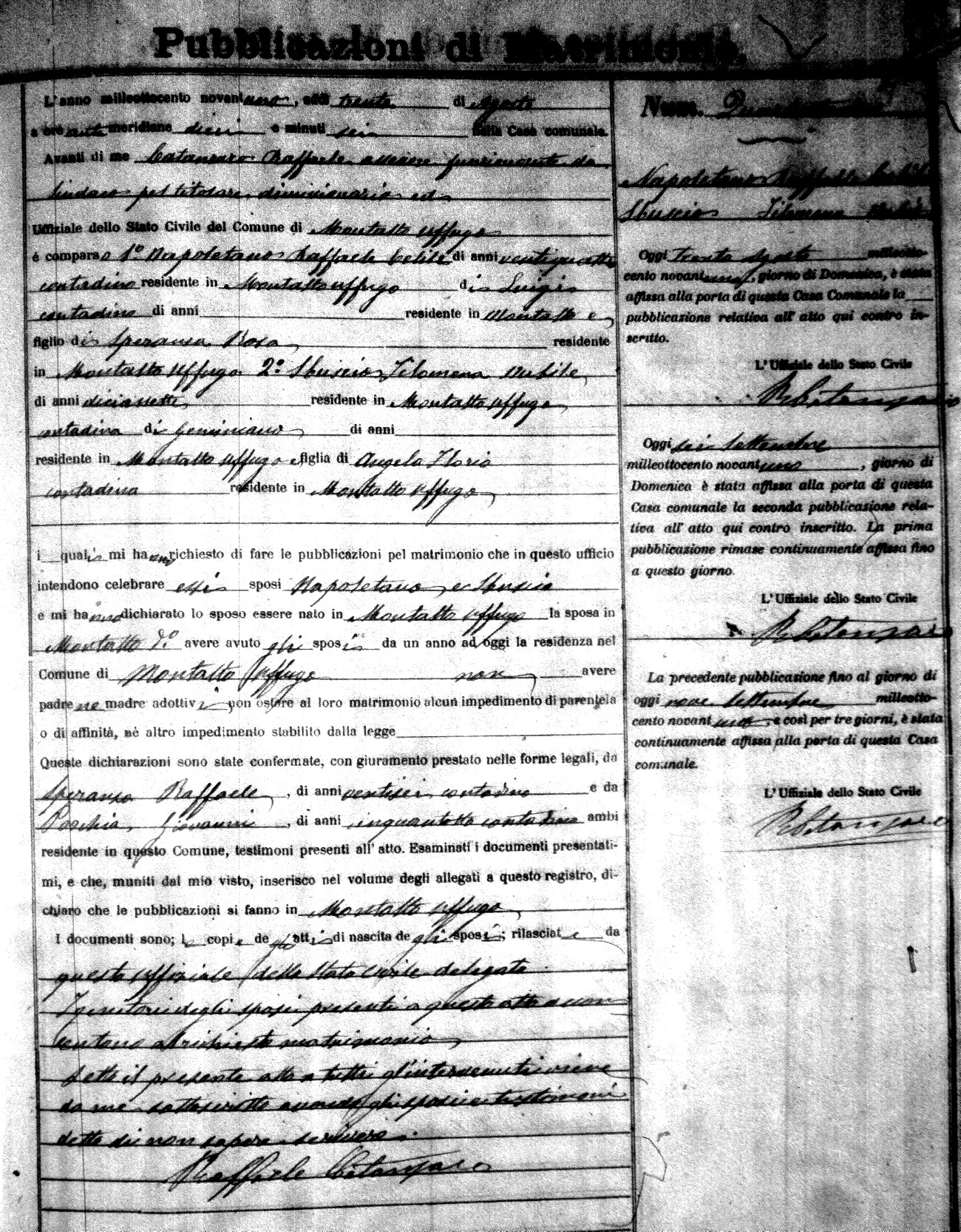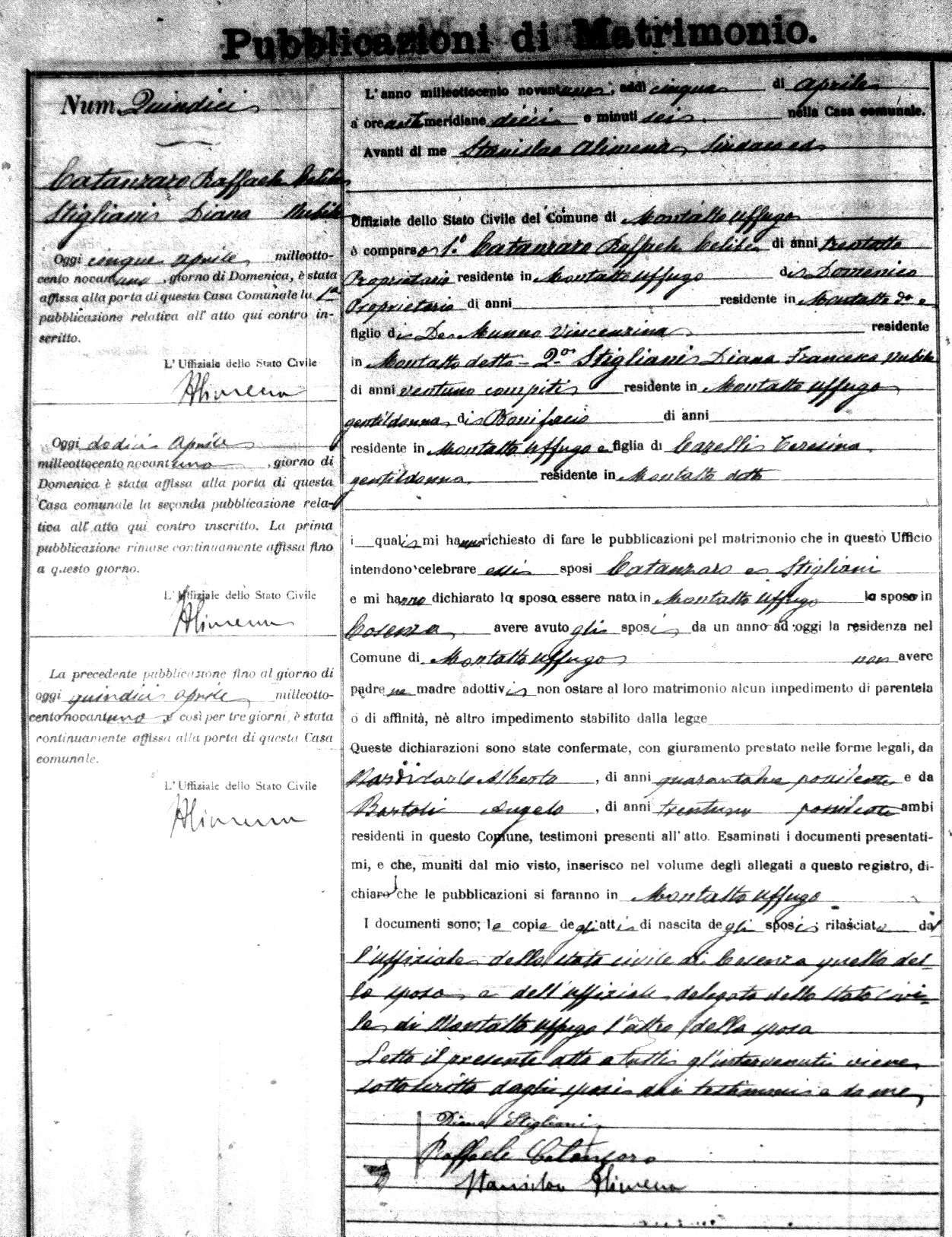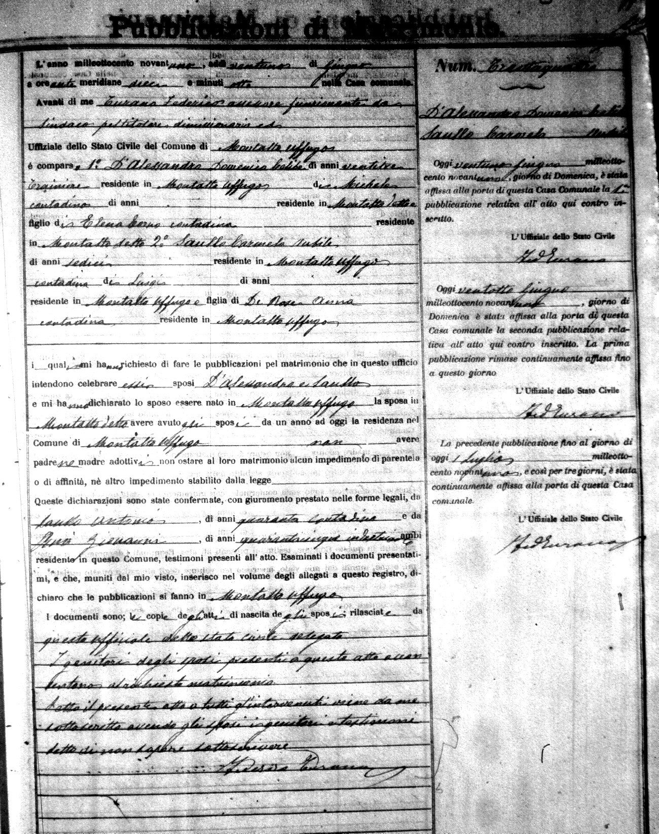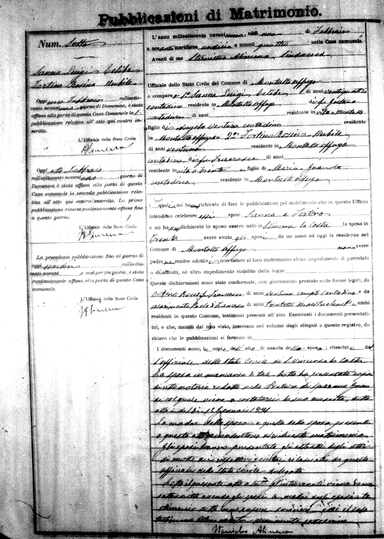 Here are the extractions for the marriage banns in 1891 for Montalto Uffugo. Each extraction has a link to a copy of the original document on the groom's surname. Please note: (fu) indicates the the person was deceased at the time of the marriage bann. For a translation of the basic Pubblicazioni document, look here.