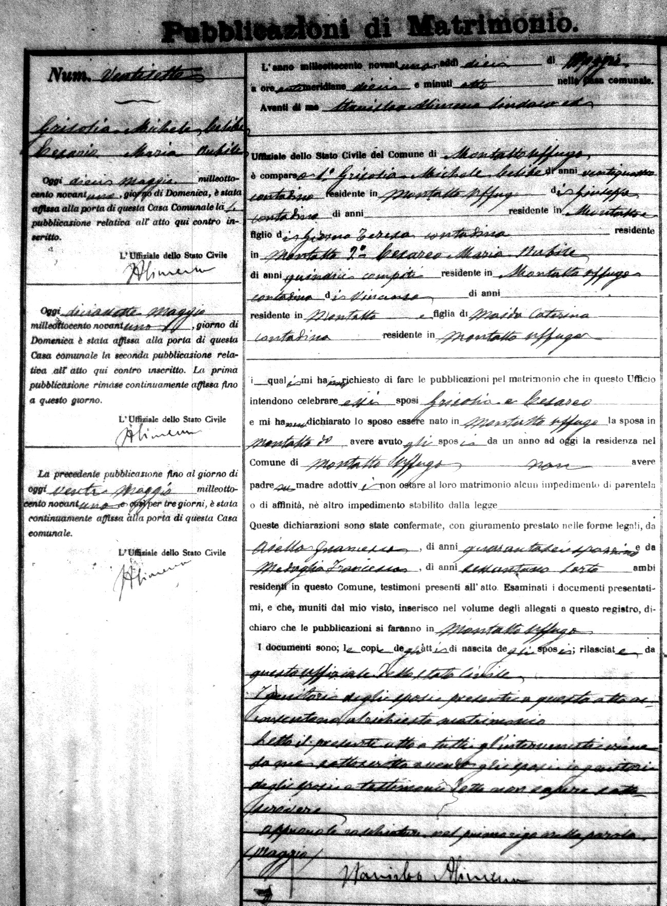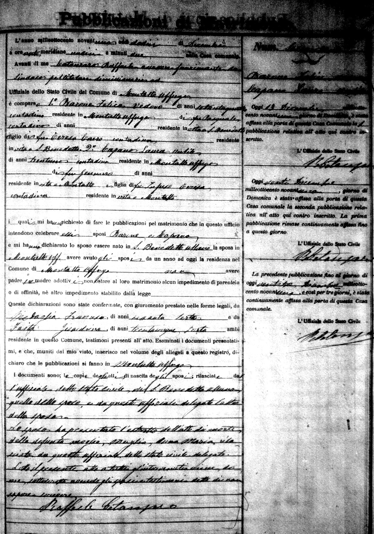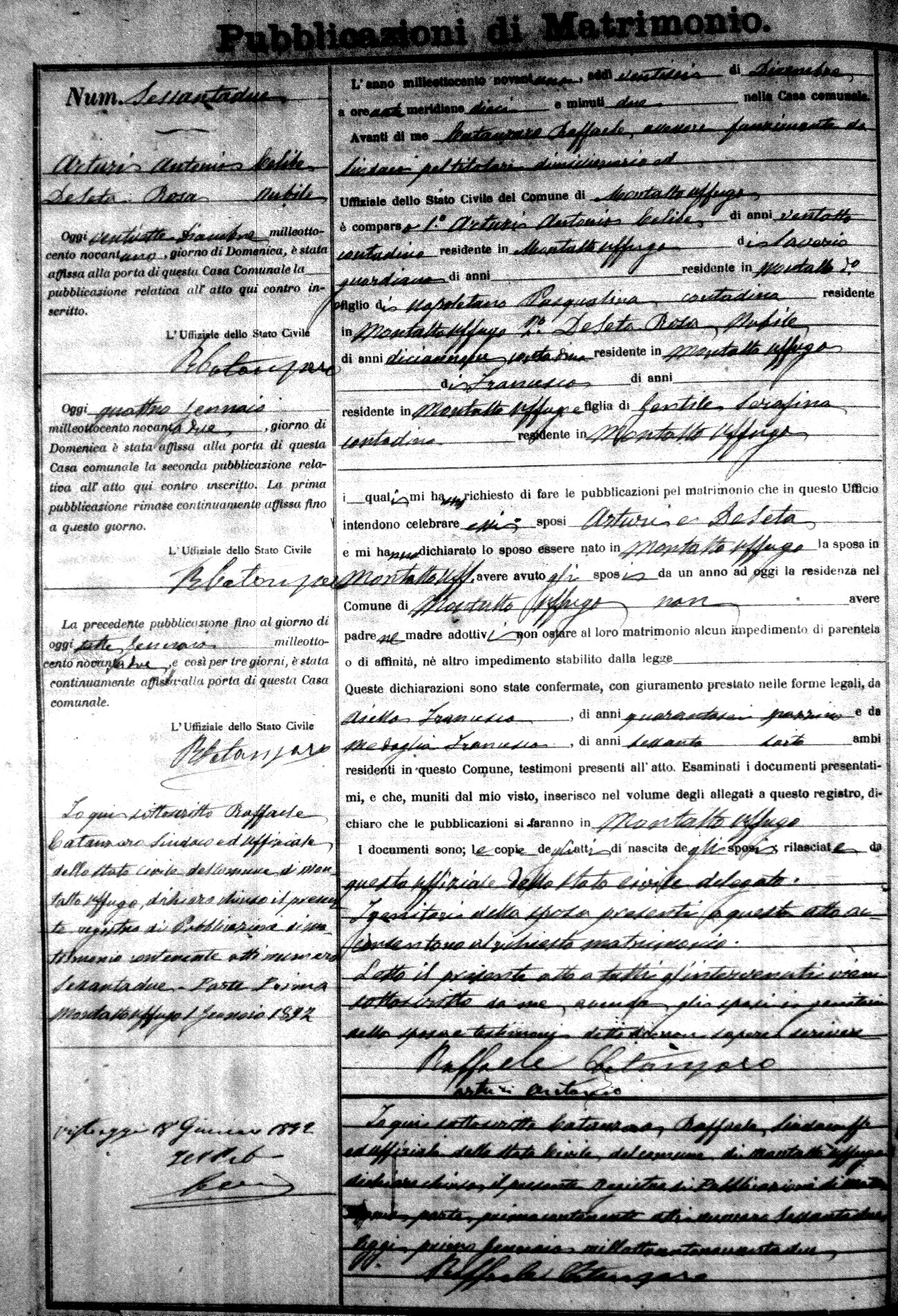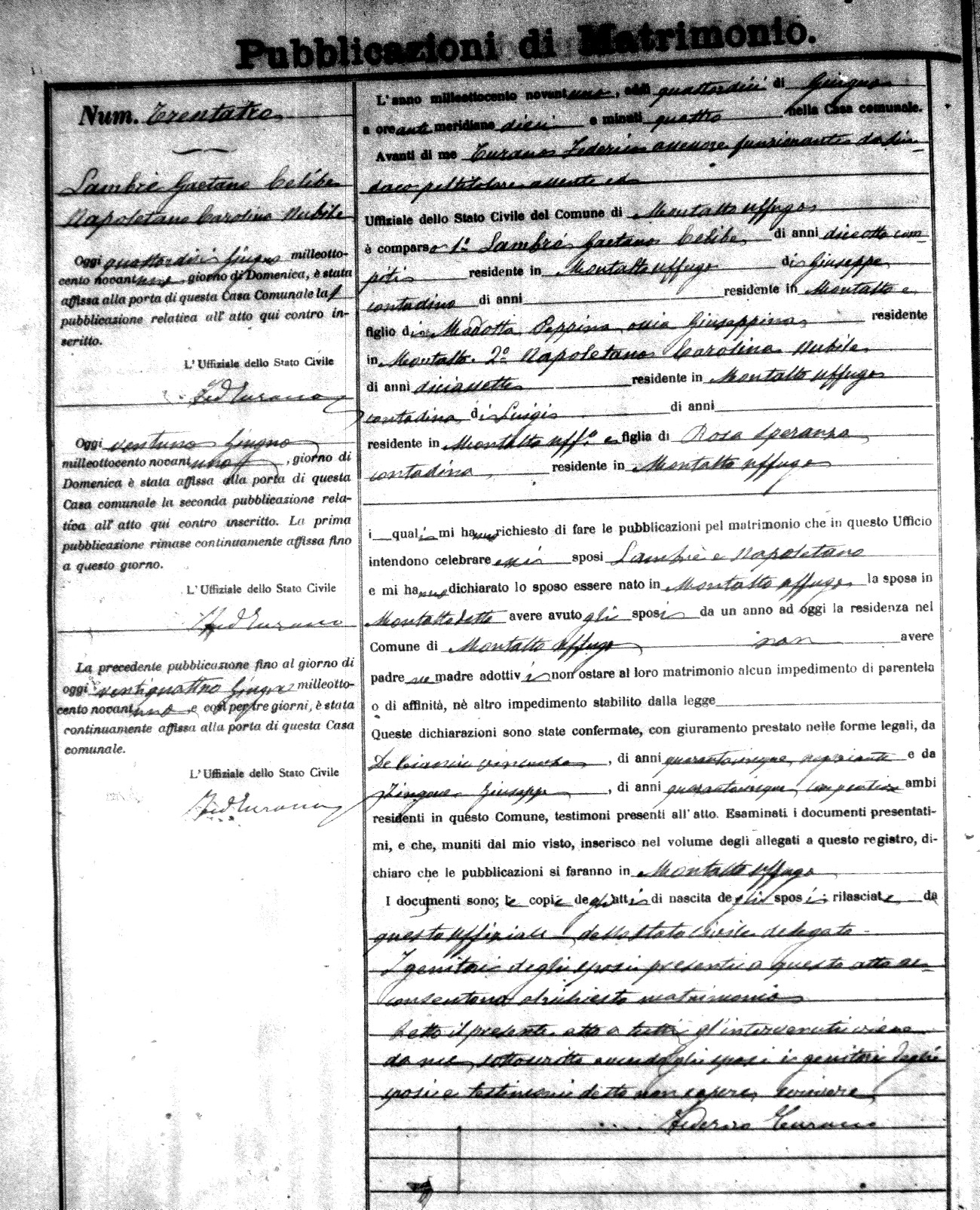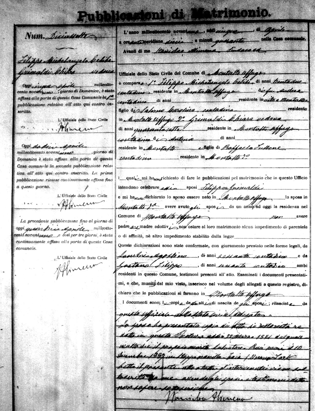 Here are the extractions for the marriage banns in 1891 for Montalto Uffugo. Each extraction has a link to a copy of the original document on the groom's surname. Please note: (fu) indicates the the person was deceased at the time of the marriage bann. For a translation of the basic Pubblicazioni document, look here.